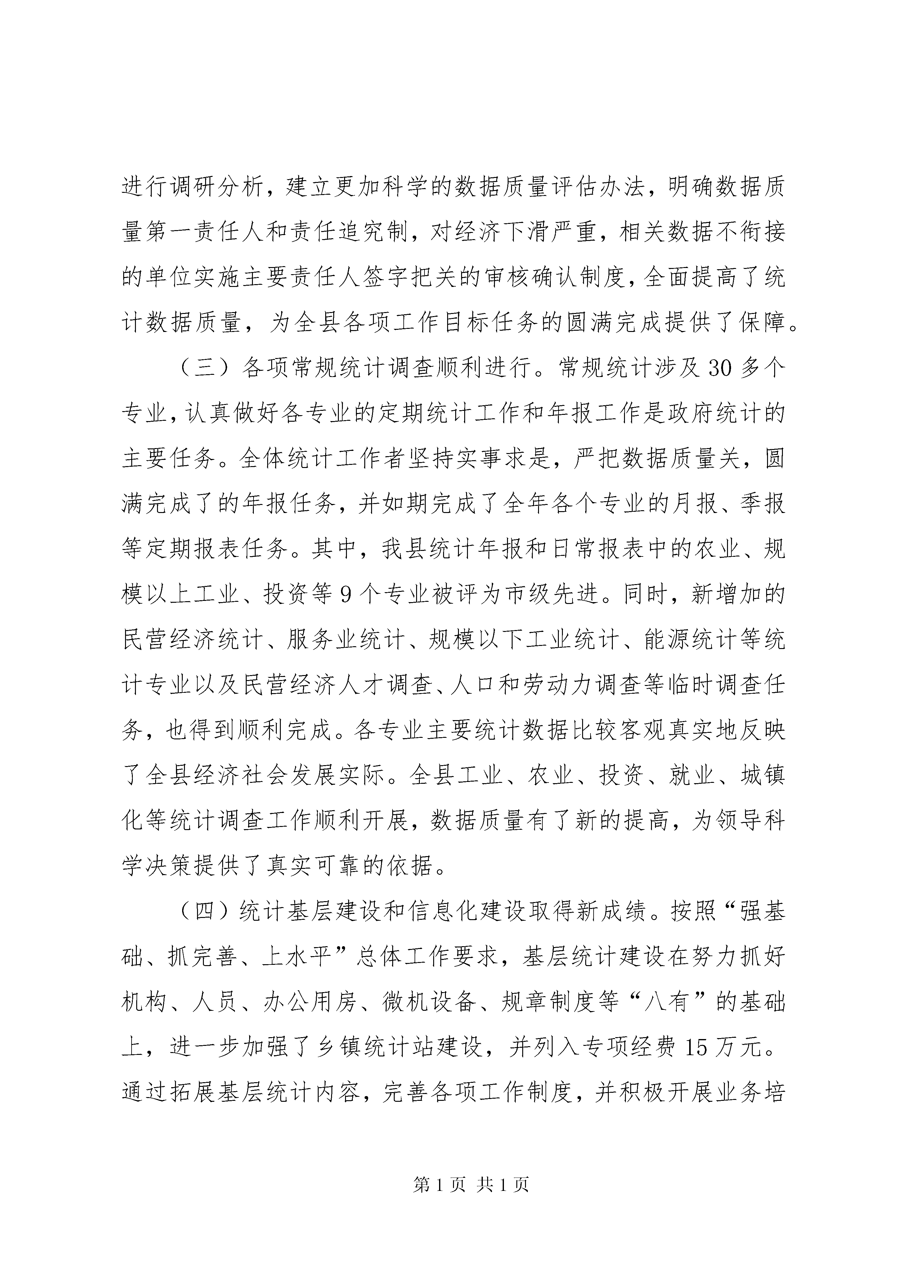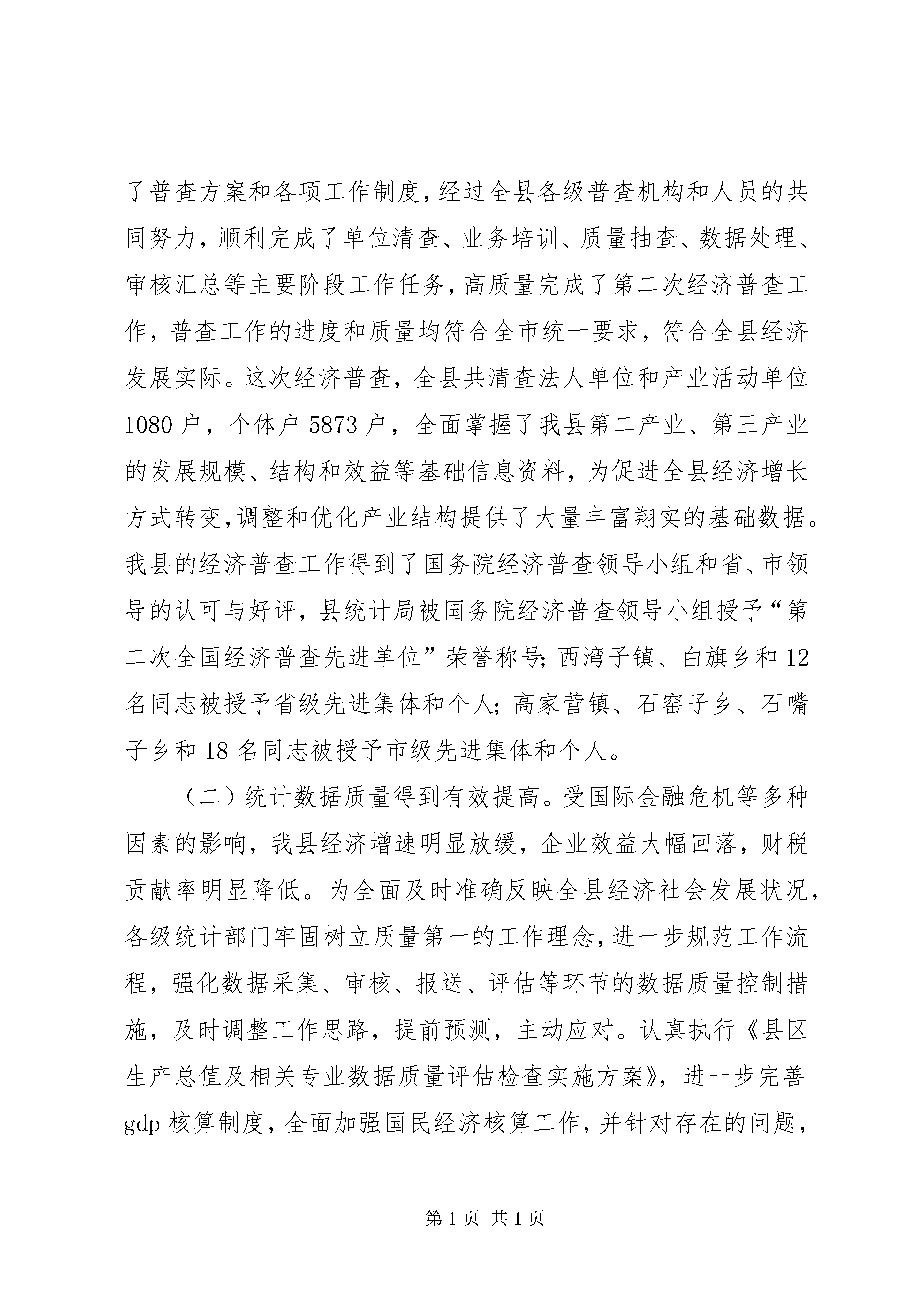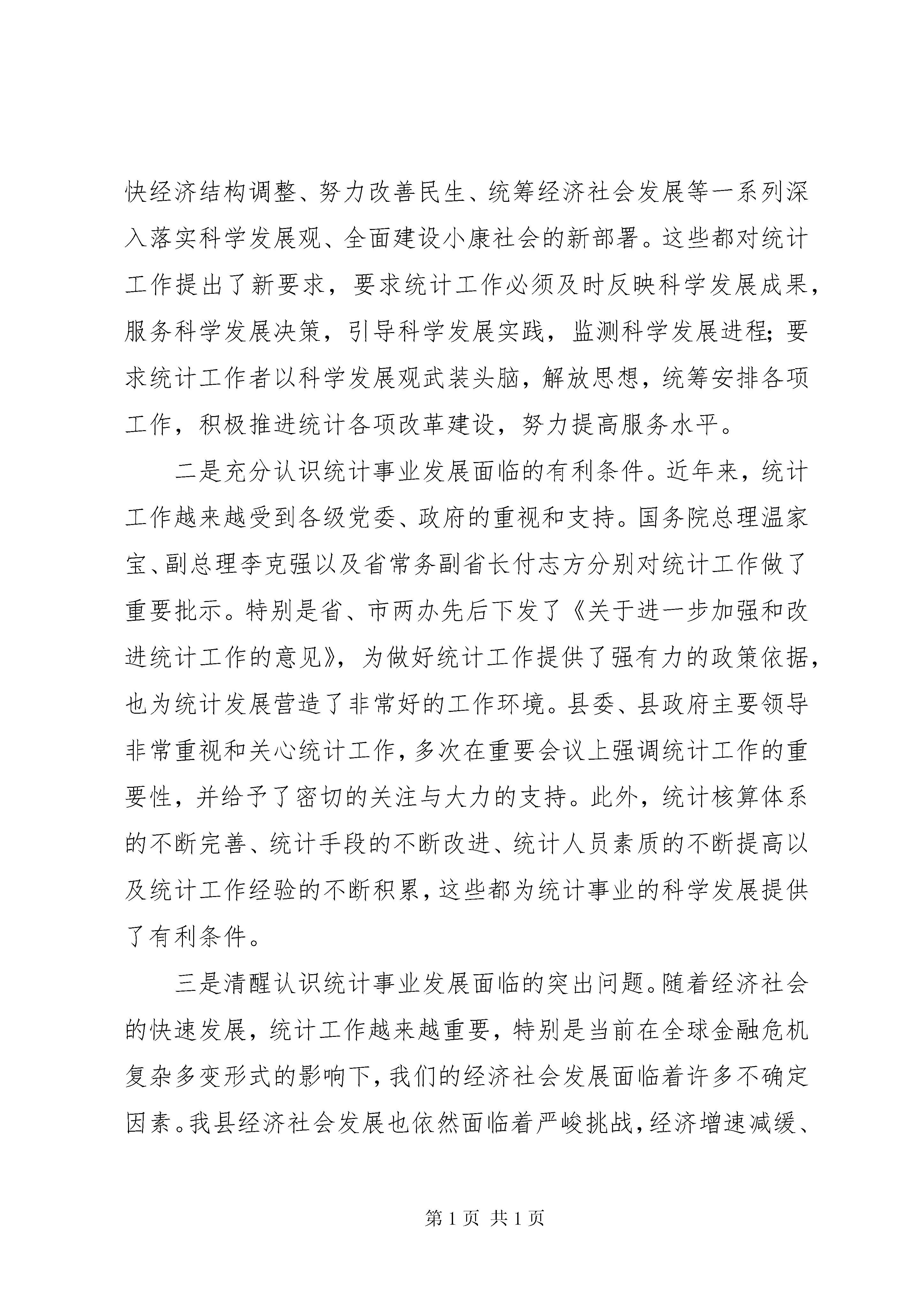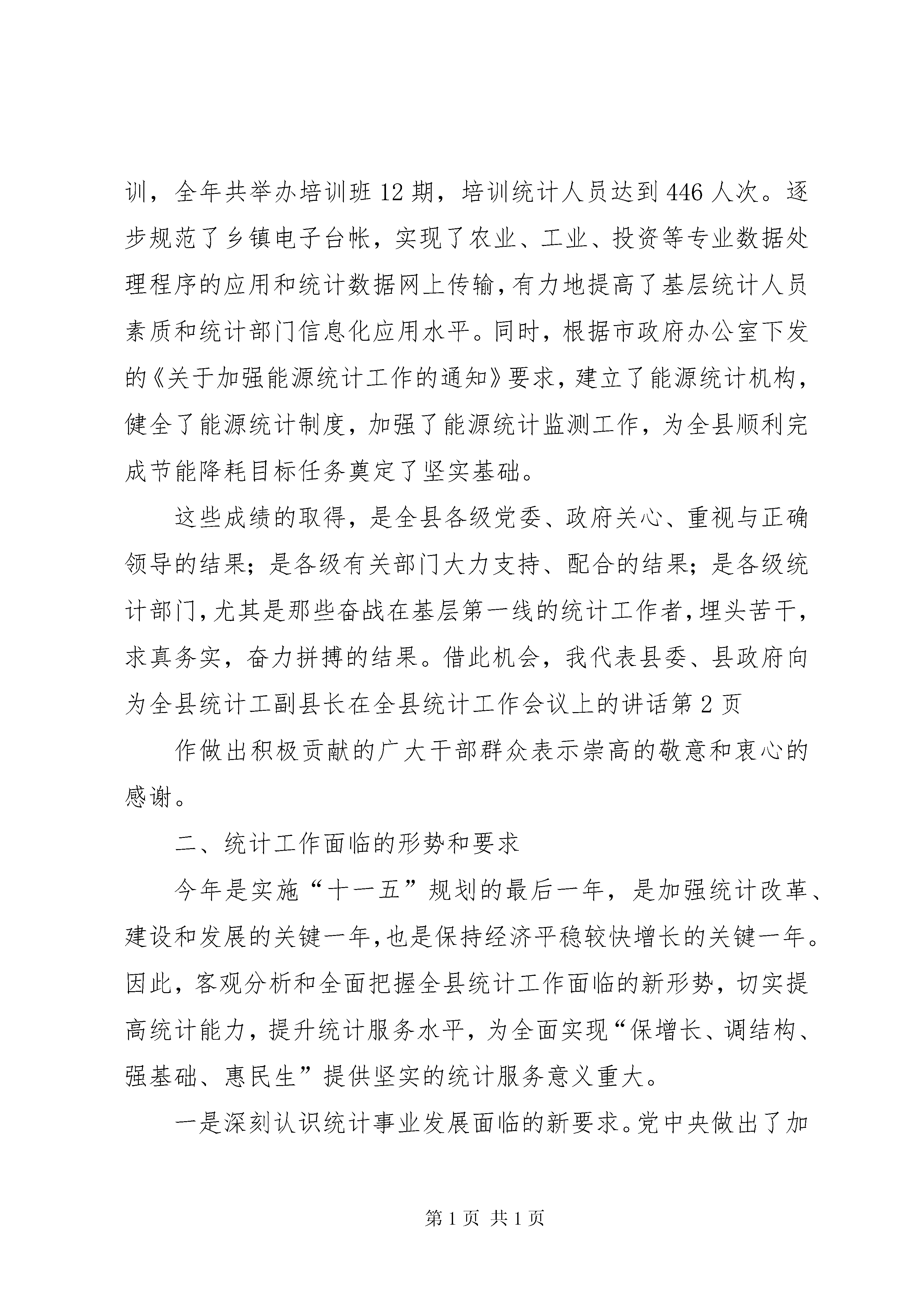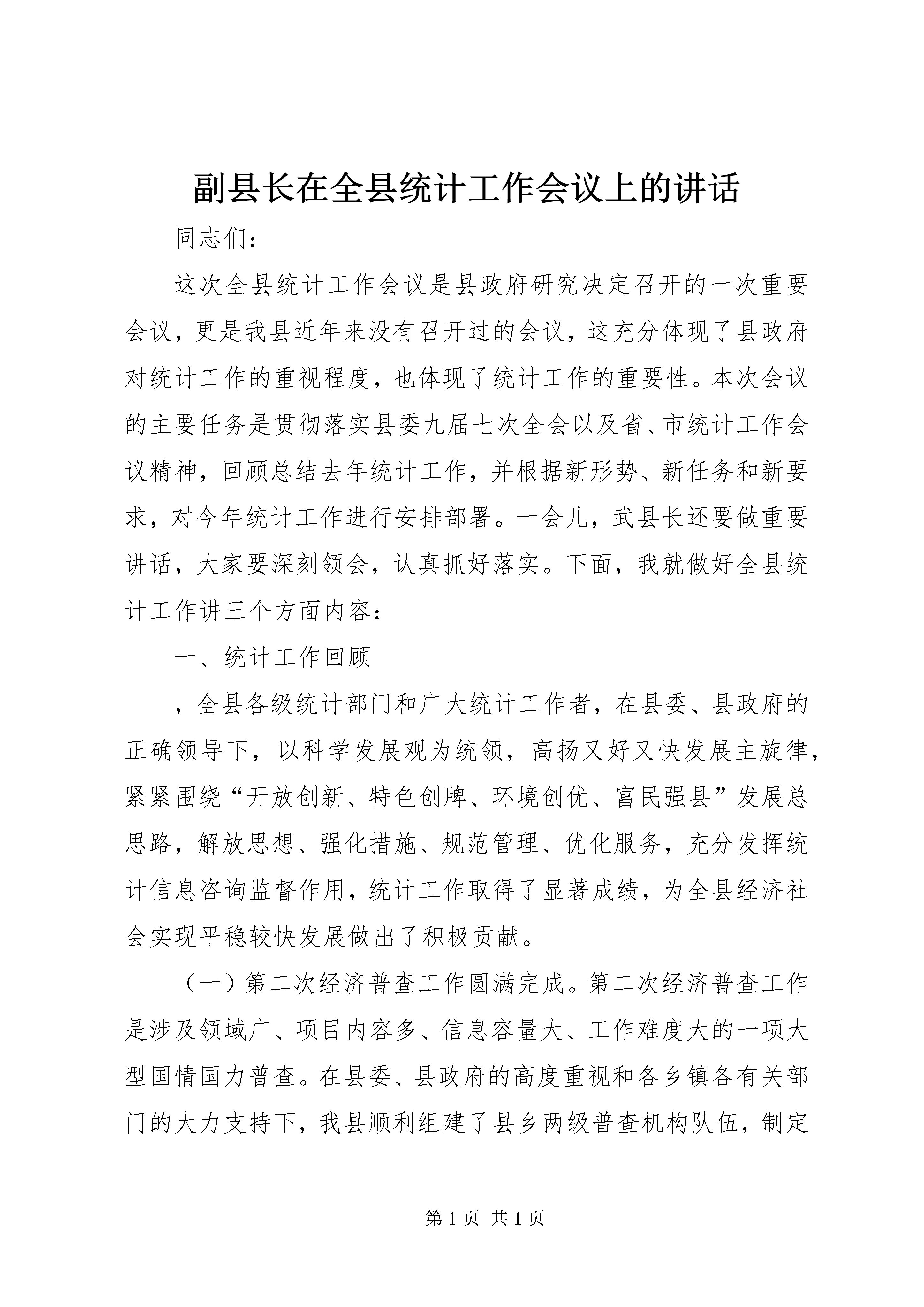 副县长在全县统计工作会议上的讲话同志们:这次全县统计工作会议是县政府研究决定召开的一次重要会议,更是我县近年来没有召开过的会议,这充分体现了县政府对统计工作的重视程度,也体现了统计工作的重要性。本次会议的主要任务是贯彻落实县委九届七次全会以及省、市统计工作会议精神,回顾总结去年统计工作,并根据新形势、新任务和新要求,对今年统计工作进行安排部署。一会儿,武县长还要做重要讲话,大家要深刻领会,认真抓好落实。下面,我就做好全县统计工作讲三个方面内容:一、统计工作回顾,全县各级统计部门和广大统计工作者,在县委、县政府的正确领导下,以科学发展观为统领,高扬又好又快发展主旋律,紧紧围绕“开放创新、特色创牌、环境创优、富民强县”发展总思路,解放思想、强化措施、规范管理、优化服务,充分发挥统计信息咨询监督作用,统计工作取得了显著成绩,为全县经济社会实现平稳较快发展做出了积极贡献。(一)第二次经济普查工作圆满完成。第二次经济普查工作是涉及领域广、项目内容多、信息容量大、工作难度大的一项大型国情国力普查。在县委、县政府的高度重视和各乡镇各有关部门的大力支持下,我县顺利组建了县乡两级普查机构队伍,制定了普查方案和各项工作制度,经过全县各级普查机构和人员的共同努力,顺利完成了单位清查、业务培训、质量抽查、数据处理、审核汇总等主要阶段工作任务,高质量完成了第二次经济普查工作,普查工作的进度和质量均符合全市统一要求,符合全县经济发展实际。这次经济普查,全县共清查法人单位和产业活动单位1080户,个体户5873户,全面掌握了我县第二产业、第三产业的发展规模、结构和效益等基础信息资料,为促进全县经济增长方式转变,调整和优化产业结构提供了大量丰富翔实的基础数据。我县的经济普查工作得到了国务院经济普查领导小组和省、市领导的认可与好评,县统计局被国务院经济普查领导小组授予“第二次全国经济普查先进单位”荣誉称号;西湾子镇、白旗乡和12名同志被授予省级先进集体和个人;高家营镇、石窑子乡、石嘴子乡和18名同志被授予市级先进集体和个人。(二)统计数据质量得到有效提高。受国际金融危机等多种因素的影响,我县经济增速明显放缓,企业效益大幅回落,财税贡献率明显降低。为全面及时准确反映全县经济社会发展状况,各级统计部门牢固树立质量第一的工作理念,进一步规范工作流程,强化数据采集、审核、报送、评估等环节的数据质量控制措施,及时调整工作思路,提前预测,主动应对。认真执行《县区生产总值及相关专业数据质量评估检查实施方案》,进一步完善gdp核算制度,全面加强国民经济核算工作,并针对存在的问题,进行调研分析,建立更加科学的数据质量评估办法,明确数据质量第一责任人和责任追究制,对经济下滑严重,相关数据不衔接的单位实施主要责任人签字把关的审核确认制度,全面提高了统计数据质量,为全县各项工作目标任务的圆满完成提供了保障。(三)各项常规统计调查顺利进行。常规统计涉及30多个专业,认真做好各专业的定期统计工作和年报工作是政府统计的主要任务。全体统计工作者坚持实事求是,严把数据质量关,圆满完成了的年报任务,并如期完成了全年各个专业的月报、季报等定期报表任务。其中,我县统计年报和日常报表中的农业、规模以上工业、投资等9个专业被评为市级先进。同时,新增加的民营经济统计、服务业统计、规模以下工业统计、能源统计等统计专业以及民营经济人才调查、人口和劳动力调查等临时调查任务,也得到顺利完成。各专业主要统计数据比较客观真实地反映了全县经济社会发展实际。全县工业、农业、投资、就业、城镇化等统计调查工作顺利开展,数据质量有了新的提高,为领导科学决策提供了真实可靠的依据。(四)统计基层建设和信息化建设取得新成绩。按照“强基础、抓完善、上水平”总体工作要求,基层统计建设在努力抓好机构、人员、办公用房、微机设备、规章制度等“八有”的基础上,进一步加强了乡镇统计站建设,并列入专项经费15万元。通过拓展基层统计内容,完善各项工作制度,并积极开展业务培训,全年共举办培训班12期,培训统计人员达到446人次。逐步规范了乡镇电子台帐,实现了农业、工业、投资等专业数据处理程序的应用和统计数据网上传输,有力地提高了基层统计人员素质和统计部门信息化应用水平。同时,根据市政府办公室下发的《关于加强能源统计工作的通知》要求,建立了能源统计机构,健全了能源统计制度,加强了能源统计监测工作,为全县顺利完成节能降耗目标任务奠定了坚实基础。这些成绩的取得,是全县各级党委、政府关心、重视与正确领导的结果;是各级有关部门大力支持、配合的结果;是各级统计部门,尤其是那些奋战在基层第一线的统计工作者,埋头苦干,求真务实,奋力拼搏的结果。借此机会,我代表县委、县政府向为全县统计工副县长在全县统计工作会议上的讲话作做出积极贡献的广大