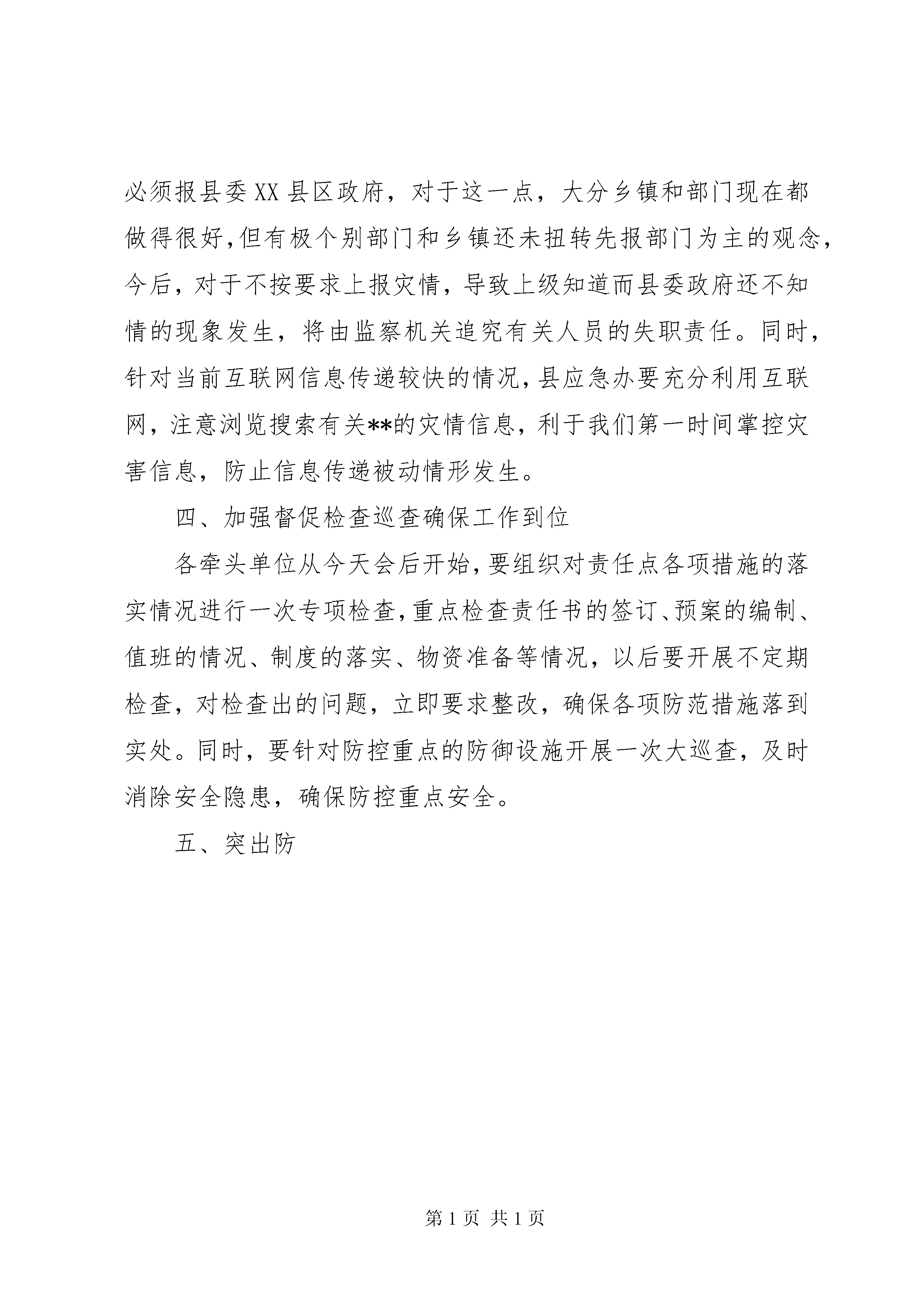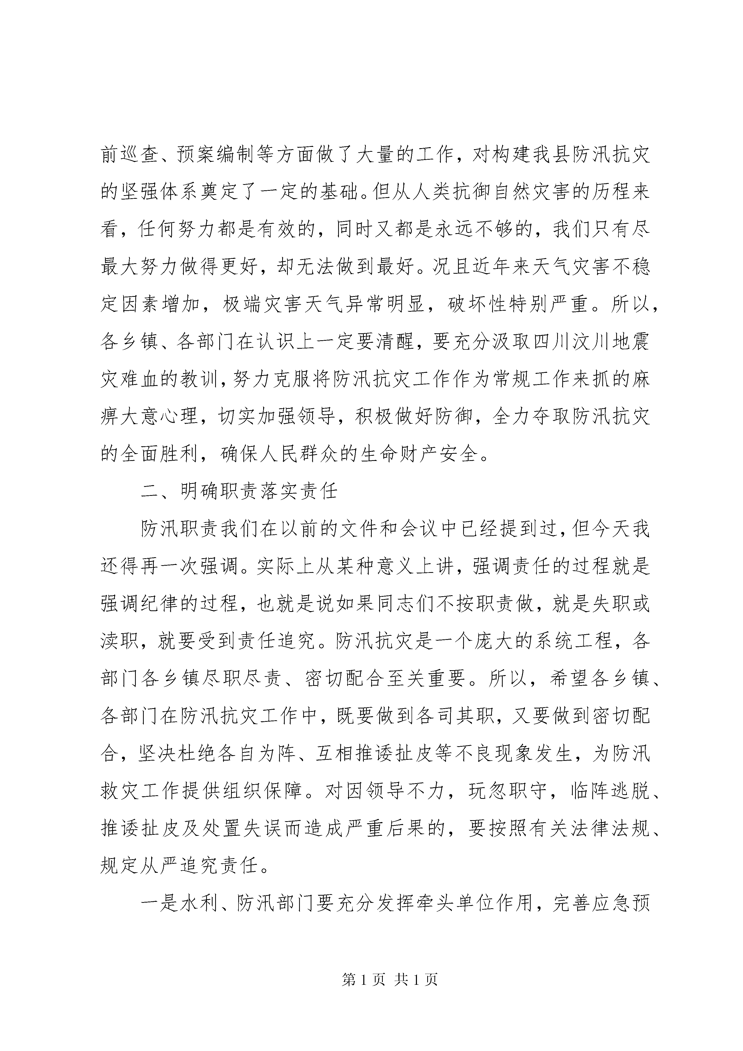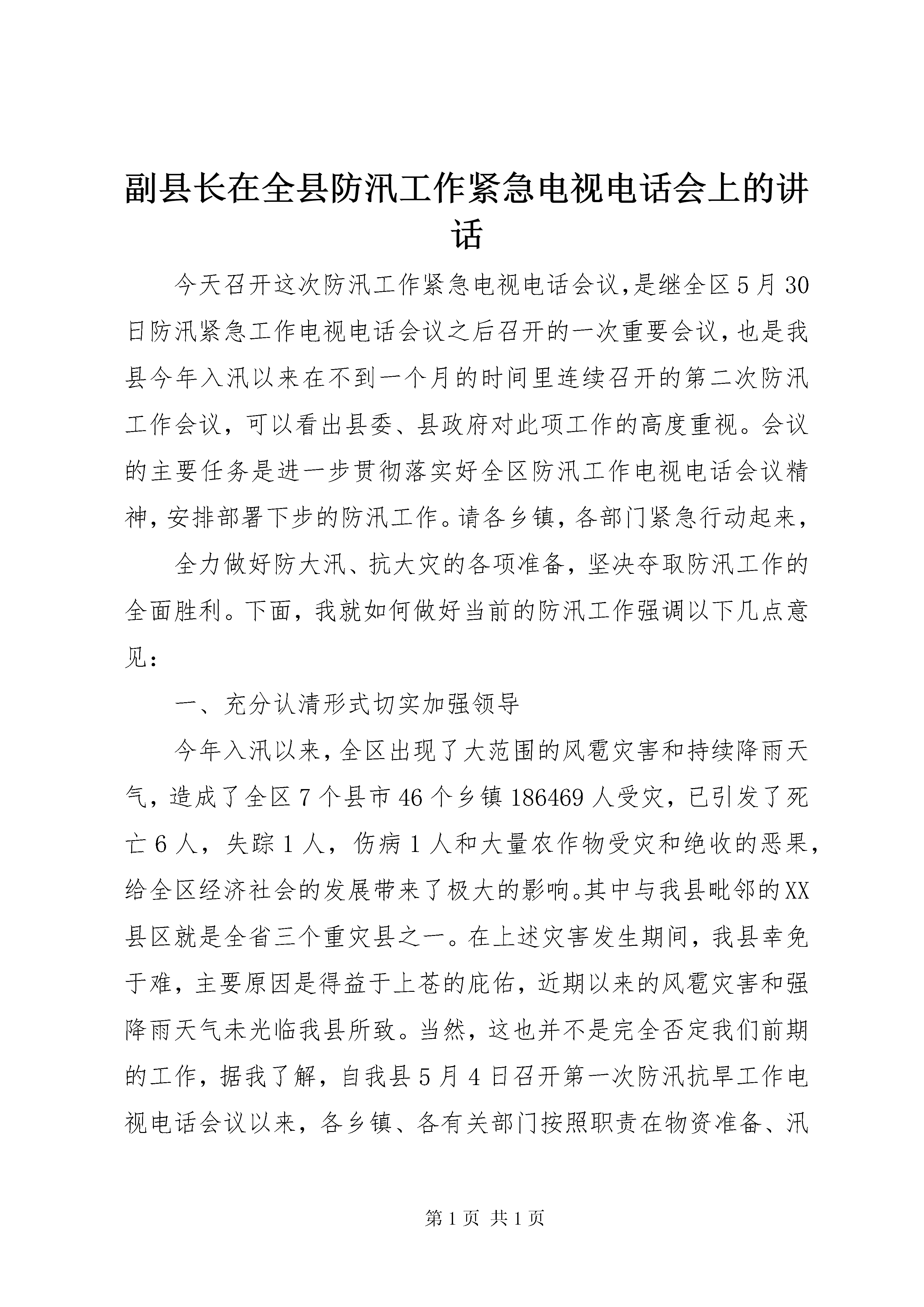 副县长在全县防汛工作紧急电视电话会上的讲话今天召开这次防汛工作紧急电视电话会议,是继全区5月30日防汛紧急工作电视电话会议之后召开的一次重要会议,也是我县今年入汛以来在不到一个月的时间里连续召开的第二次防汛工作会议,可以看出县委、县政府对此项工作的高度重视。会议的主要任务是进一步贯彻落实好全区防汛工作电视电话会议精神,安排部署下步的防汛工作。请各乡镇,各部门紧急行动起来,全力做好防大汛、抗大灾的各项准备,坚决夺取防汛工作的全面胜利。下面,我就如何做好当前的防汛工作强调以下几点意见:一、充分认清形式切实加强领导今年入汛以来,全区出现了大范围的风雹灾害和持续降雨天气,造成了全区7个县市46个乡镇186469人受灾,已引发了死亡6人,失踪1人,伤病1人和大量农作物受灾和绝收的恶果,给全区经济社会的发展带来了极大的影响。其中与我县毗邻的XX县区就是全省三个重灾县之一。在上述灾害发生期间,我县幸免于难,主要原因是得益于上苍的庇佑,近期以来的风雹灾害和强降雨天气未光临我县所致。当然,这也并不是完全否定我们前期的工作,据我了解,自我县5月4日召开第一次防汛抗旱工作电视电话会议以来,各乡镇、各有关部门按照职责在物资准备、汛前巡查、预案编制等方面做了大量的工作,对构建我县防汛抗灾的坚强体系奠定了一定的基础。但从人类抗御自然灾害的历程来看,任何努力都是有效的,同时又都是永远不够的,我们只有尽最大努力做得更好,却无法做到最好。况且近年来天气灾害不稳定因素增加,极端灾害天气异常明显,破坏性特别严重。所以,各乡镇、各部门在认识上一定要清醒,要充分汲取四川汶川地震灾难血的教训,努力克服将防汛抗灾工作作为常规工作来抓的麻痹大意心理,切实加强领导,积极做好防御,全力夺取防汛抗灾的全面胜利,确保人民群众的生命财产安全。二、明确职责落实责任防汛职责我们在以前的文件和会议中已经提到过,但今天我还得再一次强调。实际上从某种意义上讲,强调责任的过程就是强调纪律的过程,也就是说如果同志们不按职责做,就是失职或渎职,就要受到责任追究。防汛抗灾是一个庞大的系统工程,各部门各乡镇尽职尽责、密切配合至关重要。所以,希望各乡镇、各部门在防汛抗灾工作中,既要做到各司其职,又要做到密切配合,坚决杜绝各自为阵、互相推诿扯皮等不良现象发生,为防汛救灾工作提供组织保障。对因领导不力,玩忽职守,临阵逃脱、推诿扯皮及处置失误而造成严重后果的,要按照有关法律法规、规定从严追究责任。一是水利、防汛部门要充分发挥牵头单位作用,完善应急预案,要求县、乡、村三级必须有防汛预案,加强抗灾救灾物资储备,加强水利安全检查,特别是要加强列为重点防汛的七个水库(红旗、鞍山、过狮河、吊水岩、小坝、大海坝、小湖坝)和危险河流巡查工作。二是气象部门要加强气象预报,特别是灾害性天气的短期和中长期预测预报工作,努力延长预见期,提高预报精确度,为防汛工作提供科学的、准确的决策参考。三是民政、卫生等部门要做好抢险救灾物资、医疗设施的准备,确保汛期防灾、减灾、救灾的需要。四是公安、武警、消防中队、民兵应急分队要加强沟通与联系,充分发挥人民子弟兵在抗洪抢险中的突击队作用,确保灾害能在第一时间得到有效处置。五是县应急办要充分发挥重大灾情应急中枢机构的作用,加强信息的收集上报,当灾情发生时,及时调度整合各类救灾资源,提高应急处置能力,保证救灾工作有序进行。六是各乡镇要认真落实以行政首长负责制为中心的防汛安全责任制,完善各项规章制度,把各项工作抓早、抓紧、抓实,做到责任到人,任务到岗,工作到位。三、加强值班调度保障信息畅通防汛期间,各乡镇、应急办、气象、水利、民政、国土、公安、交通、电力、通讯等部门要严格实行汛期24小时执班制度,坚持专人值班和领导带班制度,所有防汛责责人要随时保持通讯畅通。要坚持灾情及时上报制度,特别是要加强突发性灾情的上报工作,当重大突发性灾情发生后,各部门在报上级部门的同时必须报县委XX县区政府,对于这一点,大分乡镇和部门现在都做得很好,但有极个别部门和乡镇还未扭转先报部门为主的观念,今后,对于不按要求上报灾情,导致上级知道而县委政府还不知情的现象发生,将由监察机关追究有关人员的失职责任。同时,针对当前互联网信息传递较快的情况,县应急办要充分利用互联网,注意浏览搜索有关**的灾情信息,利于我们第一时间掌控灾害信息,防止信息传递被动情形发生。四、加强督促检查巡查确保工作到位各牵头单位从今天会后开始,要组织对责任点各项措施的落实情况进行一次专项检查,重点检查责任书的签订、预案的编制、值班的情况、制度的落实、物资准备等情况,以后要开展不定期检查,对检查出的问题,立即要求整改,确保各项防范措施落到实处。同时,要针对防控重点的防御设施开展一次大巡查,及时消除安全隐患,确保防控重点安全。五、突出防
