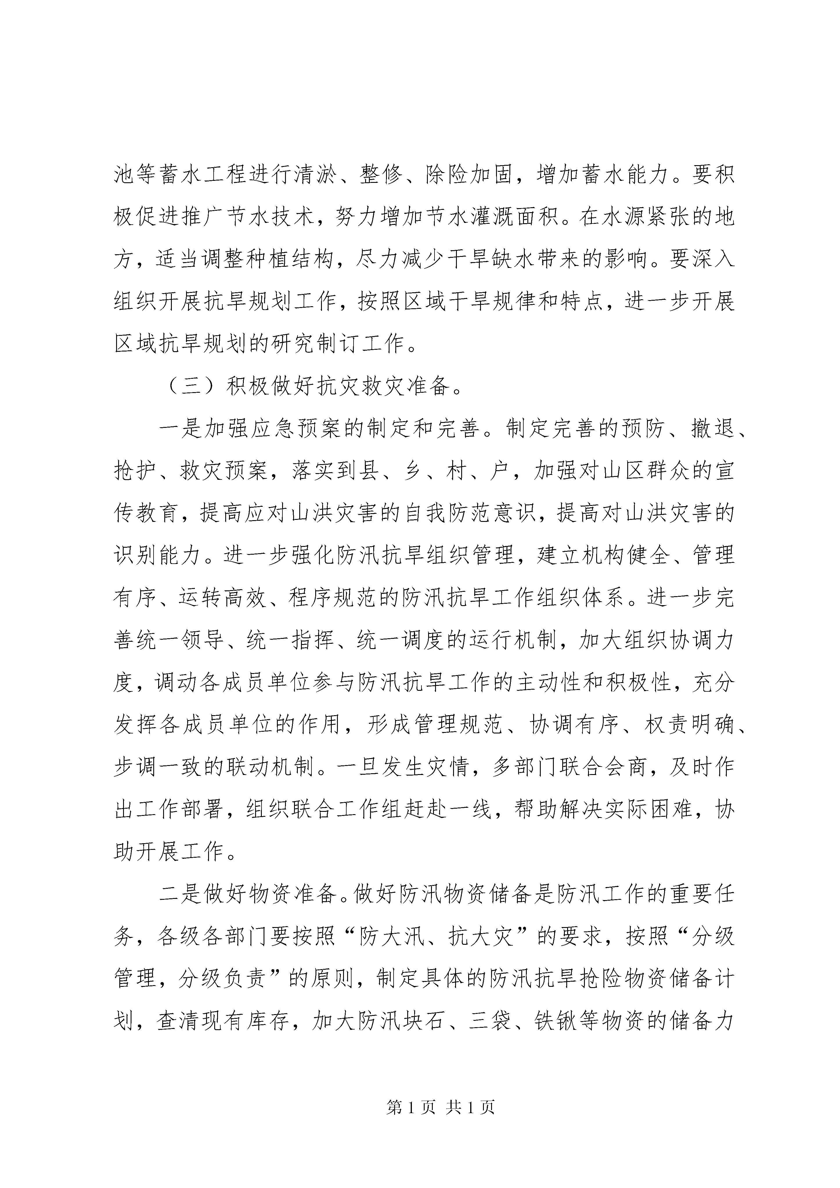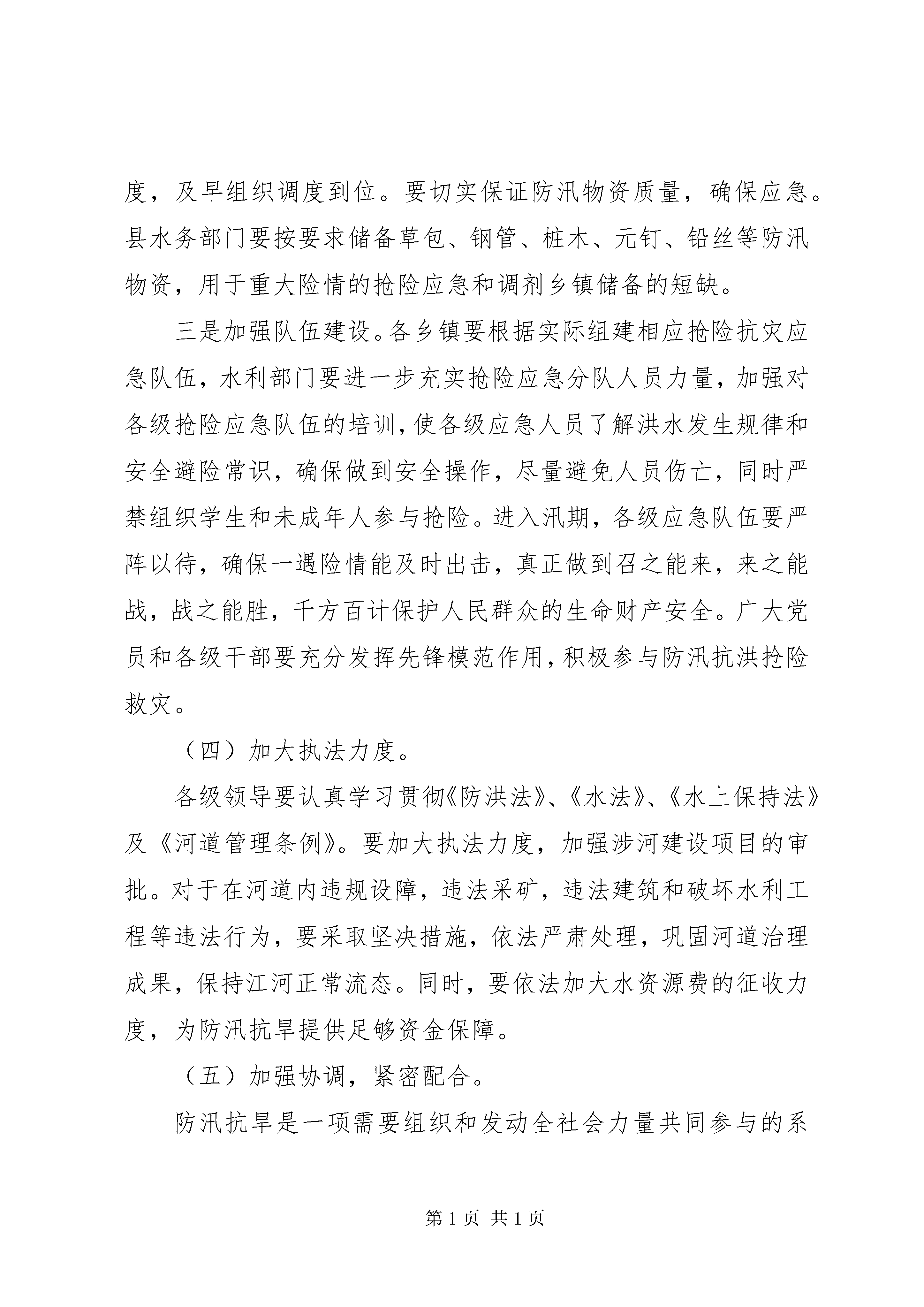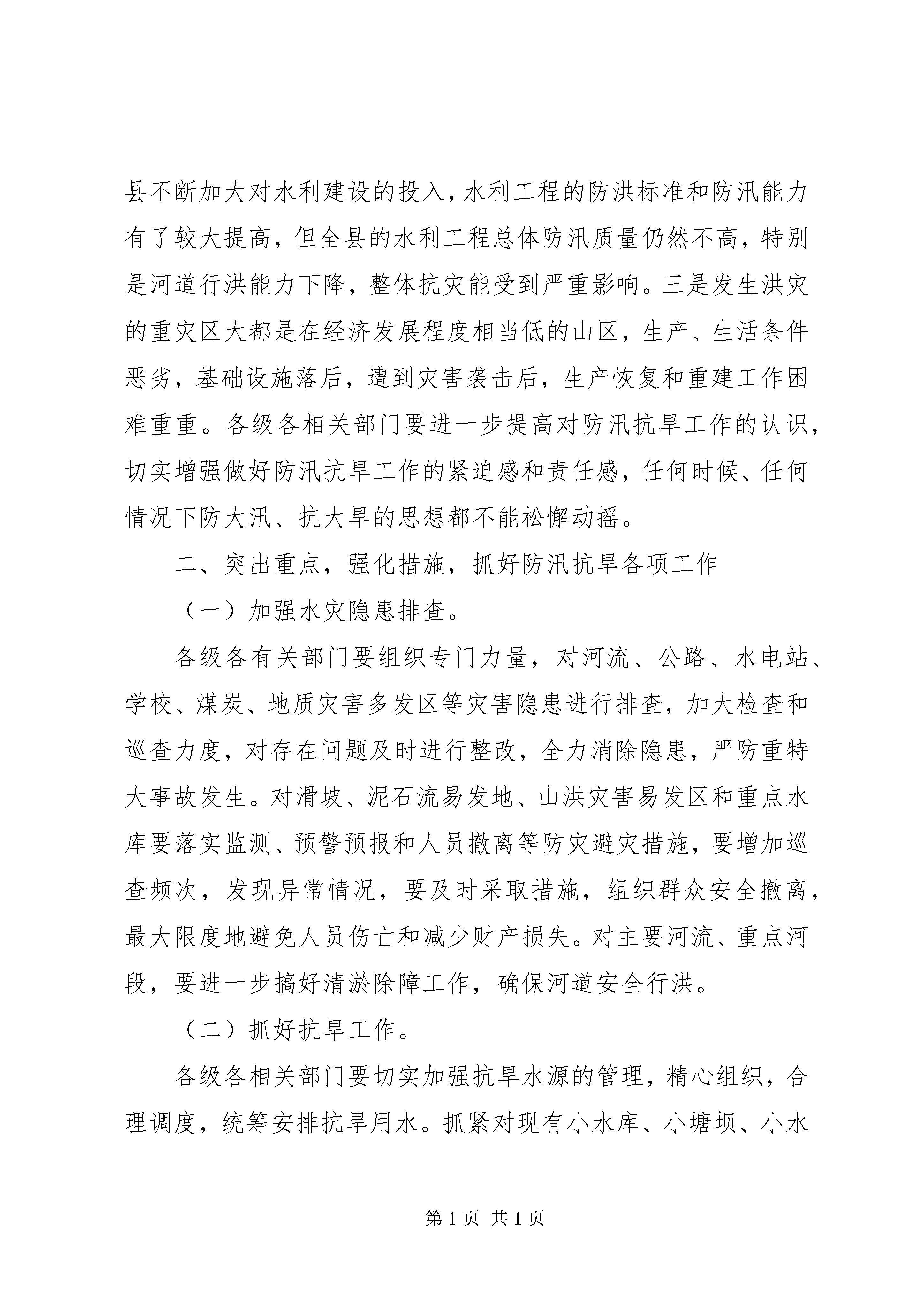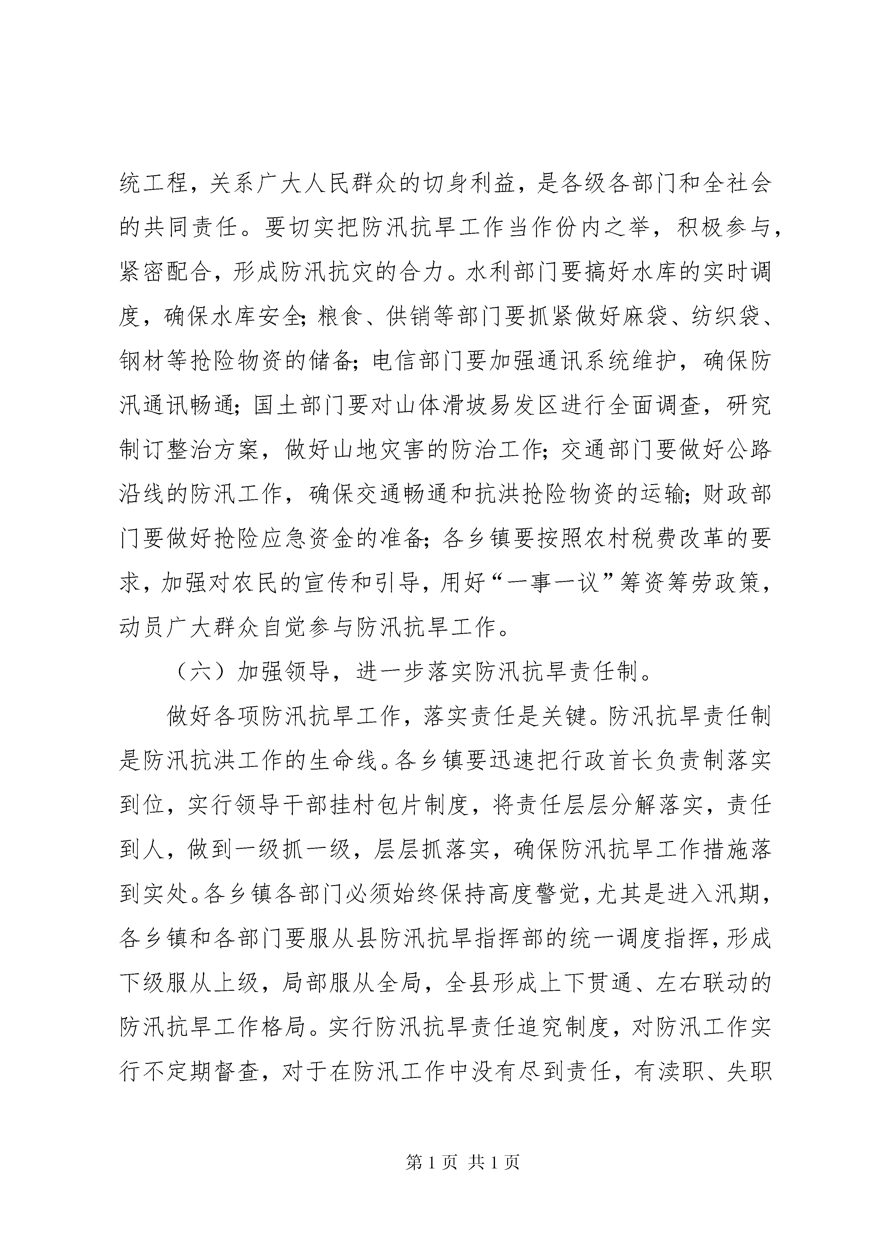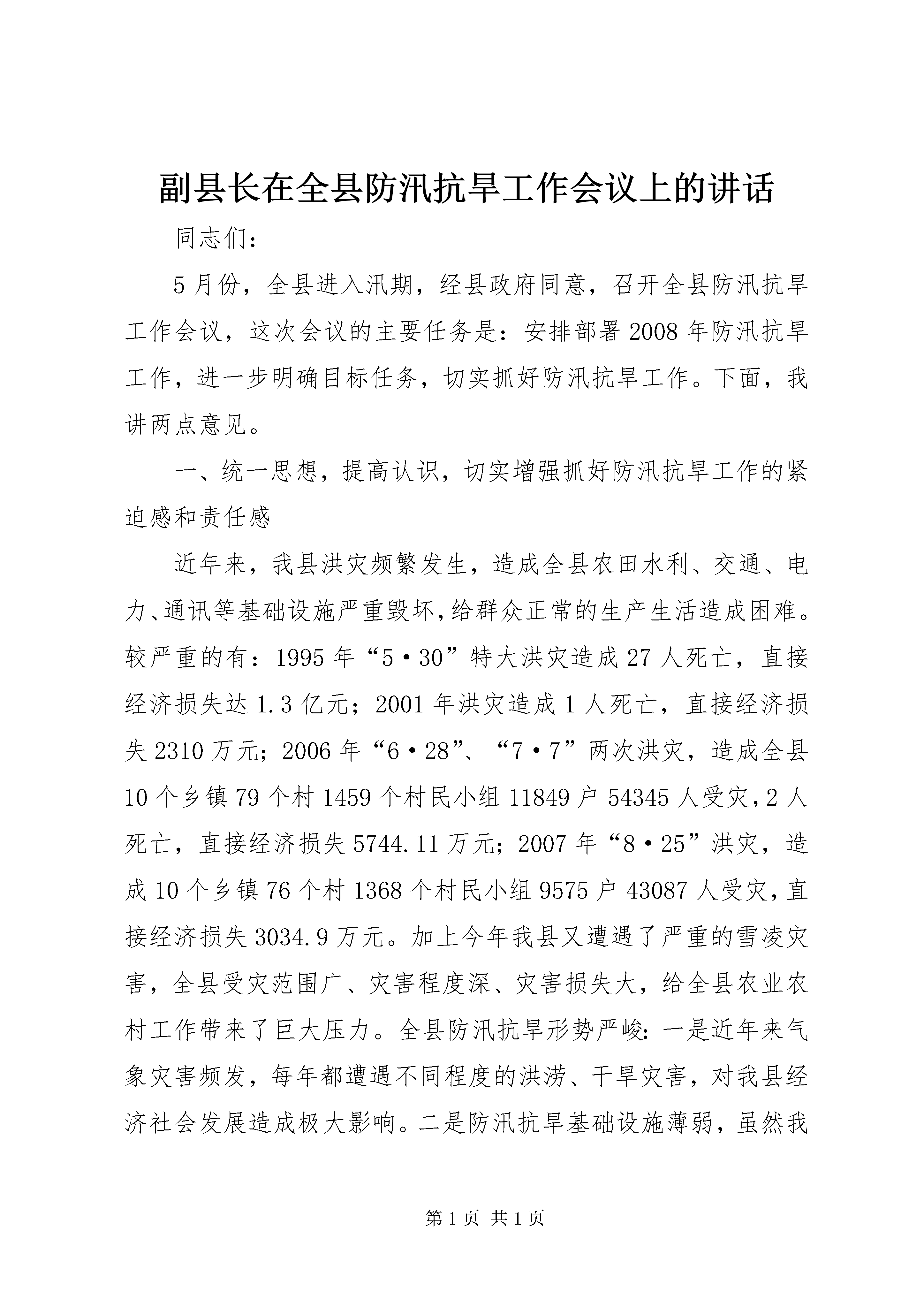 副县长在全县防汛抗旱工作会议上的讲话同志们:5月份,全县进入汛期,经县政府同意,召开全县防汛抗旱工作会议,这次会议的主要任务是:安排部署2008年防汛抗旱工作,进一步明确目标任务,切实抓好防汛抗旱工作。下面,我讲两点意见。一、统一思想,提高认识,切实增强抓好防汛抗旱工作的紧迫感和责任感近年来,我县洪灾频繁发生,造成全县农田水利、交通、电力、通讯等基础设施严重毁坏,给群众正常的生产生活造成困难。较严重的有:1995年“5·30”特大洪灾造成27人死亡,直接经济损失达1.3亿元;2001年洪灾造成1人死亡,直接经济损失2310万元;2006年“6·28”、“7·7”两次洪灾,造成全县10个乡镇79个村1459个村民小组11849户54345人受灾,2人死亡,直接经济损失5744.11万元;2007年“8·25”洪灾,造成10个乡镇76个村1368个村民小组9575户43087人受灾,直接经济损失3034.9万元。加上今年我县又遭遇了严重的雪凌灾害,全县受灾范围广、灾害程度深、灾害损失大,给全县农业农村工作带来了巨大压力。全县防汛抗旱形势严峻:一是近年来气象灾害频发,每年都遭遇不同程度的洪涝、干旱灾害,对我县经济社会发展造成极大影响。二是防汛抗旱基础设施薄弱,虽然我县不断加大对水利建设的投入,水利工程的防洪标准和防汛能力有了较大提高,但全县的水利工程总体防汛质量仍然不高,特别是河道行洪能力下降,整体抗灾能受到严重影响。三是发生洪灾的重灾区大都是在经济发展程度相当低的山区,生产、生活条件恶劣,基础设施落后,遭到灾害袭击后,生产恢复和重建工作困难重重。各级各相关部门要进一步提高对防汛抗旱工作的认识,切实增强做好防汛抗旱工作的紧迫感和责任感,任何时候、任何情况下防大汛、抗大旱的思想都不能松懈动摇。二、突出重点,强化措施,抓好防汛抗旱各项工作(一)加强水灾隐患排查。各级各有关部门要组织专门力量,对河流、公路、水电站、学校、煤炭、地质灾害多发区等灾害隐患进行排查,加大检查和巡查力度,对存在问题及时进行整改,全力消除隐患,严防重特大事故发生。对滑坡、泥石流易发地、山洪灾害易发区和重点水库要落实监测、预警预报和人员撤离等防灾避灾措施,要增加巡查频次,发现异常情况,要及时采取措施,组织群众安全撤离,最大限度地避免人员伤亡和减少财产损失。对主要河流、重点河段,要进一步搞好清淤除障工作,确保河道安全行洪。(二)抓好抗旱工作。各级各相关部门要切实加强抗旱水源的管理,精心组织,合理调度,统筹安排抗旱用水。抓紧对现有小水库、小塘坝、小水池等蓄水工程进行清淤、整修、除险加固,增加蓄水能力。要积极促进推广节水技术,努力增加节水灌溉面积。在水源紧张的地方,适当调整种植结构,尽力减少干旱缺水带来的影响。要深入组织开展抗旱规划工作,按照区域干旱规律和特点,进一步开展区域抗旱规划的研究制订工作。(三)积极做好抗灾救灾准备。一是加强应急预案的制定和完善。制定完善的预防、撤退、抢护、救灾预案,落实到县、乡、村、户,加强对山区群众的宣传教育,提高应对山洪灾害的自我防范意识,提高对山洪灾害的识别能力。进一步强化防汛抗旱组织管理,建立机构健全、管理有序、运转高效、程序规范的防汛抗旱工作组织体系。进一步完善统一领导、统一指挥、统一调度的运行机制,加大组织协调力度,调动各成员单位参与防汛抗旱工作的主动性和积极性,充分发挥各成员单位的作用,形成管理规范、协调有序、权责明确、步调一致的联动机制。一旦发生灾情,多部门联合会商,及时作出工作部署,组织联合工作组赶赴一线,帮助解决实际困难,协助开展工作。二是做好物资准备。做好防汛物资储备是防汛工作的重要任务,各级各部门要按照“防大汛、抗大灾”的要求,按照“分级管理,分级负责”的原则,制定具体的防汛抗旱抢险物资储备计划,查清现有库存,加大防汛块石、三袋、铁锹等物资的储备力度,及早组织调度到位。要切实保证防汛物资质量,确保应急。县水务部门要按要求储备草包、钢管、桩木、元钉、铅丝等防汛物资,用于重大险情的抢险应急和调剂乡镇储备的短缺。三是加强队伍建设。各乡镇要根据实际组建相应抢险抗灾应急队伍,水利部门要进一步充实抢险应急分队人员力量,加强对各级抢险应急队伍的培训,使各级应急人员了解洪水发生规律和安全避险常识,确保做到安全操作,尽量避免人员伤亡,同时严禁组织学生和未成年人参与抢险。进入汛期,各级应急队伍要严阵以待,确保一遇险情能及时出击,真正做到召之能来,来之能战,战之能胜,千方百计保护人民群众的生命财产安全。广大党员和各级干部要充分发挥先锋模范作用,积极参与防汛抗洪抢险救灾。(四)加大执法力度。各级领导要认真学习贯彻《防洪法》、《水法》、《水上保持法》及《河道管理条例》。要加大执法力度,加强涉河建设项目的审批。对于在河道内违