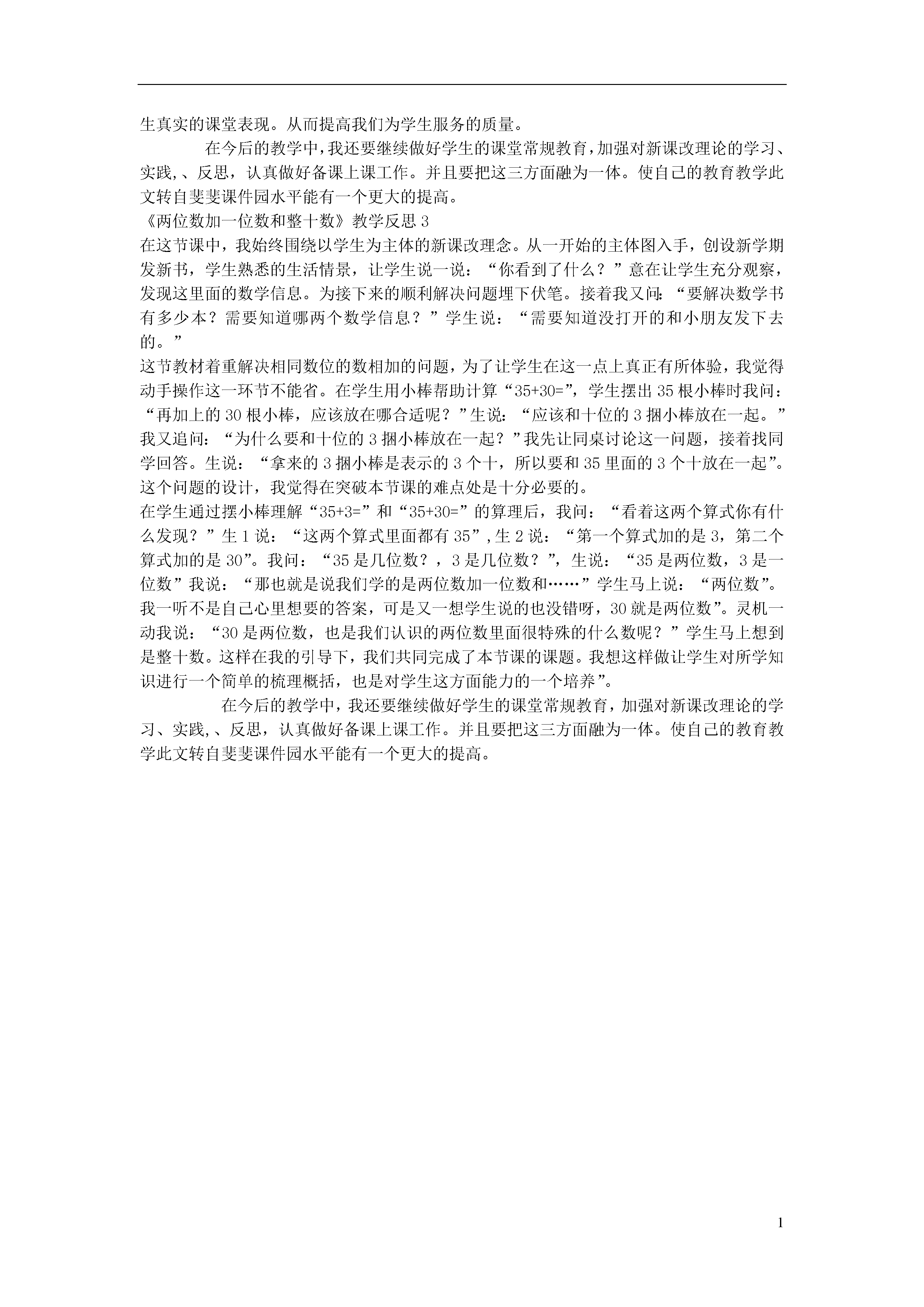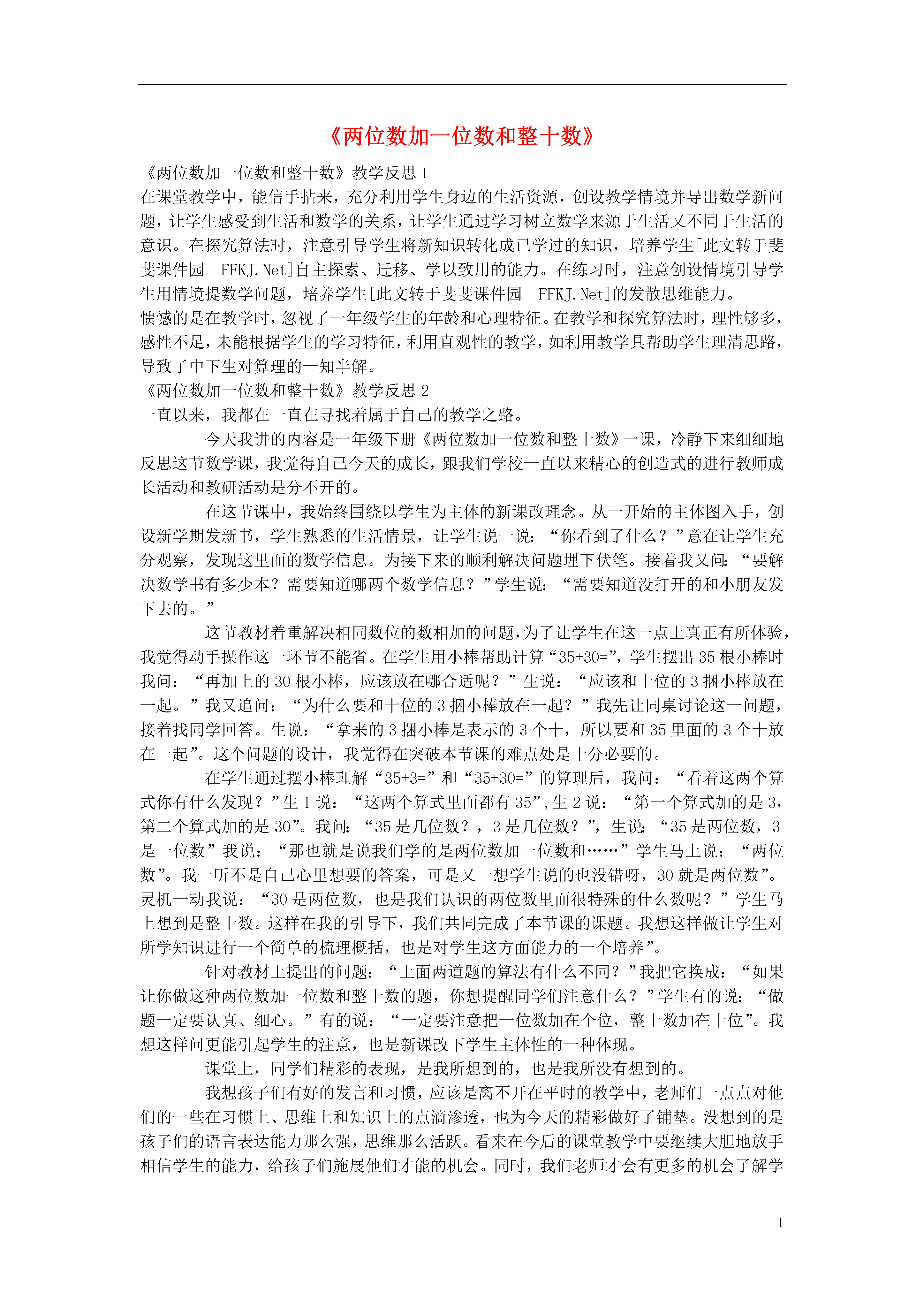 1《两位数加一位数和整十数》《两位数加一位数和整十数》教学反思1在课堂教学中,能信手拈来,充分利用学生身边的生活资源,创设教学情境并导出数学新问题,让学生感受到生活和数学的关系,让学生通过学习树立数学来源于生活又不同于生活的意识。在探究算法时,注意引导学生将新知识转化成已学过的知识,培养学生[此文转于斐斐课件园FFKJ.Net]自主探索、迁移、学以致用的能力。在练习时,注意创设情境引导学生用情境提数学问题,培养学生[此文转于斐斐课件园FFKJ.Net]的发散思维能力。愦憾的是在教学时,忽视了一年级学生的年龄和心理特征。在教学和探究算法时,理性够多,感性不足,未能根据学生的学习特征,利用直观性的教学,如利用教学具帮助学生理清思路,导致了中下生对算理的一知半解。《两位数加一位数和整十数》教学反思2一直以来,我都在一直在寻找着属于自己的教学之路。今天我讲的内容是一年级下册《两位数加一位数和整十数》一课,冷静下来细细地反思这节数学课,我觉得自己今天的成长,跟我们学校一直以来精心的创造式的进行教师成长活动和教研活动是分不开的。在这节课中,我始终围绕以学生为主体的新课改理念。从一开始的主体图入手,创设新学期发新书,学生熟悉的生活情景,让学生说一说:“你看到了什么?”意在让学生充分观察,发现这里面的数学信息。为接下来的顺利解决问题埋下伏笔。接着我又问:“要解决数学书有多少本?需要知道哪两个数学信息?”学生说:“需要知道没打开的和小朋友发下去的。”这节教材着重解决相同数位的数相加的问题,为了让学生在这一点上真正有所体验,我觉得动手操作这一环节不能省。在学生用小棒帮助计算“35+30=”,学生摆出35根小棒时我问:“再加上的30根小棒,应该放在哪合适呢?”生说:“应该和十位的3捆小棒放在一起。”我又追问:“为什么要和十位的3捆小棒放在一起?”我先让同桌讨论这一问题,接着找同学回答。生说:“拿来的3捆小棒是表示的3个十,所以要和35里面的3个十放在一起”。这个问题的设计,我觉得在突破本节课的难点处是十分必要的。在学生通过摆小棒理解“35+3=”和“35+30=”的算理后,我问:“看着这两个算式你有什么发现?”生1说:“这两个算式里面都有35”,生2说:“第一个算式加的是3,第二个算式加的是30”。我问:“35是几位数?,3是几位数?”,生说:“35是两位数,3是一位数”我说:“那也就是说我们学的是两位数加一位数和……”学生马上说:“两位数”。我一听不是自己心里想要的答案,可是又一想学生说的也没错呀,30就是两位数”。灵机一动我说:“30是两位数,也是我们认识的两位数里面很特殊的什么数呢?”学生马上想到是整十数。这样在我的引导下,我们共同完成了本节课的课题。我想这样做让学生对所学知识进行一个简单的梳理概括,也是对学生这方面能力的一个培养”。针对教材上提出的问题:“上面两道题的算法有什么不同?”我把它换成:“如果让你做这种两位数加一位数和整十数的题,你想提醒同学们注意什么?”学生有的说:“做题一定要认真、细心。”有的说:“一定要注意把一位数加在个位,整十数加在十位”。我想这样问更能引起学生的注意,也是新课改下学生主体性的一种体现。课堂上,同学们精彩的表现,是我所想到的,也是我所没有想到的。我想孩子们有好的发言和习惯,应该是离不开在平时的教学中,老师们一点点对他们的一些在习惯上、思维上和知识上的点滴渗透,也为今天的精彩做好了铺垫。没想到的是孩子们的语言表达能力那么强,思维那么活跃。看来在今后的课堂教学中要继续大胆地放手相信学生的能力,给孩子们施展他们才能的机会。同时,我们老师才会有更多的机会了解学生真实的课堂表现。从而提高我们为学生服务的质量。在今后的教学中,我还要继续做好学生的课堂常规教育,加强对新课改理论的学习、实践,、反思,认真做好备课上课工作。并且要把这三方面融为一体。使自己的教育教学此文转自斐斐课件园水平能有一个更大的提高。《两位数加一位数和整十数》教学反思3在这节课中,我始终围绕以学生为主体的新课改理念。从一开始的主体图入手,创设新学期发新书,学生熟悉的生活情景,让学生说一说:“你看到了什么?”意在让学生充分观察,发现这里面的数学信息。为接下来的顺利解决问题埋下伏笔。接着我又问:“要解决数学书有多少本?需要知道哪两个数学信息?”学生说:“需要知道没打开的和小朋友发下去的。”这节教材着重解决相同数位的数相加的问题,为了让学生在这一点上真正有所体验,我觉得动手操作这一环节不能省。在学生用小棒帮助计算“35+30=”,学生摆出35根小棒时我问:“再加上的30根小棒,应该放在哪合适呢?”生说:“应该和十位的3捆小棒放在一起。”我又追