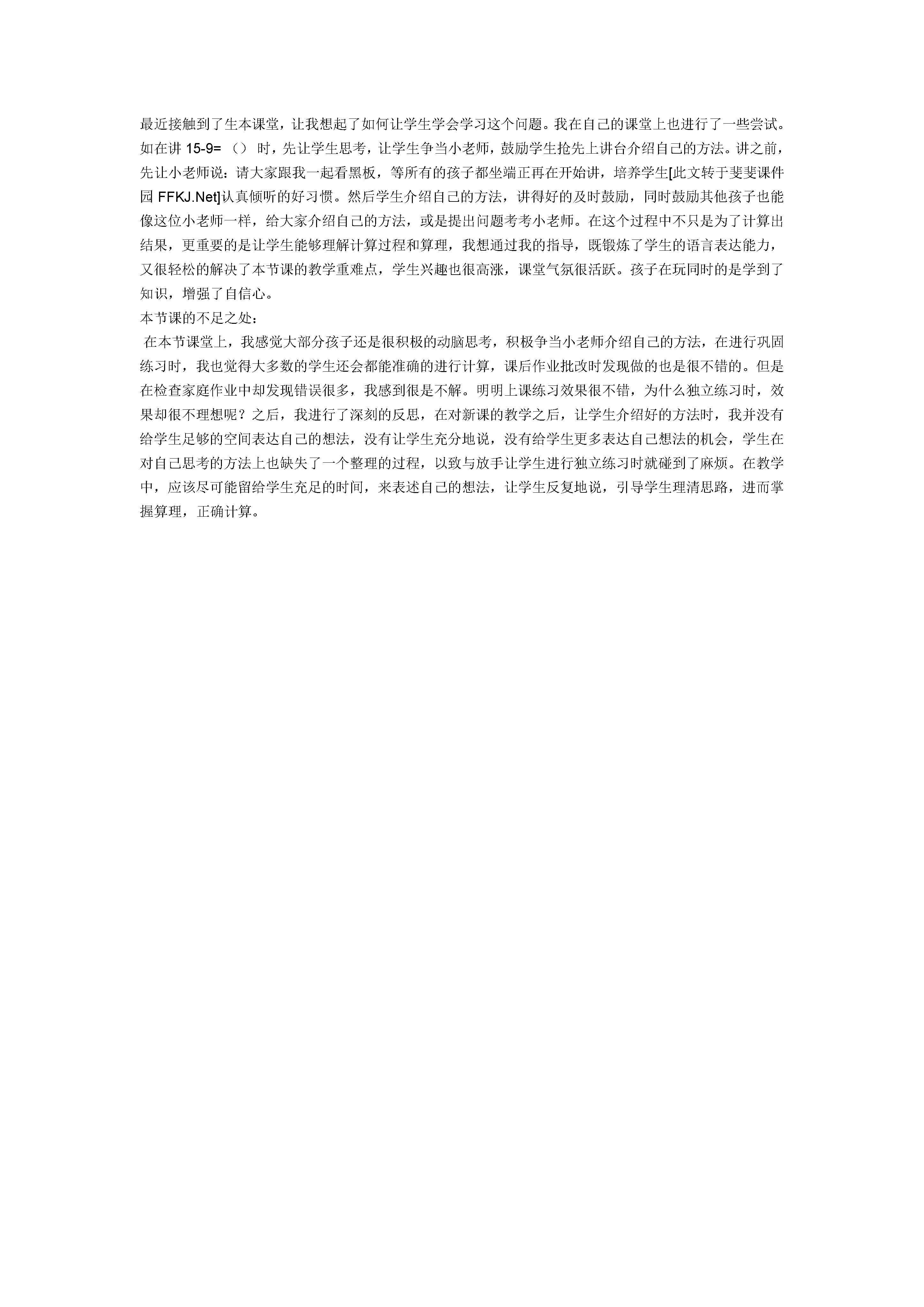 《十几减几》《十几减几》教学反思在设计本节内容时,对教材内容作了比较大的改动。从实际的教学情况来看,我们认为在以下几个方面做得比较成功,也取得了一定的效果。从教学实践来看,“猴子爬树摘桃”的情景比教材“小猫观金鱼图”更具开放性,学习素材更为丰富,使问题呈现具有了现实意义。13只猴子在一起玩,一些猴子爬上了树,有些能够看到,有些钻入了树丛看不见,现在地面上还剩下6只猴子。那么“树上到底爬上了几只猴子”呢?问题的呈现显得比较自然,也是学生想知道的。于是例题13-6在这样的背景下产生。《数学课程标准(实验稿)》“提倡算法多样化”,其实包括“多样化”和“优化”两方面的内涵。“多样化”是指“群体的多样”,即教师在教学中尊重学生的思维个性,允许学生有自己的想法,并展示出来供大家探讨;“优化”是指“个体的优化”,即在多种方法呈现后,教师有意识地引导学生充分感知方法,在比较的基础上选择适合自己思维特点和个性特征的方法。简言之,“算法多样化”并不是指方法越多越好,“算法优化”也不是统一成一种方法,教师在实际的教学中,要结合具体的教学内容准确把握。我们认为,“十几减几”这一块内容,从知识层面来说,是学生今后学习“百以内减法”、“多位数减法”的基础。但从技能层面来说,学生口算时所运用的几种算法(如“破十减”、“想加算减”、“连续减”等),没有孰优孰劣之分,因为当学生对“20以内”的32道退位减法熟练以后,便如同“乘法口诀”一样,将成为一种“数字性事实运用到今后的减法运算中,”常常采用提取记忆的方式即可。因此,本节课在对算法的要求上,允许学生用不同的方法,教师也有意识地引导学生多次关注自己的方法,加深对自己原有口算方法的理解,最终强化根据算式特点或自身经验选择得来的方法。《十几减几》教学反思对于一年级孩子来说,两位数减一位数的退位减法是教学中比较难的一部分内容,这部分知识如果学生掌握不牢,对以后退位减法的学习会带来不必要的麻烦,所以在教学这节课之前,我对这节课做了充分的预设。例如:在教学中,我设计了四种计算方法,如15-9=第一种:用图圈一圈,用虚线圈起来9个,剩下6个第二种:想加法算减法想9+()=15因为9+6=15所以15-9=6第三种:15-9=6/\5101第四种:15-9=6/\5410对于以上三种方法,我起初是这样认为的。第一种方法是最直观,最简单的,但是不能每次口算都得画图。剩余的三种方法,我以为第二种是较容易想到的,因为学生刚刚学过进位加法,对于加法应该是比较熟悉和熟练的。第三种方法(破十法)和第四种方法是学生最难想到和最难掌握的。但是这堂课却出乎我的预料,第二种方法却成了最难的,学生首先要算出9+()=15,再转化成减法算式,而对于学生来说,进位加法也是一个难点,许多孩子很难一下子想出9+()=15,更何况还要转化减法算式。但是用加法算减法也是一种不错的计算方法,班里还是有孩子能够想到,但是老师在讲课的时候还是有必要教给孩子这种方法的。在教学中,我起初更倾向于第四种方法。因为15—5=10很容易计算,一下就能计算出来。将一个减法算式转化成一个连减的算式。而第三种方法我认为一会儿加一会儿又减,学生可能会有些糊涂,搞不清楚什么时候加什么时候减。通过本节课教学事实并非如此,大多数学生反而更倾向于第三种方法。课后我也曾反思其原因,15可以分为10和5,其中10-9=1,还剩下5,5+1=6,13-9=3+1=4,14-9=4+1=5……有些孩子马上发现十几减9的算式,就是被减数个位上的数加上1。当我追问为什么要加上1时,有些孩子就说是因为用10-9=1,个位是的数并没有用到。所以被减数个位上的数加上1就是最后的得数。最近接触到了生本课堂,让我想起了如何让学生学会学习这个问题。我在自己的课堂上也进行了一些尝试。如在讲15-9=()时,先让学生思考,让学生争当小老师,鼓励学生抢先上讲台介绍自己的方法。讲之前,先让小老师说:请大家跟我一起看黑板,等所有的孩子都坐端正再在开始讲,培养学生[此文转于斐斐课件园FFKJ.Net]认真倾听的好习惯。然后学生介绍自己的方法,讲得好的及时鼓励,同时鼓励其他孩子也能像这位小老师一样,给大家介绍自己的方法,或是提出问题考考小老师。在这个过程中不只是为了计算出结果,更重要的是让学生能够理解计算过程和算理,我想通过我的指导,既锻炼了学生的语言表达能力,又很轻松的解决了本节课的教学重难点,学生兴趣也很高涨,课堂气氛很活跃。孩子在玩同时的是学到了知识,增强了自信心。本节课的不足之处:在本节课堂上,我感