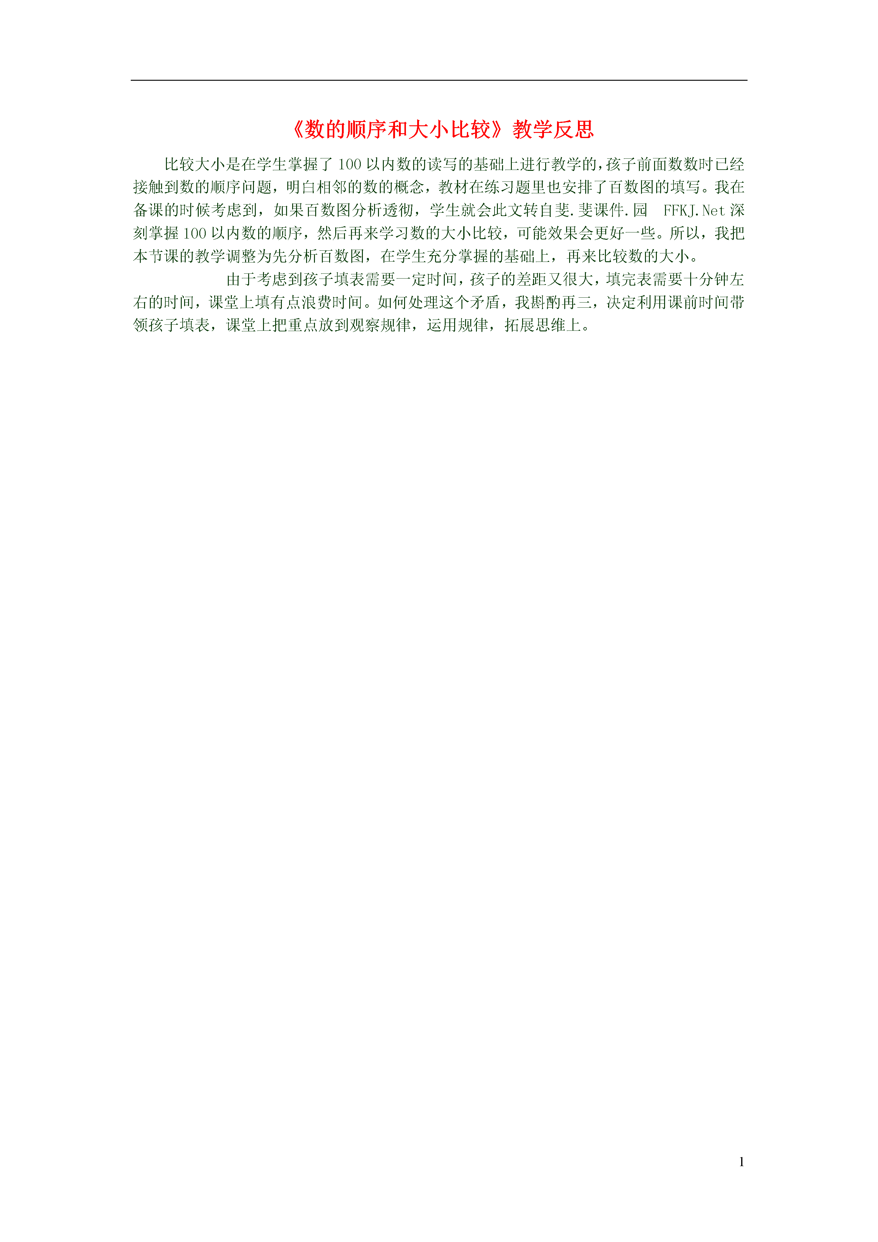 1《数的顺序和大小比较》教学反思比较大小是在学生掌握了100以内数的读写的基础上进行教学的,孩子前面数数时已经接触到数的顺序问题,明白相邻的数的概念,教材在练习题里也安排了百数图的填写。我在备课的时候考虑到,如果百数图分析透彻,学生就会此文转自斐.斐课件.园FFKJ.Net深刻掌握100以内数的顺序,然后再来学习数的大小比较,可能效果会更好一些。所以,我把本节课的教学调整为先分析百数图,在学生充分掌握的基础上,再来比较数的大小。由于考虑到孩子填表需要一定时间,孩子的差距又很大,填完表需要十分钟左右的时间,课堂上填有点浪费时间。如何处理这个矛盾,我斟酌再三,决定利用课前时间带领孩子填表,课堂上把重点放到观察规律,运用规律,拓展思维上。