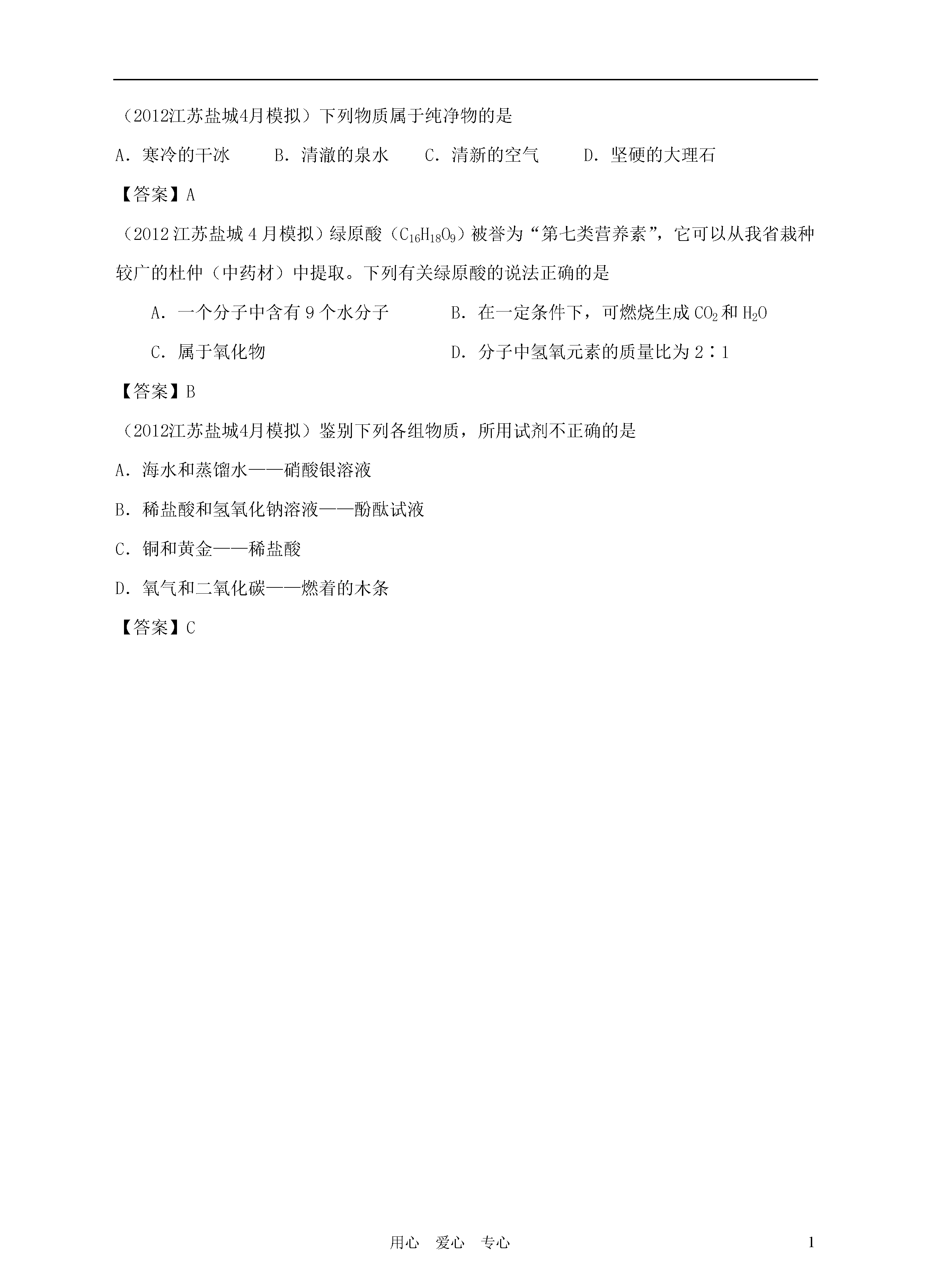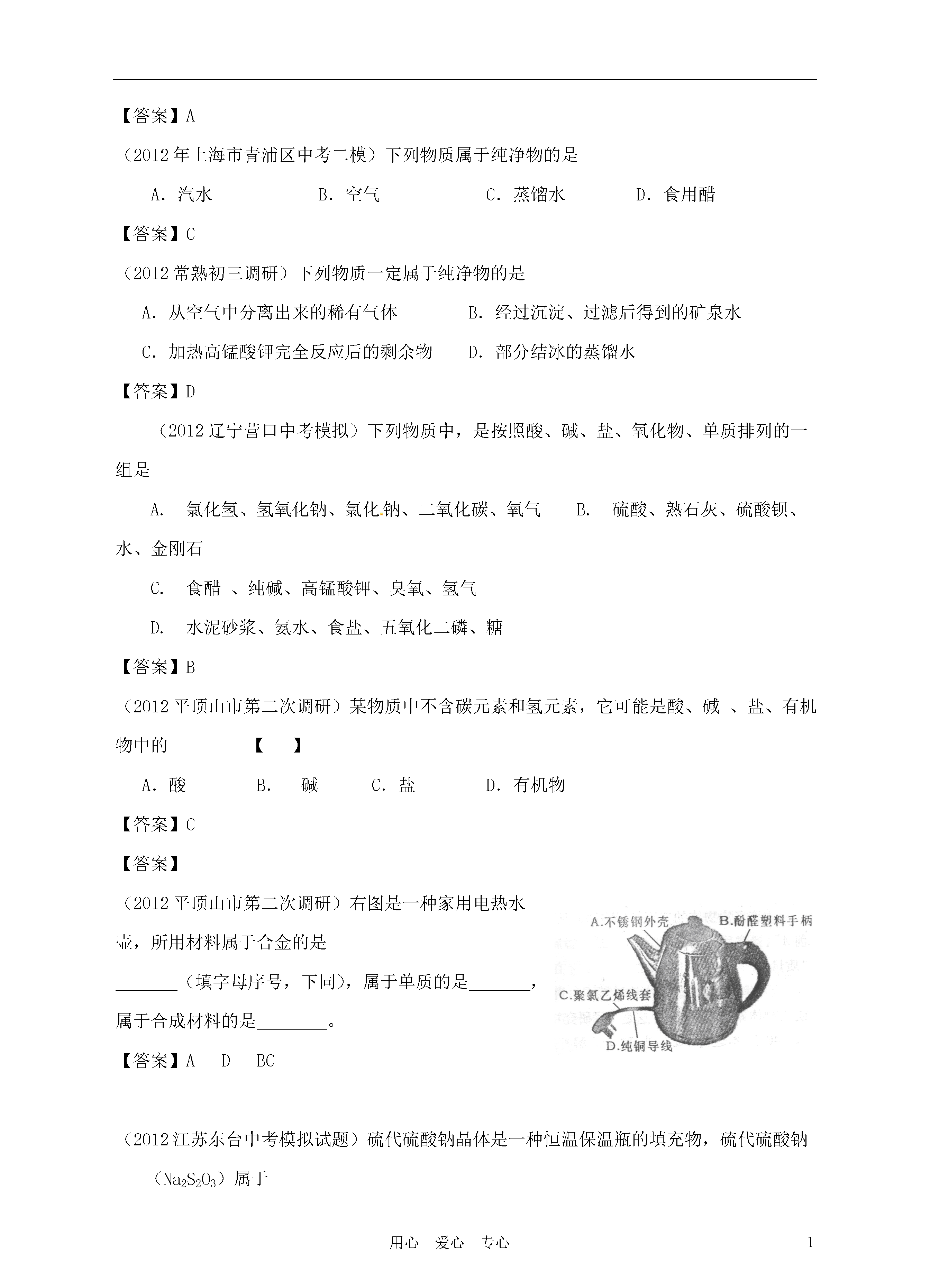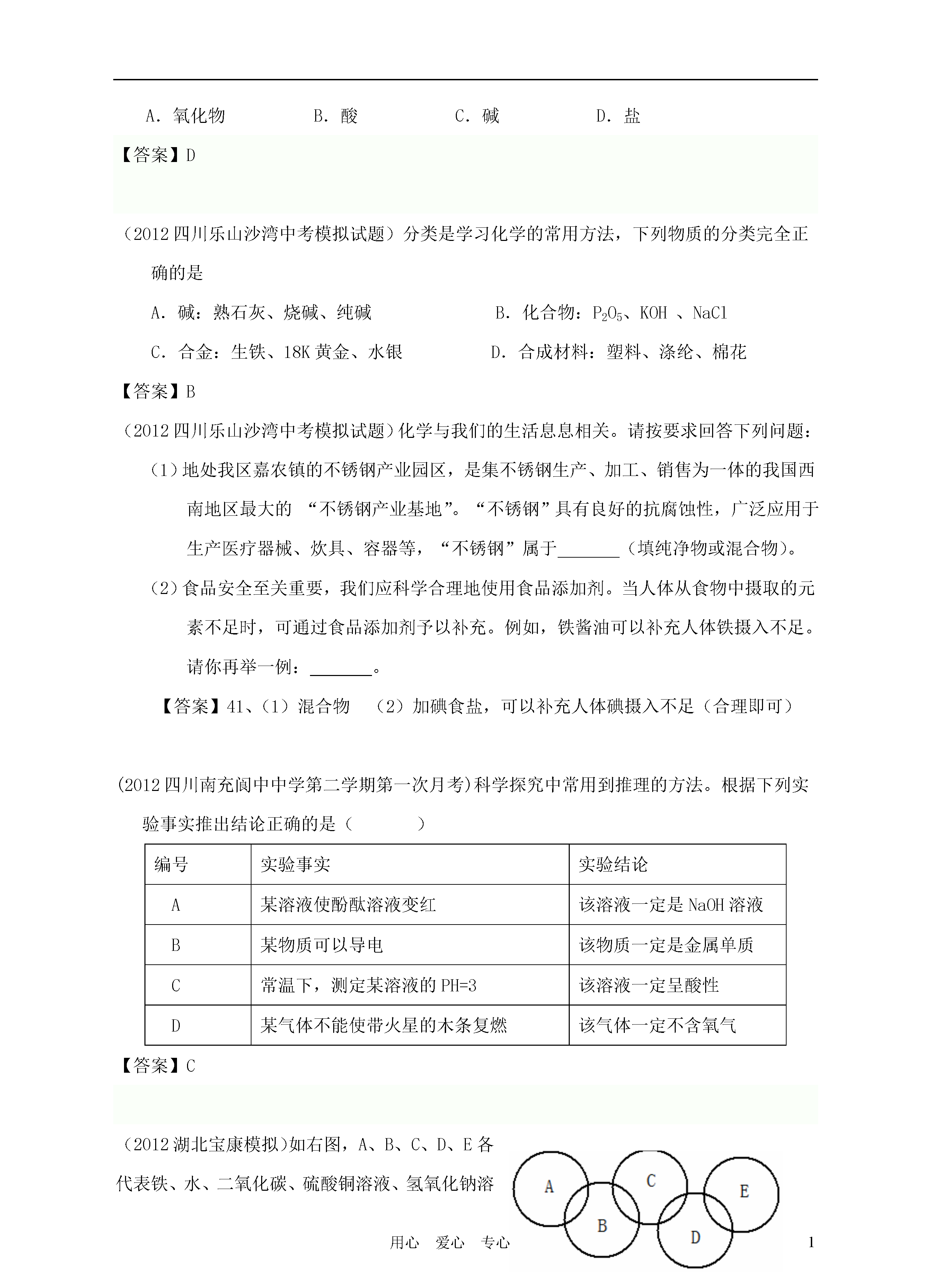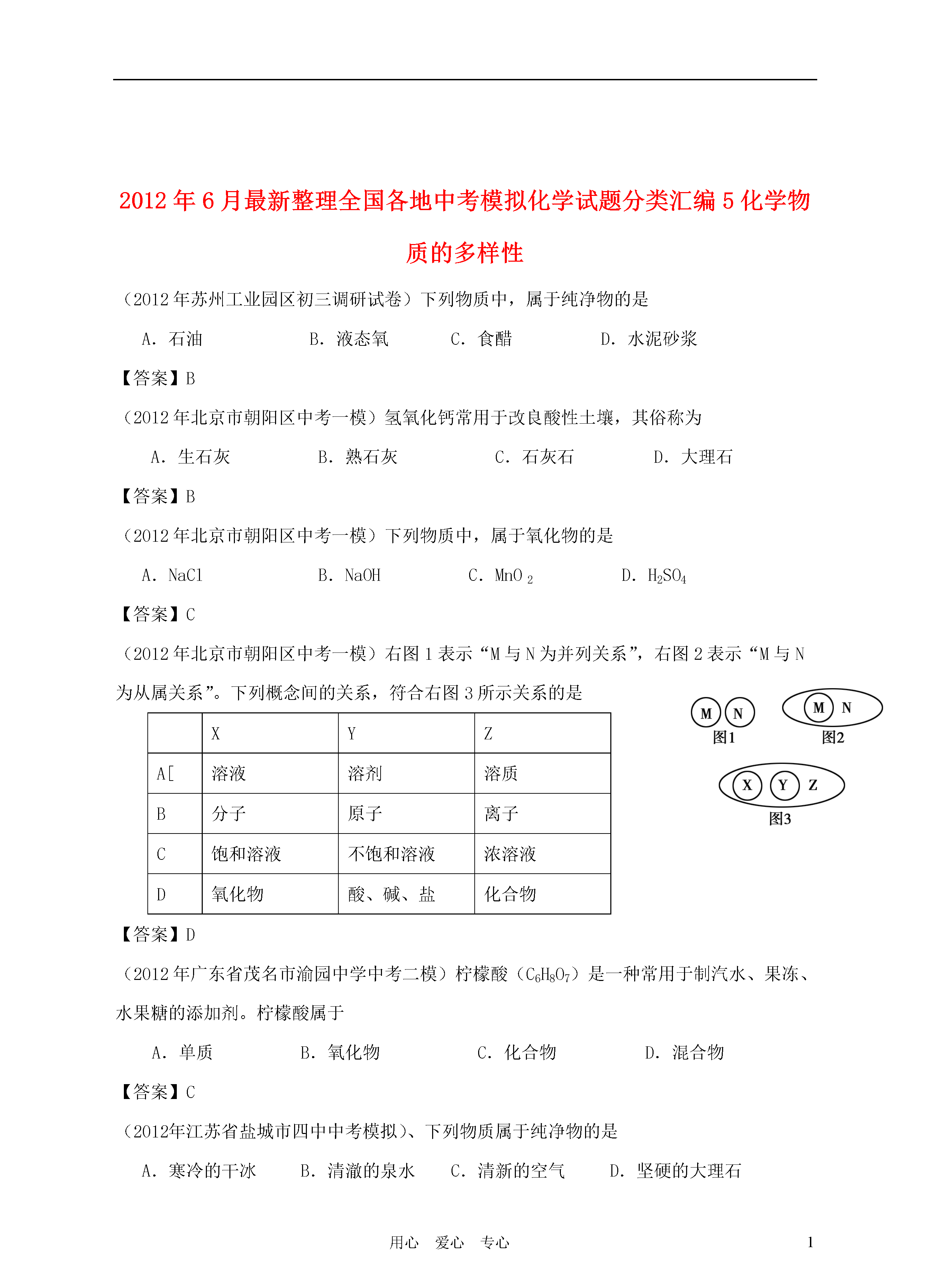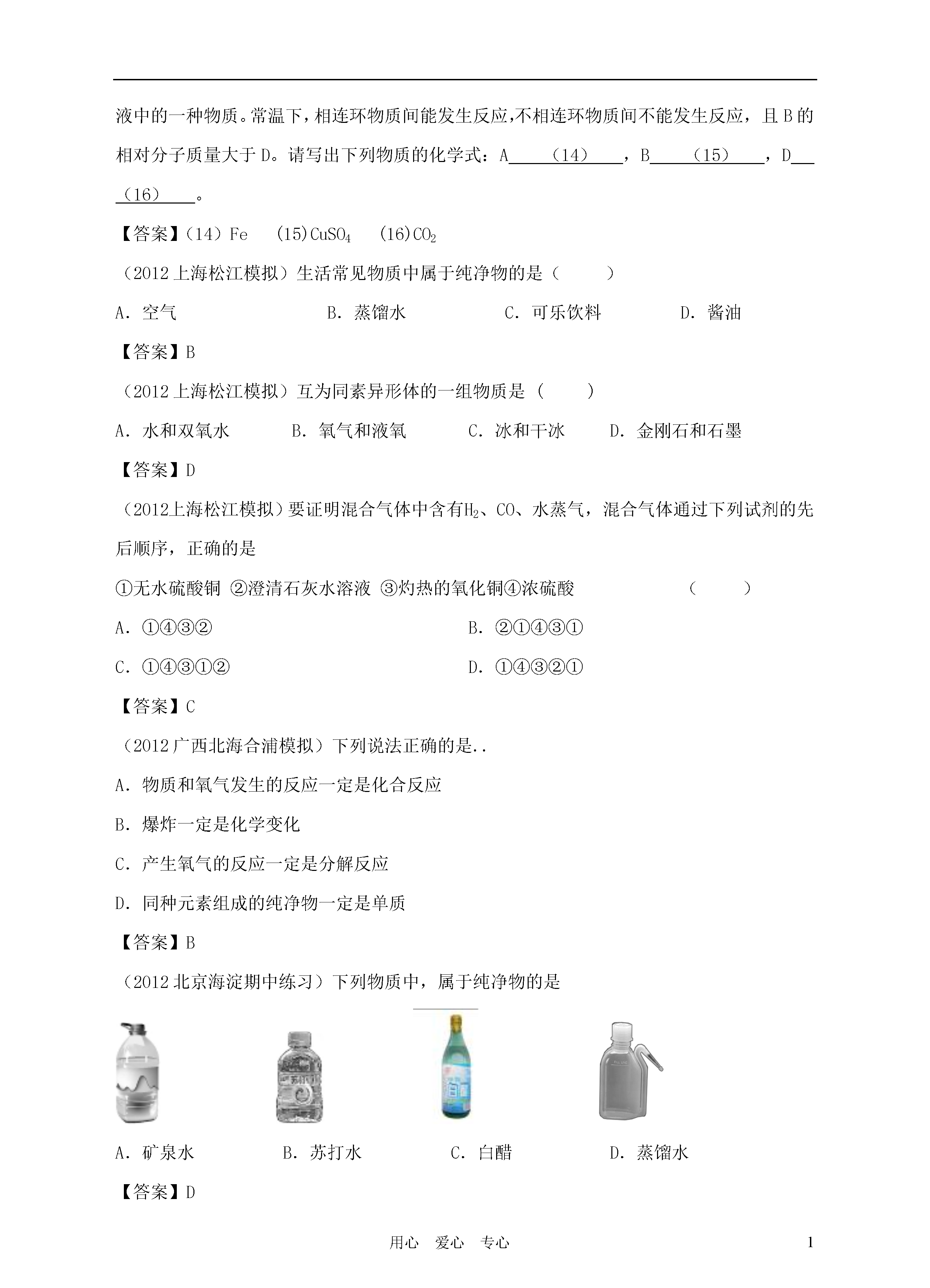 1用心爱心专心2012年6月最新整理全国各地中考模拟化学试题分类汇编5化学物质的多样性(2012年苏州工业园区初三调研试卷)下列物质中,属于纯净物的是A.石油B.液态氧C.食醋D.水泥砂浆【答案】B(2012年北京市朝阳区中考一模)氢氧化钙常用于改良酸性土壤,其俗称为A.生石灰B.熟石灰C.石灰石D.大理石【答案】B(2012年北京市朝阳区中考一模)下列物质中,属于氧化物的是A.NaClB.NaOHC.MnO2D.H2SO4【答案】C(2012年北京市朝阳区中考一模)右图1表示“M与N为并列关系”,右图2表示“M与N为从属关系”。下列概念间的关系,符合右图3所示关系的是XYZA[溶液溶剂溶质B分子原子离子C饱和溶液不饱和溶液浓溶液D氧化物酸、碱、盐化合物【答案】D(2012年广东省茂名市渝园中学中考二模)柠檬酸(C6H8O7)是一种常用于制汽水、果冻、水果糖的添加剂。柠檬酸属于A.单质B.氧化物C.化合物D.混合物【答案】C(2012年江苏省盐城市四中中考模拟)、下列物质属于纯净物的是A.寒冷的干冰B.清澈的泉水C.清新的空气D.坚硬的大理石【答案】A(2012年上海市青浦区中考二模)下列物质属于纯净物的是A.汽水B.空气C.蒸馏水D.食用醋【答案】C(2012常熟初三调研)下列物质一定属于纯净物的是A.从空气中分离出来的稀有气体B.经过沉淀、过滤后得到的矿泉水C.加热高锰酸钾完全反应后的剩余物D.部分结冰的蒸馏水【答案】D(2012辽宁营口中考模拟)下列物质中,是按照酸、碱、盐、氧化物、单质排列的一组是A.氯化氢、氢氧化钠、氯化钠、二氧化碳、氧气B.硫酸、熟石灰、硫酸钡、水、金刚石C.食醋、纯碱、高锰酸钾、臭氧、氢气D.水泥砂浆、氨水、食盐、五氧化二磷、糖【答案】B(2012平顶山市第二次调研)某物质中不含碳元素和氢元素,它可能是酸、碱、盐、有机物中的【】A.酸B.碱C.盐D.有机物【答案】C【答案】(2012平顶山市第二次调研)右图是一种家用电热水壶,所用材料属于合金的是(填字母序号,下同),属于单质的是,属于合成材料的是。【答案】ADBC(2012江苏东台中考模拟试题)硫代硫酸钠晶体是一种恒温保温瓶的填充物,硫代硫酸钠(Na2S2O3)属于A.氧化物B.酸C.碱D.盐【答案】D(2012四川乐山沙湾中考模拟试题)分类是学习化学的常用方法,下列物质的分类完全正确的是A.碱:熟石灰、烧碱、纯碱B.化合物:P2O5、KOH、NaClC.合金:生铁、18K黄金、水银D.合成材料:塑料、涤纶、棉花【答案】B(2012四川乐山沙湾中考模拟试题)化学与我们的生活息息相关。请按要求回答下列问题:(1)地处我区嘉农镇的不锈钢产业园区,是集不锈钢生产、加工、销售为一体的我国西南地区最大的“不锈钢产业基地”。“不锈钢”具有良好的抗腐蚀性,广泛应用于生产医疗器械、炊具、容器等,“不锈钢”属于(填纯净物或混合物)。(2)食品安全至关重要,我们应科学合理地使用食品添加剂。当人体从食物中摄取的元素不足时,可通过食品添加剂予以补充。例如,铁酱油可以补充人体铁摄入不足。请你再举一例:。【答案】41、(1)混合物(2)加碘食盐,可以补充人体碘摄入不足(合理即可)(2012四川南充阆中中学第二学期第一次月考)科学探究中常用到推理的方法。根据下列实验事实推出结论正确的是()编号实验事实实验结论A某溶液使酚酞溶液变红该溶液一定是NaOH溶液B某物质可以导电该物质一定是金属单质C常温下,测定某溶液的PH=3该溶液一定呈酸性D某气体不能使带火星的木条复燃该气体一定不含氧气【答案】C(2012湖北宝康模拟)如右图,A、B、C、D、E各代表铁、水、二氧化碳、硫酸铜溶液、氢氧化钠溶液中的一种物质。常温下,相连环物质间能发生反应,不相连环物质间不能发生反应,且B的相对分子质量大于D。请写出下列物质的化学式:A(14),B(15),D(16)。【答案】(14)Fe(15)CuSO4(16)CO2(2012上海松江模拟)生活常见物质中属于纯净物的是()A.空气B.蒸馏水C.可乐饮料D.酱油【答案】B(2012上海松江模拟)互为同素异形体的一组物质是()A.水和双氧水B.氧气和液氧C.冰和干冰D.金刚石和石墨【答案】D(2012上海松江模拟)要证明混合气体中含有H2、CO、水蒸气,混合气体通过下列试剂的先后顺序,正确的是①无水硫酸铜②澄清石灰水溶液③灼热的氧化铜④浓硫酸()A.①④③②B.②①④③①C.①④③①②D.①④③②①【答案】C(2012广西北海合浦模拟)下列说法正确的是..A.物质和氧气发生的反应一定是化合反应B.