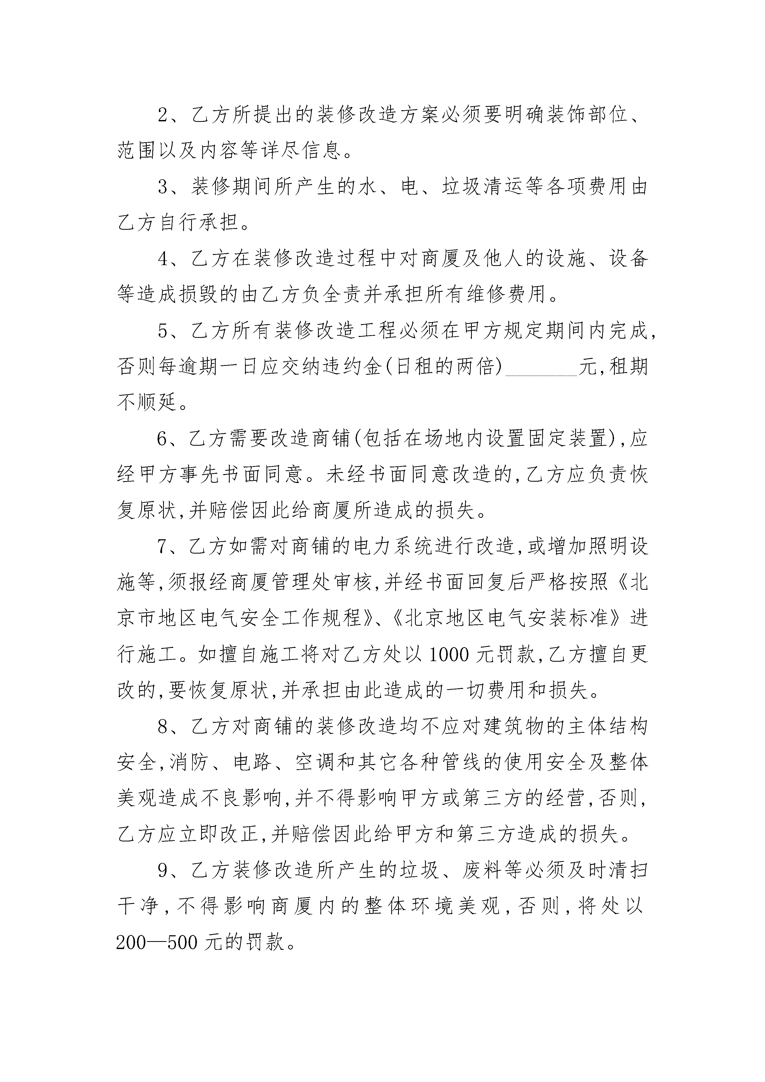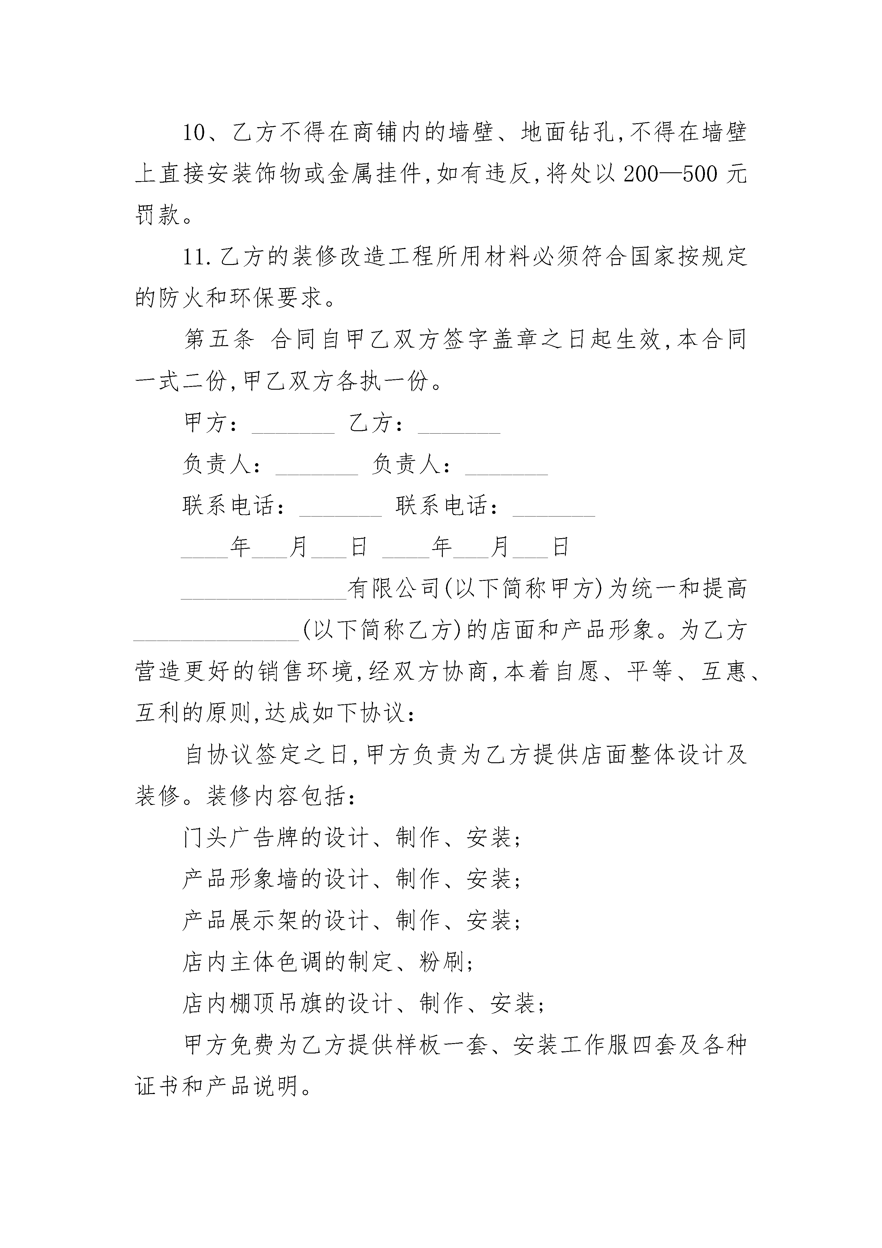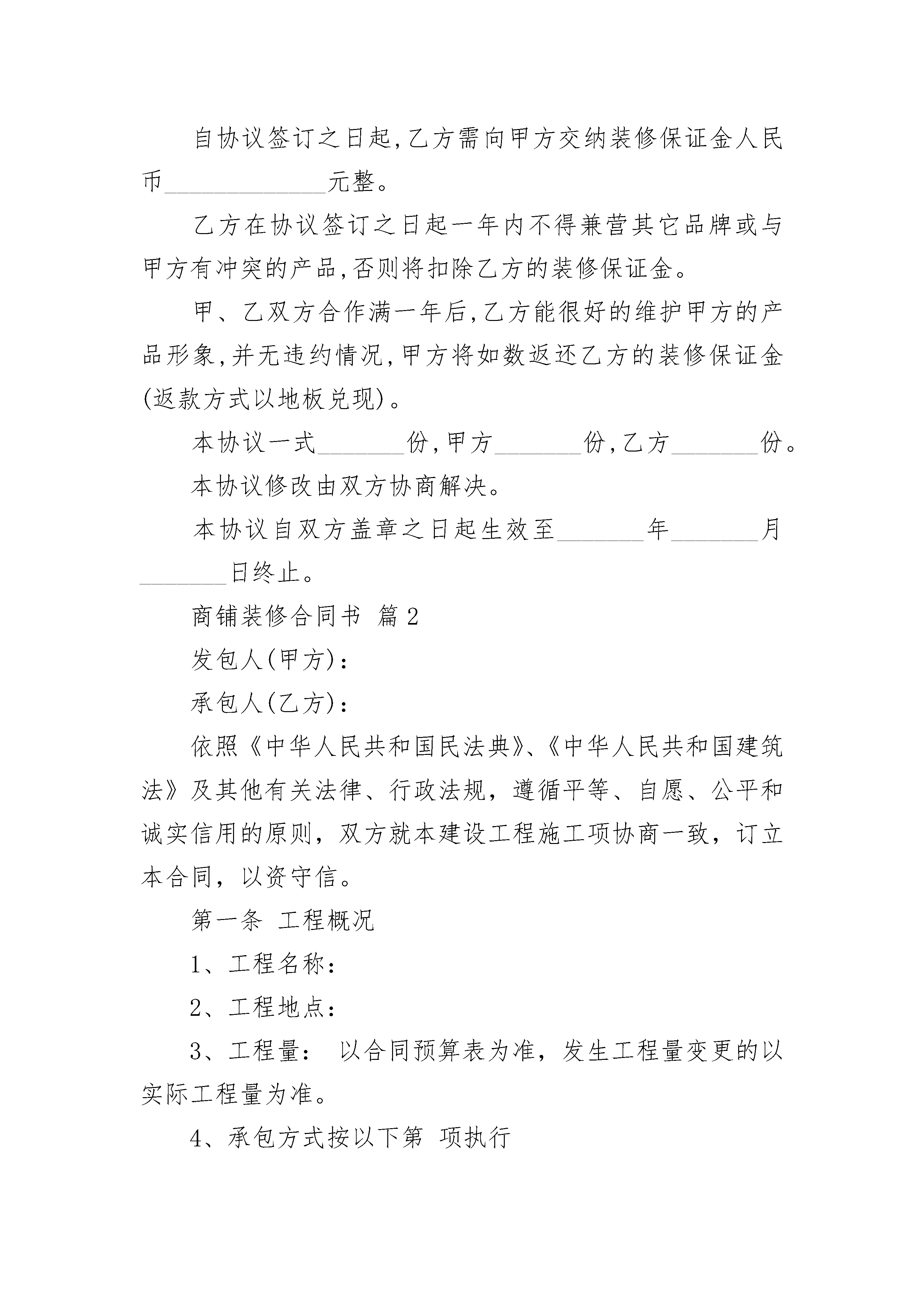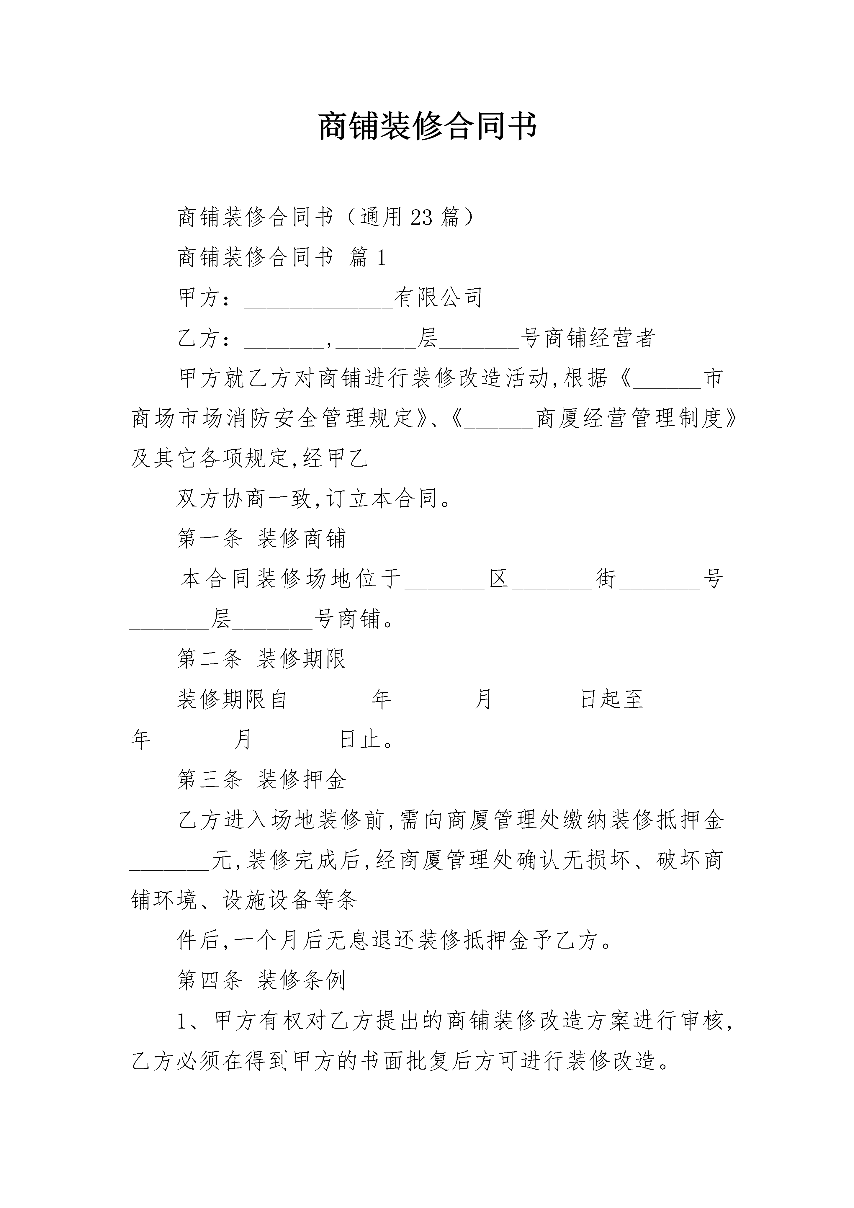 商铺装修合同书商铺装修合同书(通用23篇)商铺装修合同书篇1甲方:_____________有限公司乙方:_______,_______层_______号商铺经营者甲方就乙方对商铺进行装修改造活动,根据《______市商场市场消防安全管理规定》、《______商厦经营管理制度》及其它各项规定,经甲乙双方协商一致,订立本合同。第一条装修商铺本合同装修场地位于_______区_______街_______号_______层_______号商铺。第二条装修期限装修期限自_______年_______月_______日起至_______年_______月_______日止。第三条装修押金乙方进入场地装修前,需向商厦管理处缴纳装修抵押金_______元,装修完成后,经商厦管理处确认无损坏、破坏商铺环境、设施设备等条件后,一个月后无息退还装修抵押金予乙方。第四条装修条例1、甲方有权对乙方提出的商铺装修改造方案进行审核,乙方必须在得到甲方的书面批复后方可进行装修改造。2、乙方所提出的装修改造方案必须要明确装饰部位、范围以及内容等详尽信息。3、装修期间所产生的水、电、垃圾清运等各项费用由乙方自行承担。4、乙方在装修改造过程中对商厦及他人的设施、设备等造成损毁的由乙方负全责并承担所有维修费用。5、乙方所有装修改造工程必须在甲方规定期间内完成,否则每逾期一日应交纳违约金(日租的两倍)_______元,租期不顺延。6、乙方需要改造商铺(包括在场地内设置固定装置),应经甲方事先书面同意。未经书面同意改造的,乙方应负责恢复原状,并赔偿因此给商厦所造成的损失。7、乙方如需对商铺的电力系统进行改造,或增加照明设施等,须报经商厦管理处审核,并经书面回复后严格按照《北京市地区电气安全工作规程》、《北京地区电气安装标准》进行施工。如擅自施工将对乙方处以1000元罚款,乙方擅自更改的,要恢复原状,并承担由此造成的一切费用和损失。8、乙方对商铺的装修改造均不应对建筑物的主体结构安全,消防、电路、空调和其它各种管线的使用安全及整体美观造成不良影响,并不得影响甲方或第三方的经营,否则,乙方应立即改正,并赔偿因此给甲方和第三方造成的损失。9、乙方装修改造所产生的垃圾、废料等必须及时清扫干净,不得影响商厦内的整体环境美观,否则,将处以200—500元的罚款。10、乙方不得在商铺内的墙壁、地面钻孔,不得在墙壁上直接安装饰物或金属挂件,如有违反,将处以200—500元罚款。11.乙方的装修改造工程所用材料必须符合国家按规定的防火和环保要求。第五条合同自甲乙双方签字盖章之日起生效,本合同一式二份,甲乙双方各执一份。甲方:_______乙方:_______负责人:_______负责人:_______联系电话:_______联系电话:___________年___月___日____年___月___日______________有限公司(以下简称甲方)为统一和提高______________(以下简称乙方)的店面和产品形象。为乙方营造更好的销售环境,经双方协商,本着自愿、平等、互惠、互利的原则,达成如下协议:自协议签定之日,甲方负责为乙方提供店面整体设计及装修。装修内容包括:门头广告牌的设计、制作、安装;产品形象墙的设计、制作、安装;产品展示架的设计、制作、安装;店内主体色调的制定、粉刷;店内棚顶吊旗的设计、制作、安装;甲方免费为乙方提供样板一套、安装工作服四套及各种证书和产品说明。自协议签订之日起,乙方需向甲方交纳装修保证金人民币_____________元整。乙方在协议签订之日起一年内不得兼营其它品牌或与甲方有冲突的产品,否则将扣除乙方的装修保证金。甲、乙双方合作满一年后,乙方能很好的维护甲方的产品形象,并无违约情况,甲方将如数返还乙方的装修保证金(返款方式以地板兑现)。本协议一式_______份,甲方_______份,乙方_______份。本协议修改由双方协商解决。本协议自双方盖章之日起生效至_______年_______月_______日终止。商铺装修合同书篇2发包人(甲方):承包人(乙方):依照《中华人民共和国民法典》、《中华人民共和国建筑法》及其他有关法律、行政法规,遵循平等、自愿、公平和诚实信用的原则,双方就本建设工程施工项协商一致,订立本合同,以资守信。第一条工程概况1、工程名称:2、工程地点:3、工程量:以合同预算表为准,发生工程量变更的以实际工程量为准。4、承包方式按以下第项执行(1)包工包料(2)包工不包料(3)包工;部分包料(4)包料;部分包工第二条工期1、开工日期:年月日2、竣工日期:年月日3、工程总用工时间:天(工期顺延的时间未计入)第三条工程价款本工程总造价为:(大写)(人民币)¥:元注:此价款为工程结算依据,最终要按实际发生的工程量计算第四条工程质量