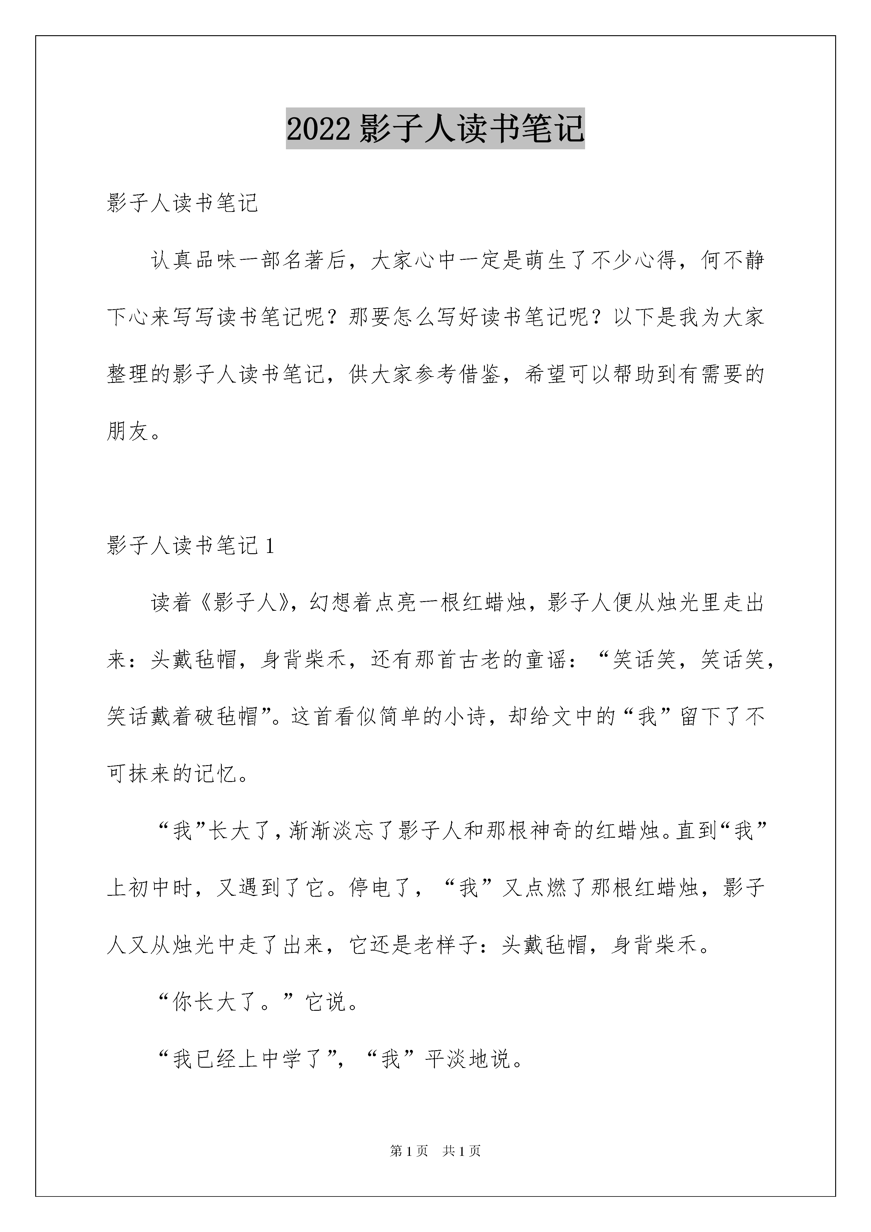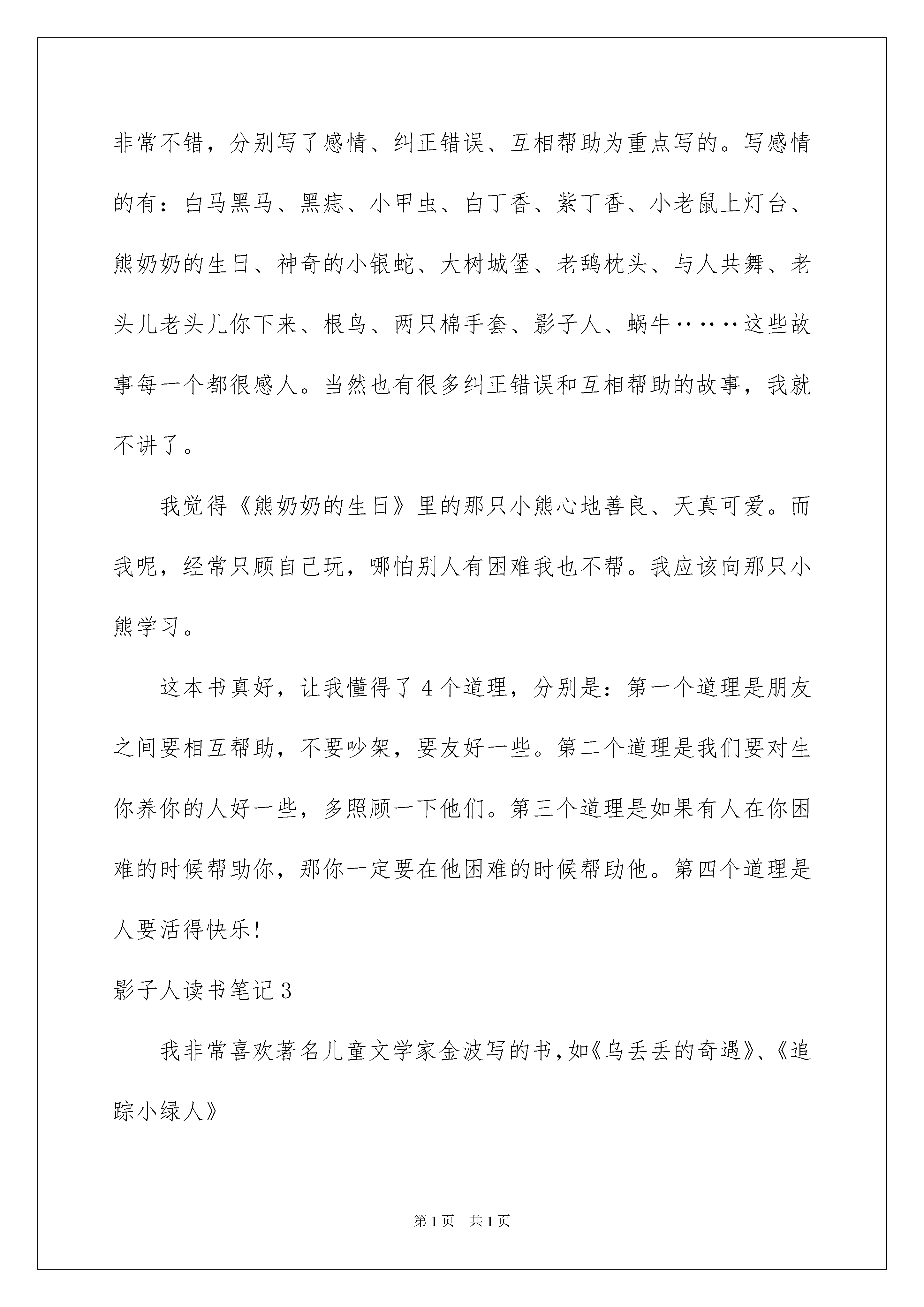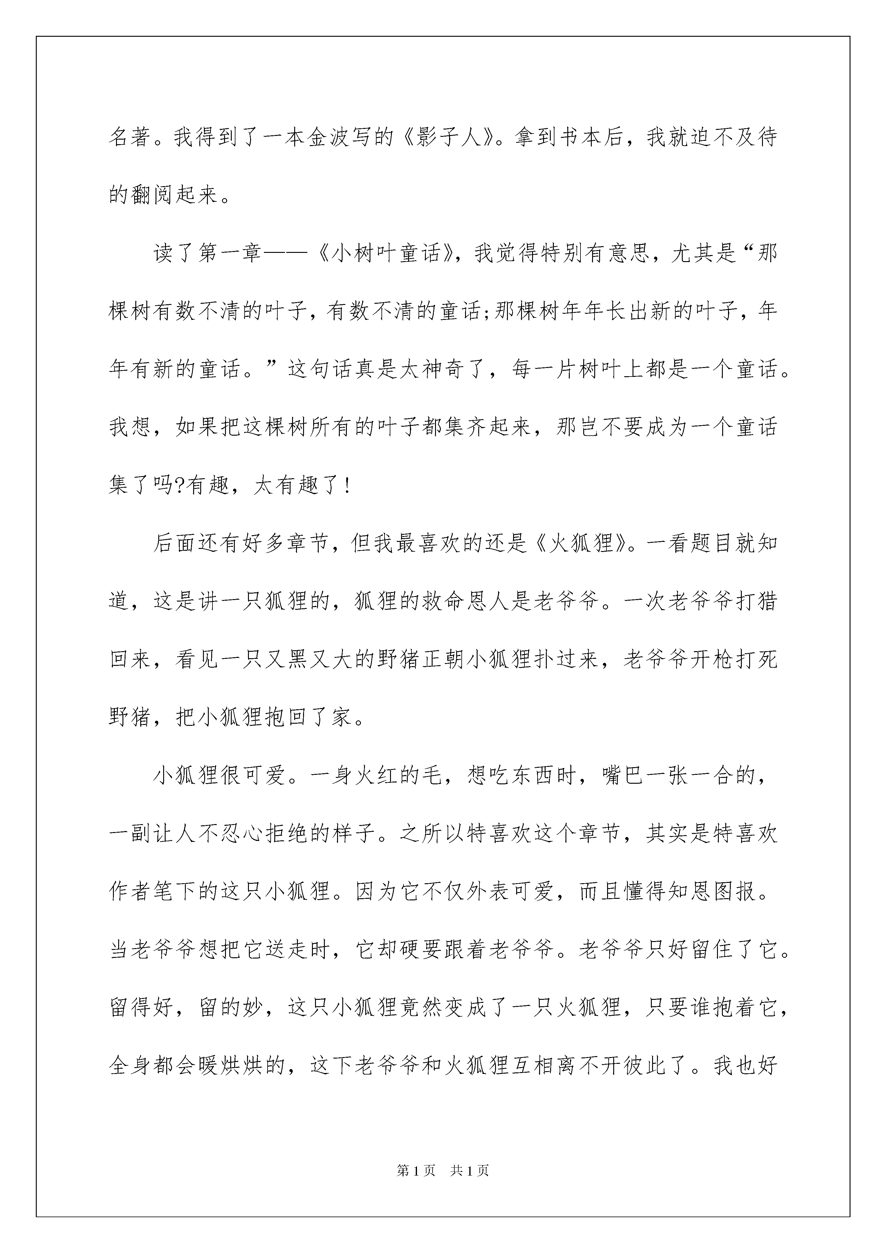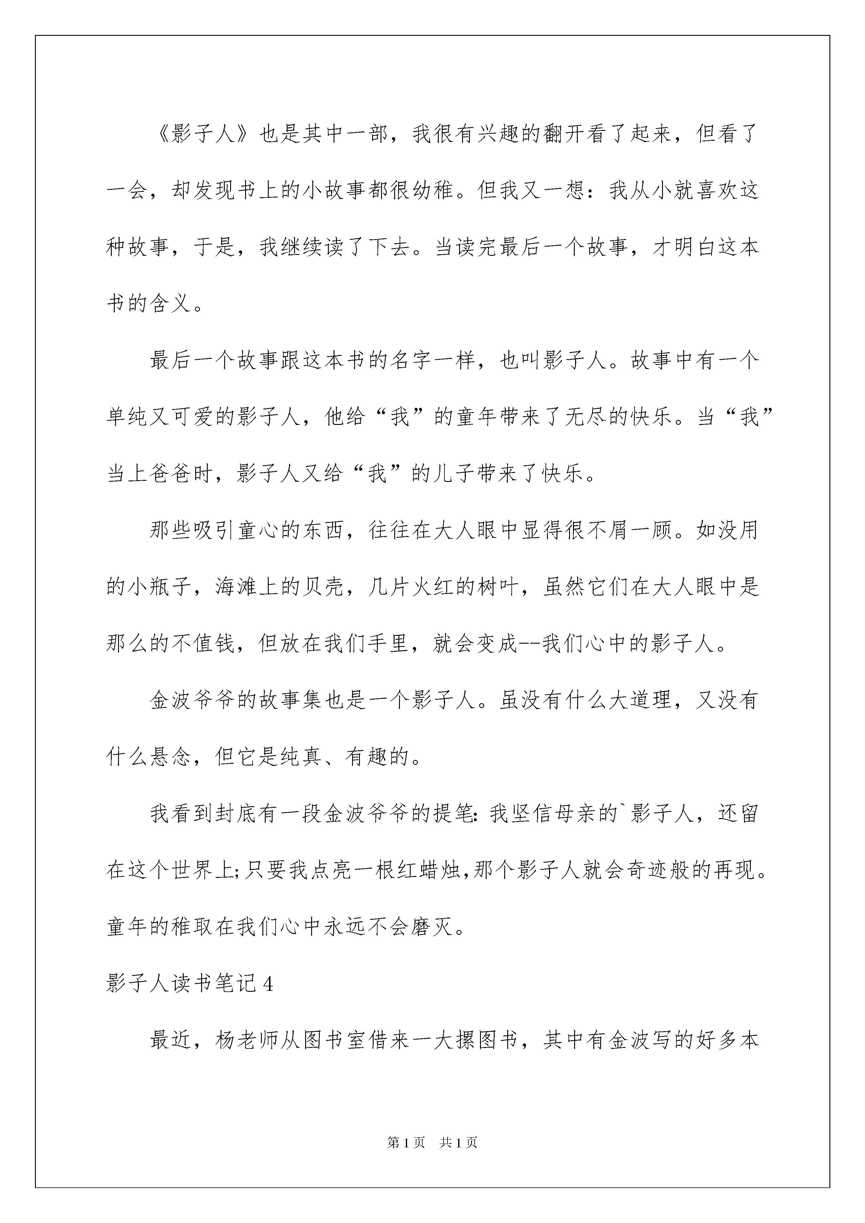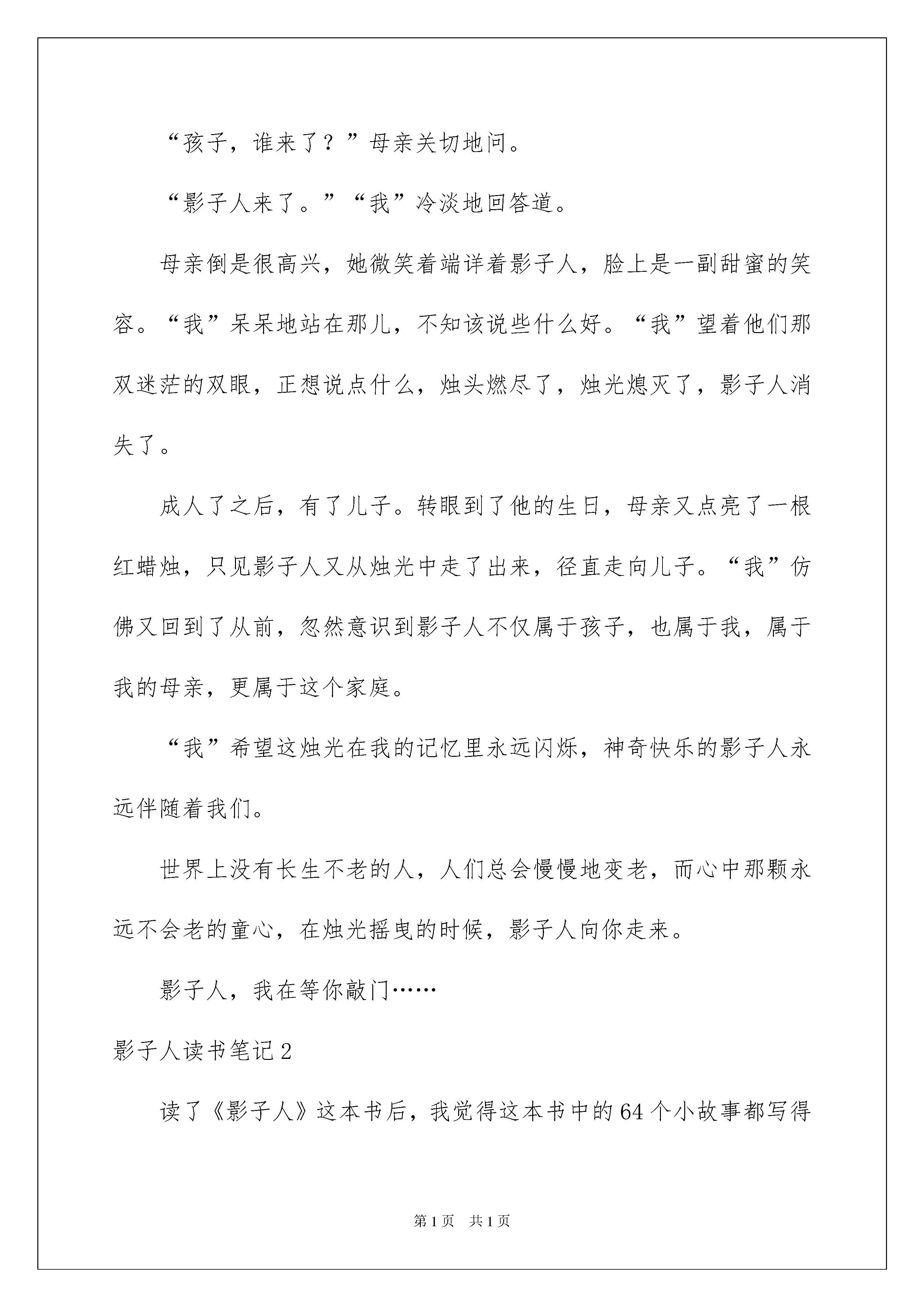 2022影子人读书笔记影子人读书笔记认真品味一部名著后,大家心中一定是萌生了不少心得,何不静下心来写写读书笔记呢?那要怎么写好读书笔记呢?以下是我为大家整理的影子人读书笔记,供大家参考借鉴,希望可以帮助到有需要的朋友。影子人读书笔记1读着《影子人》,幻想着点亮一根红蜡烛,影子人便从烛光里走出来:头戴毡帽,身背柴禾,还有那首古老的童谣:“笑话笑,笑话笑,笑话戴着破毡帽”。这首看似简单的小诗,却给文中的“我”留下了不可抹来的记忆。“我”长大了,渐渐淡忘了影子人和那根神奇的红蜡烛。直到“我”上初中时,又遇到了它。停电了,“我”又点燃了那根红蜡烛,影子人又从烛光中走了出来,它还是老样子:头戴毡帽,身背柴禾。“你长大了。”它说。“我已经上中学了”,“我”平淡地说。“孩子,谁来了?”母亲关切地问。“影子人来了。”“我”冷淡地回答道。母亲倒是很高兴,她微笑着端详着影子人,脸上是一副甜蜜的笑容。“我”呆呆地站在那儿,不知该说些什么好。“我”望着他们那双迷茫的双眼,正想说点什么,烛头燃尽了,烛光熄灭了,影子人消失了。成人了之后,有了儿子。转眼到了他的生日,母亲又点亮了一根红蜡烛,只见影子人又从烛光中走了出来,径直走向儿子。“我”仿佛又回到了从前,忽然意识到影子人不仅属于孩子,也属于我,属于我的母亲,更属于这个家庭。“我”希望这烛光在我的记忆里永远闪烁,神奇快乐的影子人永远伴随着我们。世界上没有长生不老的人,人们总会慢慢地变老,而心中那颗永远不会老的童心,在烛光摇曳的时候,影子人向你走来。影子人,我在等你敲门……影子人读书笔记2读了《影子人》这本书后,我觉得这本书中的64个小故事都写得非常不错,分别写了感情、纠正错误、互相帮助为重点写的。写感情的有:白马黑马、黑痣、小甲虫、白丁香、紫丁香、小老鼠上灯台、熊奶奶的生日、神奇的小银蛇、大树城堡、老鸹枕头、与人共舞、老头儿老头儿你下来、根鸟、两只棉手套、影子人、蜗牛‥‥‥这些故事每一个都很感人。当然也有很多纠正错误和互相帮助的故事,我就不讲了。我觉得《熊奶奶的生日》里的那只小熊心地善良、天真可爱。而我呢,经常只顾自己玩,哪怕别人有困难我也不帮。我应该向那只小熊学习。这本书真好,让我懂得了4个道理,分别是:第一个道理是朋友之间要相互帮助,不要吵架,要友好一些。第二个道理是我们要对生你养你的人好一些,多照顾一下他们。第三个道理是如果有人在你困难的时候帮助你,那你一定要在他困难的时候帮助他。第四个道理是人要活得快乐!影子人读书笔记3我非常喜欢著名儿童文学家金波写的书,如《乌丢丢的奇遇》、《追踪小绿人》《影子人》也是其中一部,我很有兴趣的翻开看了起来,但看了一会,却发现书上的小故事都很幼稚。但我又一想:我从小就喜欢这种故事,于是,我继续读了下去。当读完最后一个故事,才明白这本书的含义。最后一个故事跟这本书的名字一样,也叫影子人。故事中有一个单纯又可爱的影子人,他给“我”的童年带来了无尽的快乐。当“我”当上爸爸时,影子人又给“我”的儿子带来了快乐。那些吸引童心的东西,往往在大人眼中显得很不屑一顾。如没用的小瓶子,海滩上的贝壳,几片火红的树叶,虽然它们在大人眼中是那么的不值钱,但放在我们手里,就会变成--我们心中的影子人。金波爷爷的故事集也是一个影子人。虽没有什么大道理,又没有什么悬念,但它是纯真、有趣的。我看到封底有一段金波爷爷的提笔:我坚信母亲的`影子人,还留在这个世界上;只要我点亮一根红蜡烛,那个影子人就会奇迹般的再现。童年的稚取在我们心中永远不会磨灭。影子人读书笔记4最近,杨老师从图书室借来一大摞图书,其中有金波写的好多本名著。我得到了一本金波写的《影子人》。拿到书本后,我就迫不及待的翻阅起来。读了第一章——《小树叶童话》,我觉得特别有意思,尤其是“那棵树有数不清的叶子,有数不清的童话;那棵树年年长出新的叶子,年年有新的童话。”这句话真是太神奇了,每一片树叶上都是一个童话。我想,如果把这棵树所有的叶子都集齐起来,那岂不要成为一个童话集了吗?有趣,太有趣了!后面还有好多章节,但我最喜欢的还是《火狐狸》。一看题目就知道,这是讲一只狐狸的,狐狸的救命恩人是老爷爷。一次老爷爷打猎回来,看见一只又黑又大的野猪正朝小狐狸扑过来,老爷爷开枪打死野猪,把小狐狸抱回了家。小狐狸很可爱。一身火红的毛,想吃东西时,嘴巴一张一合的,一副让人不忍心拒绝的样子。之所以特喜欢这个章节,其实是特喜欢作者笔下的这只小狐狸。因为它不仅外表可爱,而且懂得知恩图报。当老爷爷想把它送走时,它却硬要跟着老爷爷。老爷爷只好留住了它。留得好,留的妙,这只小狐狸竟然变成了一只火狐狸,只要谁抱着它,全身