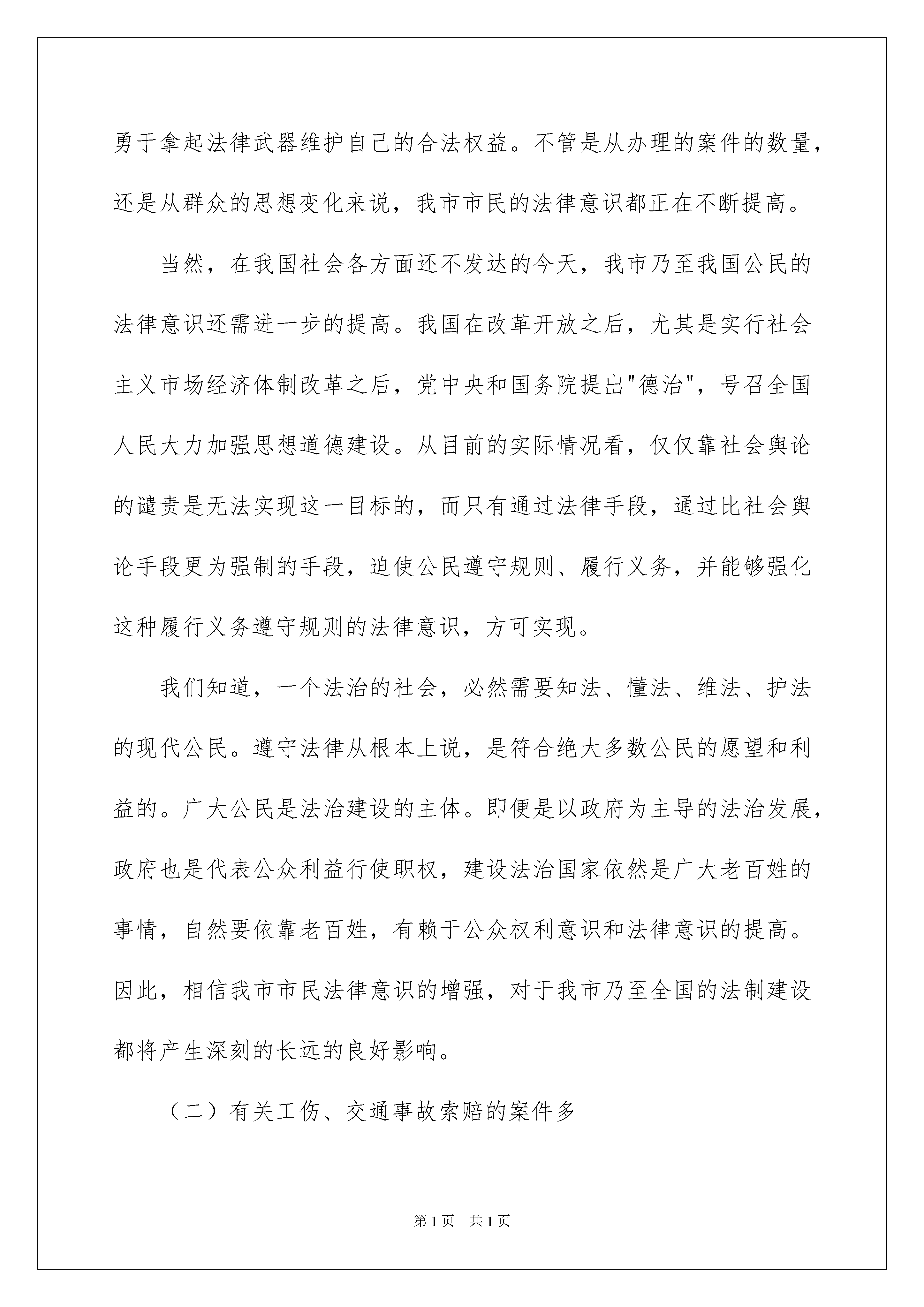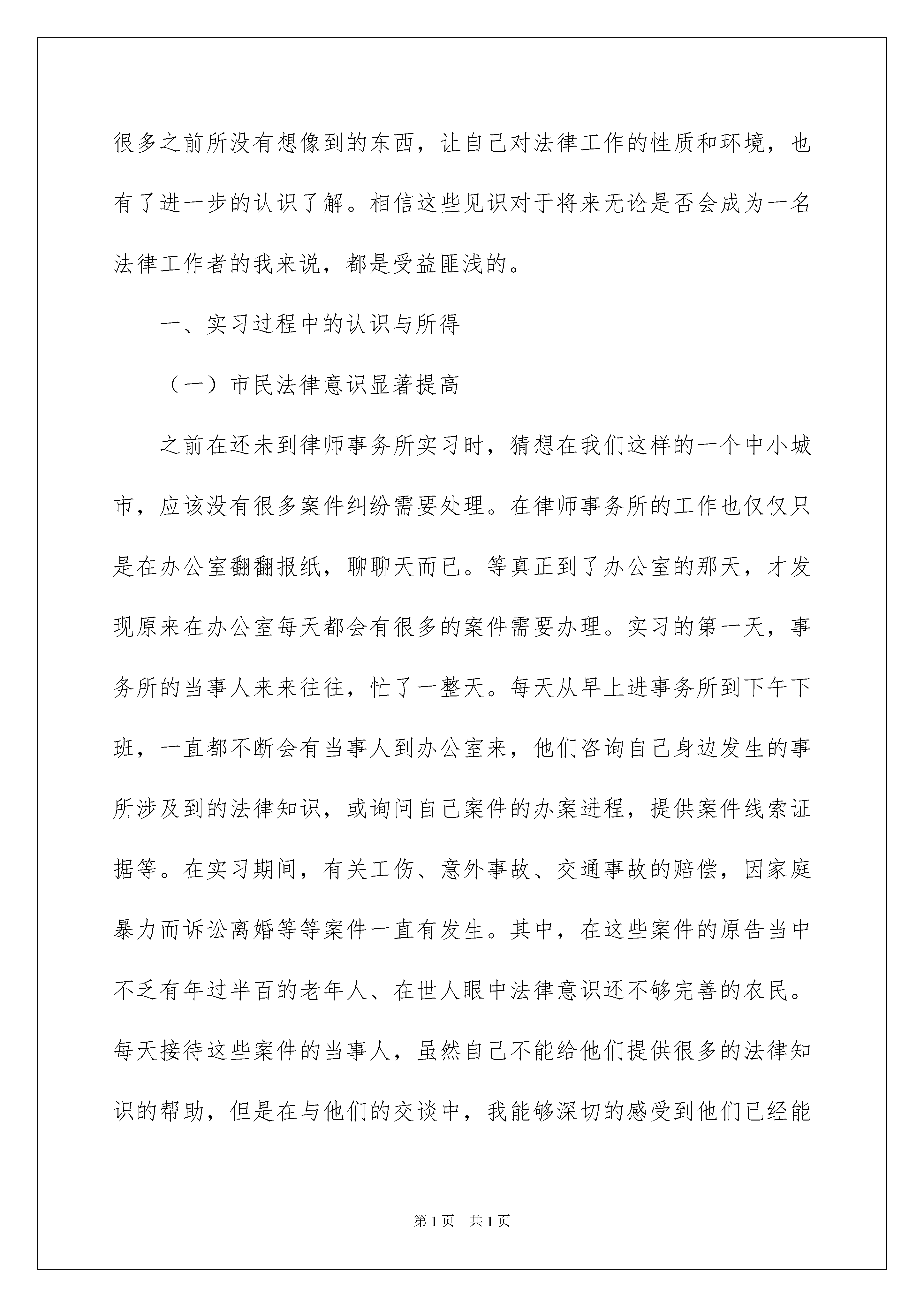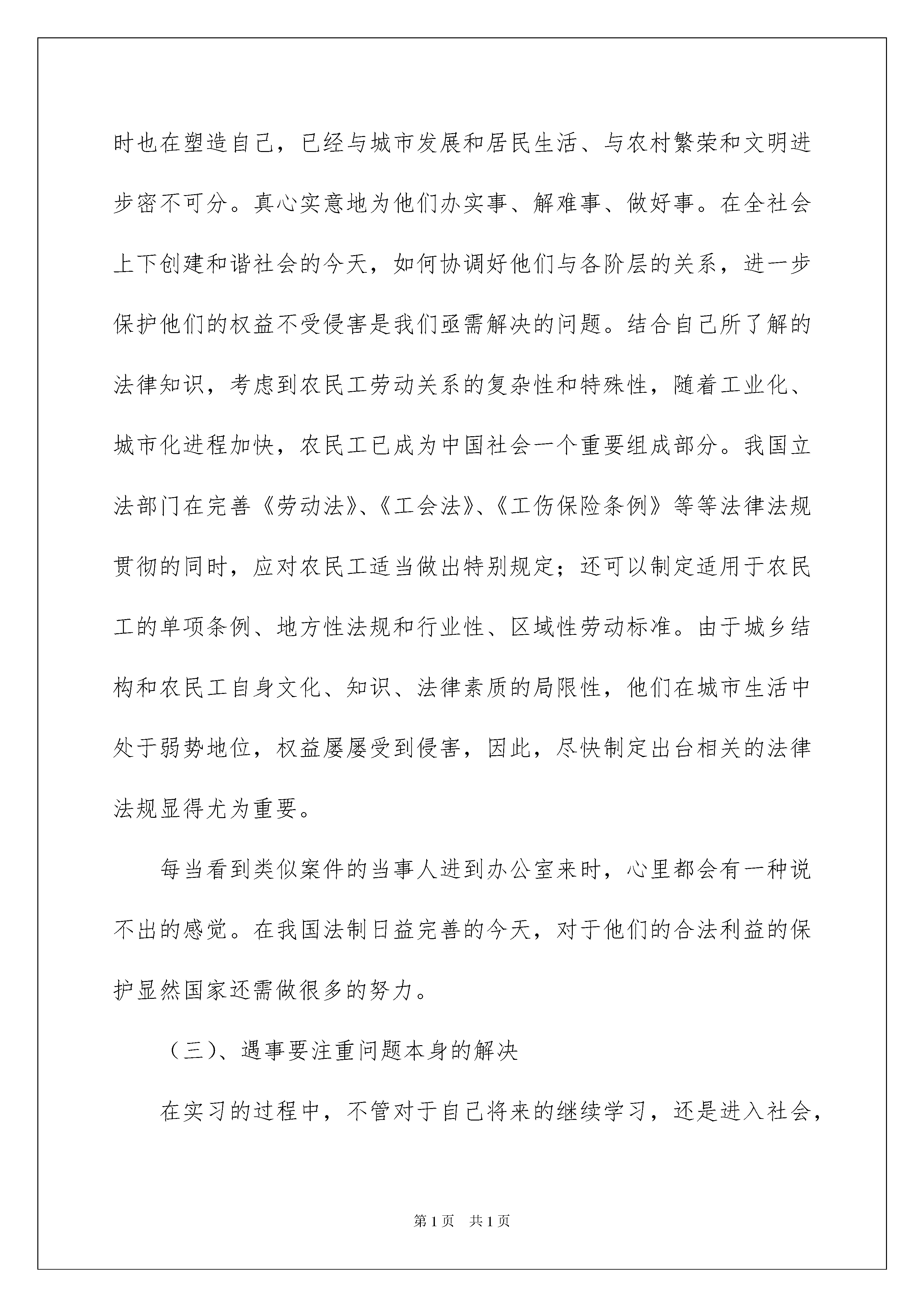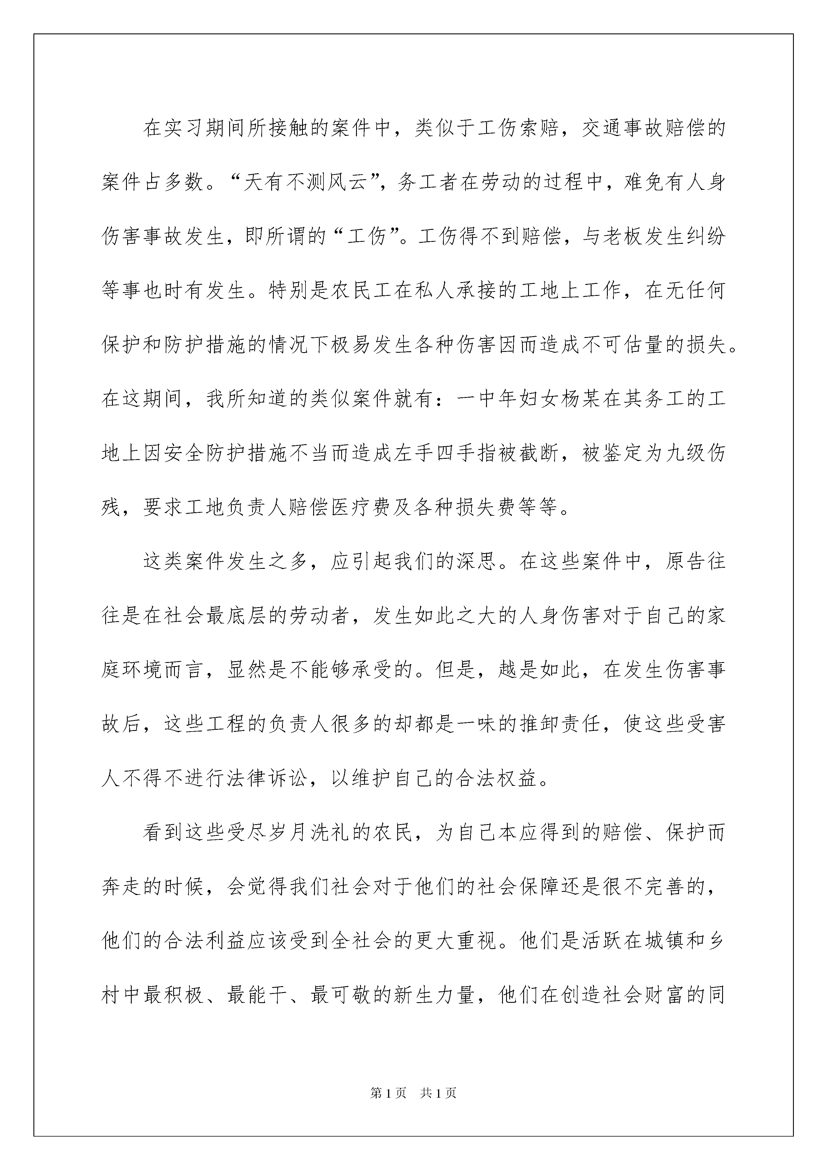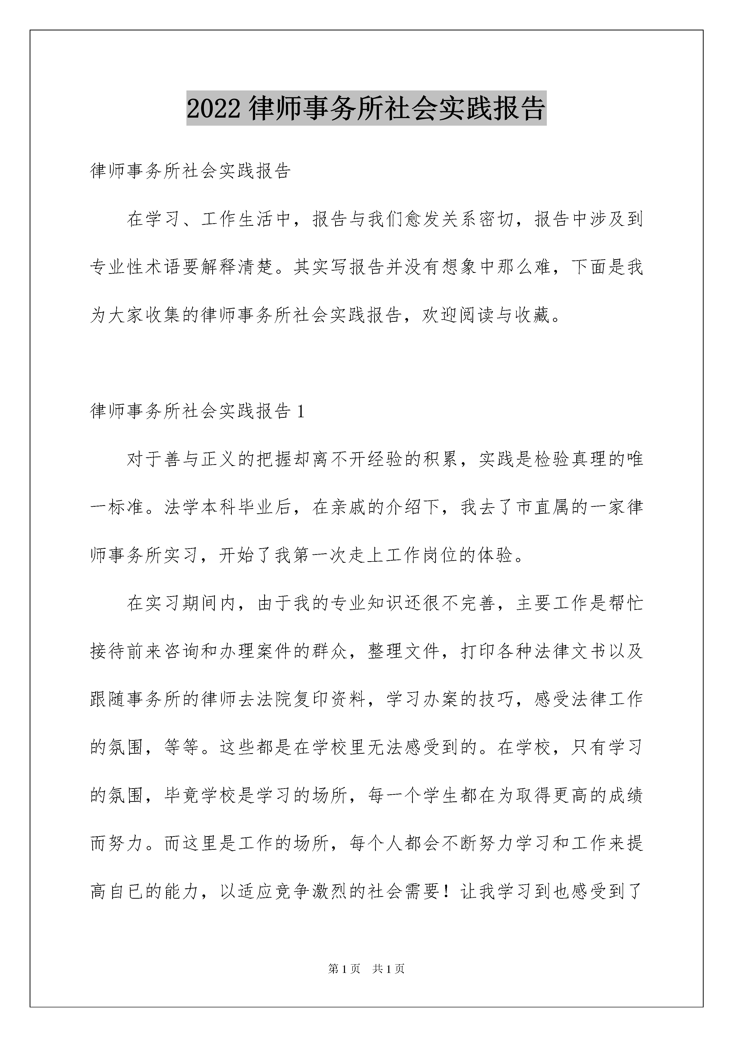 2022律师事务所社会实践报告律师事务所社会实践报告在学习、工作生活中,报告与我们愈发关系密切,报告中涉及到专业性术语要解释清楚。其实写报告并没有想象中那么难,下面是我为大家收集的律师事务所社会实践报告,欢迎阅读与收藏。律师事务所社会实践报告1对于善与正义的把握却离不开经验的积累,实践是检验真理的唯一标准。法学本科毕业后,在亲戚的介绍下,我去了市直属的一家律师事务所实习,开始了我第一次走上工作岗位的体验。在实习期间内,由于我的专业知识还很不完善,主要工作是帮忙接待前来咨询和办理案件的群众,整理文件,打印各种法律文书以及跟随事务所的律师去法院复印资料,学习办案的技巧,感受法律工作的氛围,等等。这些都是在学校里无法感受到的。在学校,只有学习的氛围,毕竟学校是学习的场所,每一个学生都在为取得更高的成绩而努力。而这里是工作的场所,每个人都会不断努力学习和工作来提高自已的能力,以适应竞争激烈的社会需要!让我学习到也感受到了很多之前所没有想像到的东西,让自己对法律工作的性质和环境,也有了进一步的认识了解。相信这些见识对于将来无论是否会成为一名法律工作者的我来说,都是受益匪浅的。一、实习过程中的认识与所得(一)市民法律意识显著提高之前在还未到律师事务所实习时,猜想在我们这样的一个中小城市,应该没有很多案件纠纷需要处理。在律师事务所的工作也仅仅只是在办公室翻翻报纸,聊聊天而已。等真正到了办公室的那天,才发现原来在办公室每天都会有很多的案件需要办理。实习的第一天,事务所的当事人来来往往,忙了一整天。每天从早上进事务所到下午下班,一直都不断会有当事人到办公室来,他们咨询自己身边发生的事所涉及到的法律知识,或询问自己案件的办案进程,提供案件线索证据等。在实习期间,有关工伤、意外事故、交通事故的赔偿,因家庭暴力而诉讼离婚等等案件一直有发生。其中,在这些案件的原告当中不乏有年过半百的老年人、在世人眼中法律意识还不够完善的农民。每天接待这些案件的当事人,虽然自己不能给他们提供很多的法律知识的帮助,但是在与他们的交谈中,我能够深切的感受到他们已经能勇于拿起法律武器维护自己的合法权益。不管是从办理的案件的数量,还是从群众的思想变化来说,我市市民的法律意识都正在不断提高。当然,在我国社会各方面还不发达的今天,我市乃至我国公民的法律意识还需进一步的提高。我国在改革开放之后,尤其是实行社会主义市场经济体制改革之后,党中央和国务院提出"德治",号召全国人民大力加强思想道德建设。从目前的实际情况看,仅仅靠社会舆论的谴责是无法实现这一目标的,而只有通过法律手段,通过比社会舆论手段更为强制的手段,迫使公民遵守规则、履行义务,并能够强化这种履行义务遵守规则的法律意识,方可实现。我们知道,一个法治的社会,必然需要知法、懂法、维法、护法的现代公民。遵守法律从根本上说,是符合绝大多数公民的愿望和利益的。广大公民是法治建设的主体。即便是以政府为主导的法治发展,政府也是代表公众利益行使职权,建设法治国家依然是广大老百姓的事情,自然要依靠老百姓,有赖于公众权利意识和法律意识的提高。因此,相信我市市民法律意识的增强,对于我市乃至全国的法制建设都将产生深刻的长远的良好影响。(二)有关工伤、交通事故索赔的案件多在实习期间所接触的案件中,类似于工伤索赔,交通事故赔偿的案件占多数。“天有不测风云”,务工者在劳动的过程中,难免有人身伤害事故发生,即所谓的“工伤”。工伤得不到赔偿,与老板发生纠纷等事也时有发生。特别是农民工在私人承接的工地上工作,在无任何保护和防护措施的情况下极易发生各种伤害因而造成不可估量的损失。在这期间,我所知道的类似案件就有:一中年妇女杨某在其务工的工地上因安全防护措施不当而造成左手四手指被截断,被鉴定为九级伤残,要求工地负责人赔偿医疗费及各种损失费等等。这类案件发生之多,应引起我们的深思。在这些案件中,原告往往是在社会最底层的劳动者,发生如此之大的人身伤害对于自己的家庭环境而言,显然是不能够承受的。但是,越是如此,在发生伤害事故后,这些工程的负责人很多的却都是一味的推卸责任,使这些受害人不得不进行法律诉讼,以维护自己的合法权益。看到这些受尽岁月洗礼的农民,为自己本应得到的赔偿、保护而奔走的时候,会觉得我们社会对于他们的社会保障还是很不完善的,他们的合法利益应该受到全社会的更大重视。他们是活跃在城镇和乡村中最积极、最能干、最可敬的新生力量,他们在创造社会财富的同时也在塑造自己,已经与城市发展和居民生活、与农村繁荣和文明进步密不可分。真心实意地为他们办实事、解难事、做好事。在全社会上下创建和谐社会的今天,如何协调好他们与各阶
