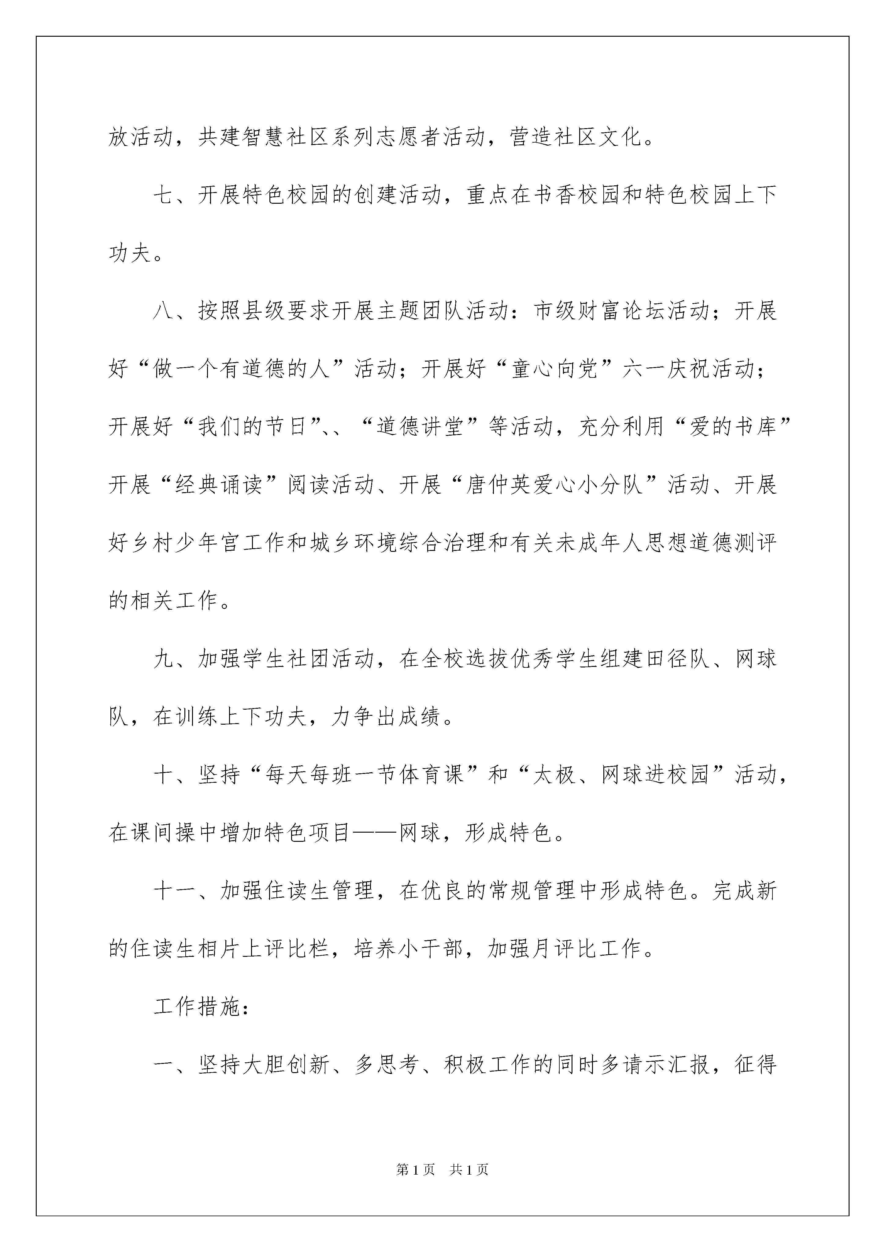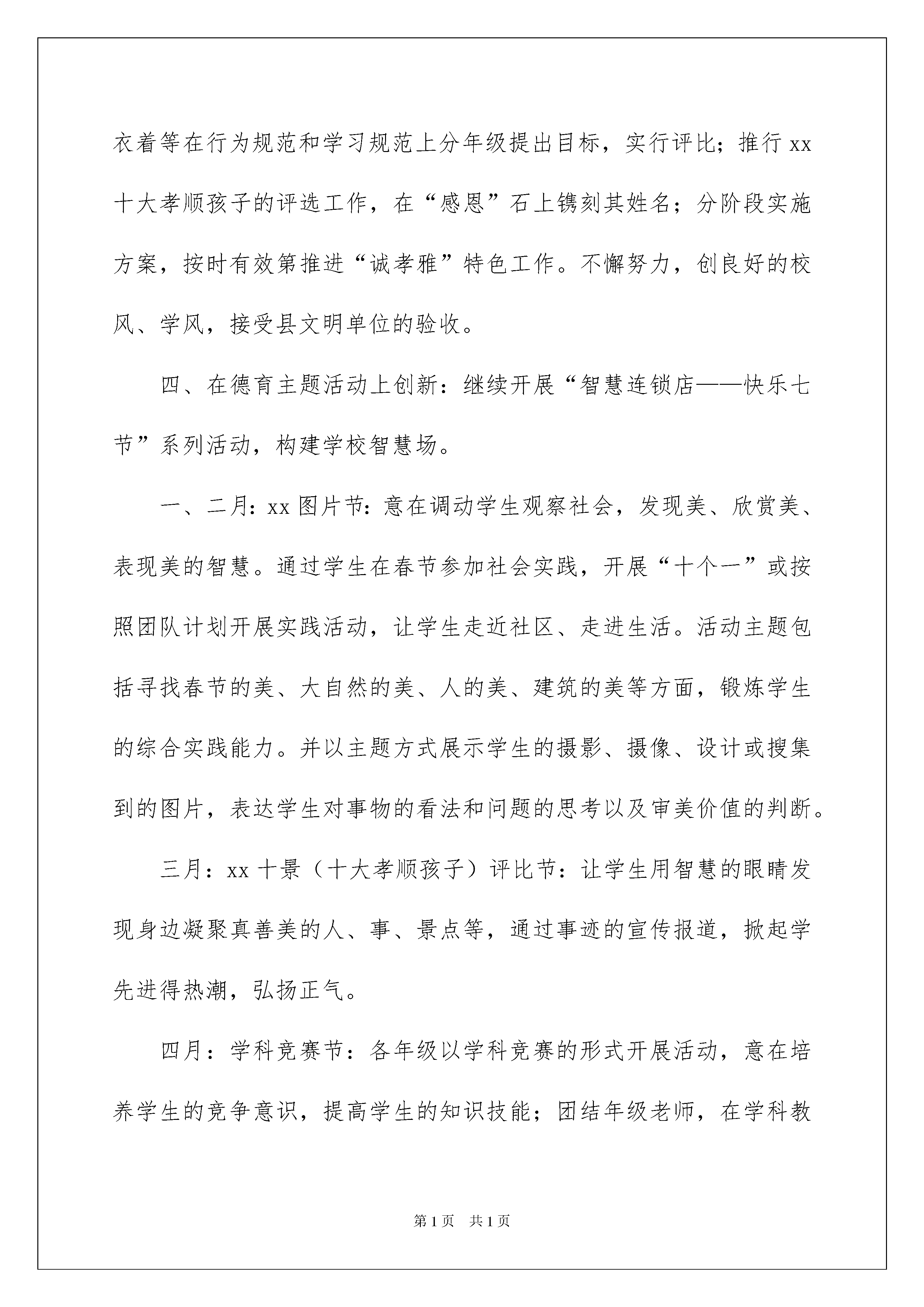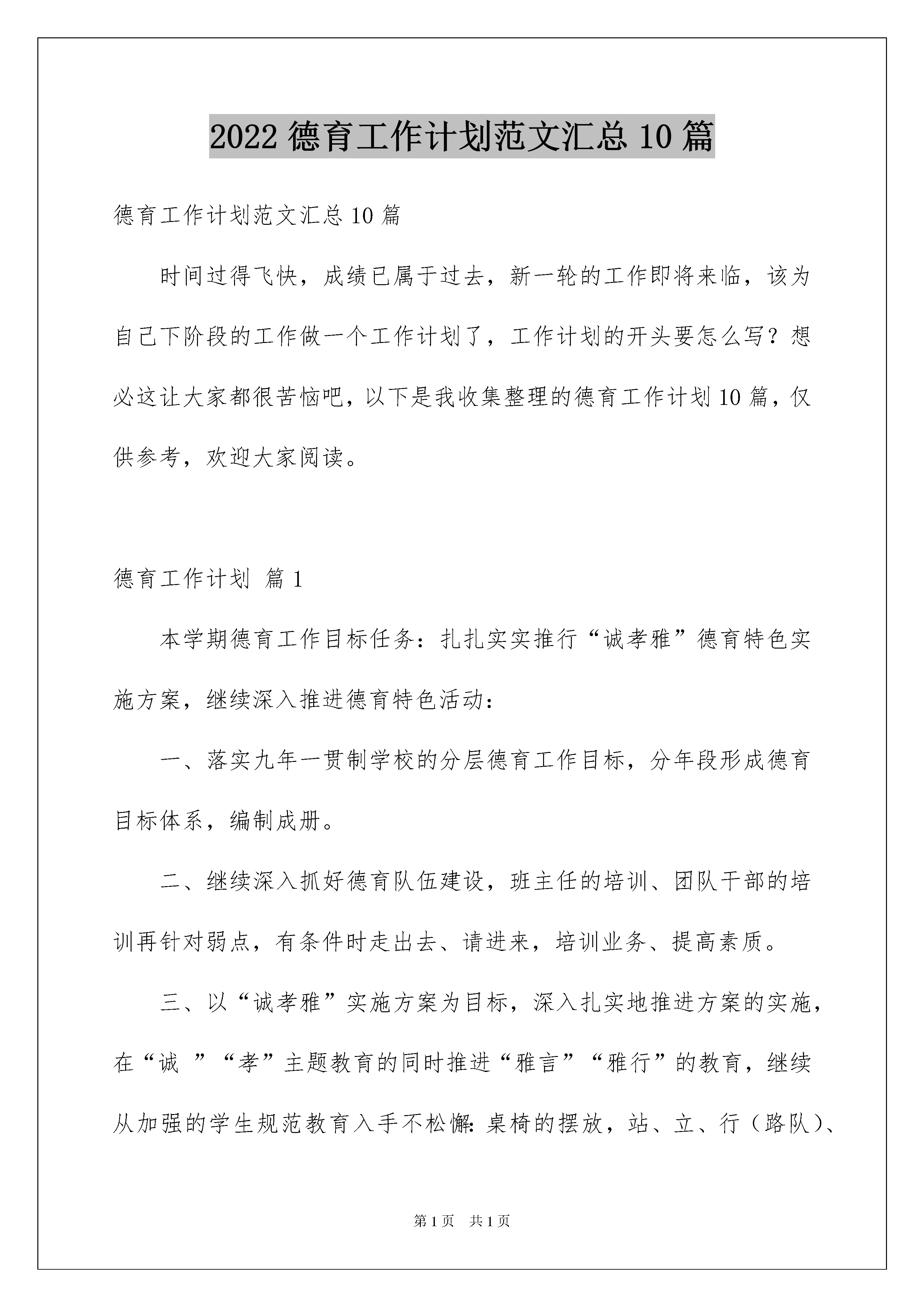 2022德育工作计划范文汇总10篇德育工作计划范文汇总10篇时间过得飞快,成绩已属于过去,新一轮的工作即将来临,该为自己下阶段的工作做一个工作计划了,工作计划的开头要怎么写?想必这让大家都很苦恼吧,以下是我收集整理的德育工作计划10篇,仅供参考,欢迎大家阅读。德育工作计划篇1本学期德育工作目标任务:扎扎实实推行“诚孝雅”德育特色实施方案,继续深入推进德育特色活动:一、落实九年一贯制学校的分层德育工作目标,分年段形成德育目标体系,编制成册。二、继续深入抓好德育队伍建设,班主任的培训、团队干部的培训再针对弱点,有条件时走出去、请进来,培训业务、提高素质。三、以“诚孝雅”实施方案为目标,深入扎实地推进方案的实施,在“诚”“孝”主题教育的同时推进“雅言”“雅行”的教育,继续从加强的学生规范教育入手不松懈:桌椅的摆放,站、立、行(路队)、衣着等在行为规范和学习规范上分年级提出目标,实行评比;推行xx十大孝顺孩子的评选工作,在“感恩”石上镌刻其姓名;分阶段实施方案,按时有效第推进“诚孝雅”特色工作。不懈努力,创良好的校风、学风,接受县文明单位的验收。四、在德育主题活动上创新:继续开展“智慧连锁店——快乐七节”系列活动,构建学校智慧场。一、二月:xx图片节:意在调动学生观察社会,发现美、欣赏美、表现美的智慧。通过学生在春节参加社会实践,开展“十个一”或按照团队计划开展实践活动,让学生走近社区、走进生活。活动主题包括寻找春节的美、大自然的美、人的美、建筑的美等方面,锻炼学生的综合实践能力。并以主题方式展示学生的摄影、摄像、设计或搜集到的图片,表达学生对事物的看法和问题的思考以及审美价值的判断。三月:xx十景(十大孝顺孩子)评比节:让学生用智慧的眼睛发现身边凝聚真善美的人、事、景点等,通过事迹的宣传报道,掀起学先进得热潮,弘扬正气。四月:学科竞赛节:各年级以学科竞赛的形式开展活动,意在培养学生的竞争意识,提高学生的知识技能;团结年级老师,在学科教学中共同发展、共同进步。五月:辩论节:在5—9年级中开展辩论赛,通过不同主题的辩论,帮助学生提高认识,身心健康成长。六月:艺术节:展示学生的艺术成果,让学生享受创作的快乐,使热爱生活、求真尚美、团结合作、智慧创新成为xx学生精神世界的主流。七月、八月:实践节九月:智慧品读节:开展“走进经典,与先贤对话”等系列品读活动,让师生在阅读中增智、明理、导行,成就一生的智慧美德。活动内容包括:建立班级书架、家庭书架、学校书苑;根据学生认知能力的差异,各年级确定阅读主题和经典书目;开设经典阅读赏析课;开展经典阅读展示活动,如好书发布会、诵经典、写心得、演经典等十月:学科竞赛节十一月:体育节:开展体育游戏设计、“我最喜爱的体育明星”、田径比赛、棋类比赛等活动,培养学生坚韧的意志品格、健康的身体素质和智慧的团队合作精十二月:辩论节:推行“六有”实施策略:有自主——充分发挥年级和班级的主观能动性和创造性,由他们根据学生的实际自主制定实施计划;有重点——学校每学期重点推出一个活动;有主题——每个节的活动都根据学生的发展情况或中国的传统文化节日确定明确的主题;有互动——每个节的活动分别体现学生与学生、学生与老师、学校与家长的互动;有发展——在每个节的活动中,实现学生学科知识有所增长,安全意识有所提高,综合能力有所增强;能力有所提高有评比——每个节根据学生参与活动的情况评星,期末根据学生一学期的整体表现评选“智慧星”。通过“智慧连锁店——快乐六节”系列活动,让学生在五彩缤纷的活动中,用行动去体验生命的快乐,积累生命成长的智慧。五、深化和推广朝会课的研究成果,将“小课程大智慧”的科研成果作为德育特色开展,规范和上好、上活朝会课,德育部和科研组联合形成朝会课的特色教材。特别是1—6年级,充分发挥学生的主体,融合多种德育教育的内容、以多种形式开展朝会课,发展、提高学生的综合能力。本学期特别在朝会课上开展好“百姓故事会”活动。六、继续开展“走进社区、智慧成长”活动和学校资源向社区开放活动,共建智慧社区系列志愿者活动,营造社区文化。七、开展特色校园的创建活动,重点在书香校园和特色校园上下功夫。八、按照县级要求开展主题团队活动:市级财富论坛活动;开展好“做一个有道德的人”活动;开展好“童心向党”六一庆祝活动;开展好“我们的节日”、、“道德讲堂”等活动,充分利用“爱的书库”开展“经典诵读”阅读活动、开展“唐仲英爱心小分队”活动、开展好乡村少年宫工作和城乡环境综合治理和有关未成年人思想道德测评的相关工作。九、加强学生社团活动,在全校选拔优秀学生组建田径队、网球队,在训练上下功夫,力争出成