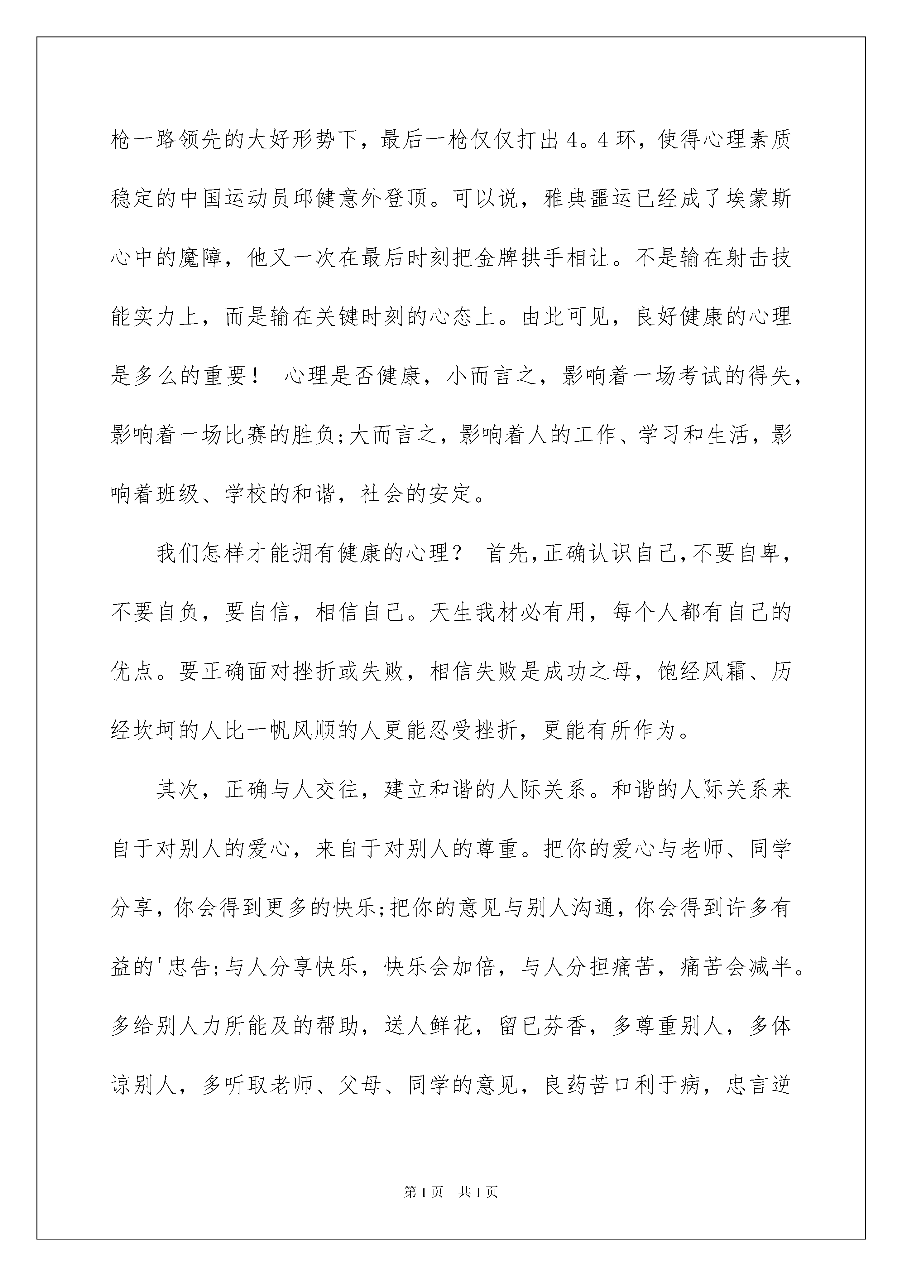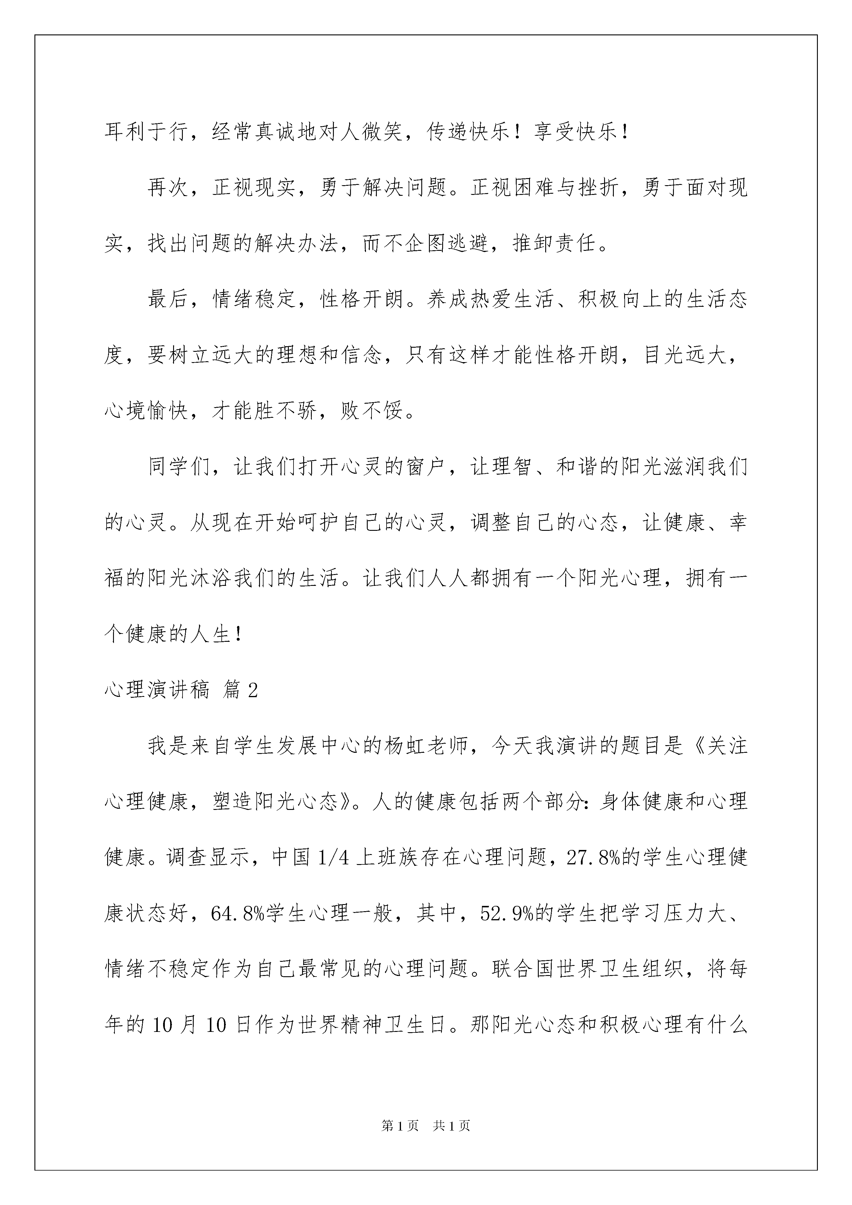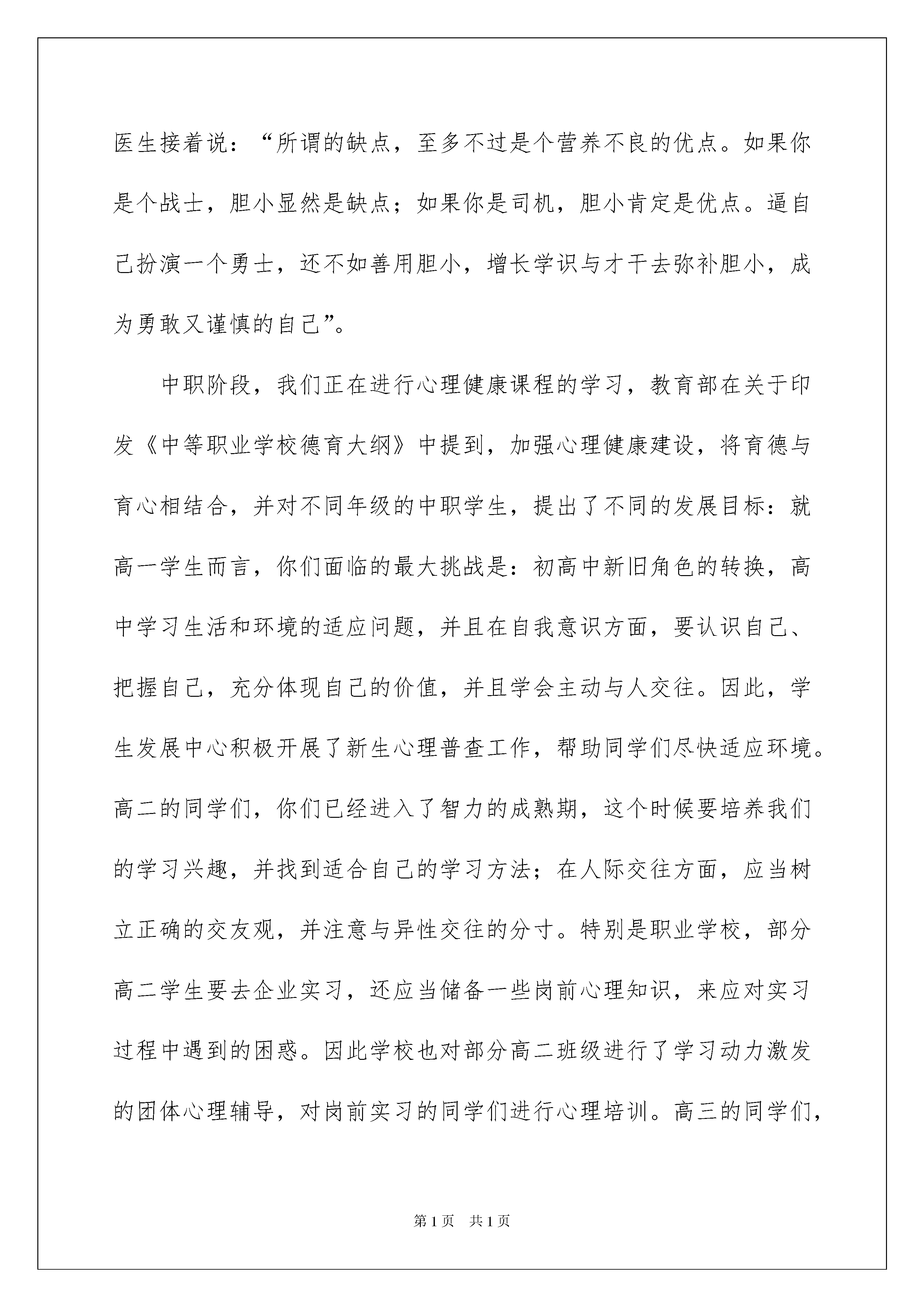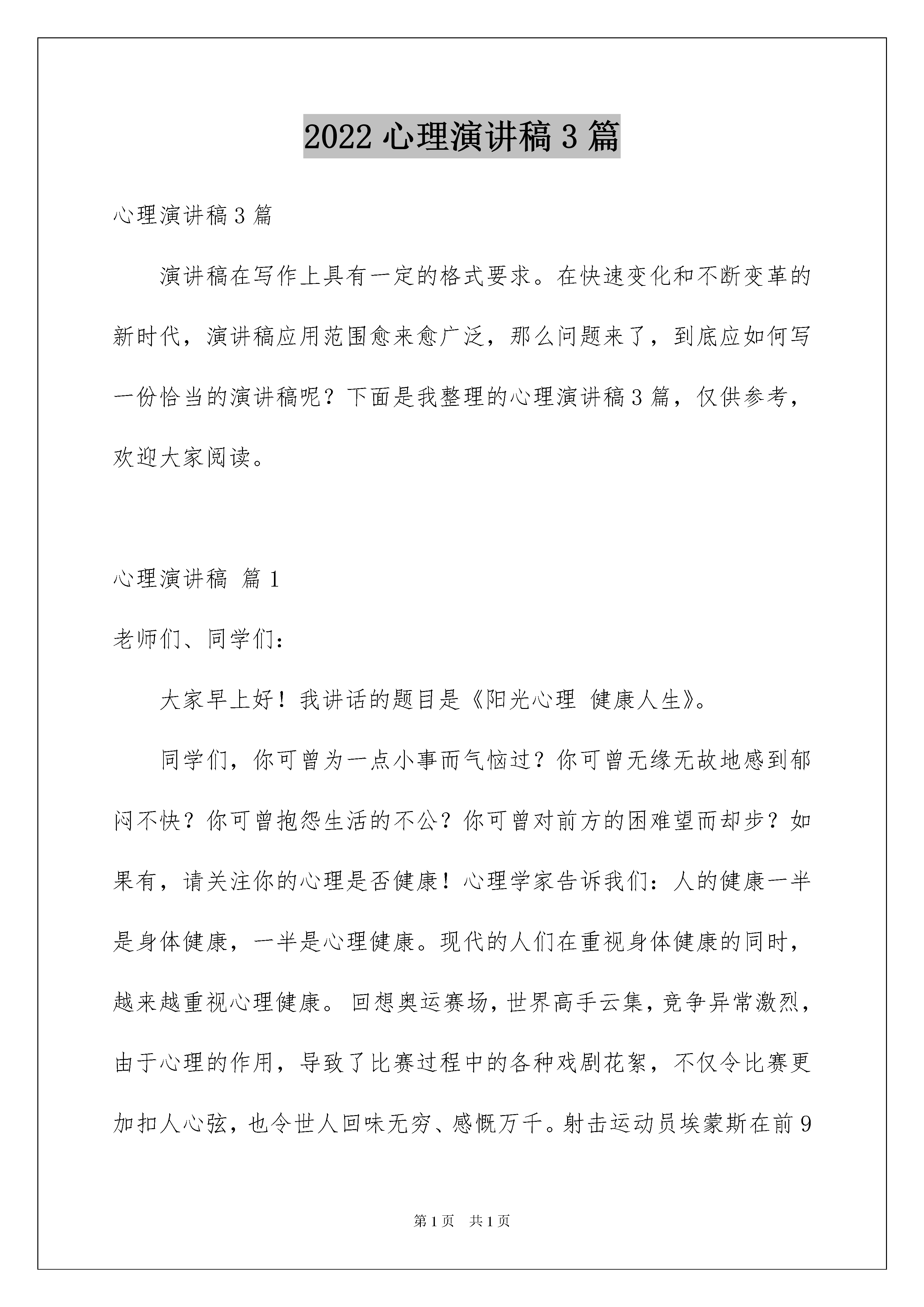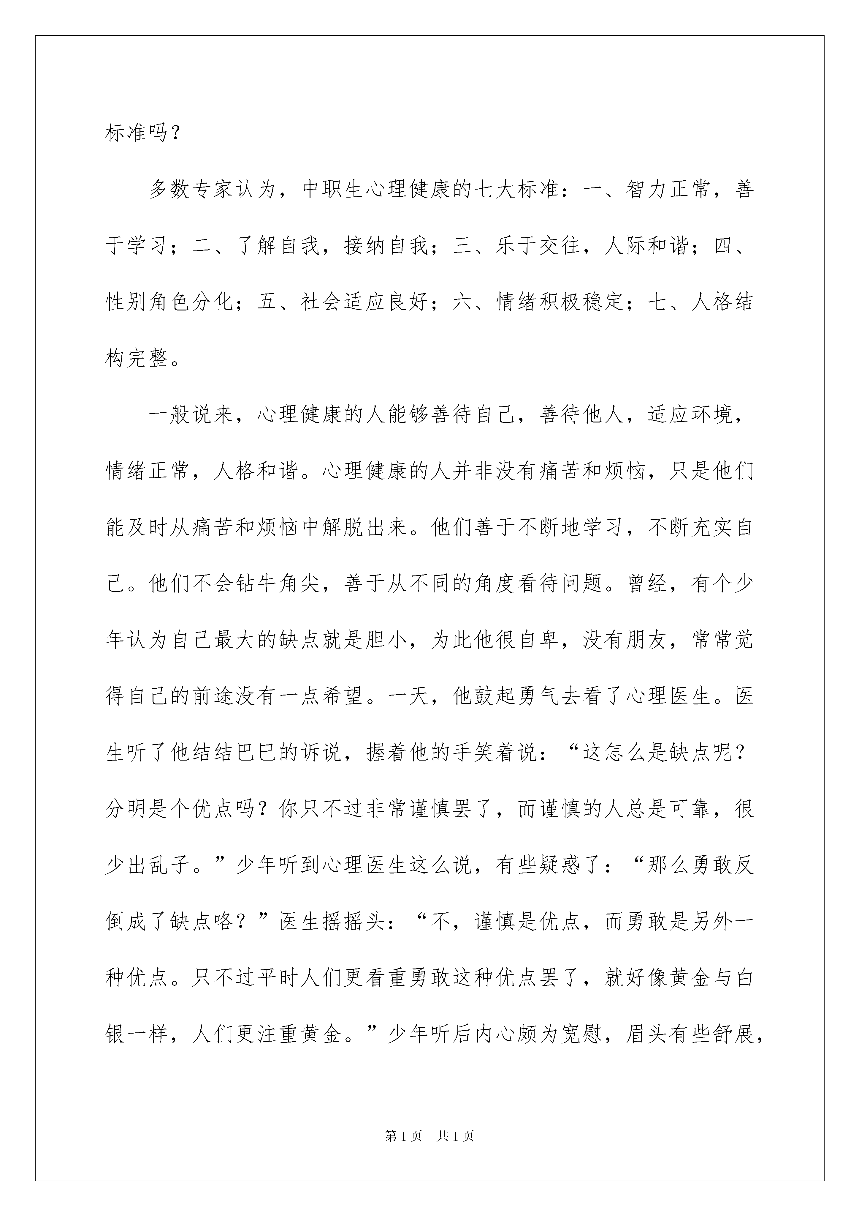 2022心理演讲稿3篇心理演讲稿3篇演讲稿在写作上具有一定的格式要求。在快速变化和不断变革的新时代,演讲稿应用范围愈来愈广泛,那么问题来了,到底应如何写一份恰当的演讲稿呢?下面是我整理的心理演讲稿3篇,仅供参考,欢迎大家阅读。心理演讲稿篇1老师们、同学们:大家早上好!我讲话的题目是《阳光心理健康人生》。同学们,你可曾为一点小事而气恼过?你可曾无缘无故地感到郁闷不快?你可曾抱怨生活的不公?你可曾对前方的困难望而却步?如果有,请关注你的心理是否健康!心理学家告诉我们:人的健康一半是身体健康,一半是心理健康。现代的人们在重视身体健康的同时,越来越重视心理健康。回想奥运赛场,世界高手云集,竞争异常激烈,由于心理的作用,导致了比赛过程中的各种戏剧花絮,不仅令比赛更加扣人心弦,也令世人回味无穷、感慨万千。射击运动员埃蒙斯在前9枪一路领先的大好形势下,最后一枪仅仅打出4。4环,使得心理素质稳定的中国运动员邱健意外登顶。可以说,雅典噩运已经成了埃蒙斯心中的魔障,他又一次在最后时刻把金牌拱手相让。不是输在射击技能实力上,而是输在关键时刻的心态上。由此可见,良好健康的心理是多么的重要!心理是否健康,小而言之,影响着一场考试的得失,影响着一场比赛的胜负;大而言之,影响着人的工作、学习和生活,影响着班级、学校的和谐,社会的安定。我们怎样才能拥有健康的心理?首先,正确认识自己,不要自卑,不要自负,要自信,相信自己。天生我材必有用,每个人都有自己的优点。要正确面对挫折或失败,相信失败是成功之母,饱经风霜、历经坎坷的人比一帆风顺的人更能忍受挫折,更能有所作为。其次,正确与人交往,建立和谐的人际关系。和谐的人际关系来自于对别人的爱心,来自于对别人的尊重。把你的爱心与老师、同学分享,你会得到更多的快乐;把你的意见与别人沟通,你会得到许多有益的'忠告;与人分享快乐,快乐会加倍,与人分担痛苦,痛苦会减半。多给别人力所能及的帮助,送人鲜花,留已芬香,多尊重别人,多体谅别人,多听取老师、父母、同学的意见,良药苦口利于病,忠言逆耳利于行,经常真诚地对人微笑,传递快乐!享受快乐!再次,正视现实,勇于解决问题。正视困难与挫折,勇于面对现实,找出问题的解决办法,而不企图逃避,推卸责任。最后,情绪稳定,性格开朗。养成热爱生活、积极向上的生活态度,要树立远大的理想和信念,只有这样才能性格开朗,目光远大,心境愉快,才能胜不骄,败不馁。同学们,让我们打开心灵的窗户,让理智、和谐的阳光滋润我们的心灵。从现在开始呵护自己的心灵,调整自己的心态,让健康、幸福的阳光沐浴我们的生活。让我们人人都拥有一个阳光心理,拥有一个健康的人生!心理演讲稿篇2我是来自学生发展中心的杨虹老师,今天我演讲的题目是《关注心理健康,塑造阳光心态》。人的健康包括两个部分:身体健康和心理健康。调查显示,中国1/4上班族存在心理问题,27.8%的学生心理健康状态好,64.8%学生心理一般,其中,52.9%的学生把学习压力大、情绪不稳定作为自己最常见的心理问题。联合国世界卫生组织,将每年的10月10日作为世界精神卫生日。那阳光心态和积极心理有什么标准吗?多数专家认为,中职生心理健康的七大标准:一、智力正常,善于学习;二、了解自我,接纳自我;三、乐于交往,人际和谐;四、性别角色分化;五、社会适应良好;六、情绪积极稳定;七、人格结构完整。一般说来,心理健康的人能够善待自己,善待他人,适应环境,情绪正常,人格和谐。心理健康的人并非没有痛苦和烦恼,只是他们能及时从痛苦和烦恼中解脱出来。他们善于不断地学习,不断充实自己。他们不会钻牛角尖,善于从不同的角度看待问题。曾经,有个少年认为自己最大的缺点就是胆小,为此他很自卑,没有朋友,常常觉得自己的前途没有一点希望。一天,他鼓起勇气去看了心理医生。医生听了他结结巴巴的诉说,握着他的手笑着说:“这怎么是缺点呢?分明是个优点吗?你只不过非常谨慎罢了,而谨慎的人总是可靠,很少出乱子。”少年听到心理医生这么说,有些疑惑了:“那么勇敢反倒成了缺点咯?”医生摇摇头:“不,谨慎是优点,而勇敢是另外一种优点。只不过平时人们更看重勇敢这种优点罢了,就好像黄金与白银一样,人们更注重黄金。”少年听后内心颇为宽慰,眉头有些舒展,医生接着说:“所谓的缺点,至多不过是个营养不良的优点。如果你是个战士,胆小显然是缺点;如果你是司机,胆小肯定是优点。逼自己扮演一个勇士,还不如善用胆小,增长学识与才干去弥补胆小,成为勇敢又谨慎的自己”。中职阶段,我们正在进行心理健康课程的学习,教育部在关于印发《中等职业学校德育大纲》中提到,加强心理健康建设,将育德与育心相结合,并对不