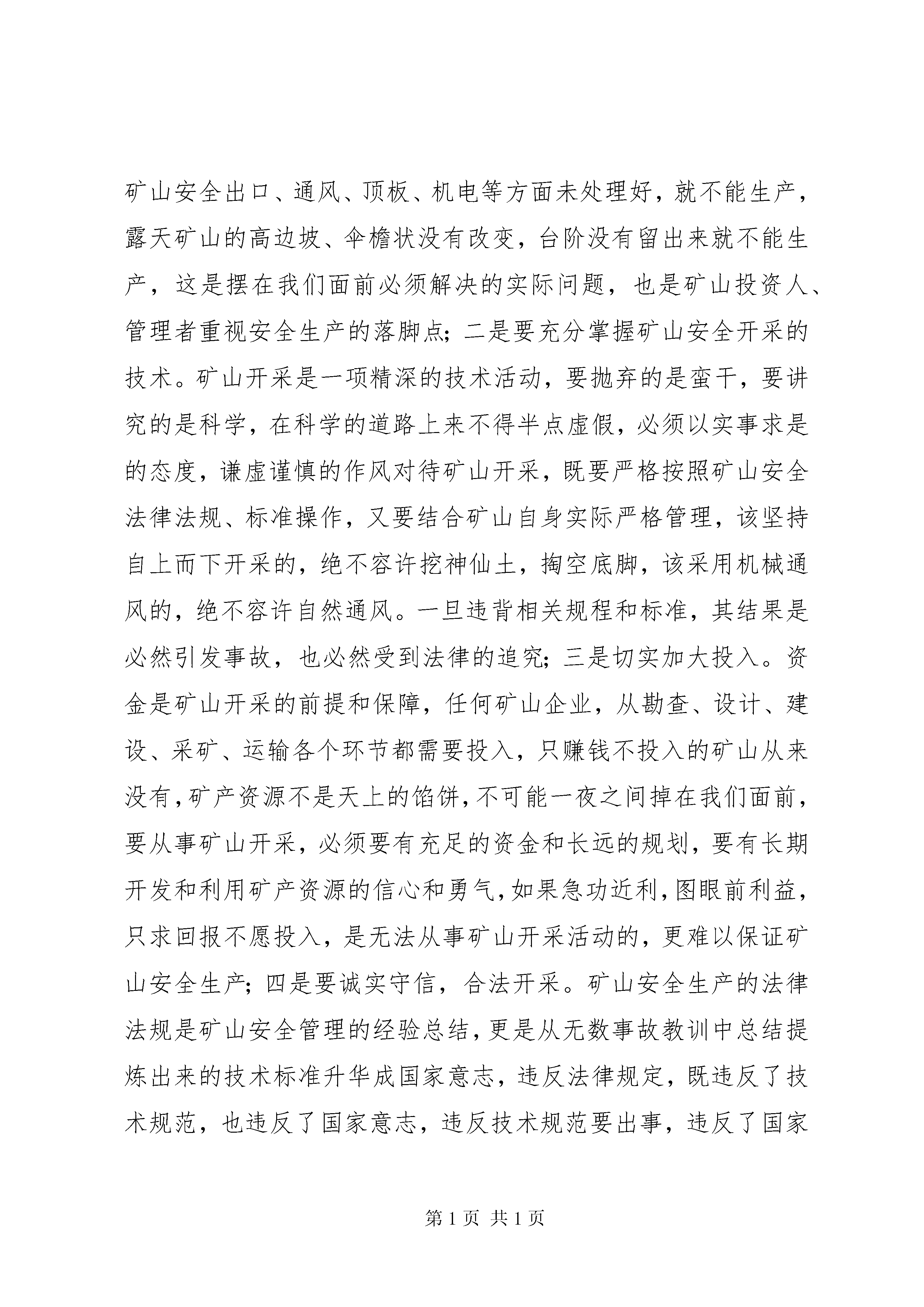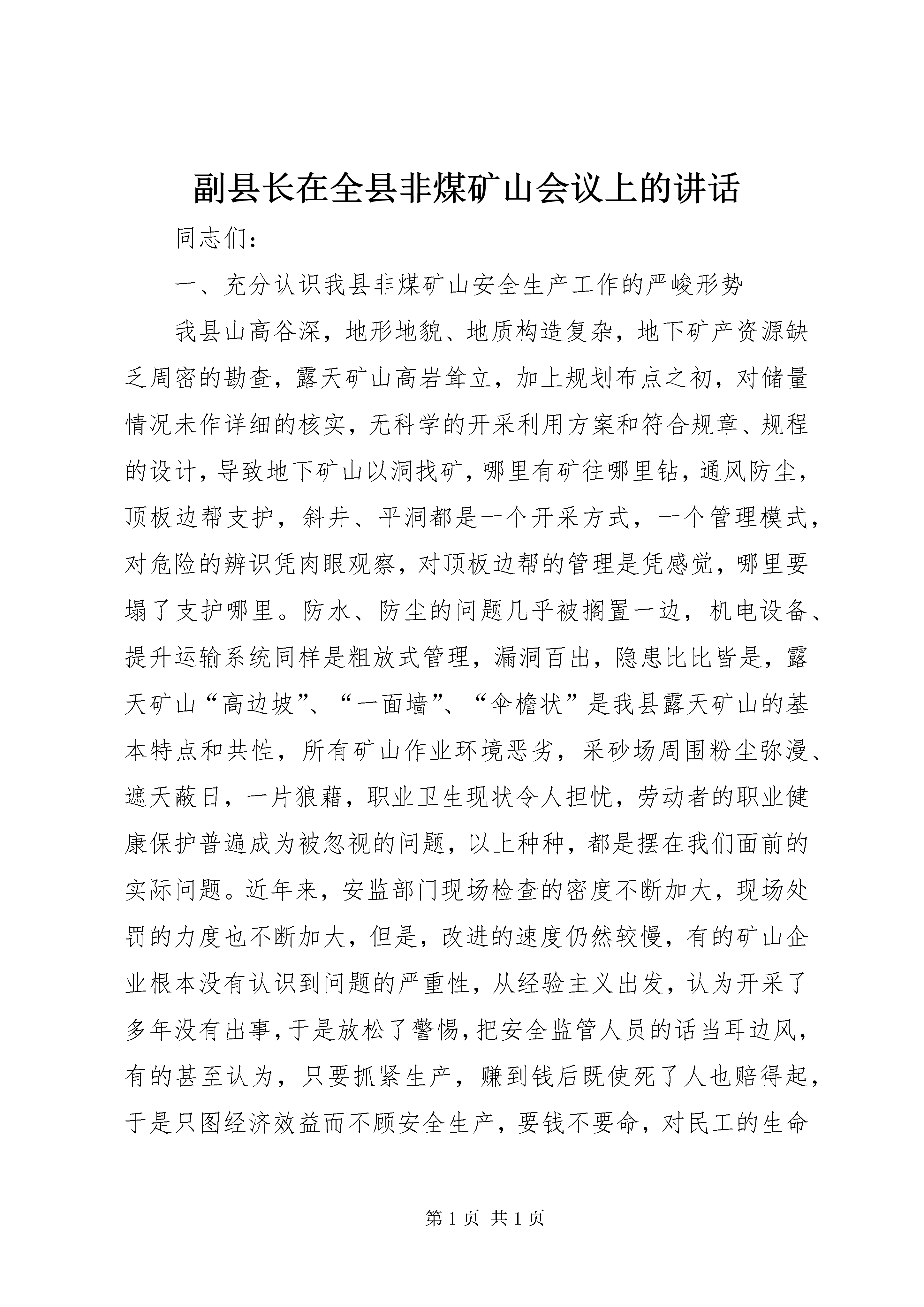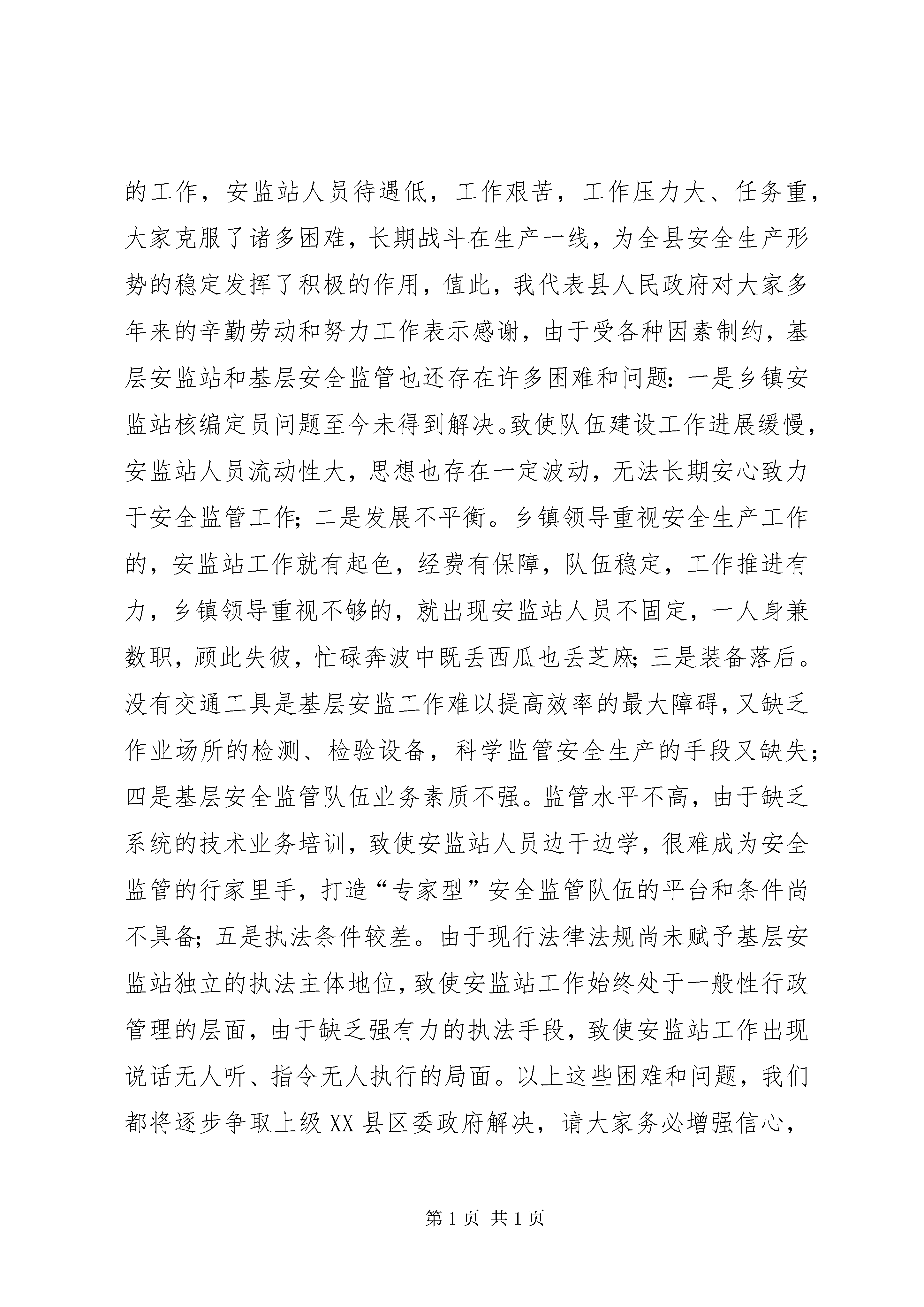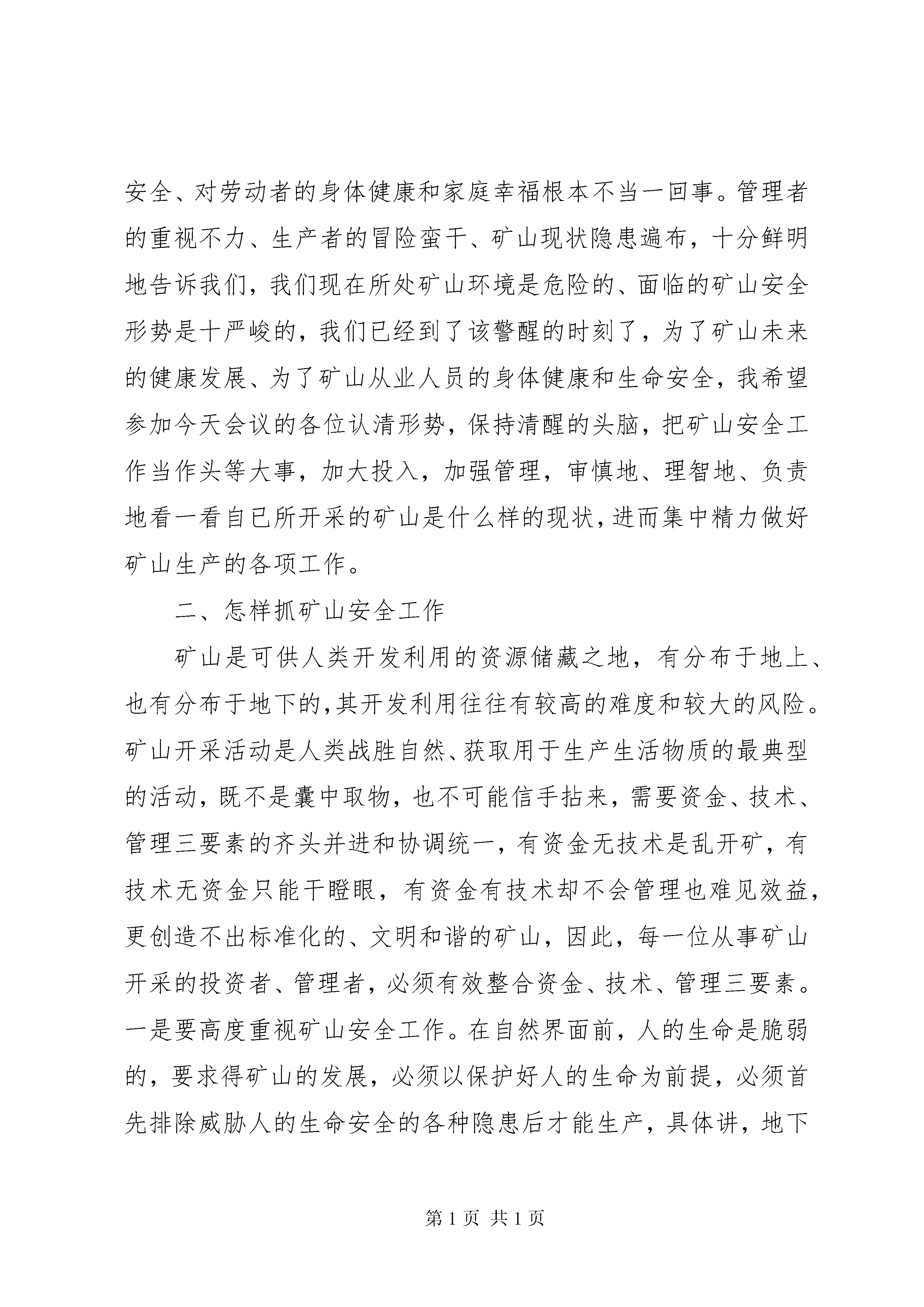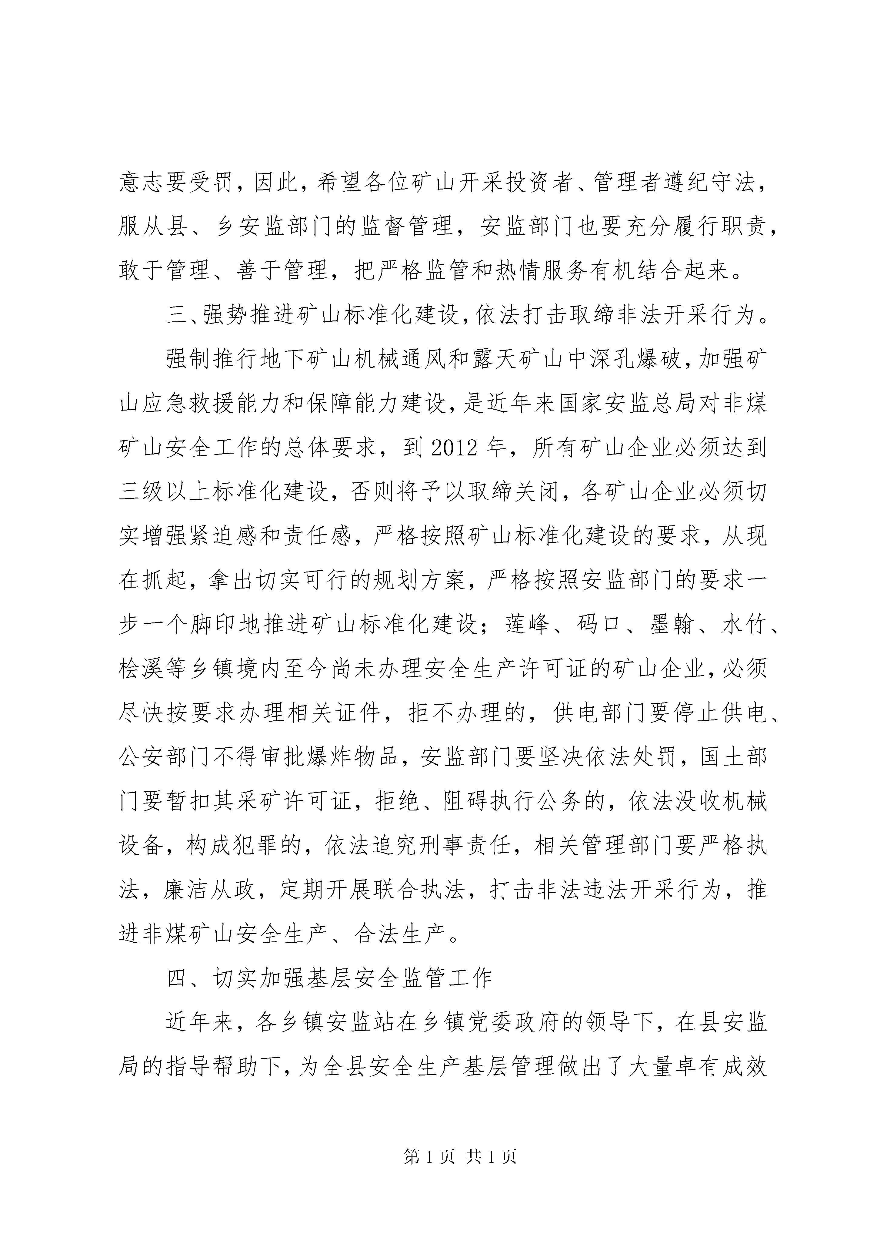 副县长在全县非煤矿山会议上的讲话同志们:一、充分认识我县非煤矿山安全生产工作的严峻形势我县山高谷深,地形地貌、地质构造复杂,地下矿产资源缺乏周密的勘查,露天矿山高岩耸立,加上规划布点之初,对储量情况未作详细的核实,无科学的开采利用方案和符合规章、规程的设计,导致地下矿山以洞找矿,哪里有矿往哪里钻,通风防尘,顶板边帮支护,斜井、平洞都是一个开采方式,一个管理模式,对危险的辨识凭肉眼观察,对顶板边帮的管理是凭感觉,哪里要塌了支护哪里。防水、防尘的问题几乎被搁置一边,机电设备、提升运输系统同样是粗放式管理,漏洞百出,隐患比比皆是,露天矿山“高边坡”、“一面墙”、“伞檐状”是我县露天矿山的基本特点和共性,所有矿山作业环境恶劣,采砂场周围粉尘弥漫、遮天蔽日,一片狼藉,职业卫生现状令人担忧,劳动者的职业健康保护普遍成为被忽视的问题,以上种种,都是摆在我们面前的实际问题。近年来,安监部门现场检查的密度不断加大,现场处罚的力度也不断加大,但是,改进的速度仍然较慢,有的矿山企业根本没有认识到问题的严重性,从经验主义出发,认为开采了多年没有出事,于是放松了警惕,把安全监管人员的话当耳边风,有的甚至认为,只要抓紧生产,赚到钱后既使死了人也赔得起,于是只图经济效益而不顾安全生产,要钱不要命,对民工的生命安全、对劳动者的身体健康和家庭幸福根本不当一回事。管理者的重视不力、生产者的冒险蛮干、矿山现状隐患遍布,十分鲜明地告诉我们,我们现在所处矿山环境是危险的、面临的矿山安全形势是十严峻的,我们已经到了该警醒的时刻了,为了矿山未来的健康发展、为了矿山从业人员的身体健康和生命安全,我希望参加今天会议的各位认清形势,保持清醒的头脑,把矿山安全工作当作头等大事,加大投入,加强管理,审慎地、理智地、负责地看一看自已所开采的矿山是什么样的现状,进而集中精力做好矿山生产的各项工作。二、怎样抓矿山安全工作矿山是可供人类开发利用的资源储藏之地,有分布于地上、也有分布于地下的,其开发利用往往有较高的难度和较大的风险。矿山开采活动是人类战胜自然、获取用于生产生活物质的最典型的活动,既不是囊中取物,也不可能信手拈来,需要资金、技术、管理三要素的齐头并进和协调统一,有资金无技术是乱开矿,有技术无资金只能干瞪眼,有资金有技术却不会管理也难见效益,更创造不出标准化的、文明和谐的矿山,因此,每一位从事矿山开采的投资者、管理者,必须有效整合资金、技术、管理三要素。一是要高度重视矿山安全工作。在自然界面前,人的生命是脆弱的,要求得矿山的发展,必须以保护好人的生命为前提,必须首先排除威胁人的生命安全的各种隐患后才能生产,具体讲,地下矿山安全出口、通风、顶板、机电等方面未处理好,就不能生产,露天矿山的高边坡、伞檐状没有改变,台阶没有留出来就不能生产,这是摆在我们面前必须解决的实际问题,也是矿山投资人、管理者重视安全生产的落脚点;二是要充分掌握矿山安全开采的技术。矿山开采是一项精深的技术活动,要抛弃的是蛮干,要讲究的是科学,在科学的道路上来不得半点虚假,必须以实事求是的态度,谦虚谨慎的作风对待矿山开采,既要严格按照矿山安全法律法规、标准操作,又要结合矿山自身实际严格管理,该坚持自上而下开采的,绝不容许挖神仙土,掏空底脚,该采用机械通风的,绝不容许自然通风。一旦违背相关规程和标准,其结果是必然引发事故,也必然受到法律的追究;三是切实加大投入。资金是矿山开采的前提和保障,任何矿山企业,从勘查、设计、建设、采矿、运输各个环节都需要投入,只赚钱不投入的矿山从来没有,矿产资源不是天上的馅饼,不可能一夜之间掉在我们面前,要从事矿山开采,必须要有充足的资金和长远的规划,要有长期开发和利用矿产资源的信心和勇气,如果急功近利,图眼前利益,只求回报不愿投入,是无法从事矿山开采活动的,更难以保证矿山安全生产;四是要诚实守信,合法开采。矿山安全生产的法律法规是矿山安全管理的经验总结,更是从无数事故教训中总结提炼出来的技术标准升华成国家意志,违反法律规定,既违反了技术规范,也违反了国家意志,违反技术规范要出事,违反了国家意志要受罚,因此,希望各位矿山开采投资者、管理者遵纪守法,服从县、乡安监部门的监督管理,安监部门也要充分履行职责,敢于管理、善于管理,把严格监管和热情服务有机结合起来。三、强势推进矿山标准化建设,依法打击取缔非法开采行为。强制推行地下矿山机械通风和露天矿山中深孔爆破,加强矿山应急救援能力和保障能力建设,是近年来国家安监总局对非煤矿山安全工作的总体要求,到2012年,所有矿山企业必须达到三级以上标准化建设,否则将予以取缔关闭,各矿山企业必须切实增强紧迫感和责任感,严格按照矿山标准化建设的要求,从现在抓起,拿出切实可行的规划方案,严格按照安监部门的要求一步一个脚印地推进矿山标准化建设;