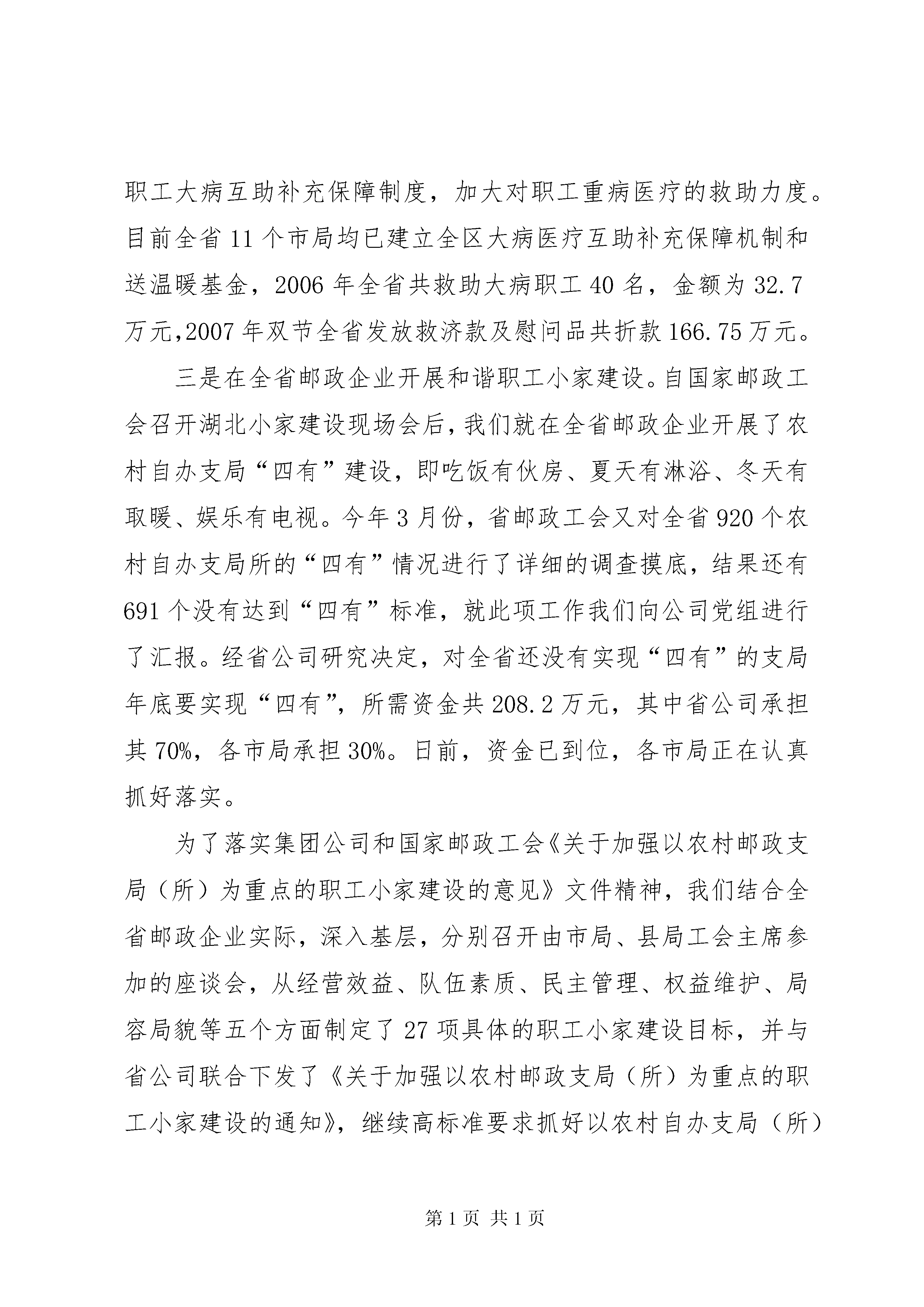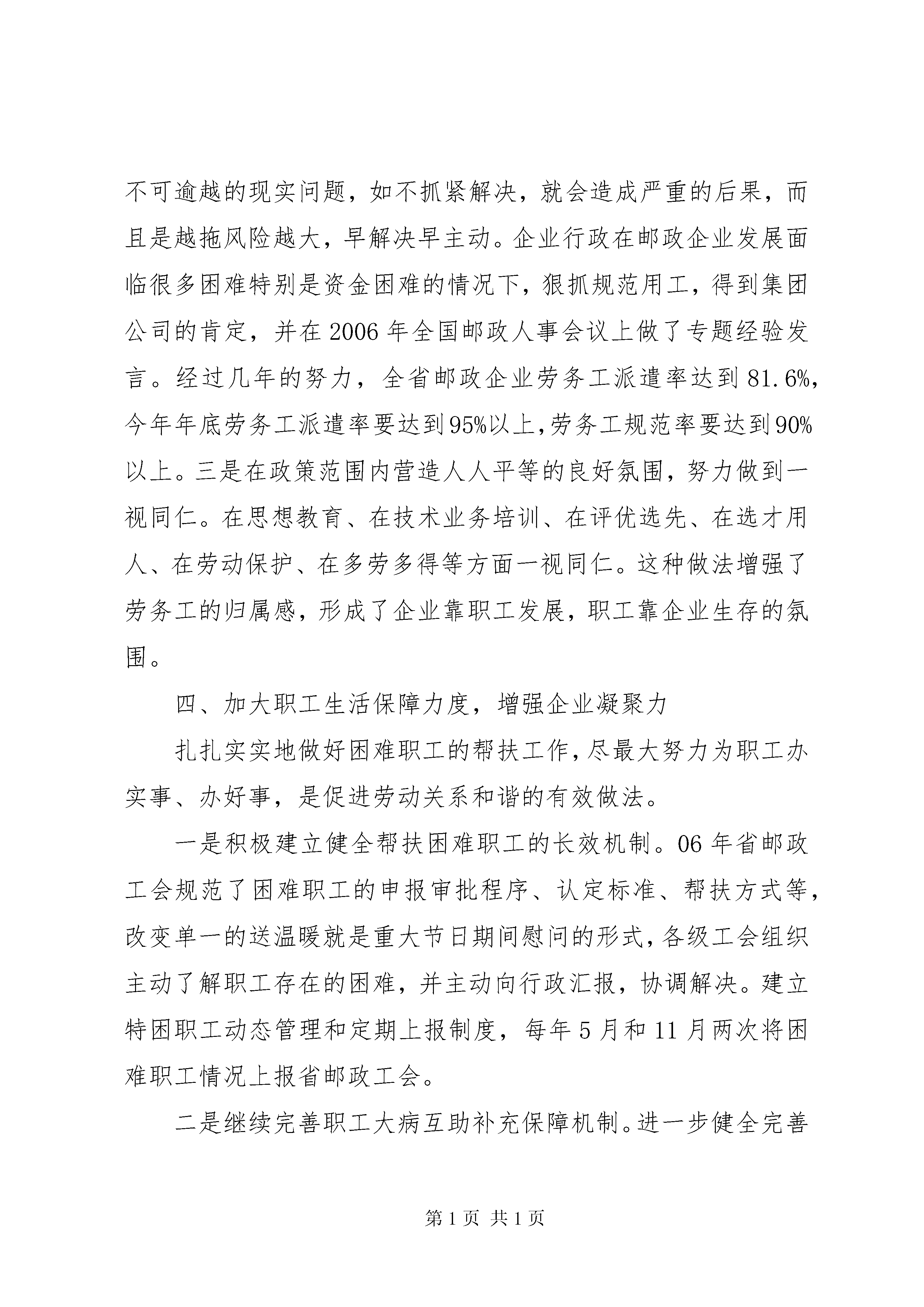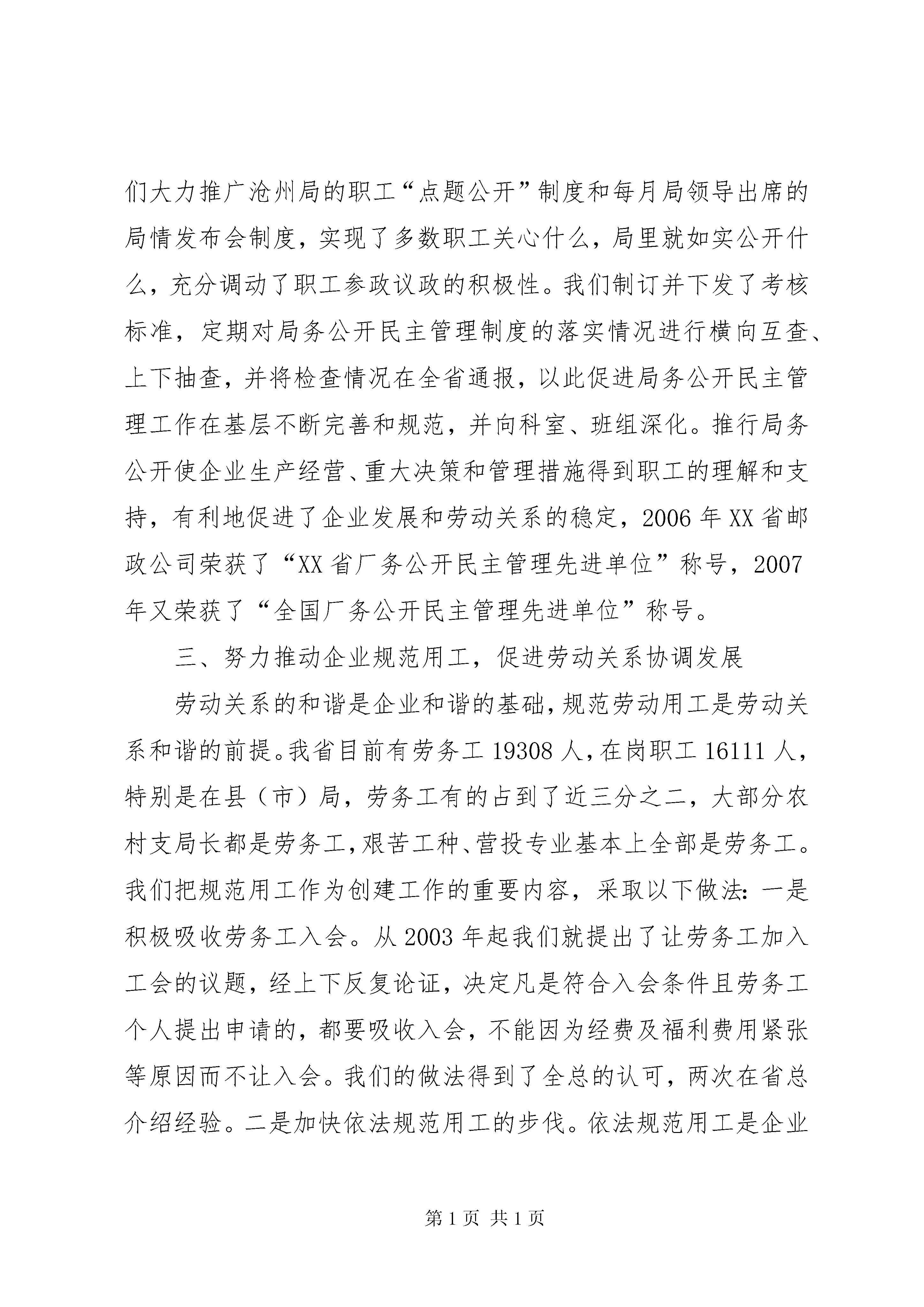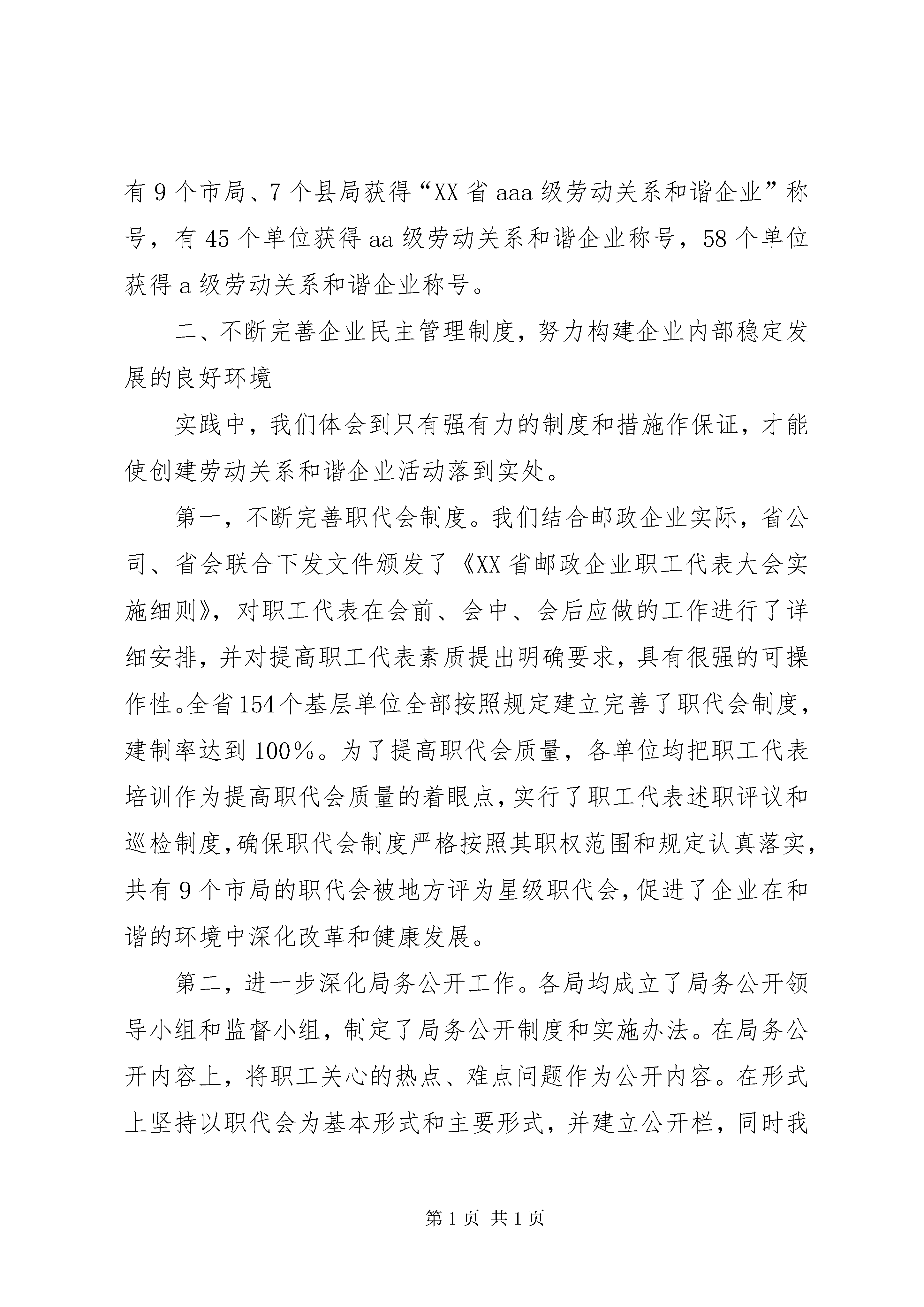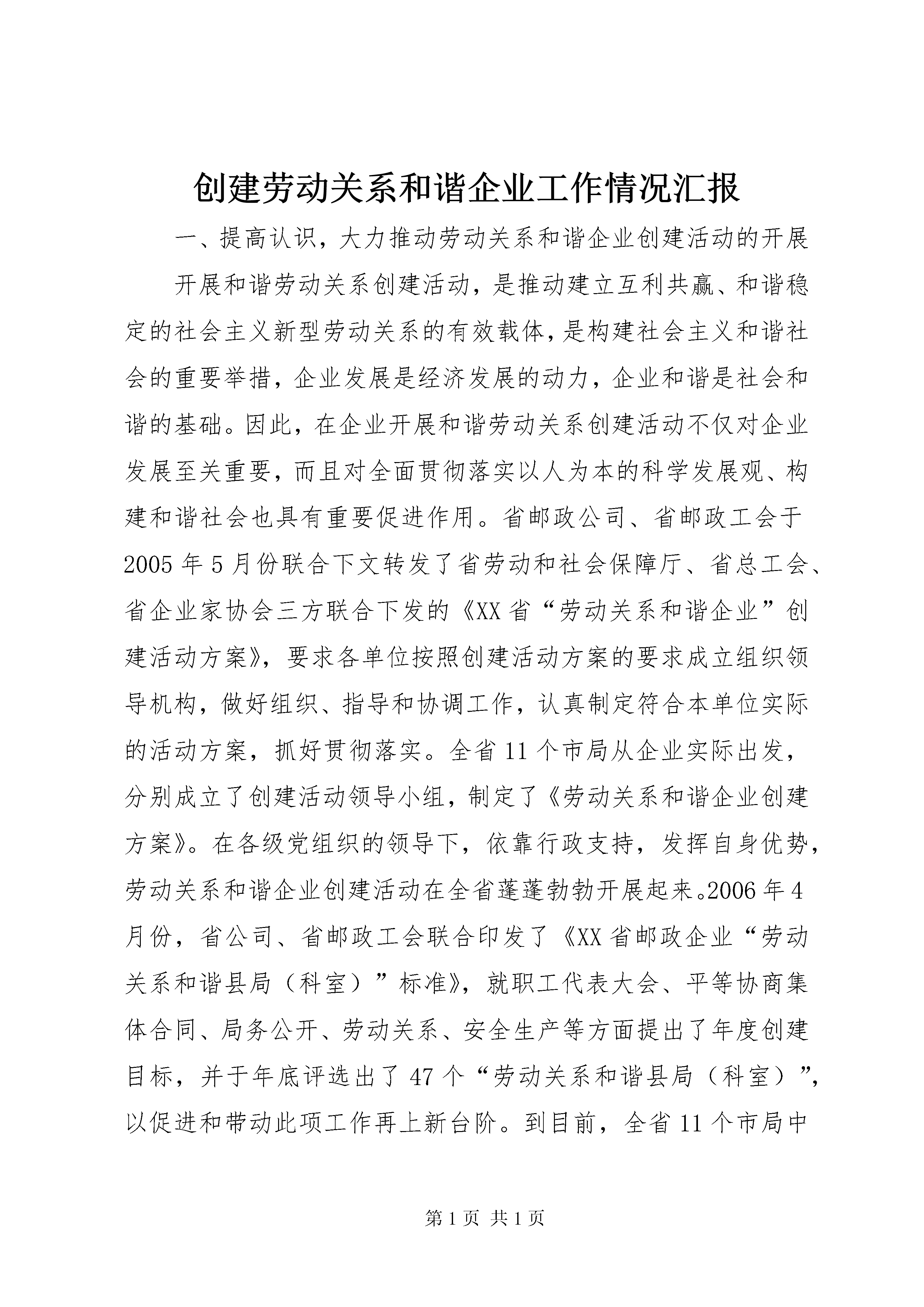 创建劳动关系和谐企业工作情况汇报一、提高认识,大力推动劳动关系和谐企业创建活动的开展开展和谐劳动关系创建活动,是推动建立互利共赢、和谐稳定的社会主义新型劳动关系的有效载体,是构建社会主义和谐社会的重要举措,企业发展是经济发展的动力,企业和谐是社会和谐的基础。因此,在企业开展和谐劳动关系创建活动不仅对企业发展至关重要,而且对全面贯彻落实以人为本的科学发展观、构建和谐社会也具有重要促进作用。省邮政公司、省邮政工会于2005年5月份联合下文转发了省劳动和社会保障厅、省总工会、省企业家协会三方联合下发的《XX省“劳动关系和谐企业”创建活动方案》,要求各单位按照创建活动方案的要求成立组织领导机构,做好组织、指导和协调工作,认真制定符合本单位实际的活动方案,抓好贯彻落实。全省11个市局从企业实际出发,分别成立了创建活动领导小组,制定了《劳动关系和谐企业创建方案》。在各级党组织的领导下,依靠行政支持,发挥自身优势,劳动关系和谐企业创建活动在全省蓬蓬勃勃开展起来。2006年4月份,省公司、省邮政工会联合印发了《XX省邮政企业“劳动关系和谐县局(科室)”标准》,就职工代表大会、平等协商集体合同、局务公开、劳动关系、安全生产等方面提出了年度创建目标,并于年底评选出了47个“劳动关系和谐县局(科室)”,以促进和带动此项工作再上新台阶。到目前,全省11个市局中有9个市局、7个县局获得“XX省aaa级劳动关系和谐企业”称号,有45个单位获得aa级劳动关系和谐企业称号,58个单位获得a级劳动关系和谐企业称号。二、不断完善企业民主管理制度,努力构建企业内部稳定发展的良好环境实践中,我们体会到只有强有力的制度和措施作保证,才能使创建劳动关系和谐企业活动落到实处。第一,不断完善职代会制度。我们结合邮政企业实际,省公司、省会联合下发文件颁发了《XX省邮政企业职工代表大会实施细则》,对职工代表在会前、会中、会后应做的工作进行了详细安排,并对提高职工代表素质提出明确要求,具有很强的可操作性。全省154个基层单位全部按照规定建立完善了职代会制度,建制率达到100%。为了提高职代会质量,各单位均把职工代表培训作为提高职代会质量的着眼点,实行了职工代表述职评议和巡检制度,确保职代会制度严格按照其职权范围和规定认真落实,共有9个市局的职代会被地方评为星级职代会,促进了企业在和谐的环境中深化改革和健康发展。第二,进一步深化局务公开工作。各局均成立了局务公开领导小组和监督小组,制定了局务公开制度和实施办法。在局务公开内容上,将职工关心的热点、难点问题作为公开内容。在形式上坚持以职代会为基本形式和主要形式,并建立公开栏,同时我们大力推广沧州局的职工“点题公开”制度和每月局领导出席的局情发布会制度,实现了多数职工关心什么,局里就如实公开什么,充分调动了职工参政议政的积极性。我们制订并下发了考核标准,定期对局务公开民主管理制度的落实情况进行横向互查、上下抽查,并将检查情况在全省通报,以此促进局务公开民主管理工作在基层不断完善和规范,并向科室、班组深化。推行局务公开使企业生产经营、重大决策和管理措施得到职工的理解和支持,有利地促进了企业发展和劳动关系的稳定,2006年XX省邮政公司荣获了“XX省厂务公开民主管理先进单位”称号,2007年又荣获了“全国厂务公开民主管理先进单位”称号。三、努力推动企业规范用工,促进劳动关系协调发展劳动关系的和谐是企业和谐的基础,规范劳动用工是劳动关系和谐的前提。我省目前有劳务工19308人,在岗职工16111人,特别是在县(市)局,劳务工有的占到了近三分之二,大部分农村支局长都是劳务工,艰苦工种、营投专业基本上全部是劳务工。我们把规范用工作为创建工作的重要内容,采取以下做法:一是积极吸收劳务工入会。从2003年起我们就提出了让劳务工加入工会的议题,经上下反复论证,决定凡是符合入会条件且劳务工个人提出申请的,都要吸收入会,不能因为经费及福利费用紧张等原因而不让入会。我们的做法得到了全总的认可,两次在省总介绍经验。二是加快依法规范用工的步伐。依法规范用工是企业不可逾越的现实问题,如不抓紧解决,就会造成严重的后果,而且是越拖风险越大,早解决早主动。企业行政在邮政企业发展面临很多困难特别是资金困难的情况下,狠抓规范用工,得到集团公司的肯定,并在2006年全国邮政人事会议上做了专题经验发言。经过几年的努力,全省邮政企业劳务工派遣率达到81.6%,今年年底劳务工派遣率要达到95%以上,劳务工规范率要达到90%以上。三是在政策范围内营造人人平等的良好氛围,努力做到一视同仁。在思想教育、在技术业务培训、在评优选先、在选才用人、在劳动保护、在多劳多得等方面一视同仁。这种做法增强了劳务工的归属感,形成了企业靠职工发展,职工靠企业生存的氛围。四、加大职