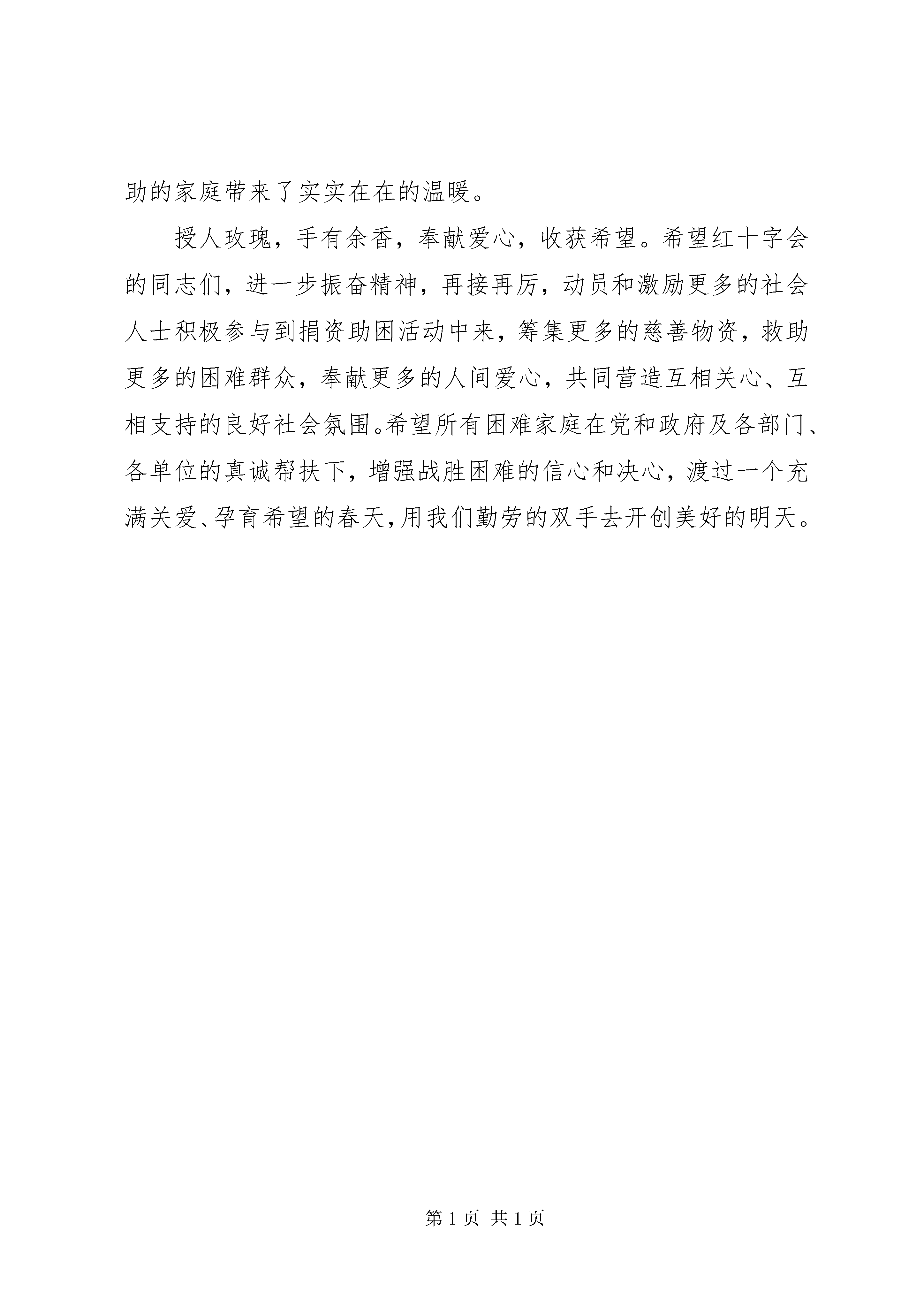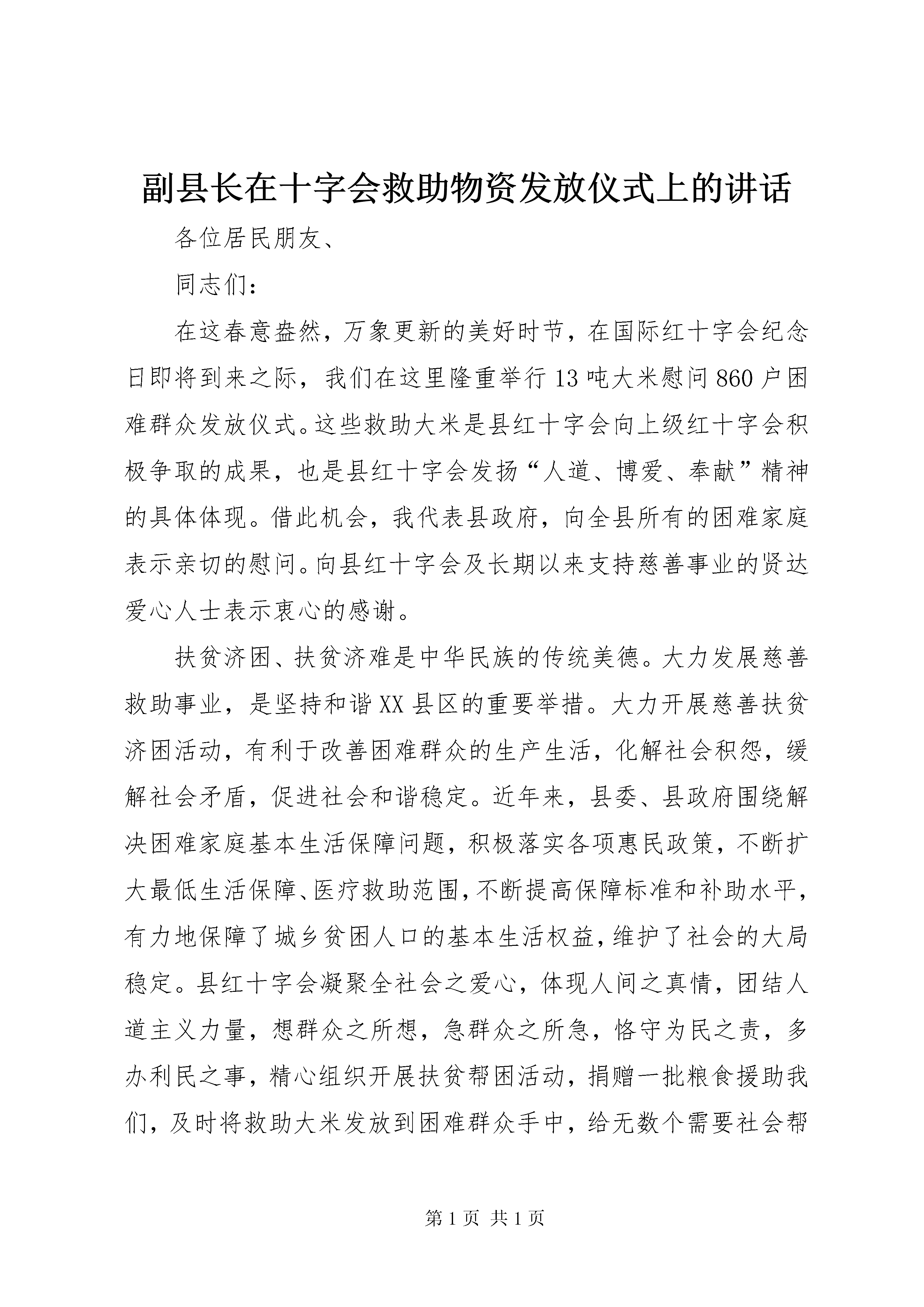 副县长在十字会救助物资发放仪式上的讲话各位居民朋友、同志们:在这春意盎然,万象更新的美好时节,在国际红十字会纪念日即将到来之际,我们在这里隆重举行13吨大米慰问860户困难群众发放仪式。这些救助大米是县红十字会向上级红十字会积极争取的成果,也是县红十字会发扬“人道、博爱、奉献”精神的具体体现。借此机会,我代表县政府,向全县所有的困难家庭表示亲切的慰问。向县红十字会及长期以来支持慈善事业的贤达爱心人士表示衷心的感谢。扶贫济困、扶贫济难是中华民族的传统美德。大力发展慈善救助事业,是坚持和谐XX县区的重要举措。大力开展慈善扶贫济困活动,有利于改善困难群众的生产生活,化解社会积怨,缓解社会矛盾,促进社会和谐稳定。近年来,县委、县政府围绕解决困难家庭基本生活保障问题,积极落实各项惠民政策,不断扩大最低生活保障、医疗救助范围,不断提高保障标准和补助水平,有力地保障了城乡贫困人口的基本生活权益,维护了社会的大局稳定。县红十字会凝聚全社会之爱心,体现人间之真情,团结人道主义力量,想群众之所想,急群众之所急,恪守为民之责,多办利民之事,精心组织开展扶贫帮困活动,捐赠一批粮食援助我们,及时将救助大米发放到困难群众手中,给无数个需要社会帮助的家庭带来了实实在在的温暖。授人玫瑰,手有余香,奉献爱心,收获希望。希望红十字会的同志们,进一步振奋精神,再接再厉,动员和激励更多的社会人士积极参与到捐资助困活动中来,筹集更多的慈善物资,救助更多的困难群众,奉献更多的人间爱心,共同营造互相关心、互相支持的良好社会氛围。希望所有困难家庭在党和政府及各部门、各单位的真诚帮扶下,增强战胜困难的信心和决心,渡过一个充满关爱、孕育希望的春天,用我们勤劳的双手去开创美好的明天。