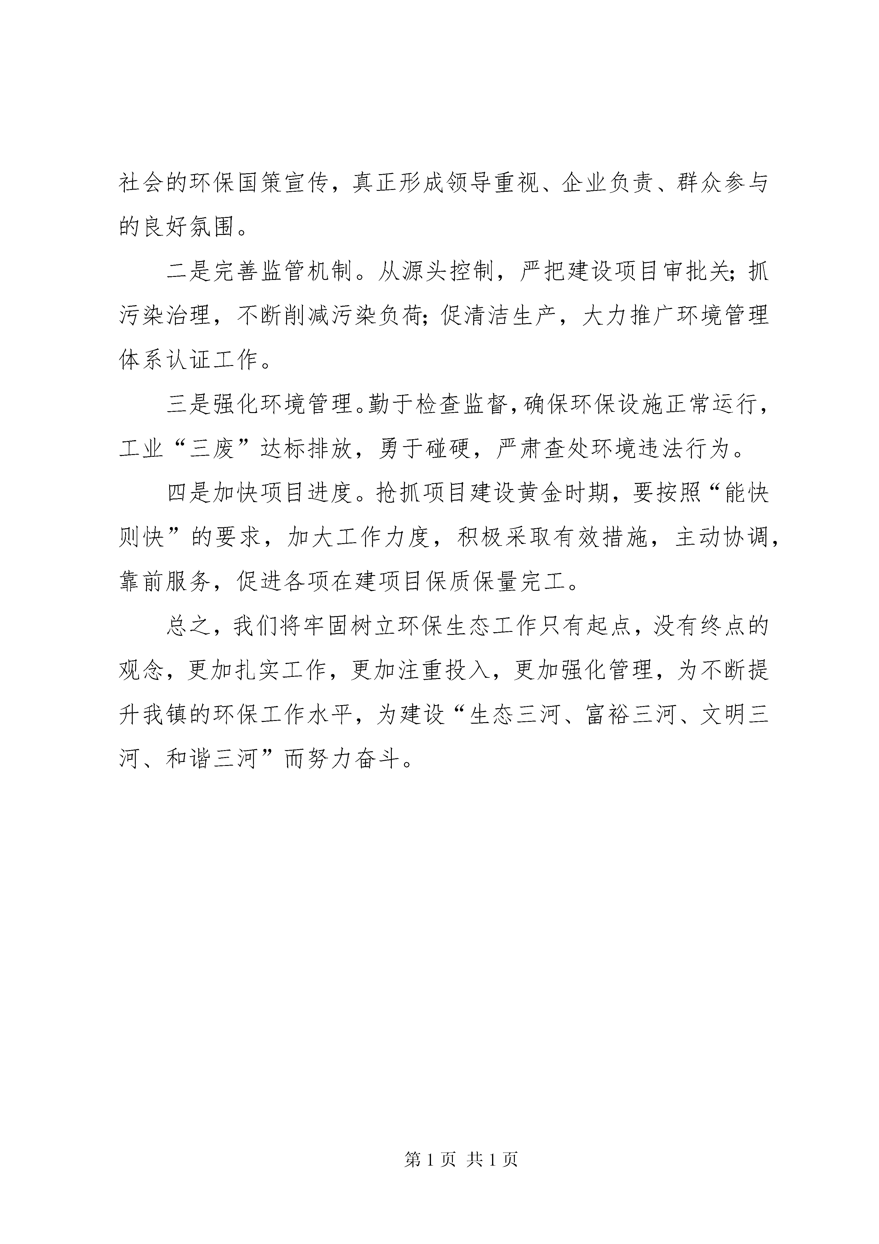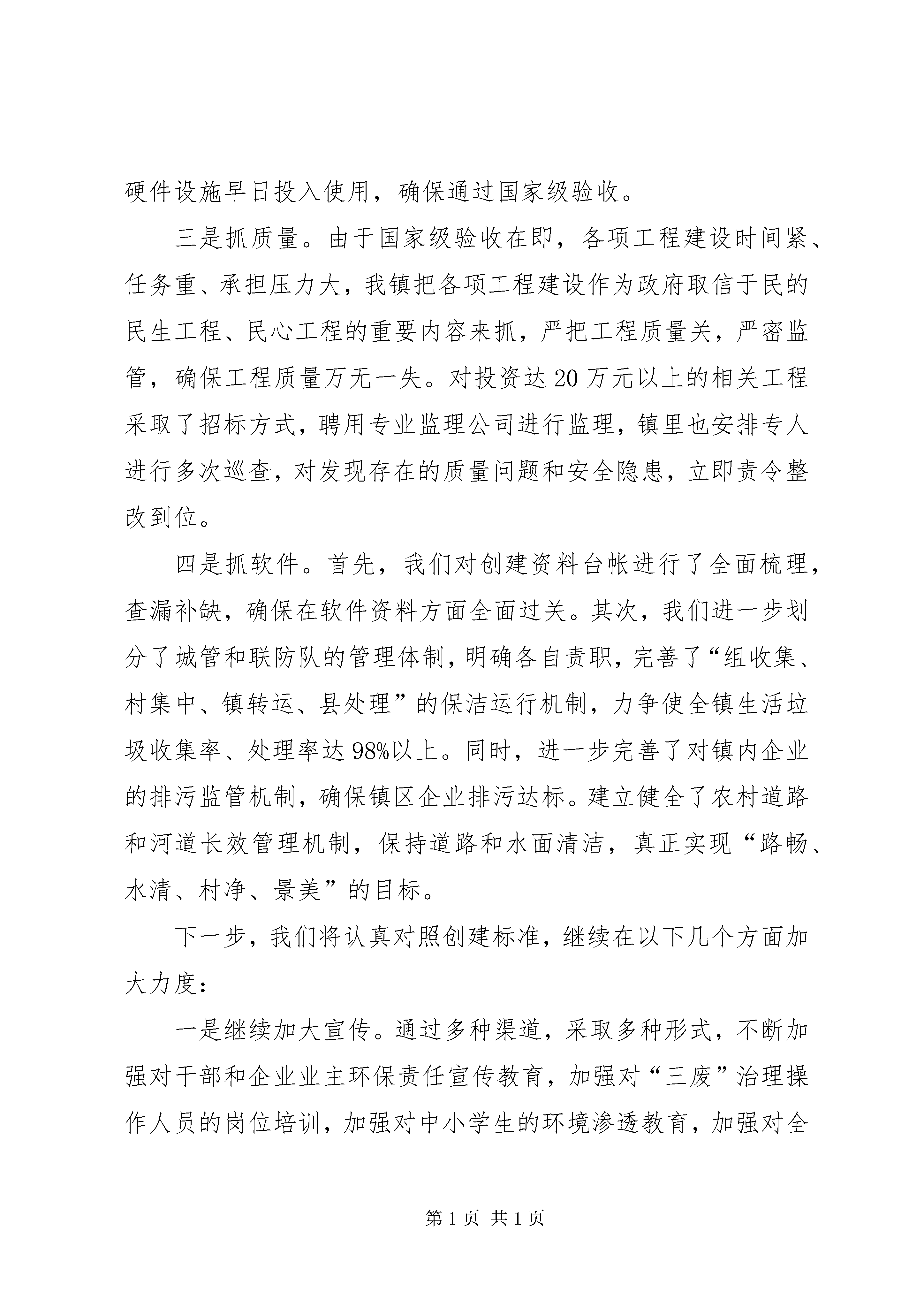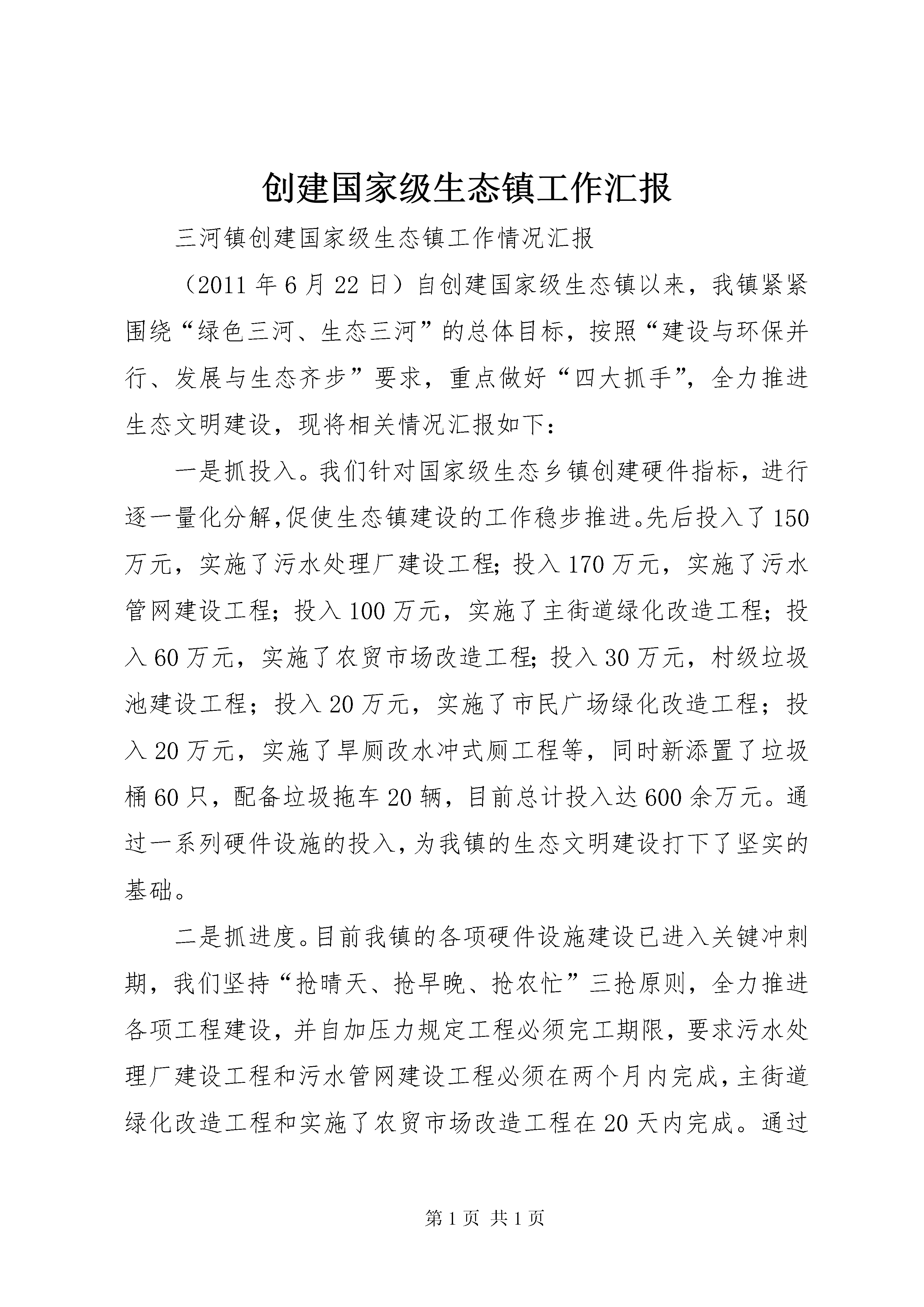 创建国家级生态镇工作汇报三河镇创建国家级生态镇工作情况汇报(2011年6月22日)自创建国家级生态镇以来,我镇紧紧围绕“绿色三河、生态三河”的总体目标,按照“建设与环保并行、发展与生态齐步”要求,重点做好“四大抓手”,全力推进生态文明建设,现将相关情况汇报如下:一是抓投入。我们针对国家级生态乡镇创建硬件指标,进行逐一量化分解,促使生态镇建设的工作稳步推进。先后投入了150万元,实施了污水处理厂建设工程;投入170万元,实施了污水管网建设工程;投入100万元,实施了主街道绿化改造工程;投入60万元,实施了农贸市场改造工程;投入30万元,村级垃圾池建设工程;投入20万元,实施了市民广场绿化改造工程;投入20万元,实施了旱厕改水冲式厕工程等,同时新添置了垃圾桶60只,配备垃圾拖车20辆,目前总计投入达600余万元。通过一系列硬件设施的投入,为我镇的生态文明建设打下了坚实的基础。二是抓进度。目前我镇的各项硬件设施建设已进入关键冲刺期,我们坚持“抢晴天、抢早晚、抢农忙”三抢原则,全力推进各项工程建设,并自加压力规定工程必须完工期限,要求污水处理厂建设工程和污水管网建设工程必须在两个月内完成,主街道绿化改造工程和实施了农贸市场改造工程在20天内完成。通过硬件设施早日投入使用,确保通过国家级验收。三是抓质量。由于国家级验收在即,各项工程建设时间紧、任务重、承担压力大,我镇把各项工程建设作为政府取信于民的民生工程、民心工程的重要内容来抓,严把工程质量关,严密监管,确保工程质量万无一失。对投资达20万元以上的相关工程采取了招标方式,聘用专业监理公司进行监理,镇里也安排专人进行多次巡查,对发现存在的质量问题和安全隐患,立即责令整改到位。四是抓软件。首先,我们对创建资料台帐进行了全面梳理,查漏补缺,确保在软件资料方面全面过关。其次,我们进一步划分了城管和联防队的管理体制,明确各自责职,完善了“组收集、村集中、镇转运、县处理”的保洁运行机制,力争使全镇生活垃圾收集率、处理率达98%以上。同时,进一步完善了对镇内企业的排污监管机制,确保镇区企业排污达标。建立健全了农村道路和河道长效管理机制,保持道路和水面清洁,真正实现“路畅、水清、村净、景美”的目标。下一步,我们将认真对照创建标准,继续在以下几个方面加大力度:一是继续加大宣传。通过多种渠道,采取多种形式,不断加强对干部和企业业主环保责任宣传教育,加强对“三废”治理操作人员的岗位培训,加强对中小学生的环境渗透教育,加强对全社会的环保国策宣传,真正形成领导重视、企业负责、群众参与的良好氛围。二是完善监管机制。从源头控制,严把建设项目审批关;抓污染治理,不断削减污染负荷;促清洁生产,大力推广环境管理体系认证工作。三是强化环境管理。勤于检查监督,确保环保设施正常运行,工业“三废”达标排放,勇于碰硬,严肃查处环境违法行为。四是加快项目进度。抢抓项目建设黄金时期,要按照“能快则快”的要求,加大工作力度,积极采取有效措施,主动协调,靠前服务,促进各项在建项目保质保量完工。总之,我们将牢固树立环保生态工作只有起点,没有终点的观念,更加扎实工作,更加注重投入,更加强化管理,为不断提升我镇的环保工作水平,为建设“生态三河、富裕三河、文明三河、和谐三河”而努力奋斗。