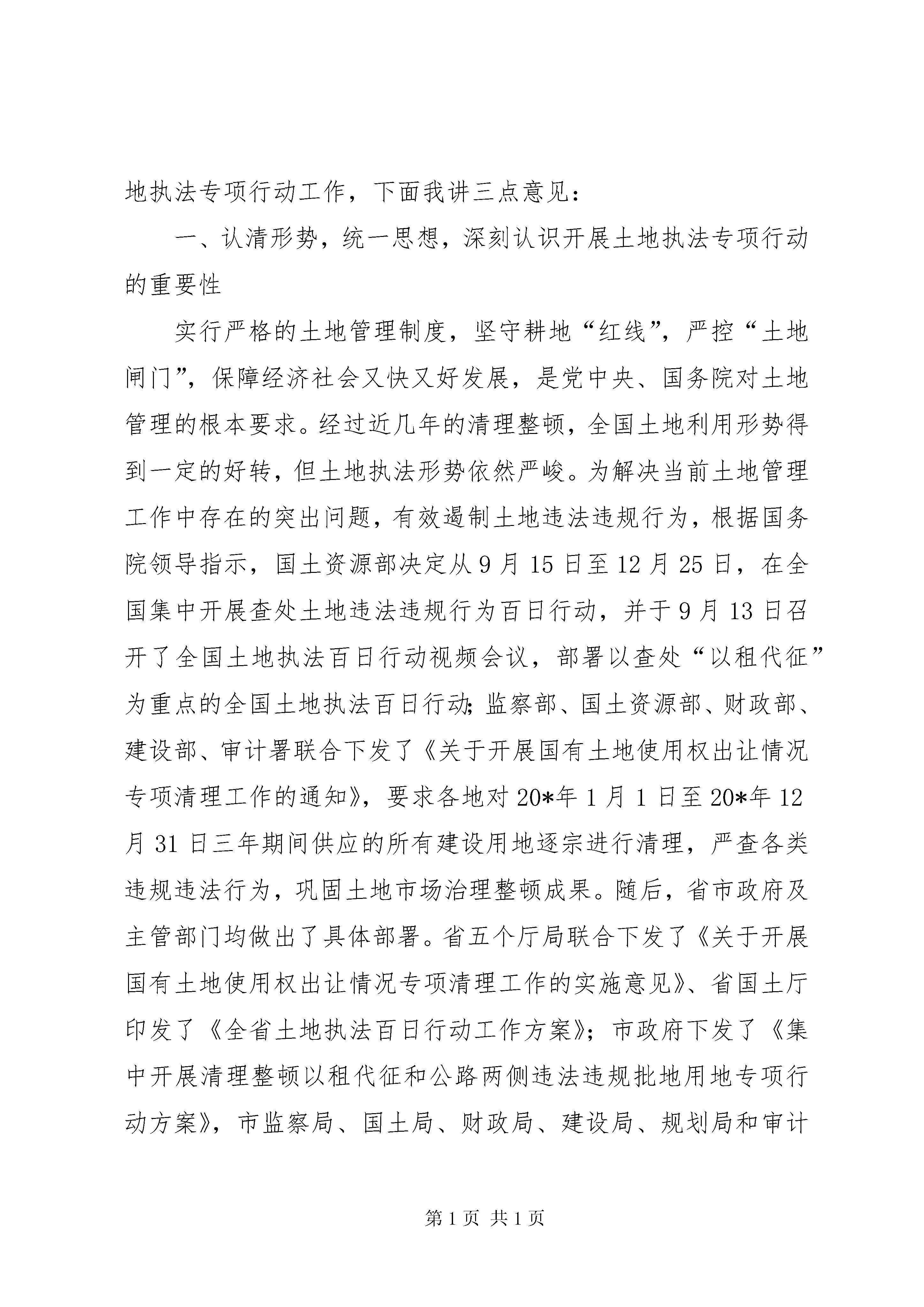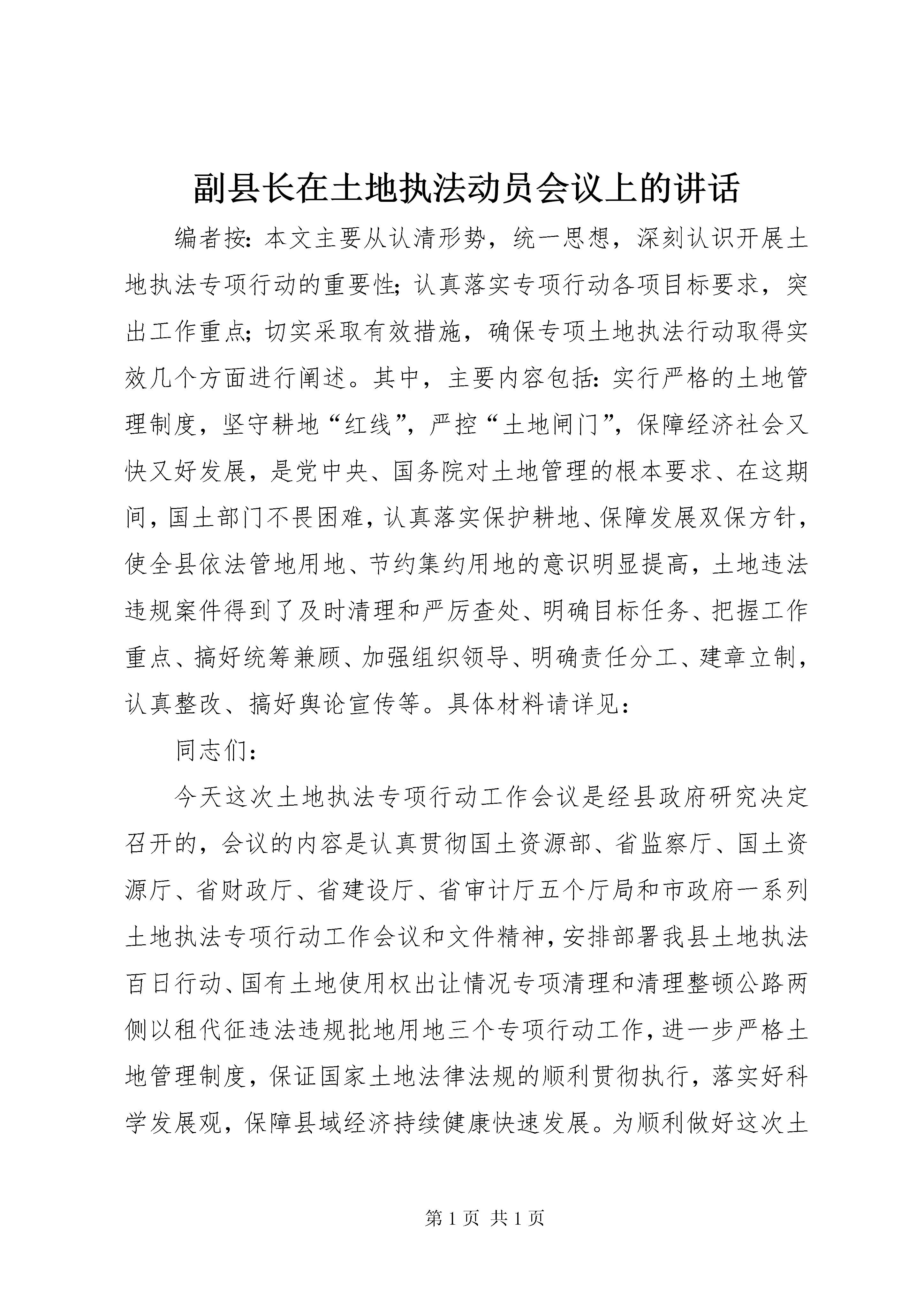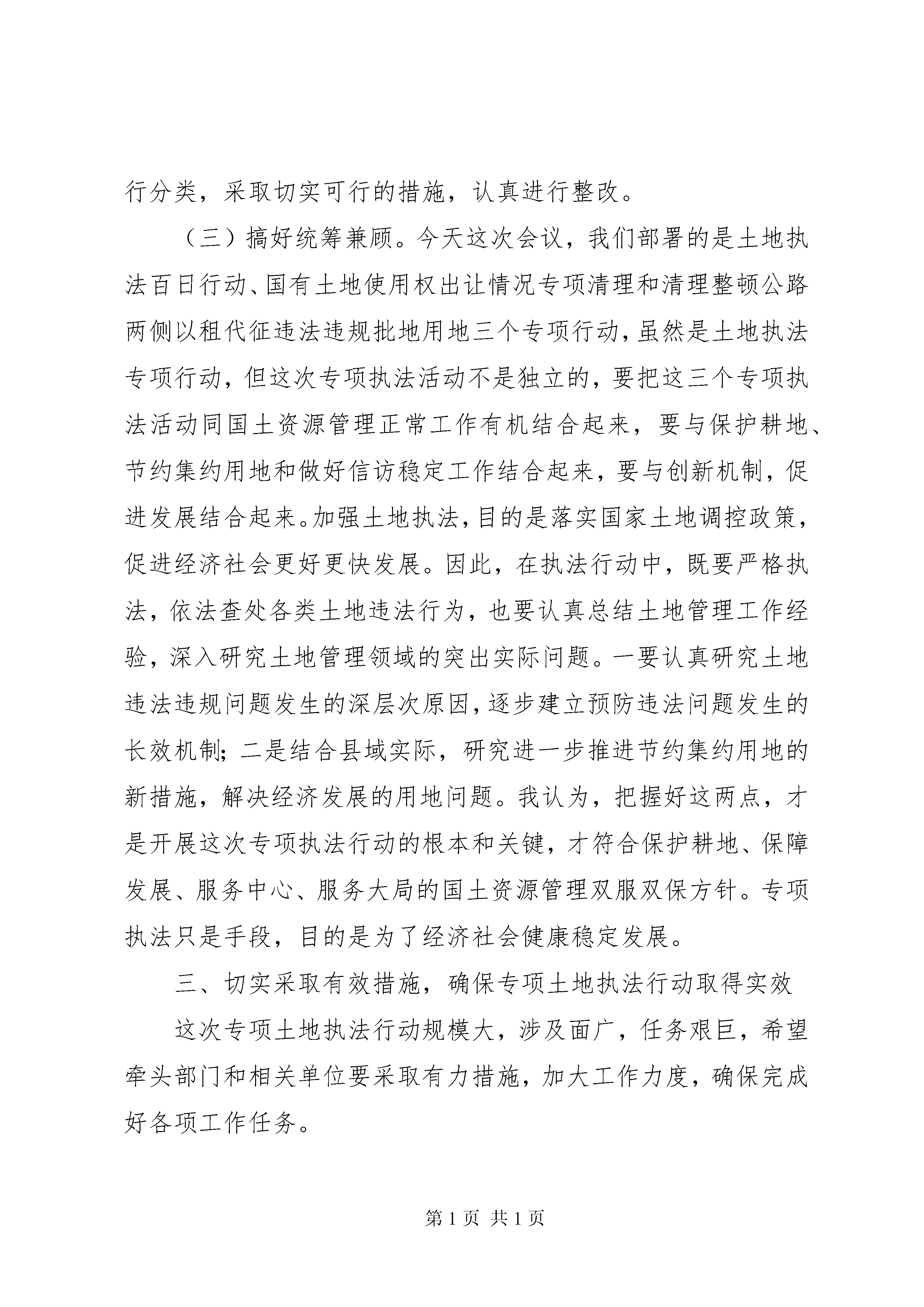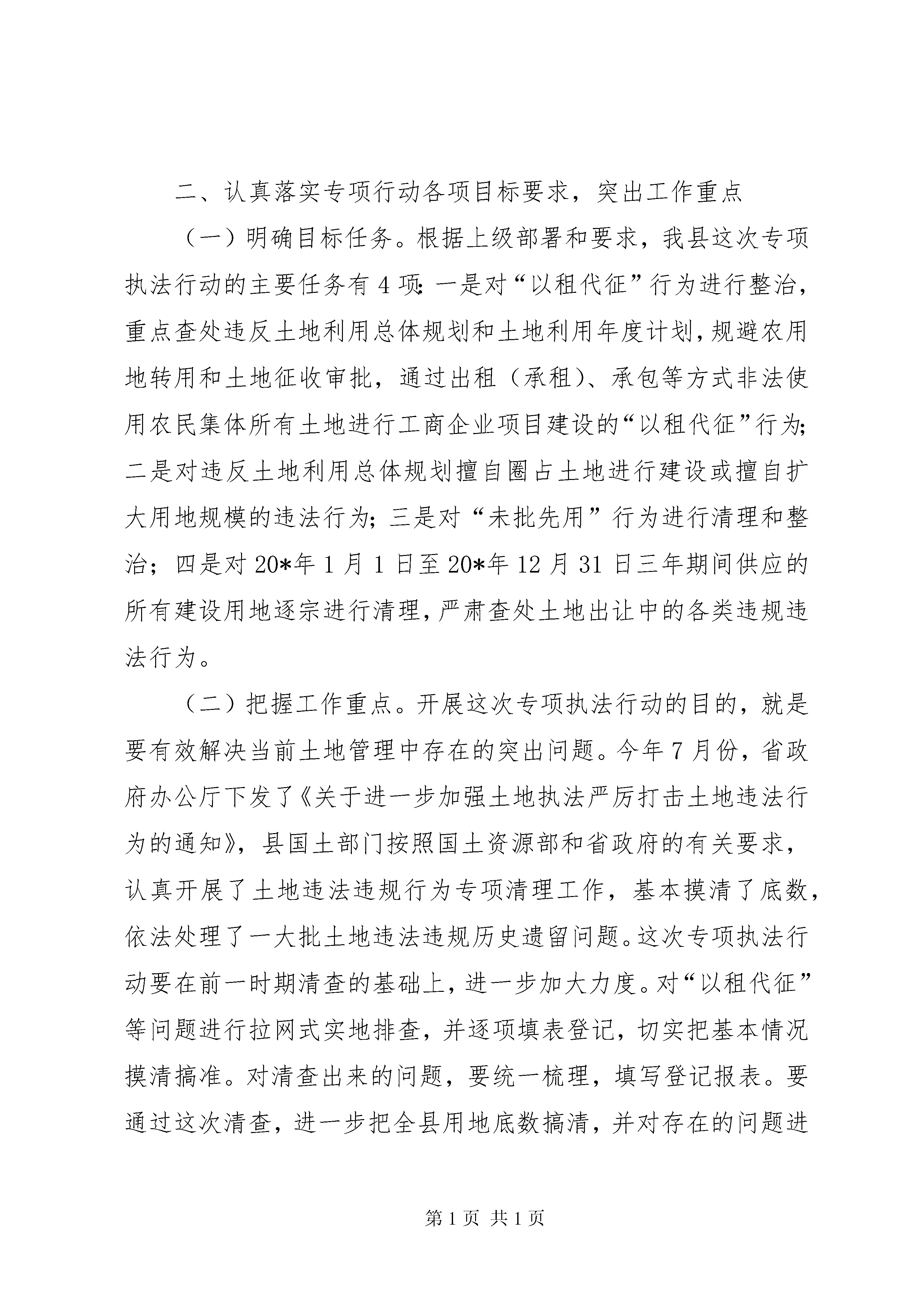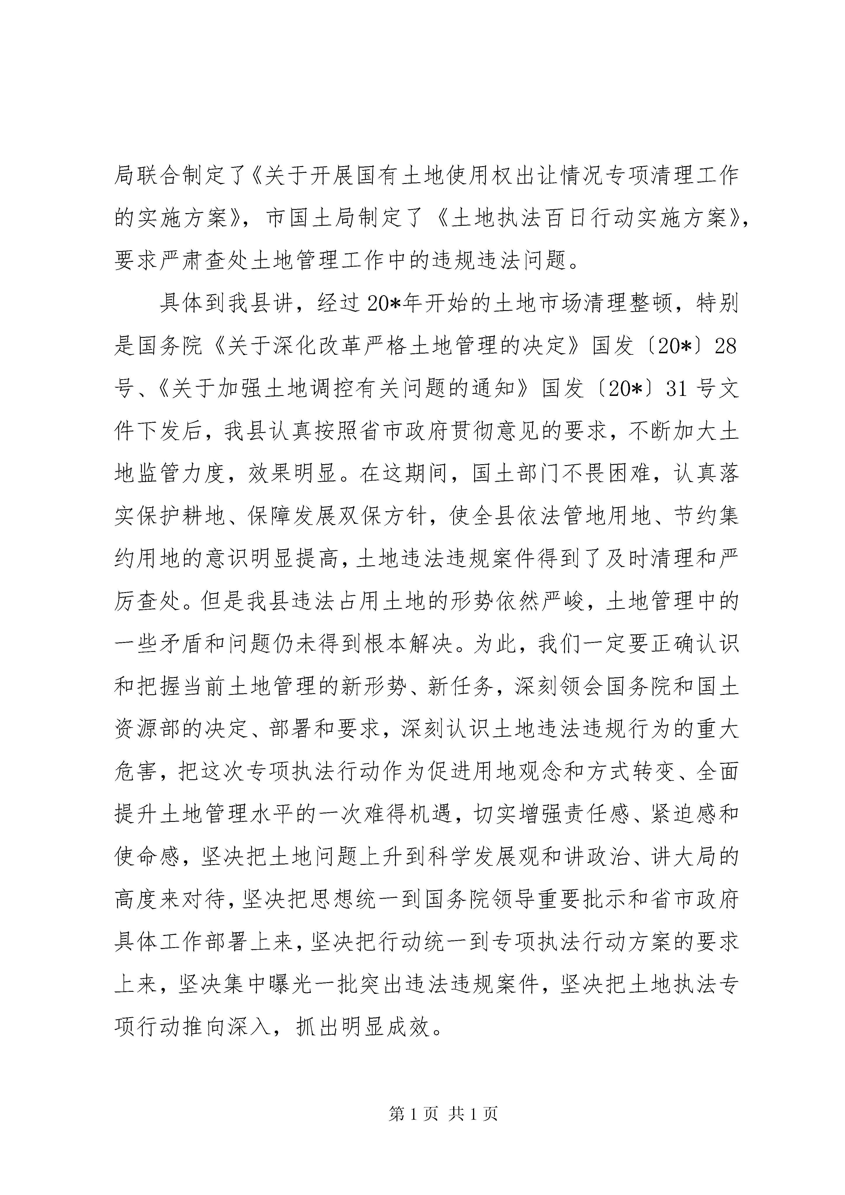 副县长在土地执法动员会议上的讲话编者按:本文主要从认清形势,统一思想,深刻认识开展土地执法专项行动的重要性;认真落实专项行动各项目标要求,突出工作重点;切实采取有效措施,确保专项土地执法行动取得实效几个方面进行阐述。其中,主要内容包括:实行严格的土地管理制度,坚守耕地“红线”,严控“土地闸门”,保障经济社会又快又好发展,是党中央、国务院对土地管理的根本要求、在这期间,国土部门不畏困难,认真落实保护耕地、保障发展双保方针,使全县依法管地用地、节约集约用地的意识明显提高,土地违法违规案件得到了及时清理和严厉查处、明确目标任务、把握工作重点、搞好统筹兼顾、加强组织领导、明确责任分工、建章立制,认真整改、搞好舆论宣传等。具体材料请详见:同志们:今天这次土地执法专项行动工作会议是经县政府研究决定召开的,会议的内容是认真贯彻国土资源部、省监察厅、国土资源厅、省财政厅、省建设厅、省审计厅五个厅局和市政府一系列土地执法专项行动工作会议和文件精神,安排部署我县土地执法百日行动、国有土地使用权出让情况专项清理和清理整顿公路两侧以租代征违法违规批地用地三个专项行动工作,进一步严格土地管理制度,保证国家土地法律法规的顺利贯彻执行,落实好科学发展观,保障县域经济持续健康快速发展。为顺利做好这次土地执法专项行动工作,下面我讲三点意见:一、认清形势,统一思想,深刻认识开展土地执法专项行动的重要性实行严格的土地管理制度,坚守耕地“红线”,严控“土地闸门”,保障经济社会又快又好发展,是党中央、国务院对土地管理的根本要求。经过近几年的清理整顿,全国土地利用形势得到一定的好转,但土地执法形势依然严峻。为解决当前土地管理工作中存在的突出问题,有效遏制土地违法违规行为,根据国务院领导指示,国土资源部决定从9月15日至12月25日,在全国集中开展查处土地违法违规行为百日行动,并于9月13日召开了全国土地执法百日行动视频会议,部署以查处“以租代征”为重点的全国土地执法百日行动;监察部、国土资源部、财政部、建设部、审计署联合下发了《关于开展国有土地使用权出让情况专项清理工作的通知》,要求各地对20*年1月1日至20*年12月31日三年期间供应的所有建设用地逐宗进行清理,严查各类违规违法行为,巩固土地市场治理整顿成果。随后,省市政府及主管部门均做出了具体部署。省五个厅局联合下发了《关于开展国有土地使用权出让情况专项清理工作的实施意见》、省国土厅印发了《全省土地执法百日行动工作方案》;市政府下发了《集中开展清理整顿以租代征和公路两侧违法违规批地用地专项行动方案》,市监察局、国土局、财政局、建设局、规划局和审计局联合制定了《关于开展国有土地使用权出让情况专项清理工作的实施方案》,市国土局制定了《土地执法百日行动实施方案》,要求严肃查处土地管理工作中的违规违法问题。具体到我县讲,经过20*年开始的土地市场清理整顿,特别是国务院《关于深化改革严格土地管理的决定》国发〔20*〕28号、《关于加强土地调控有关问题的通知》国发〔20*〕31号文件下发后,我县认真按照省市政府贯彻意见的要求,不断加大土地监管力度,效果明显。在这期间,国土部门不畏困难,认真落实保护耕地、保障发展双保方针,使全县依法管地用地、节约集约用地的意识明显提高,土地违法违规案件得到了及时清理和严厉查处。但是我县违法占用土地的形势依然严峻,土地管理中的一些矛盾和问题仍未得到根本解决。为此,我们一定要正确认识和把握当前土地管理的新形势、新任务,深刻领会国务院和国土资源部的决定、部署和要求,深刻认识土地违法违规行为的重大危害,把这次专项执法行动作为促进用地观念和方式转变、全面提升土地管理水平的一次难得机遇,切实增强责任感、紧迫感和使命感,坚决把土地问题上升到科学发展观和讲政治、讲大局的高度来对待,坚决把思想统一到国务院领导重要批示和省市政府具体工作部署上来,坚决把行动统一到专项执法行动方案的要求上来,坚决集中曝光一批突出违法违规案件,坚决把土地执法专项行动推向深入,抓出明显成效。二、认真落实专项行动各项目标要求,突出工作重点(一)明确目标任务。根据上级部署和要求,我县这次专项执法行动的主要任务有4项:一是对“以租代征”行为进行整治,重点查处违反土地利用总体规划和土地利用年度计划,规避农用地转用和土地征收审批,通过出租(承租)、承包等方式非法使用农民集体所有土地进行工商企业项目建设的“以租代征”行为;二是对违反土地利用总体规划擅自圈占土地进行建设或擅自扩大用地规模的违法行为;三是对“未批先用”行为进行清理和整治;四是对20*年1月1日至20*年12月31日三年期间供应的所有建设用地逐宗进行清理,严肃查处土地出让中的各类违规违法行为。(二)把握工作重点。开展这次专项执法行动的目的,就是要有效解决当前土地管