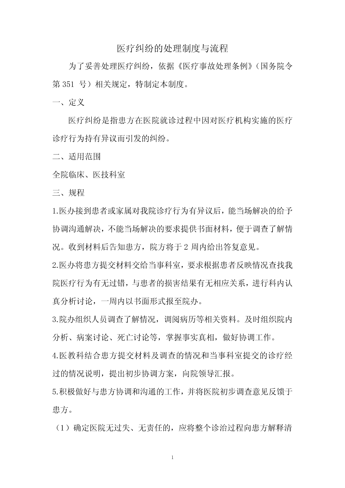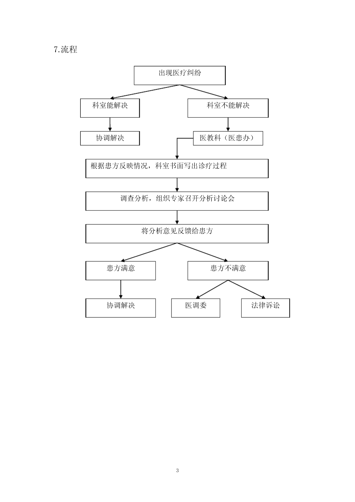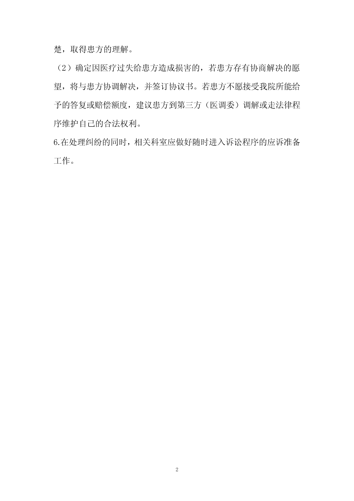 医疗纠纷的处理制度与流程为了妥善处理医疗纠纷,依据《医疗事故处理条例》(国务院令第351号)相关规定,特制定本制度。一、定义医疗纠纷是指患方在医院就诊过程中因对医疗机构实施的医疗诊疗行为持有异议而引发的纠纷。二、适用范围全院临床、医技科室三、规程1.医办接到患者或家属对我院诊疗行为有异议后,能当场解决的给予协调沟通解决,不能当场解决的要求提供书面材料,便于调查了解情况。收到材料后告知患方,院方将于2周内给出答复意见。2.医办将患方提交材料交给当事科室,要求根据患者反映情况查找我院医疗行为有无过错,与患者的损害结果有无相应关系,进行科内认真分析讨论,一周内以书面形式报至院办。3.院办组织人员调查了解情况,调阅病历等相关资料。及时组织院内分析、病案讨论、死亡讨论等,掌握事实真相,做好协调工作。4.医教科结合患方提交材料及调查的情况和当事科室提交的诊疗经过的情况说明,提出初步协调方案,向院领导汇报。5.积极做好与患方协调和沟通的工作,并将医院初步调查意见反馈于患方。(1)确定医院无过失、无责任的,应将整个诊治过程向患方解释清1楚,取得患方的理解。(2)确定因医疗过失给患方造成损害的,若患方存有协商解决的愿望,将与患方协调解决,并签订协议书。若患方不愿接受我院所能给予的答复或赔偿额度,建议患方到第三方(医调委)调解或走法律程序维护自己的合法权利。6.在处理纠纷的同时,相关科室应做好随时进入诉讼程序的应诉准备工作。27.流程出现医疗纠纷科室能解决科室不能解决协调解决医教科(医患办)根据患方反映情况,科室书面写出诊疗过程调查分析,组织专家召开分析讨论会将分析意见反馈给患方患方满意患方不满意协调解决医调委法律诉讼3