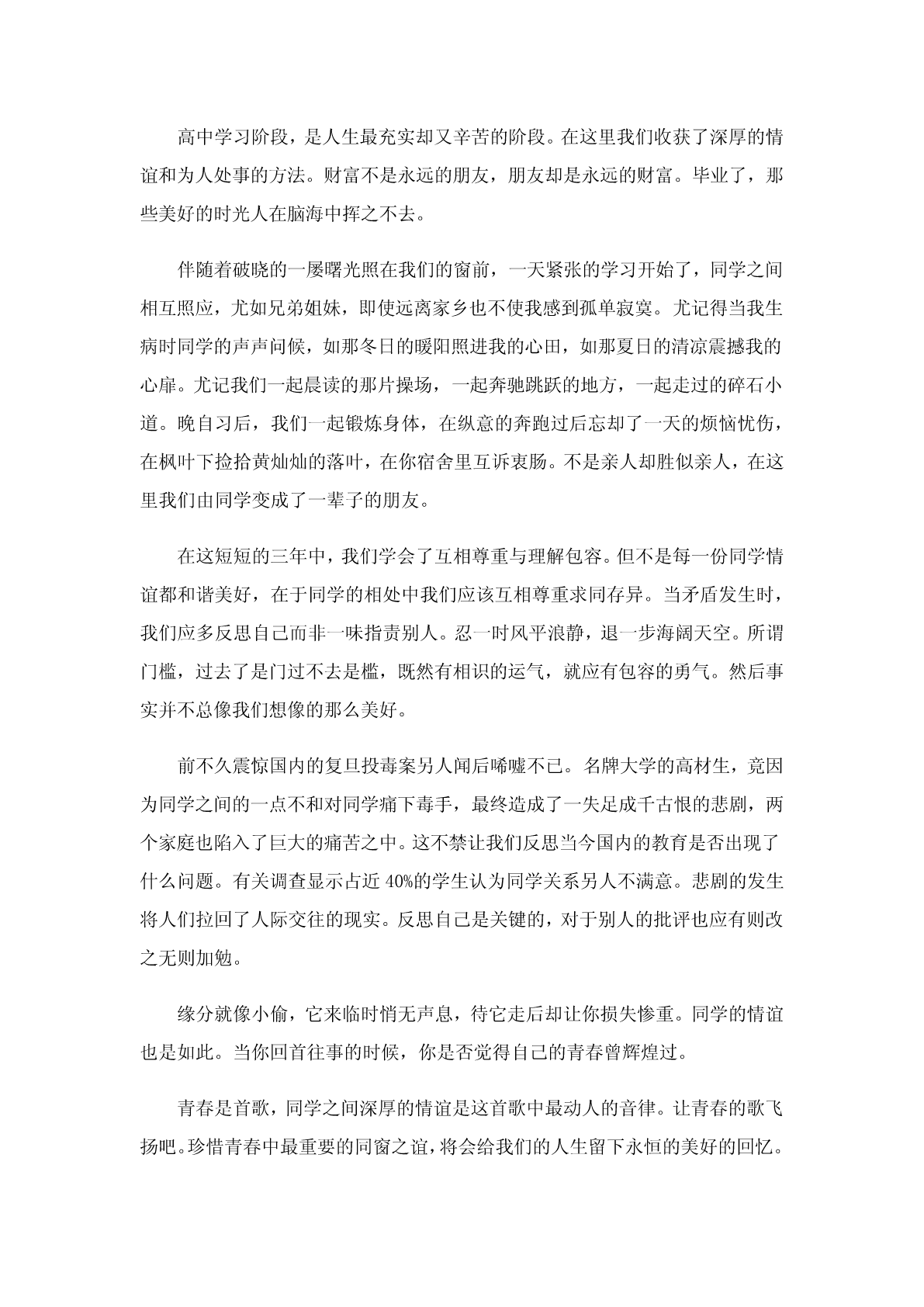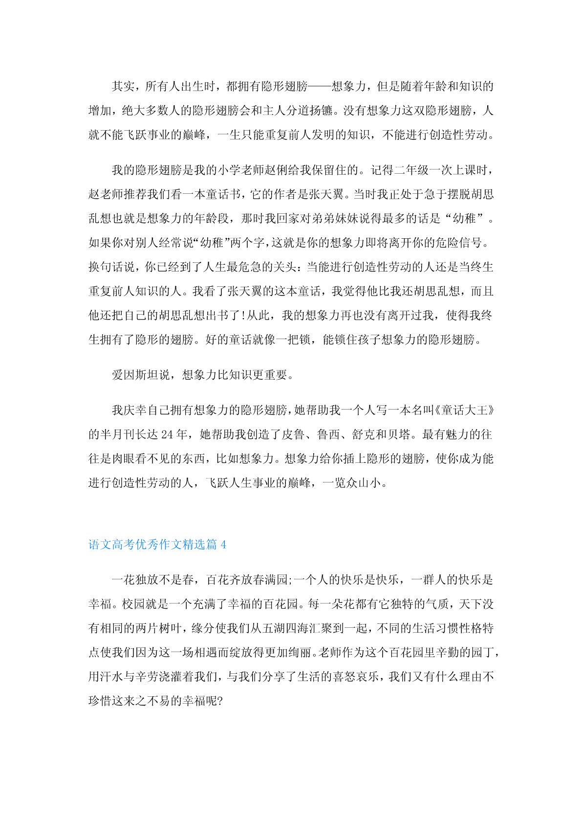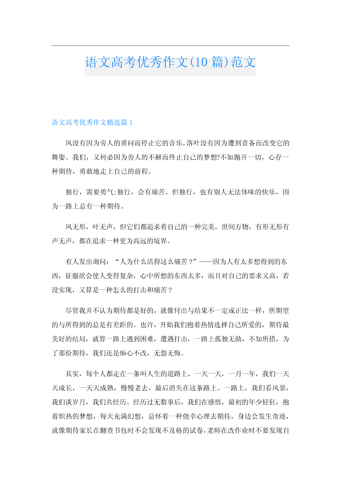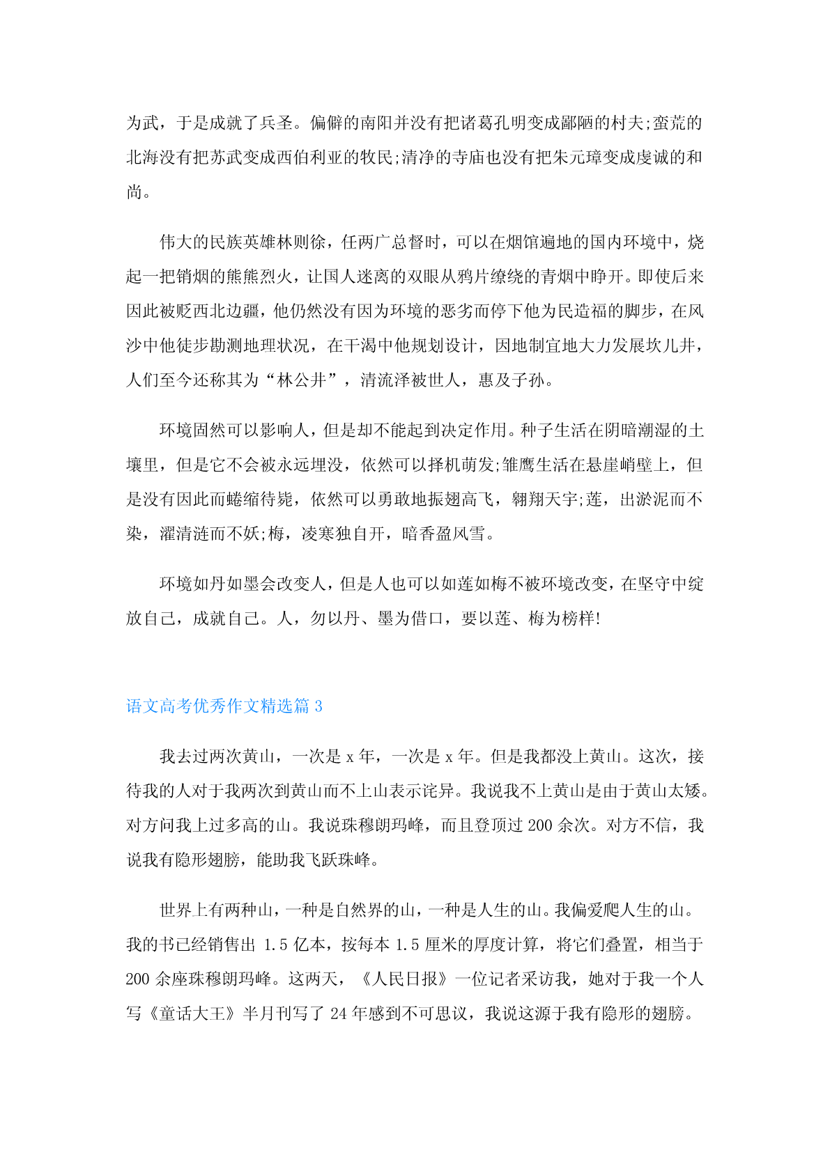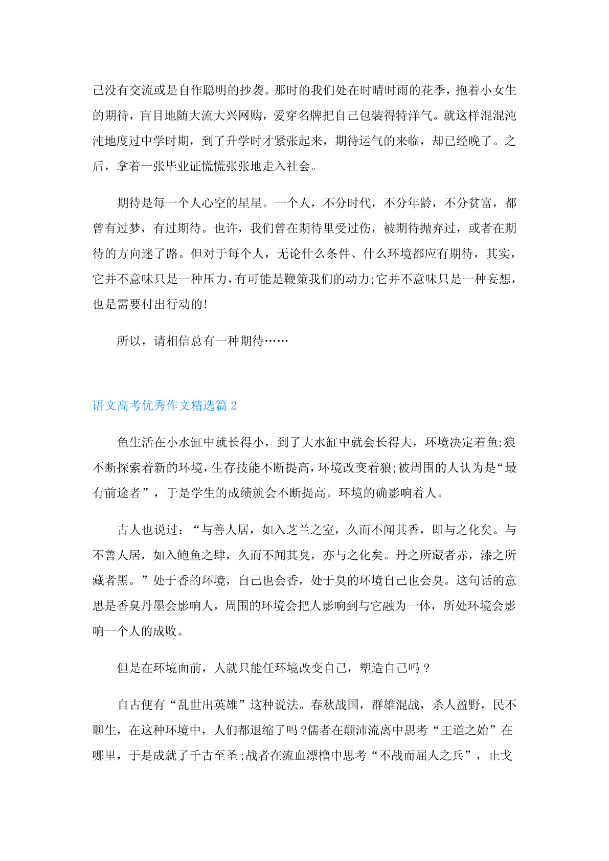 语文高考优秀作文(10篇)范文语文高考优秀作文精选篇1风没有因为旁人的质问而停止它的音乐,落叶没有因为遭到责备而改变它的舞姿。我们,又何必因为旁人的不解而终止自己的梦想?不如抛开一切,心存一种期待,勇敢地走上自己的前程。独行,需要勇气;独行,会有痛苦。但独行,也有别人无法体味的快乐,因为一路上总有一种期待。风无形,叶无声,但它们都追求着自己的一种完美,世间万物,有形无形有声无声,都在追求一种更为高远的境界。有人发出询问:“人为什么活得这么痛苦?”——因为人有太多想得到的东西,征服欲会使人变得复杂,心中所想的东西太多,而且对自己的要求又高,若没实现,又算是一种怎么的打击和痛苦?尽管我并不认为期待都是好的,就像付出与结果不一定成正比一样,所期望的与所得到的总是有差距的。也许,开始我们抱着热情选择自己所爱的,期待最美好的结局,就算一路上遇到困难,遭遇打击,一路上孤独无助,不知所措,为了那份期待,我们还是痴心不改,无怨无悔。其实,每个人都走在一条叫人生的道路上,一天一天,一月一年,我们一天天成长,一天天成熟,慢慢老去,最后消失在这条路上。一路上,我们看风景,我们谈岁月,我们共经历。经历过无数事后,我们在感悟,最初的年少轻狂,抱着炽热的梦想,每天充满幻想,总怀着一种侥幸心理去期待,身边会发生奇迹,就像期待家长在翻查书包时不会发现不及格的试卷,老师在改作业时不要发现自己没有交流或是自作聪明的抄袭。那时的我们处在时晴时雨的花季,抱着小女生的期待,盲目地随大流大兴网购,爱穿名牌把自己包装得特洋气。就这样混混沌沌地度过中学时期,到了升学时才紧张起来,期待运气的来临,却已经晚了。之后,拿着一张毕业证慌慌张张地走入社会。期待是每一个人心空的星星。一个人,不分时代,不分年龄,不分贫富,都曾有过梦,有过期待。也许,我们曾在期待里受过伤,被期待抛弃过,或者在期待的方向迷了路。但对于每个人,无论什么条件、什么环境都应有期待,其实,它并不意味只是一种压力,有可能是鞭策我们的动力;它并不意味只是一种妄想,也是需要付出行动的!所以,请相信总有一种期待……语文高考优秀作文精选篇2鱼生活在小水缸中就长得小,到了大水缸中就会长得大,环境决定着鱼;狼不断探索着新的环境,生存技能不断提高,环境改变着狼;被周围的人认为是“最有前途者”,于是学生的成绩就会不断提高。环境的确影响着人。古人也说过:“与善人居,如入芝兰之室,久而不闻其香,即与之化矣。与不善人居,如入鲍鱼之肆,久而不闻其臭,亦与之化矣。丹之所藏者赤,漆之所藏者黑。”处于香的环境,自己也会香,处于臭的环境自己也会臭。这句话的意思是香臭丹墨会影响人,周围的环境会把人影响到与它融为一体,所处环境会影响一个人的成败。但是在环境面前,人就只能任环境改变自己,塑造自己吗?自古便有“乱世出英雄”这种说法。春秋战国,群雄混战,杀人盈野,民不聊生,在这种环境中,人们都退缩了吗?儒者在颠沛流离中思考“王道之始”在哪里,于是成就了千古至圣;战者在流血漂橹中思考“不战而屈人之兵”,止戈为武,于是成就了兵圣。偏僻的南阳并没有把诸葛孔明变成鄙陋的村夫;蛮荒的北海没有把苏武变成西伯利亚的牧民;清净的寺庙也没有把朱元璋变成虔诚的和尚。伟大的民族英雄林则徐,任两广总督时,可以在烟馆遍地的国内环境中,烧起一把销烟的熊熊烈火,让国人迷离的双眼从鸦片缭绕的青烟中睁开。即使后来因此被贬西北边疆,他仍然没有因为环境的恶劣而停下他为民造福的脚步,在风沙中他徒步勘测地理状况,在干渴中他规划设计,因地制宜地大力发展坎儿井,人们至今还称其为“林公井”,清流泽被世人,惠及子孙。环境固然可以影响人,但是却不能起到决定作用。种子生活在阴暗潮湿的土壤里,但是它不会被永远埋没,依然可以择机萌发;雏鹰生活在悬崖峭壁上,但是没有因此而蜷缩待毙,依然可以勇敢地振翅高飞,翱翔天宇;莲,出淤泥而不染,濯清涟而不妖;梅,凌寒独自开,暗香盈风雪。环境如丹如墨会改变人,但是人也可以如莲如梅不被环境改变,在坚守中绽放自己,成就自己。人,勿以丹、墨为借口,要以莲、梅为榜样!语文高考优秀作文精选篇3我去过两次黄山,一次是x年,一次是x年。但是我都没上黄山。这次,接待我的人对于我两次到黄山而不上山表示诧异。我说我不上黄山是由于黄山太矮。对方问我上过多高的山。我说珠穆朗玛峰,而且登顶过200余次。对方不信,我说我有隐形翅膀,能助我飞跃珠峰。世界上有两种山,一种是自然界的山,一种是人生的山。我偏爱爬人生的山。我的书已经销售出1.5亿本,按每本1.5厘米的厚度计算,将它们叠置,相当于200余座珠穆朗玛峰。这两天,《人民日报》一位记者采访我,她对于我一个人写《童话大王》半月刊写了24年感到不可思议,我说这源于我有隐形的翅膀。其实,所有人出生时,都拥有隐形翅膀——想象力,但是随着年龄和知识的增加,绝大多数人的