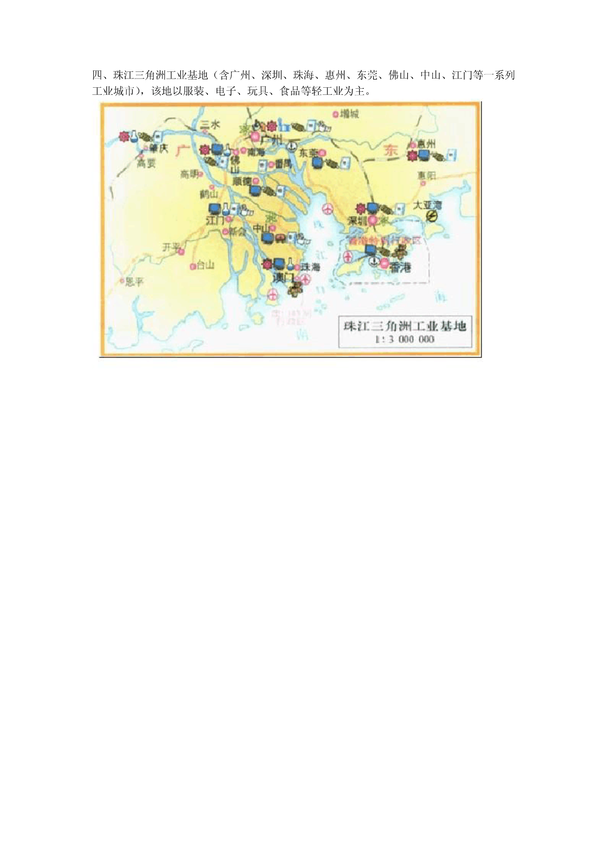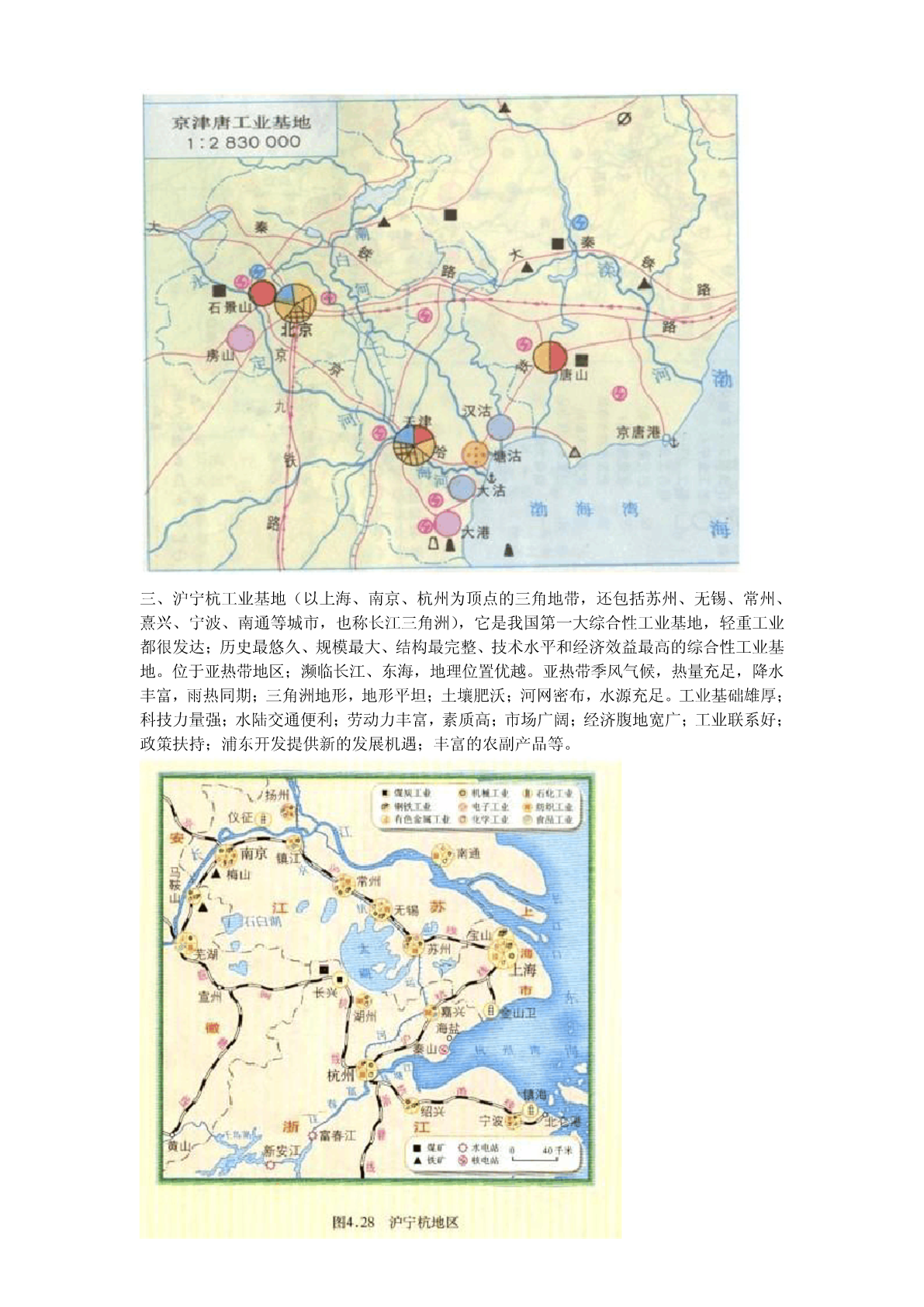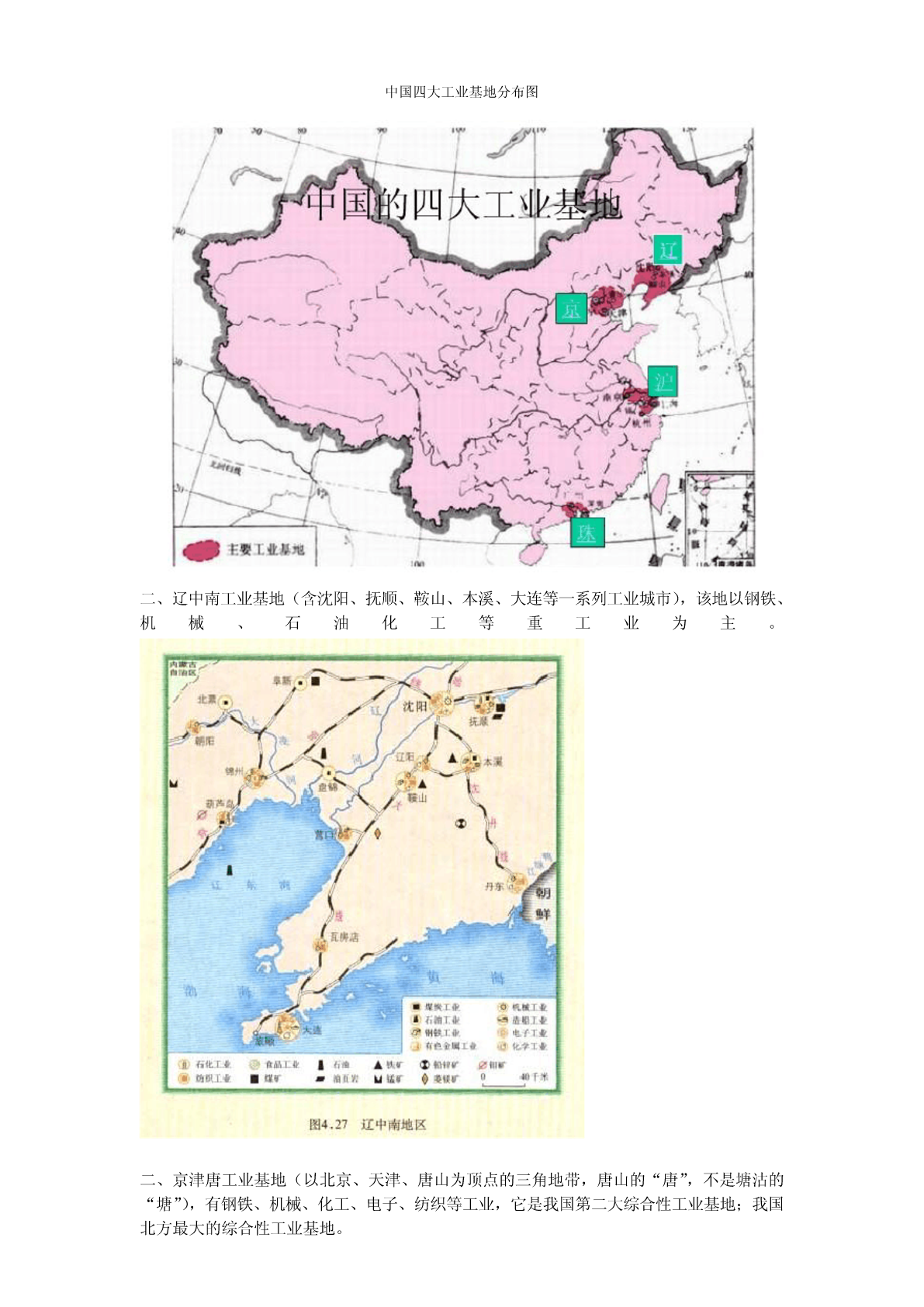 中国四大工业基地分布图二、辽中南工业基地(含沈阳、抚顺、鞍山、本溪、大连等一系列工业城市),该地以钢铁、机械、石油化工等重工业为主。二、京津唐工业基地(以北京、天津、唐山为顶点的三角地带,唐山的“唐”,不是塘沽的“塘”),有钢铁、机械、化工、电子、纺织等工业,它是我国第二大综合性工业基地;我国北方最大的综合性工业基地。三、沪宁杭工业基地(以上海、南京、杭州为顶点的三角地带,还包括苏州、无锡、常州、熹兴、宁波、南通等城市,也称长江三角洲),它是我国第一大综合性工业基地,轻重工业都很发达;历史最悠久、规模最大、结构最完整、技术水平和经济效益最高的综合性工业基地。位于亚热带地区;濒临长江、东海,地理位置优越。亚热带季风气候,热量充足,降水丰富,雨热同期;三角洲地形,地形平坦;土壤肥沃;河网密布,水源充足。工业基础雄厚;科技力量强;水陆交通便利;劳动力丰富,素质高;市场广阔;经济腹地宽广;工业联系好;政策扶持;浦东开发提供新的发展机遇;丰富的农副产品等。四、珠江三角洲工业基地(含广州、深圳、珠海、惠州、东莞、佛山、中山、江门等一系列工业城市),该地以服装、电子、玩具、食品等轻工业为主。