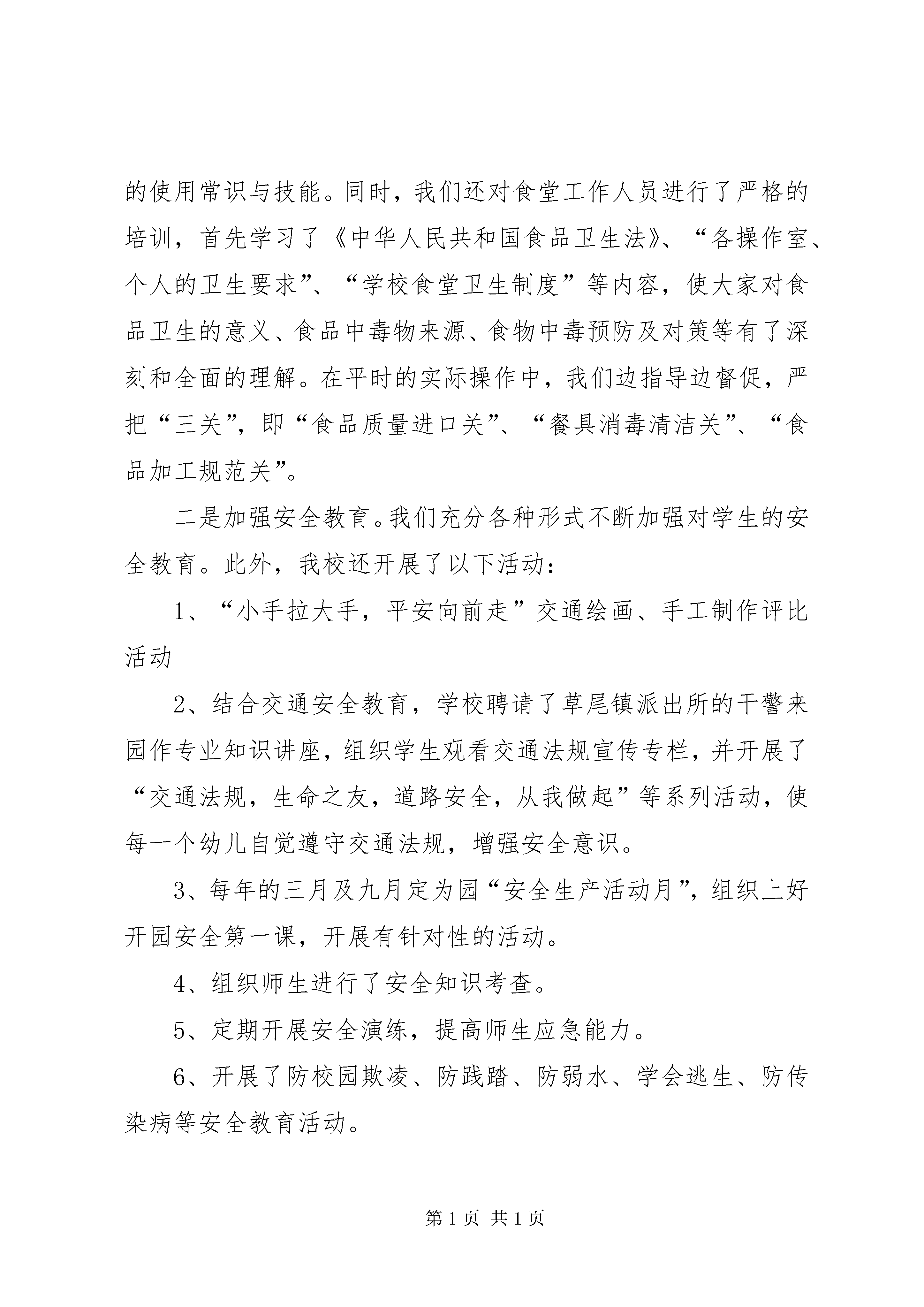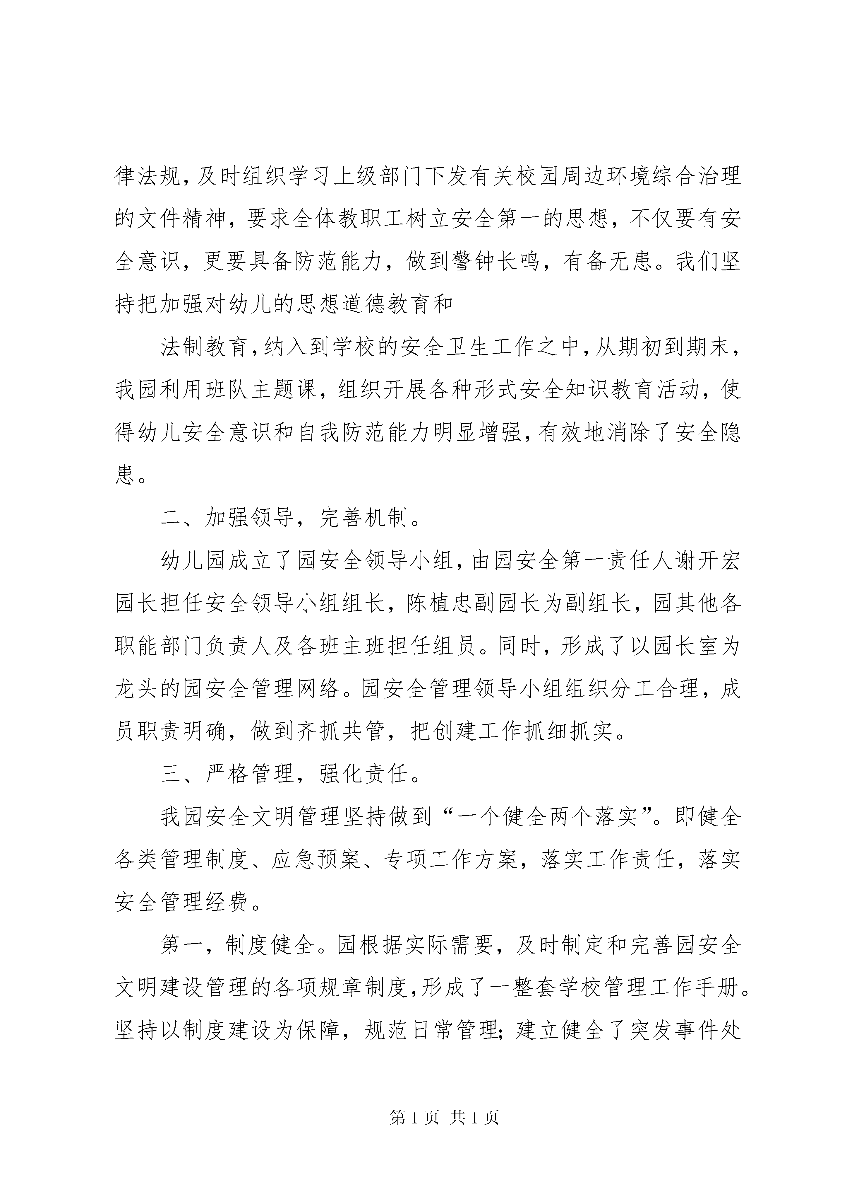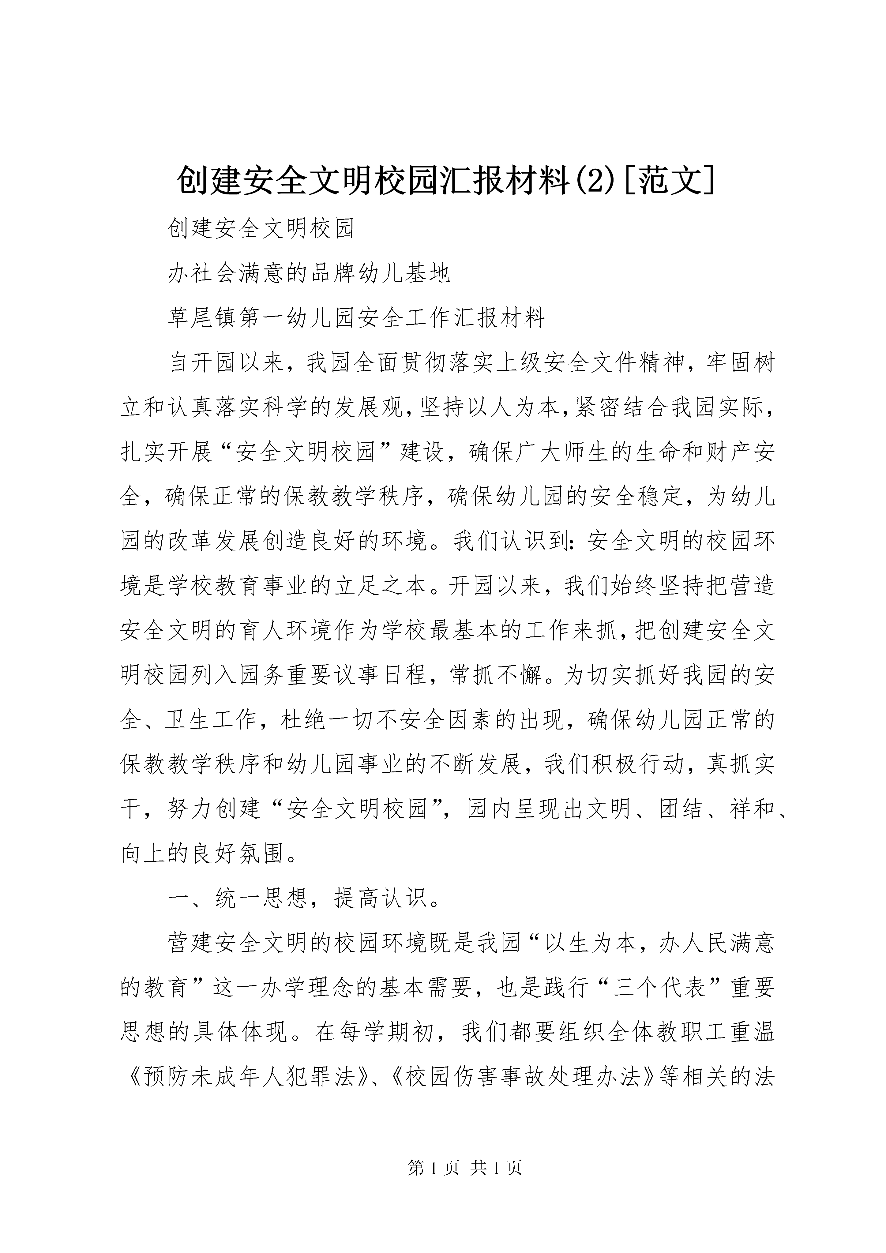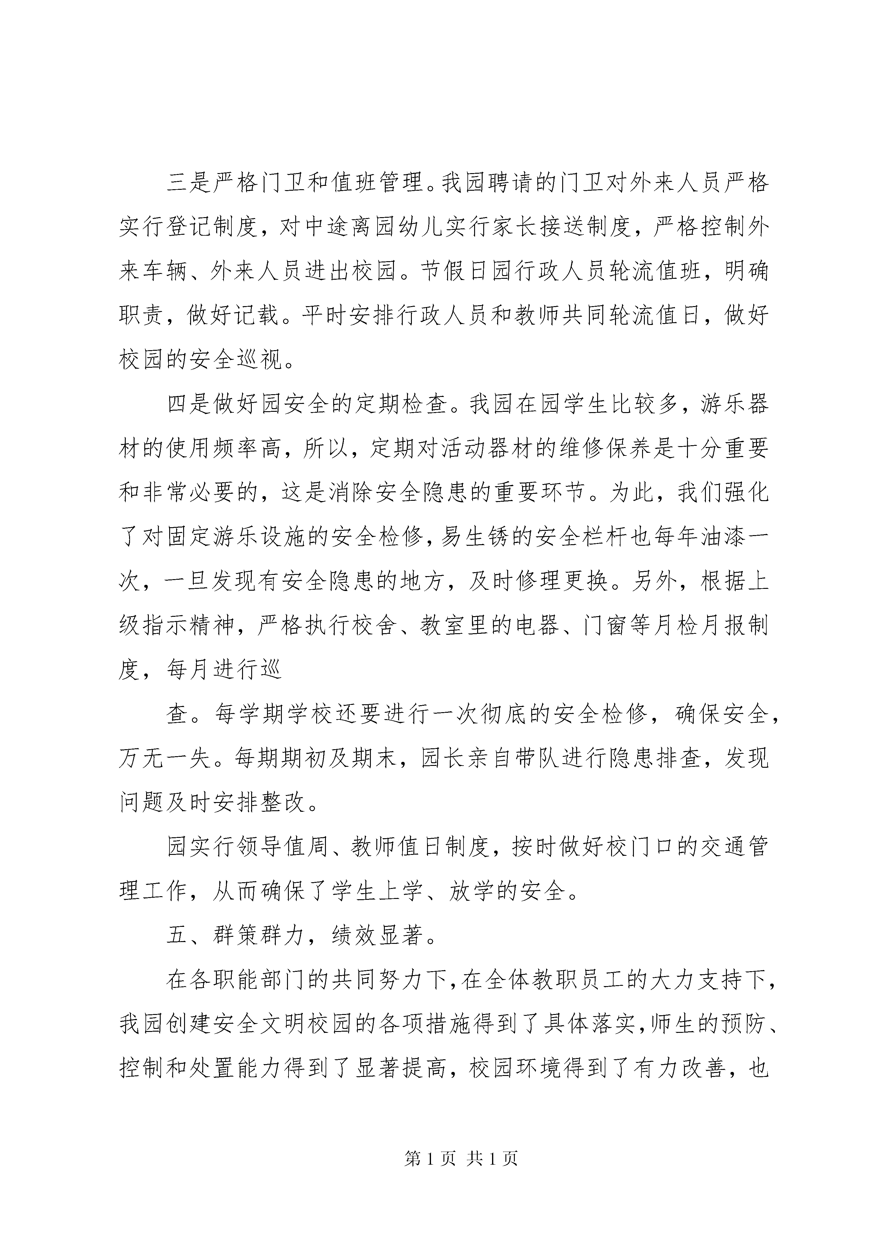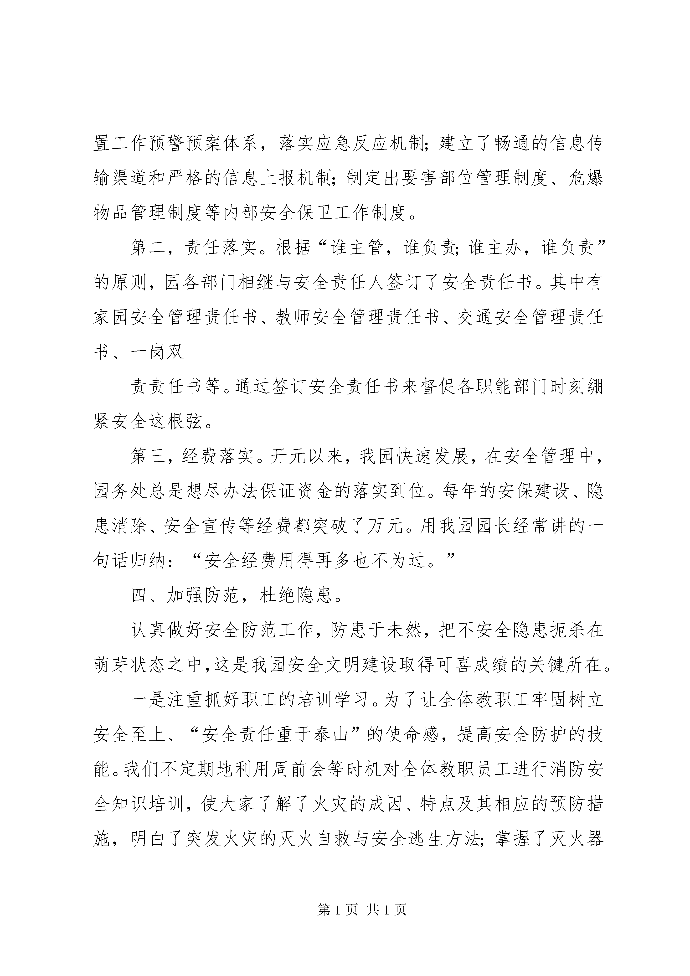 创建安全文明校园汇报材料(2)[范文]创建安全文明校园办社会满意的品牌幼儿基地草尾镇第一幼儿园安全工作汇报材料自开园以来,我园全面贯彻落实上级安全文件精神,牢固树立和认真落实科学的发展观,坚持以人为本,紧密结合我园实际,扎实开展“安全文明校园”建设,确保广大师生的生命和财产安全,确保正常的保教教学秩序,确保幼儿园的安全稳定,为幼儿园的改革发展创造良好的环境。我们认识到:安全文明的校园环境是学校教育事业的立足之本。开园以来,我们始终坚持把营造安全文明的育人环境作为学校最基本的工作来抓,把创建安全文明校园列入园务重要议事日程,常抓不懈。为切实抓好我园的安全、卫生工作,杜绝一切不安全因素的出现,确保幼儿园正常的保教教学秩序和幼儿园事业的不断发展,我们积极行动,真抓实干,努力创建“安全文明校园”,园内呈现出文明、团结、祥和、向上的良好氛围。一、统一思想,提高认识。营建安全文明的校园环境既是我园“以生为本,办人民满意的教育”这一办学理念的基本需要,也是践行“三个代表”重要思想的具体体现。在每学期初,我们都要组织全体教职工重温《预防未成年人犯罪法》、《校园伤害事故处理办法》等相关的法律法规,及时组织学习上级部门下发有关校园周边环境综合治理的文件精神,要求全体教职工树立安全第一的思想,不仅要有安全意识,更要具备防范能力,做到警钟长鸣,有备无患。我们坚持把加强对幼儿的思想道德教育和法制教育,纳入到学校的安全卫生工作之中,从期初到期末,我园利用班队主题课,组织开展各种形式安全知识教育活动,使得幼儿安全意识和自我防范能力明显增强,有效地消除了安全隐患。二、加强领导,完善机制。幼儿园成立了园安全领导小组,由园安全第一责任人谢开宏园长担任安全领导小组组长,陈植忠副园长为副组长,园其他各职能部门负责人及各班主班担任组员。同时,形成了以园长室为龙头的园安全管理网络。园安全管理领导小组组织分工合理,成员职责明确,做到齐抓共管,把创建工作抓细抓实。三、严格管理,强化责任。我园安全文明管理坚持做到“一个健全两个落实”。即健全各类管理制度、应急预案、专项工作方案,落实工作责任,落实安全管理经费。第一,制度健全。园根据实际需要,及时制定和完善园安全文明建设管理的各项规章制度,形成了一整套学校管理工作手册。坚持以制度建设为保障,规范日常管理;建立健全了突发事件处置工作预警预案体系,落实应急反应机制;建立了畅通的信息传输渠道和严格的信息上报机制;制定出要害部位管理制度、危爆物品管理制度等内部安全保卫工作制度。第二,责任落实。根据“谁主管,谁负责;谁主办,谁负责”的原则,园各部门相继与安全责任人签订了安全责任书。其中有家园安全管理责任书、教师安全管理责任书、交通安全管理责任书、一岗双责责任书等。通过签订安全责任书来督促各职能部门时刻绷紧安全这根弦。第三,经费落实。开元以来,我园快速发展,在安全管理中,园务处总是想尽办法保证资金的落实到位。每年的安保建设、隐患消除、安全宣传等经费都突破了万元。用我园园长经常讲的一句话归纳:“安全经费用得再多也不为过。”四、加强防范,杜绝隐患。认真做好安全防范工作,防患于未然,把不安全隐患扼杀在萌芽状态之中,这是我园安全文明建设取得可喜成绩的关键所在。一是注重抓好职工的培训学习。为了让全体教职工牢固树立安全至上、“安全责任重于泰山”的使命感,提高安全防护的技能。我们不定期地利用周前会等时机对全体教职员工进行消防安全知识培训,使大家了解了火灾的成因、特点及其相应的预防措施,明白了突发火灾的灭火自救与安全逃生方法;掌握了灭火器的使用常识与技能。同时,我们还对食堂工作人员进行了严格的培训,首先学习了《中华人民共和国食品卫生法》、“各操作室、个人的卫生要求”、“学校食堂卫生制度”等内容,使大家对食品卫生的意义、食品中毒物来源、食物中毒预防及对策等有了深刻和全面的理解。在平时的实际操作中,我们边指导边督促,严把“三关”,即“食品质量进口关”、“餐具消毒清洁关”、“食品加工规范关”。二是加强安全教育。我们充分各种形式不断加强对学生的安全教育。此外,我校还开展了以下活动:1、“小手拉大手,平安向前走”交通绘画、手工制作评比活动2、结合交通安全教育,学校聘请了草尾镇派出所的干警来园作专业知识讲座,组织学生观看交通法规宣传专栏,并开展了“交通法规,生命之友,道路安全,从我做起”等系列活动,使每一个幼儿自觉遵守交通法规,增强安全意识。3、每年的三月及九月定为园“安全生产活动月”,组织上好开园安全第一课,开展有针对性的活动。4、组织师生进行了安全知识考查。5、定期开展安全演练,提高师生应急能力。6、开展了防校园欺凌、防践踏、防弱水、学会逃生、防传染病等安全教育活动。三是严格门卫和值班管理。我园聘请的门卫对外来人员严格实行登记制度,对中途