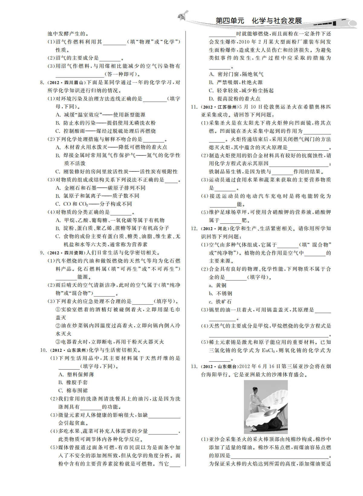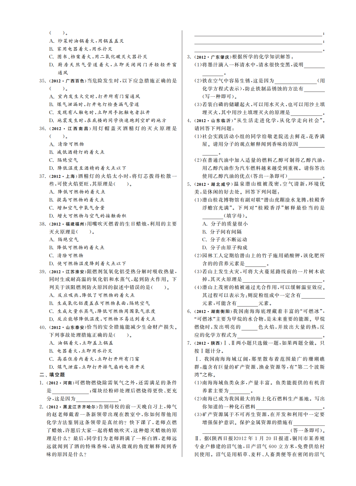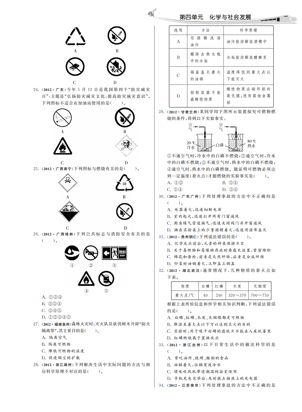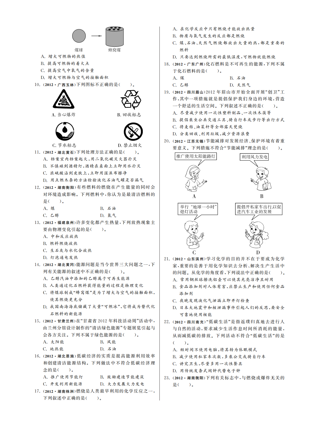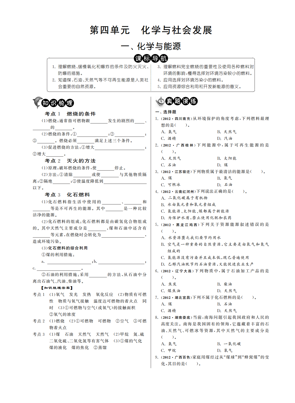 第四单元化学与社会发展第四单元化学与社会发展一化学与能源、理解燃烧缓慢氧化和爆炸的条件及防火灭火理解燃料完全燃烧的重要性及使用各种燃料对1.、、3.防爆的措施环境的影响懂得选择对环境污染较小的燃料.,.知道煤石油天然气等不可再生能源是人类社应用选择对环境污染小的燃料2.、、4..会重要的自然资源应用资源综合利用和开发新能源的意义.5..一选择题考点燃烧的条件、12012四川南充从环境保护的角度考虑下列燃料最理燃烧通常指可燃物跟发生的剧烈的1.(),(1):、想的是的()..氢气天然气燃烧的条件A.B.(2):①;②;酒精汽油燃烧必须满足上述三个条件..C.D.③2012广西桂林下列能源中属于可再生能源的是促进燃烧的方法增大2.(),(3):①;增大().②.天然气太阳能考点灭火的方法A.B.2石油煤原理破坏燃烧的条件使停止C.D.(1):,.2012江苏宿迁下列物质属于最清洁的能源是方法清除或使与其他物质隔3.()().(2):①煤氢气离隔绝使温度降低到A.B.;②;③可燃冰石油以下C.D..2012云南红河州下列说法正确的是考点化石燃料4.()().3二氧化碳属于有机物化石燃料指生活中使用的和A.(1)、水由氢元素和氧元素组成等是不可再生的能源其中是一种比较B..氢能源太阳能煤都属于新能源洁净的能源C.、、.为保护水质禁止使用化肥和农药化石燃料的组成化石燃料都是由碳氢化合物组成D.,(2):2012黑龙江鸡西下列关于资源能源叙述错误的是的其中天然气主要成分是煤和石油中还含有5.().,等元素在燃烧时会转化为().,,水资源匮乏我们要节约用水造成环境污染A..空气是一种重要的自然资源它主要是由氧气和氮气化石燃料的综合利用B.,(3)组成的煤的利用措施①:氢能源没有污染并且成本低现已普遍使用C.,a.;b.;乙醇汽油既节约石油资源又能促进农业生产D.,c..2012辽宁大连下列物质中属于石油加工产品的是石油的利用措施采用的方法从石油中分6.(),②:,离出石油气汽油柴油等().、、.焦炭柴油知识梳理答案A.B.【】煤焦油天然气考点氧气发光发热氧化反应物质有可燃C.D.1(1)(2)2012湖北宜昌下列不属于化石燃料的是性物质与氧气接触温度达可燃物的着火点同7.()().煤石油时可燃物与空气或氧气的接触面积A.B.(3)①()酒精天然气氧气的浓度C.D.②2012湖南娄底当前南海问题引起我国政府和人民的考点燃烧可燃物可燃物空气可燃8.(),2(1)(2)①②③高度关注南海是我国固有的领海它蕴藏着丰富的石物着火点.,油天然气可燃冰等资源其中天然气的主要成分是考点煤石油天然气天然气甲烷氮硫、、,3(1)(2)、二氧化硫二氧化氮等有害气体煤的气化().、(3)①氢气一氧化碳煤的液化煤的焦化蒸馏A.B.②甲烷氧气C.D.2012广西百色家庭用煤经过从煤球到蜂窝煤的变9.()“”“”化其目的是,().在化学反应中只有燃烧才能放出热量A.物质与氧气发生的反应都是燃烧B.煤石油天然气燃烧都放出大量的热都是重要的C.、、,燃料增大可燃物的热值只要达到燃烧所需的最低温度可燃物就能燃烧A.D.,提高可燃物的着火点2012广东广州化石燃料是不可再生的能源下列不属B.18.(),提高空气中氧气的含量于化石燃料的是C.().增大可燃物与空气的接触面积煤石油D.A.B.2012广西玉林下列图标不正确的是乙醇天然气10.()().C.D.2012四川眉山年眉山市开始全面开展创卫工19.()2012“”作其中一项措施就是提倡保护我们身边的环境营造,,一个舒适的生活空间下列叙述不正确的是.().尽量减少使用一次性塑料制品一次性木筷等A.、提倡乘坐公共交通工具骑自行车或步行等出行方式B.、将麦秸油菜杆等全部露天焚烧C.、分类回收利用垃圾减少资源浪费D.、,2012江苏无锡节能减排对发展经济保护环境有着重20.()、要意义下列措施不符合节能减排理念的是2012湖北黄石下列处理方法正确的是.“”().11.()().档案室内档案起火用二氧化碳灭火器扑灭A.,不慎碰到酒精灯酒精在桌面上立即用水扑灭B.,浓硫酸沾到皮肤上立即用湿沫布擦净C.,用点燃木条的方法检验液化石油气罐是否漏气D.2012湖南衡阳有些燃料的燃烧在产生能量的同时会12.()对环境造成影响下列燃料中你认为是最清洁燃料的.,是().煤石油A.B.乙醇氢气C.D.2012福建泉州许多变化都产生热量下列放热现象主13.(),要由物理变化引起的是().中和反应放热A.燃料燃烧放热B.生石灰与水化合放热C.灯泡通电发热2012山东滨州学习化学的目的并不在于要成为化学D.21.()2012湖北黄冈能源问题是当今世界三大问题之一下家重要的是善于用化学知识去分析解决生产生活