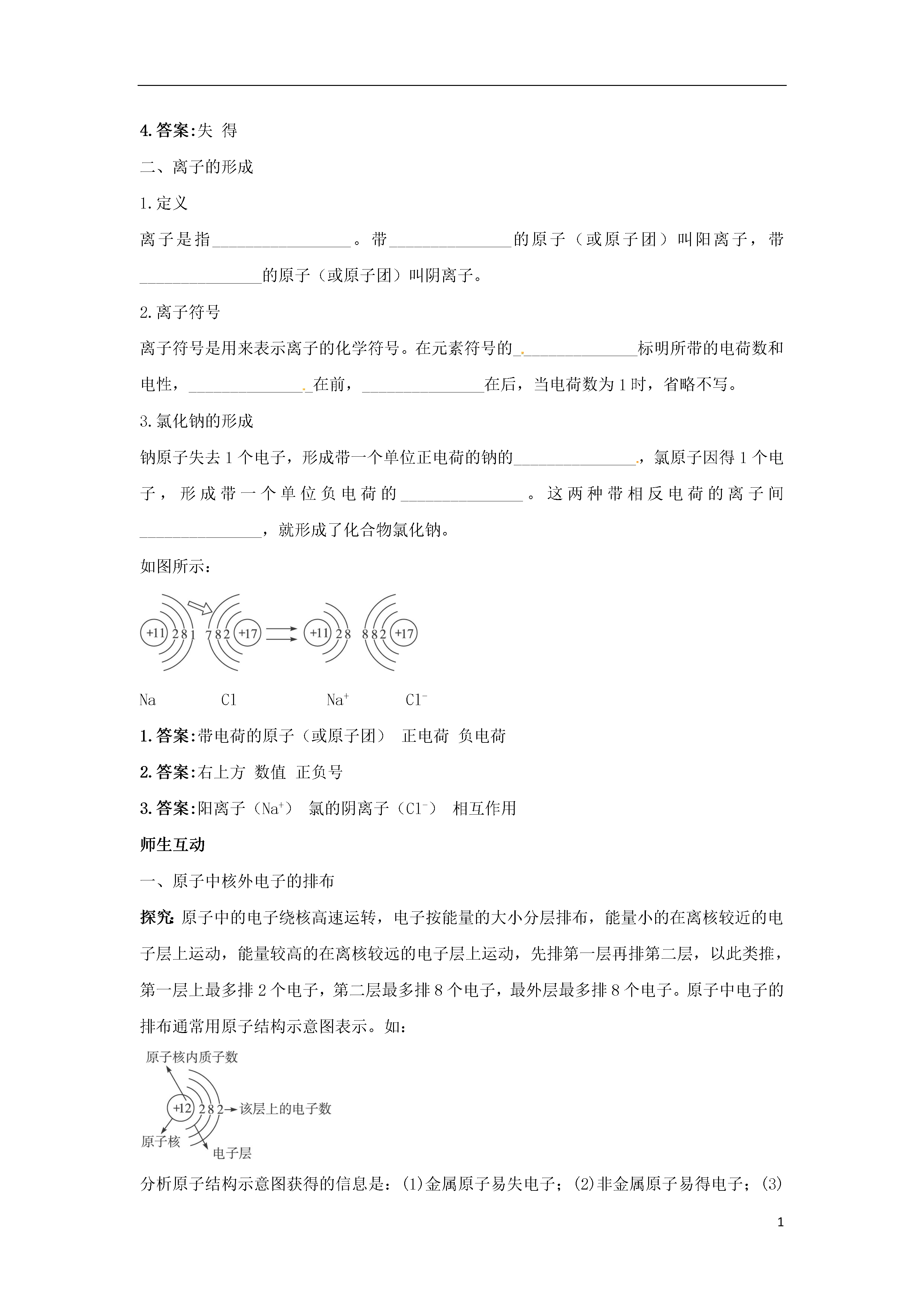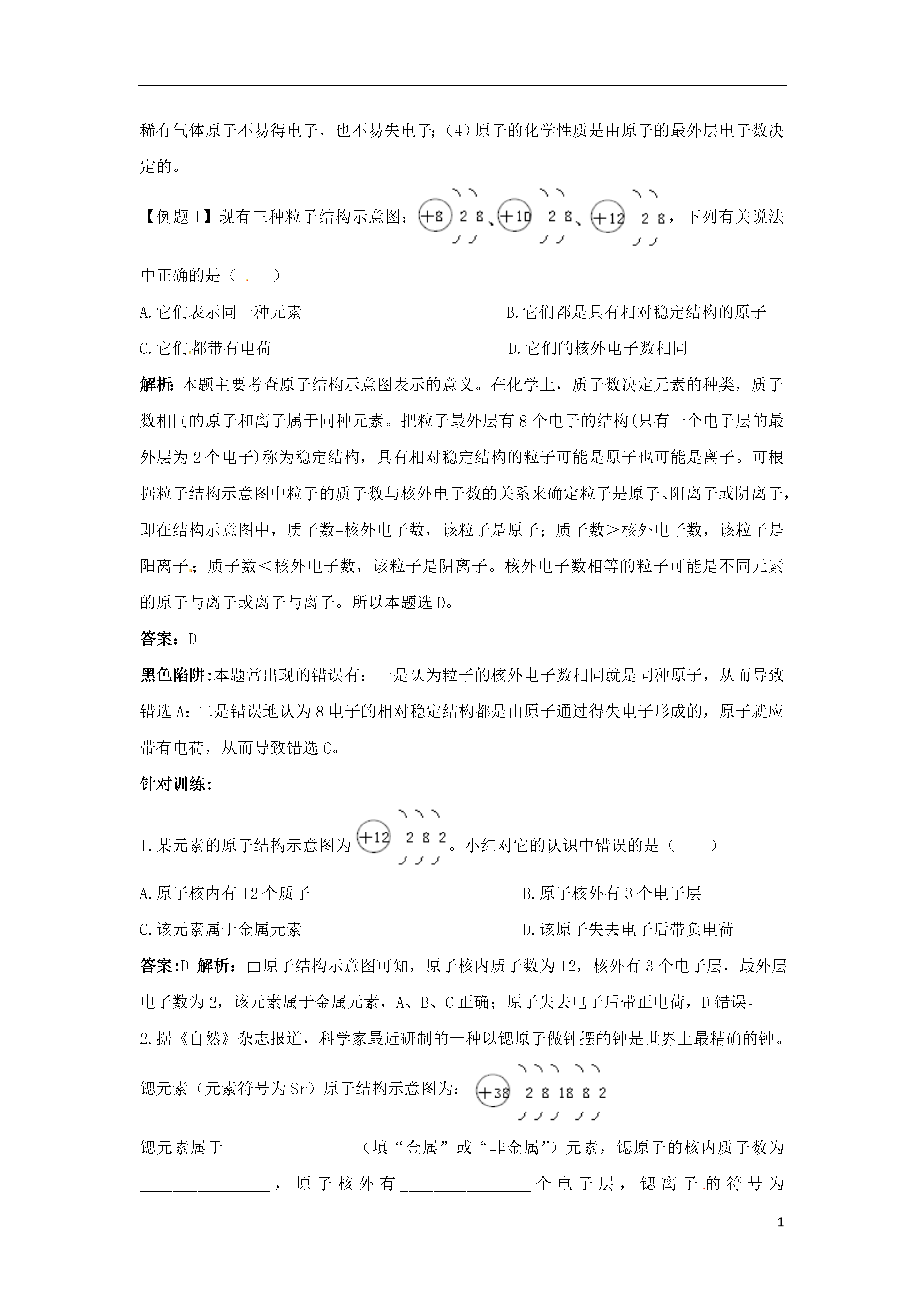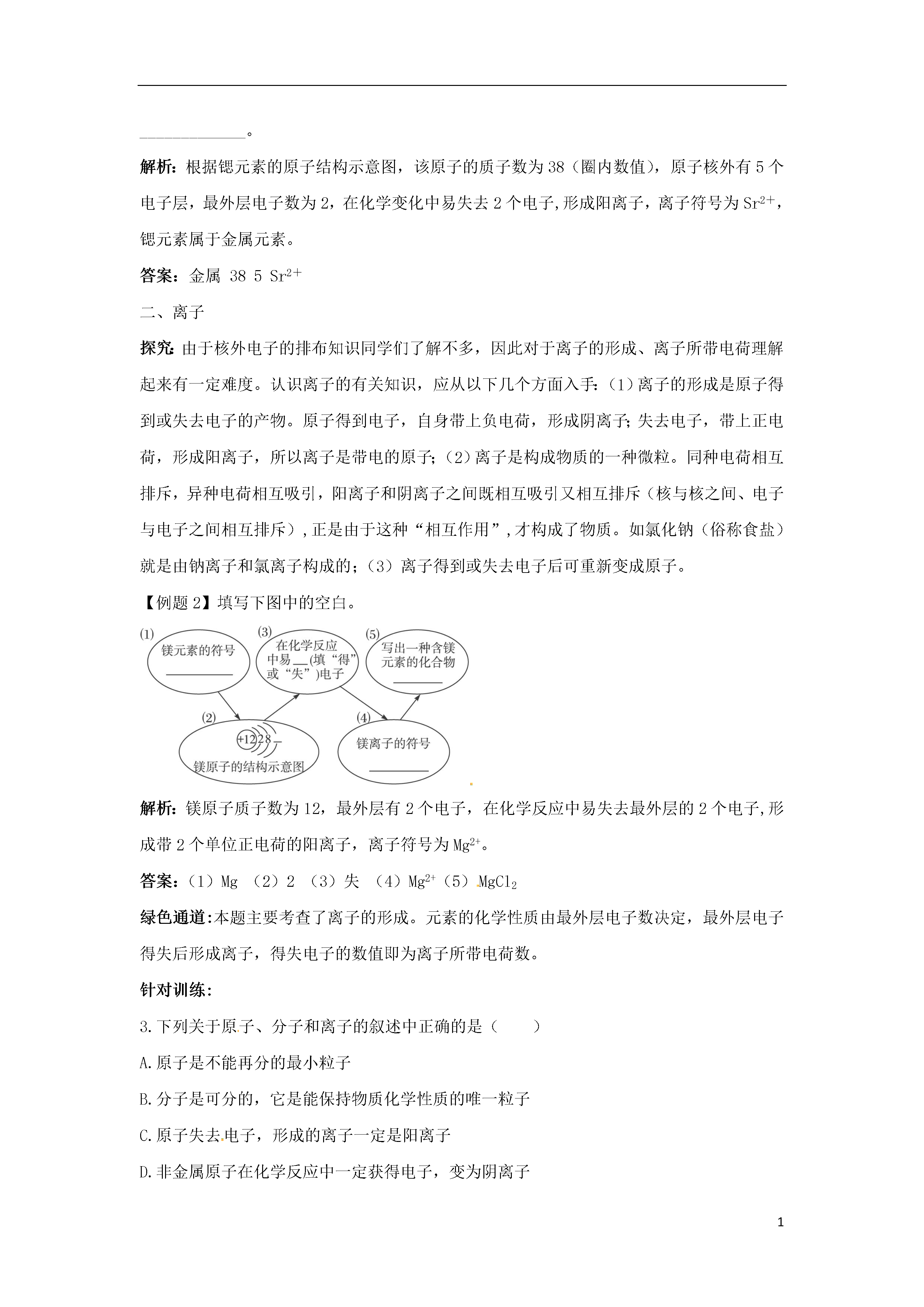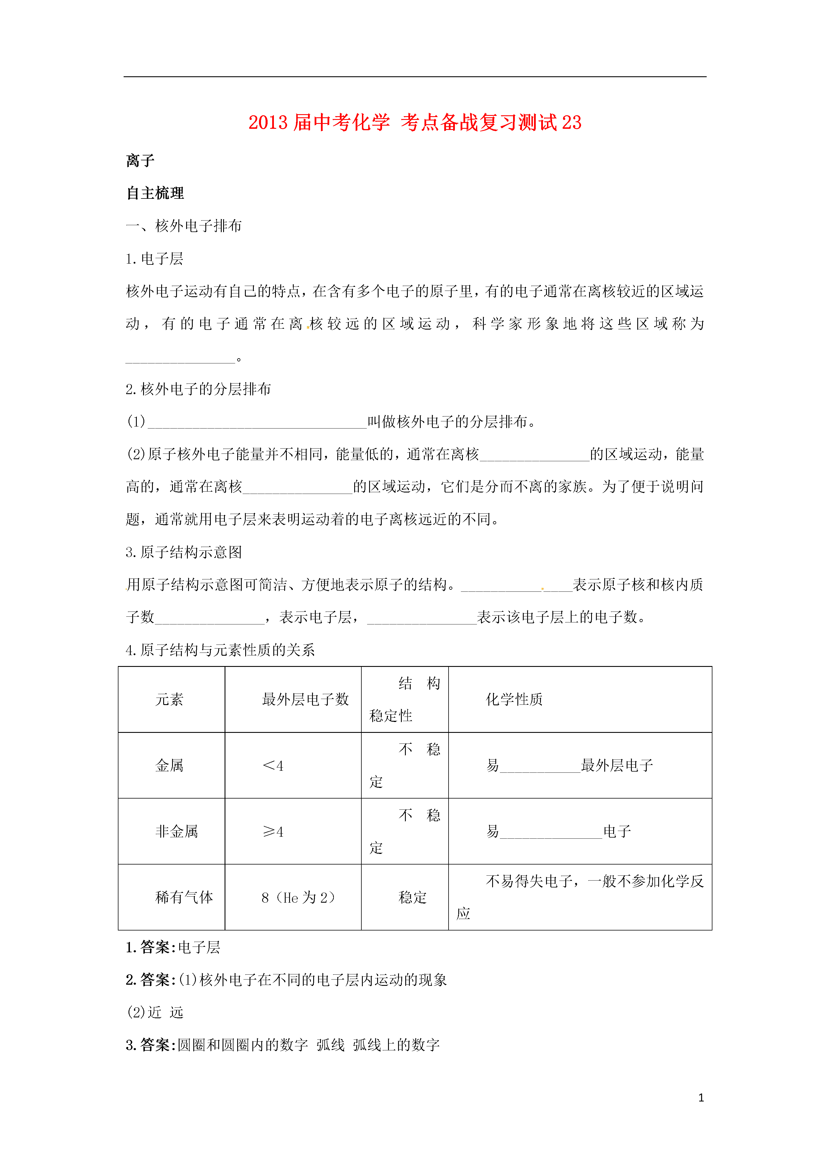 12013届中考化学考点备战复习测试23离子自主梳理一、核外电子排布1.电子层核外电子运动有自己的特点,在含有多个电子的原子里,有的电子通常在离核较近的区域运动,有的电子通常在离核较远的区域运动,科学家形象地将这些区域称为_______________。2.核外电子的分层排布(1)______________________________叫做核外电子的分层排布。(2)原子核外电子能量并不相同,能量低的,通常在离核_______________的区域运动,能量高的,通常在离核_______________的区域运动,它们是分而不离的家族。为了便于说明问题,通常就用电子层来表明运动着的电子离核远近的不同。3.原子结构示意图用原子结构示意图可简洁、方便地表示原子的结构。_______________表示原子核和核内质子数_______________,表示电子层,_______________表示该电子层上的电子数。4.原子结构与元素性质的关系元素最外层电子数结构稳定性化学性质金属<4不稳定易___________最外层电子非金属≥4不稳定易______________电子稀有气体8(He为2)稳定不易得失电子,一般不参加化学反应1.答案:电子层2.答案:(1)核外电子在不同的电子层内运动的现象(2)近远3.答案:圆圈和圆圈内的数字弧线弧线上的数字4.答案:失得二、离子的形成1.定义离子是指_________________。带_______________的原子(或原子团)叫阳离子,带_______________的原子(或原子团)叫阴离子。2.离子符号离子符号是用来表示离子的化学符号。在元素符号的_______________标明所带的电荷数和电性,_______________在前,_______________在后,当电荷数为1时,省略不写。3.氯化钠的形成钠原子失去1个电子,形成带一个单位正电荷的钠的_______________,氯原子因得1个电子,形成带一个单位负电荷的_______________。这两种带相反电荷的离子间_______________,就形成了化合物氯化钠。如图所示:NaClNa+Cl-1.答案:带电荷的原子(或原子团)正电荷负电荷2.答案:右上方数值正负号3.答案:阳离子(Na+)氯的阴离子(Cl-)相互作用师生互动一、原子中核外电子的排布探究:原子中的电子绕核高速运转,电子按能量的大小分层排布,能量小的在离核较近的电子层上运动,能量较高的在离核较远的电子层上运动,先排第一层再排第二层,以此类推,第一层上最多排2个电子,第二层最多排8个电子,最外层最多排8个电子。原子中电子的排布通常用原子结构示意图表示。如:分析原子结构示意图获得的信息是:(1)金属原子易失电子;(2)非金属原子易得电子;(3)稀有气体原子不易得电子,也不易失电子;(4)原子的化学性质是由原子的最外层电子数决定的。【例题1】现有三种粒子结构示意图:,下列有关说法中正确的是()A.它们表示同一种元素B.它们都是具有相对稳定结构的原子C.它们都带有电荷D.它们的核外电子数相同解析:本题主要考查原子结构示意图表示的意义。在化学上,质子数决定元素的种类,质子数相同的原子和离子属于同种元素。把粒子最外层有8个电子的结构(只有一个电子层的最外层为2个电子)称为稳定结构,具有相对稳定结构的粒子可能是原子也可能是离子。可根据粒子结构示意图中粒子的质子数与核外电子数的关系来确定粒子是原子、阳离子或阴离子,即在结构示意图中,质子数=核外电子数,该粒子是原子;质子数>核外电子数,该粒子是阳离子;质子数<核外电子数,该粒子是阴离子。核外电子数相等的粒子可能是不同元素的原子与离子或离子与离子。所以本题选D。答案:D黑色陷阱:本题常出现的错误有:一是认为粒子的核外电子数相同就是同种原子,从而导致错选A;二是错误地认为8电子的相对稳定结构都是由原子通过得失电子形成的,原子就应带有电荷,从而导致错选C。针对训练:1.某元素的原子结构示意图为。小红对它的认识中错误的是()A.原子核内有12个质子B.原子核外有3个电子层C.该元素属于金属元素D.该原子失去电子后带负电荷答案:D解析:由原子结构示意图可知,原子核内质子数为12,核外有3个电子层,最外层电子数为2,该元素属于金属元素,A、B、C正确;原子失去电子后带正电荷,D错误。2.据《自然》杂志报道,科学家最近研制的一种以锶原子做钟摆的钟是世界上最精确的钟。锶元素(元素符号为Sr)原子结构示意图为:锶元素属于________________(填“金属”或“非金属”)元素,锶原子的核内质子数为______