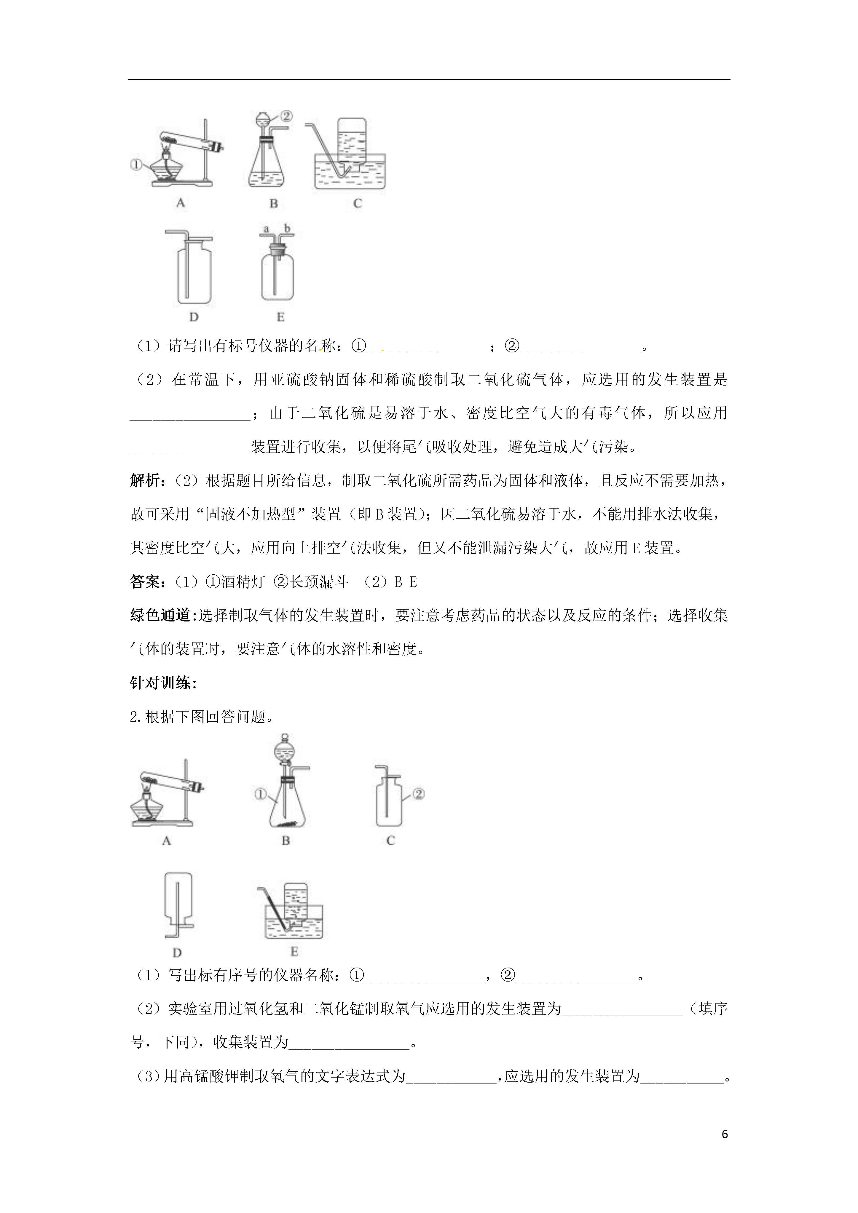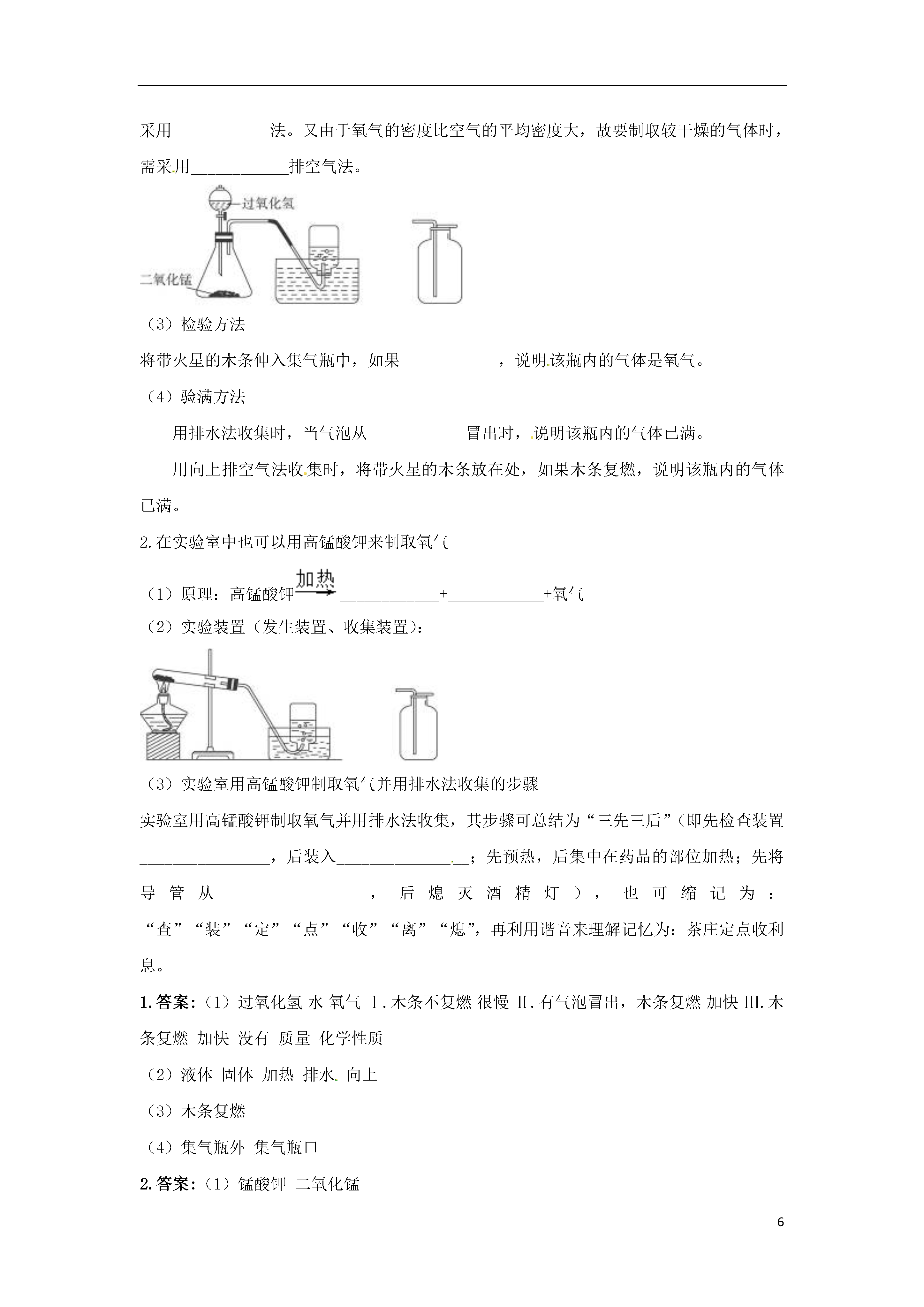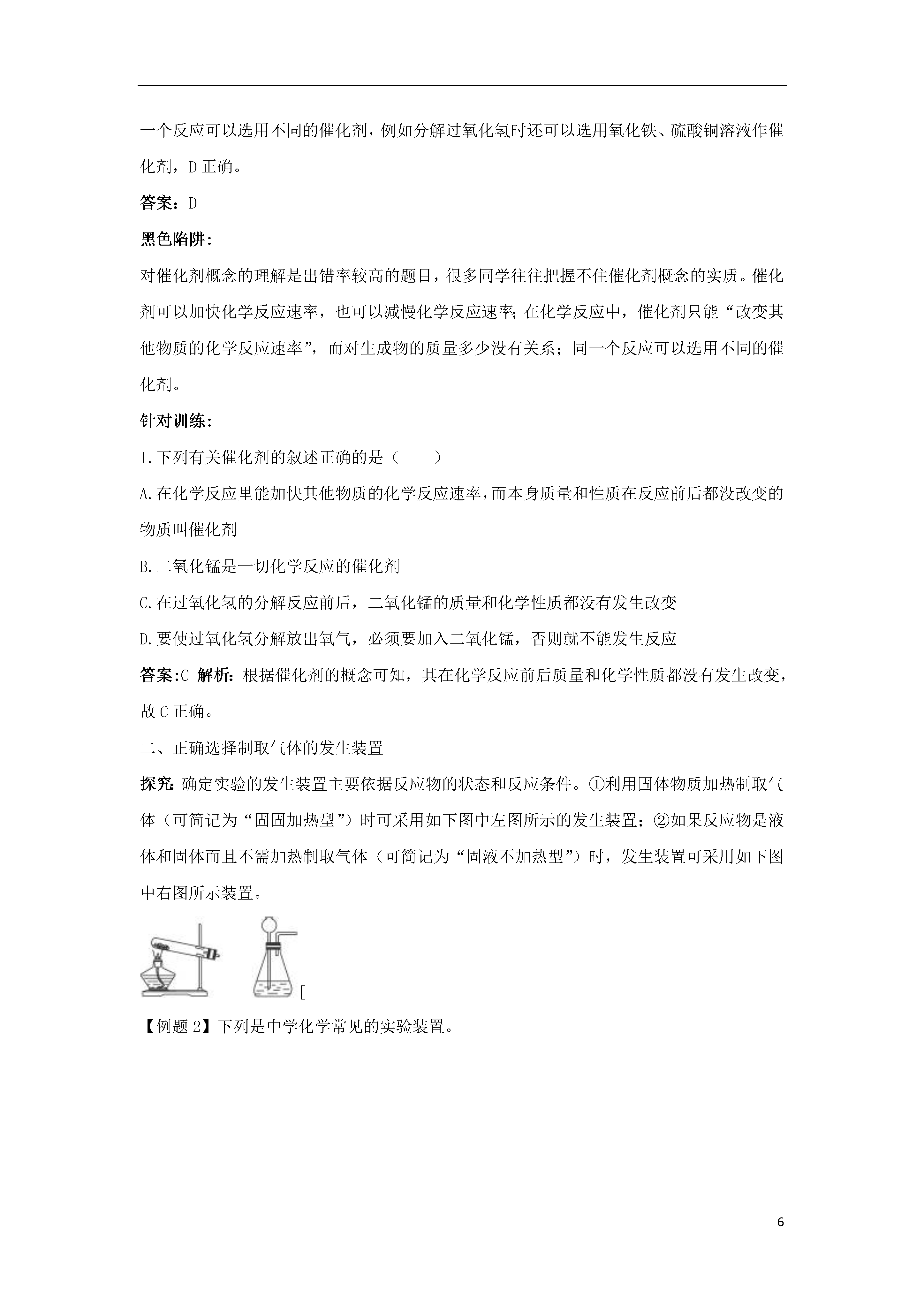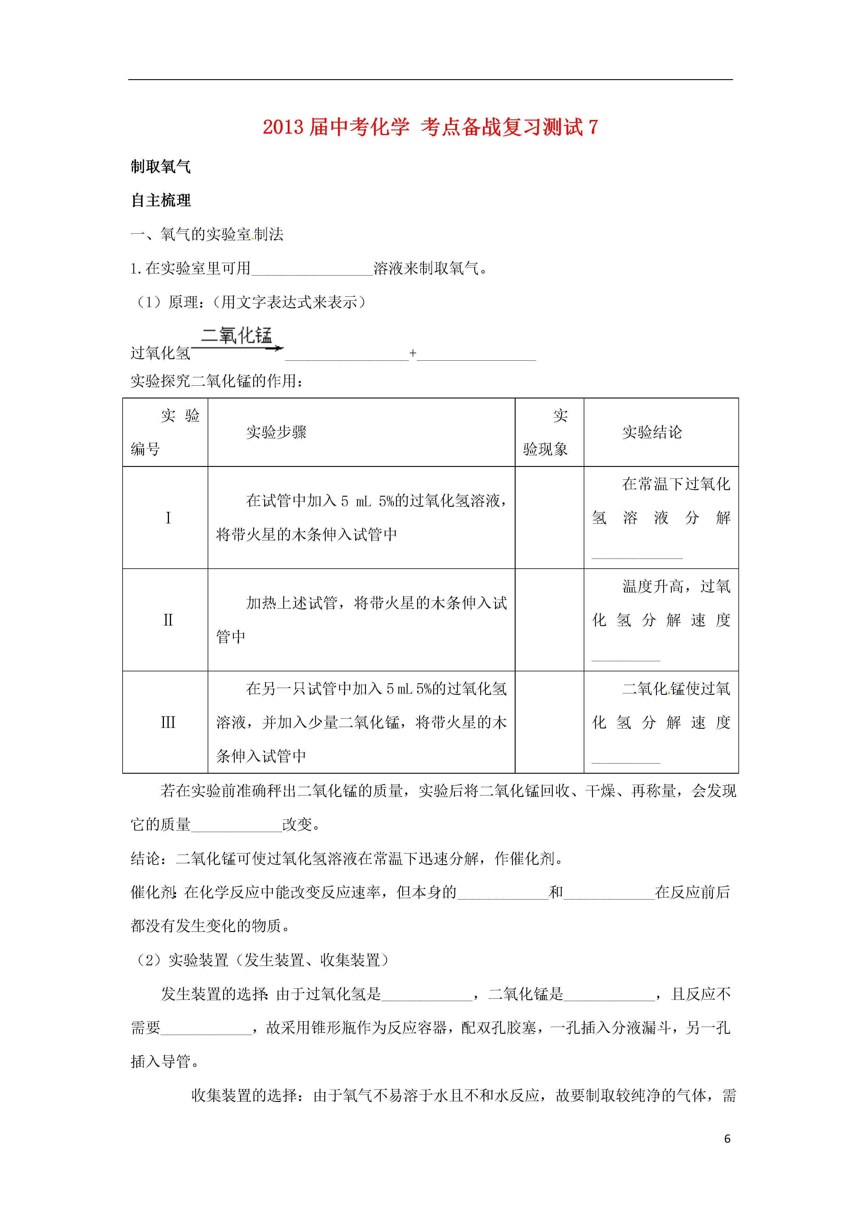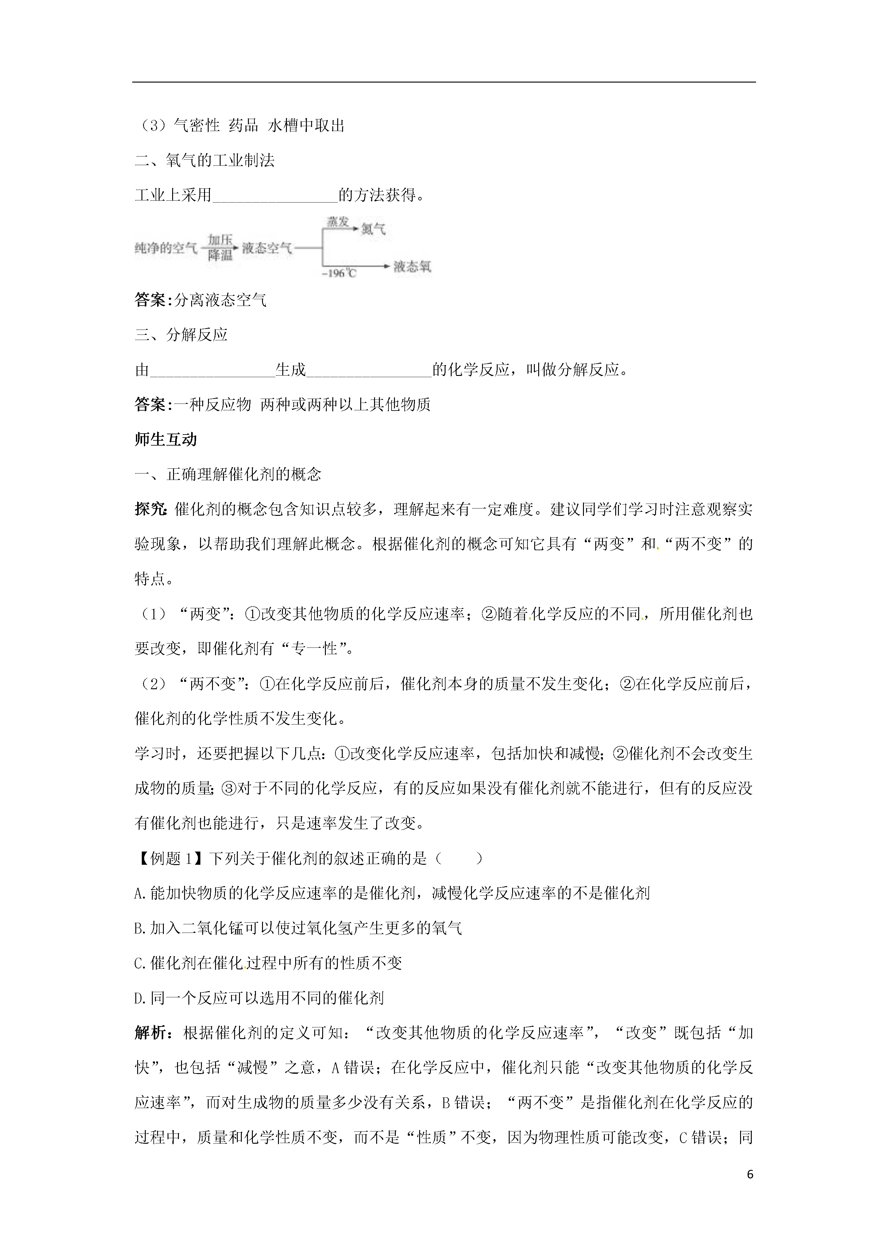 62013届中考化学考点备战复习测试7制取氧气自主梳理一、氧气的实验室制法1.在实验室里可用________________溶液来制取氧气。(1)原理:(用文字表达式来表示)过氧化氢________________+________________实验探究二氧化锰的作用:实验编号实验步骤实验现象实验结论Ⅰ在试管中加入5mL5%的过氧化氢溶液,将带火星的木条伸入试管中在常温下过氧化氢溶液分解____________Ⅱ加热上述试管,将带火星的木条伸入试管中温度升高,过氧化氢分解速度_________Ⅲ在另一只试管中加入5mL5%的过氧化氢溶液,并加入少量二氧化锰,将带火星的木条伸入试管中二氧化锰使过氧化氢分解速度_________若在实验前准确秤出二氧化锰的质量,实验后将二氧化锰回收、干燥、再称量,会发现它的质量____________改变。结论:二氧化锰可使过氧化氢溶液在常温下迅速分解,作催化剂。催化剂:在化学反应中能改变反应速率,但本身的____________和____________在反应前后都没有发生变化的物质。(2)实验装置(发生装置、收集装置)发生装置的选择:由于过氧化氢是____________,二氧化锰是____________,且反应不需要____________,故采用锥形瓶作为反应容器,配双孔胶塞,一孔插入分液漏斗,另一孔插入导管。收集装置的选择:由于氧气不易溶于水且不和水反应,故要制取较纯净的气体,需采用____________法。又由于氧气的密度比空气的平均密度大,故要制取较干燥的气体时,需采用____________排空气法。(3)检验方法将带火星的木条伸入集气瓶中,如果____________,说明该瓶内的气体是氧气。(4)验满方法用排水法收集时,当气泡从____________冒出时,说明该瓶内的气体已满。用向上排空气法收集时,将带火星的木条放在处,如果木条复燃,说明该瓶内的气体已满。2.在实验室中也可以用高锰酸钾来制取氧气(1)原理:高锰酸钾____________+____________+氧气(2)实验装置(发生装置、收集装置):(3)实验室用高锰酸钾制取氧气并用排水法收集的步骤实验室用高锰酸钾制取氧气并用排水法收集,其步骤可总结为“三先三后”(即先检查装置________________,后装入________________;先预热,后集中在药品的部位加热;先将导管从________________,后熄灭酒精灯),也可缩记为:“查”“装”“定”“点”“收”“离”“熄”,再利用谐音来理解记忆为:茶庄定点收利息。1.答案:(1)过氧化氢水氧气Ⅰ.木条不复燃很慢Ⅱ.有气泡冒出,木条复燃加快Ⅲ.木条复燃加快没有质量化学性质(2)液体固体加热排水向上(3)木条复燃(4)集气瓶外集气瓶口2.答案:(1)锰酸钾二氧化锰(3)气密性药品水槽中取出二、氧气的工业制法工业上采用________________的方法获得。答案:分离液态空气三、分解反应由________________生成________________的化学反应,叫做分解反应。答案:一种反应物两种或两种以上其他物质师生互动一、正确理解催化剂的概念探究:催化剂的概念包含知识点较多,理解起来有一定难度。建议同学们学习时注意观察实验现象,以帮助我们理解此概念。根据催化剂的概念可知它具有“两变”和“两不变”的特点。(1)“两变”:①改变其他物质的化学反应速率;②随着化学反应的不同,所用催化剂也要改变,即催化剂有“专一性”。(2)“两不变”:①在化学反应前后,催化剂本身的质量不发生变化;②在化学反应前后,催化剂的化学性质不发生变化。学习时,还要把握以下几点:①改变化学反应速率,包括加快和减慢;②催化剂不会改变生成物的质量;③对于不同的化学反应,有的反应如果没有催化剂就不能进行,但有的反应没有催化剂也能进行,只是速率发生了改变。【例题1】下列关于催化剂的叙述正确的是()A.能加快物质的化学反应速率的是催化剂,减慢化学反应速率的不是催化剂B.加入二氧化锰可以使过氧化氢产生更多的氧气C.催化剂在催化过程中所有的性质不变D.同一个反应可以选用不同的催化剂解析:根据催化剂的定义可知:“改变其他物质的化学反应速率”,“改变”既包括“加快”,也包括“减慢”之意,A错误;在化学反应中,催化剂只能“改变其他物质的化学反应速率”,而对生成物的质量多少没有关系,B错误;“两不变”是指催化剂在化学反应的过程中,质量和化学性质不变,而不是“性质”不变,因为物理性质可能改变,C错误;同一个反应可以选用不同的催化剂,例如分解过氧化氢时还可以选用氧化铁、硫酸铜溶液作
