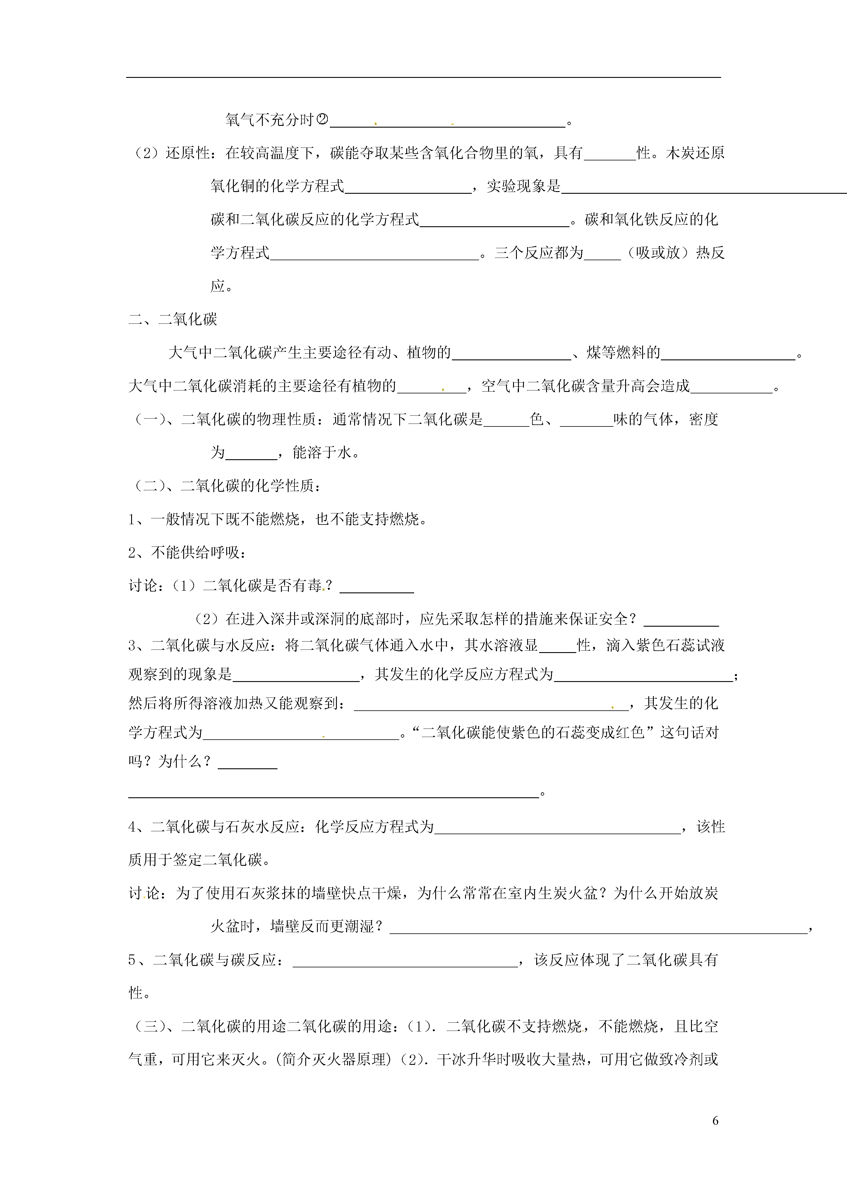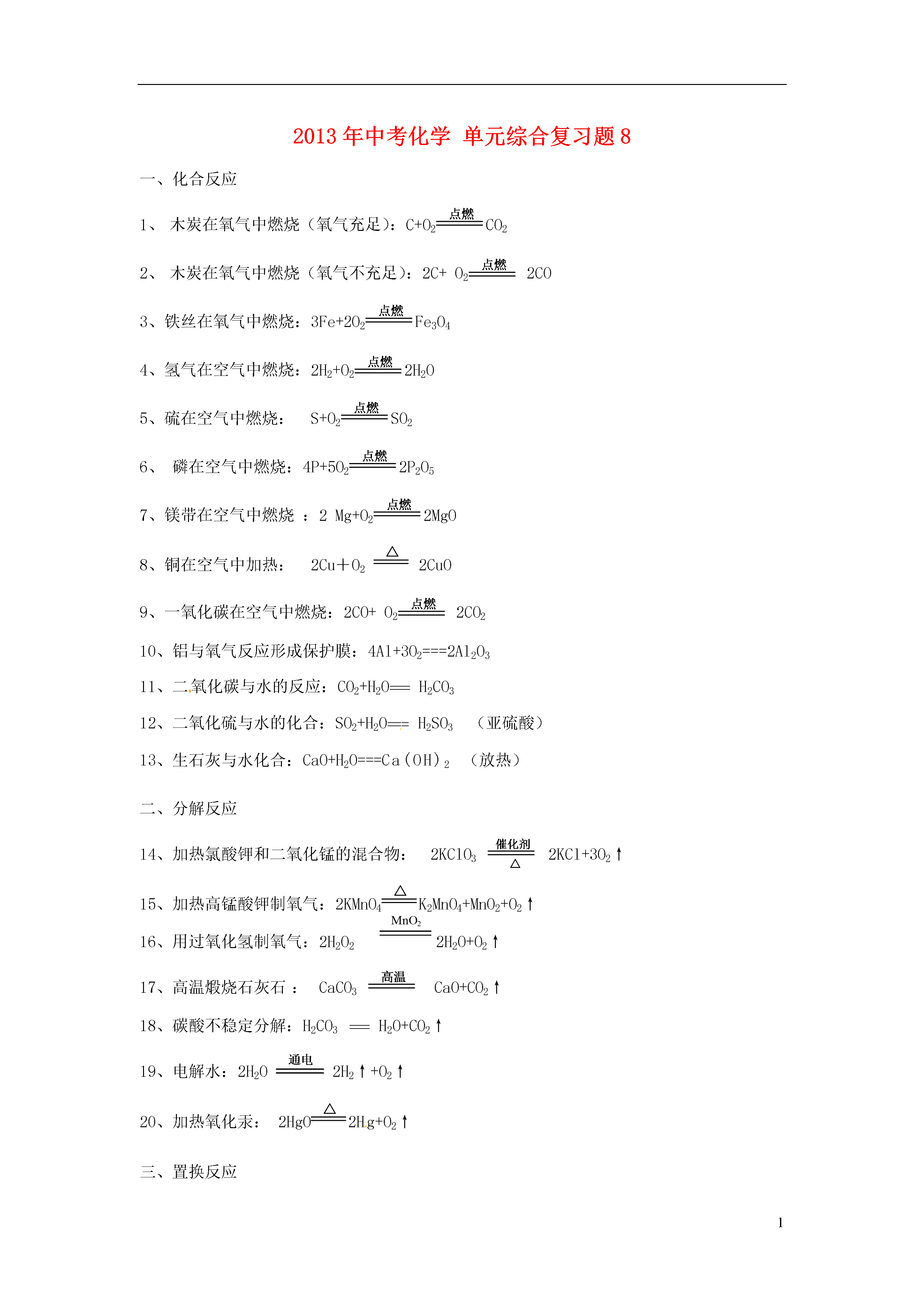 12013年中考化学单元综合复习题1第一单元走进化学世界物质的变化和性质化学实验基本操作知识要点化学研究史化学是研究物质的、、和的一门自然科学。自从人类发现了和利用,便极大地改善了生存条件。我国古代发明中,烧瓷、制火药、造纸等都与化学有关。近代科学家道尔顿和阿伏加德罗提出了原子—分子论,奠定了近代化学的基础。俄国化学家于1869年发现了元素周期律。“”的提出,使更多的化学生产工艺和产品向着环境友好的方向发展。物理变化与化学变化的区别和联系物理变化化学变化概念没有生成物质的变化变化时生成了物质的变化本质区别宏观:没有其它物质生成。微观:构成物质的分子不变,只有分子间隔可能改变。宏观:有其它物质生成微观:构成物质的分子发生了变化,变成了另一种物质的粒子。外观特征状态、形状、大小的改变。生成其他物质常表现为、、;而且还伴随着能量的变化,这种能量变化常表现为、、。区分依据联系物质的性质物理性质化学性质概念就表现出来的性质表现出来的性质内容物质的、、、、、、、溶解性、挥发性、导电性、导热性、延展性等。物质的稳定性、氧化性、可燃性、还原性、酸性、碱性、脱水性、腐蚀性、毒性等。〈练习〉阅读下面短文,用物理变化、化学变化、物理性质、化学性质四个概念填空。硫是一种淡黄色固体(属),把块状的硫粉研碎(属),取少量放入燃烧匙内,将燃烧匙加热,硫熔化成淡黄色液体(属),继续加热,硫在空气中燃烧(属),说明硫具有可燃烧性(属)。化学实验基本操作(一)药品的取用原则:不能用接触药品;不要把凑到容器口去闻气体气味;不得任何药品的味道。用量:严格按实验规定用量;未指明用量,取用最少量:固体只需液体取mL。块状固体或密度较大的金属颗粒:用操作(一横二放三慢立)。固体:粉未状固体:用或操作(一斜二送三慢立)。方法较多量:倾到(放瓶塞,标签向,瓶口紧挨。)液体:较少量:胶头滴管吸取极少量:用玻璃棒蘸取一定量药品的取用:固体用托盘天平。液体用量筒及滴管。常见意外事故的处理方法洒在桌面的酒精燃烧用湿抹布盖灭酸液洒在皮肤上立即用大量的水冲洗,然后涂上3%—5%的碳酸氢钠溶液碱液洒在皮肤上立即用大量的水冲洗,然后涂上硼酸溶液酸或碱液溅入眼中不能揉眼睛,应立即用大量的水冲洗,然后及时就诊。剩余药品的处理:要放入指定容器不能放回;不能随意丢弃;不能拿出实验室。(二)药品的存放固体:瓶;液体:瓶;气体:瓶。遇光受热易分解的药品用棕色瓶盛装,盛碱液的试剂瓶不能用玻璃瓶塞。白磷存放在水中,钠存放在煤油中。易燃物、易爆物要远离火源。浓硫酸、浓盐酸、浓硝酸、氢氧化钠、氢氧化钙、碳酸氢铵及某些结晶水合物,需密封保存。(三)物质加热常用的热源:酒精灯,其火焰由、、三部分构成。使用时:二检查:即①检查灯芯顶端是否不平或已烧焦;②检查酒精灯内酒精量。二禁止:即①禁止拿酒精灯对点;②禁止向燃着的酒精灯内添加酒精。二要用:即①点燃时要用;②熄灭时要用。2、仪器:固体:干燥的、坩埚。液体:试管、烧杯、烧瓶、蒸发皿。3、仪器固定:试管用、。烧杯和烧瓶用带铁圈的铁架台和石棉网、三角架和石棉网。蒸发皿用三角架。4、注意事项:①用外焰加热,不能与灯芯接触。②均匀受热(可移动或移动)③加热盛药品部位,液体加热其中下部。④固体加热时,试管口略向倾斜,液体加热时,试管与桌面成度角,试管口不能对着自已或。⑤试管内的液体不超过试管容积积的。⑥试管外壁不能有。⑦加热完毕不能立刻用冷水冲洗。(四)仪器的装配及气密性检查仪器装配的顺序:从下到上,从左到右(拆卸向反)装配方法:①玻璃管插入橡皮塞:沾水润湿,转动插入。②连接玻璃管和橡皮管:管口平圆,沾水润滑。③在容器口塞橡皮塞:双手平拿,旋转塞紧。④在铁架台上固定仪器:高低适宜,方向正确。气密性检查:步骤(1)、连接好仪器;(2)、;(3)、。判断:若导气管口有气泡冒出则不漏气。移开手,会在导管内形成一段水柱。检查实验室制二氧化碳装置的气密性时,因长颈漏斗与外界相通,可先通过长颈漏斗向广口瓶内注入少量水,使长颈漏斗下端浸没在液面以下,形成“液封”,然后检查装置的气密性。(五)溶解、过滤、蒸发溶解:(1)仪器、。(2)方法:①常用粉碎、搅拌、振荡、加热等方法,加速溶解。②振荡试管内液体时,做到腕动臂不动。搅拌时,不可碰撞烧杯壁,以免打破烧杯。③稀释浓硫酸时只能把沿慢慢注入盛有的烧杯中,并用玻璃棒不断,使产生的热量迅速。过滤:(1)仪器、、、。(2)操作要点:一贴:制作过滤器,滤纸紧贴在。二低:漏斗内滤纸边缘略低于;漏斗内液面略低于。三靠:①倾倒液体的烧杯口靠在玻璃棒。②玻璃棒未端靠在漏斗内三层滤纸的一边。③漏斗最下端靠在承接烧杯内壁。蒸发:(