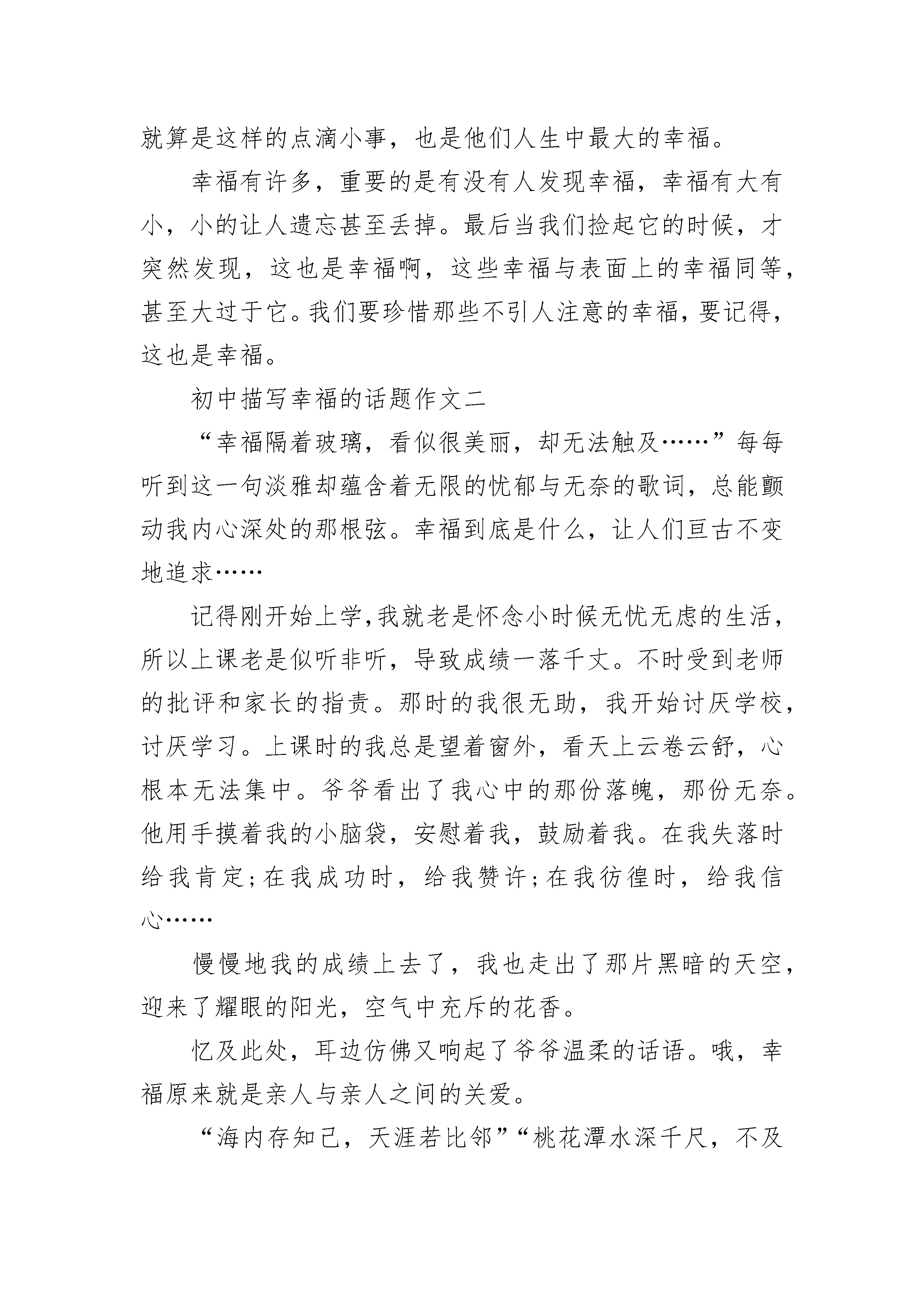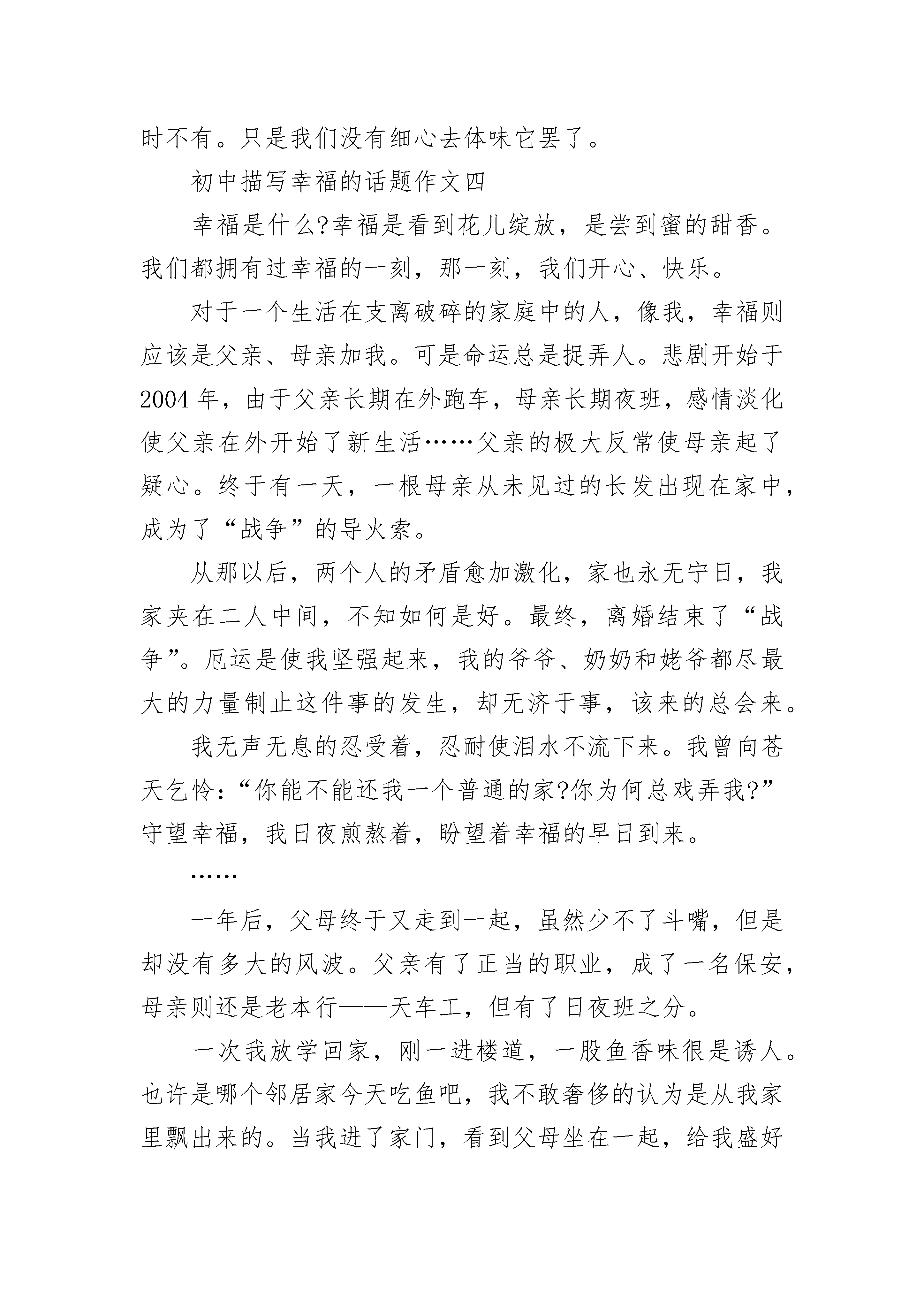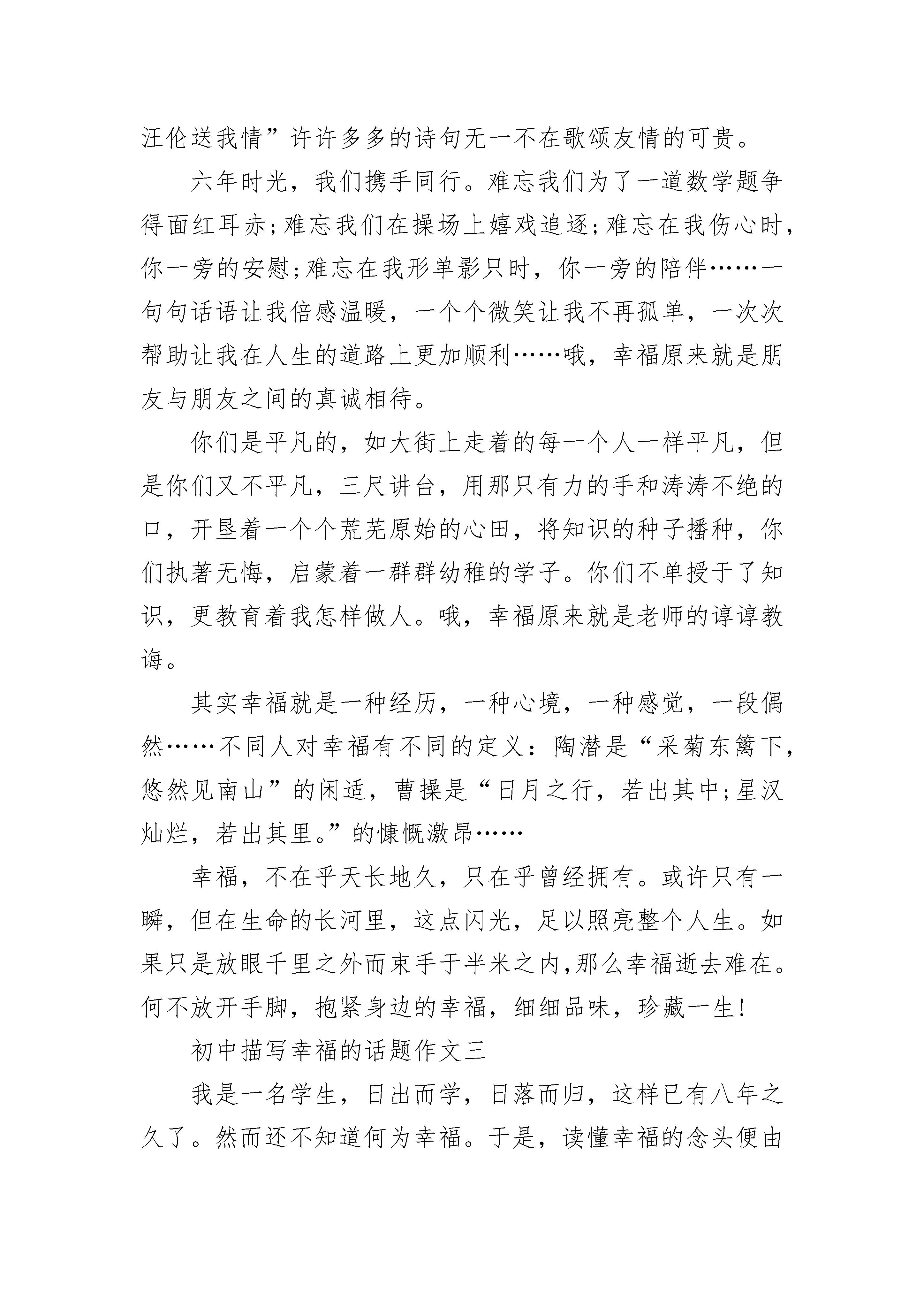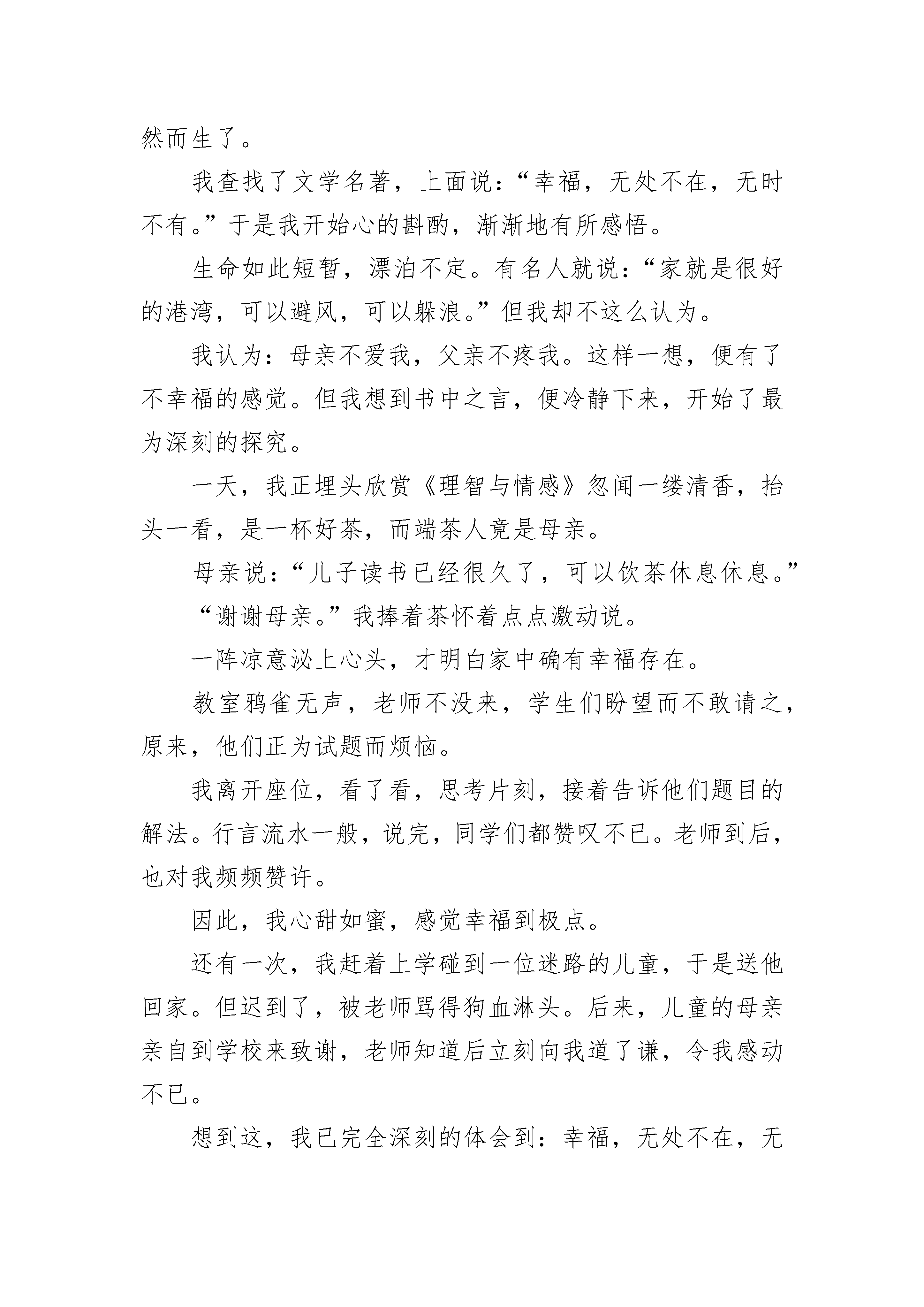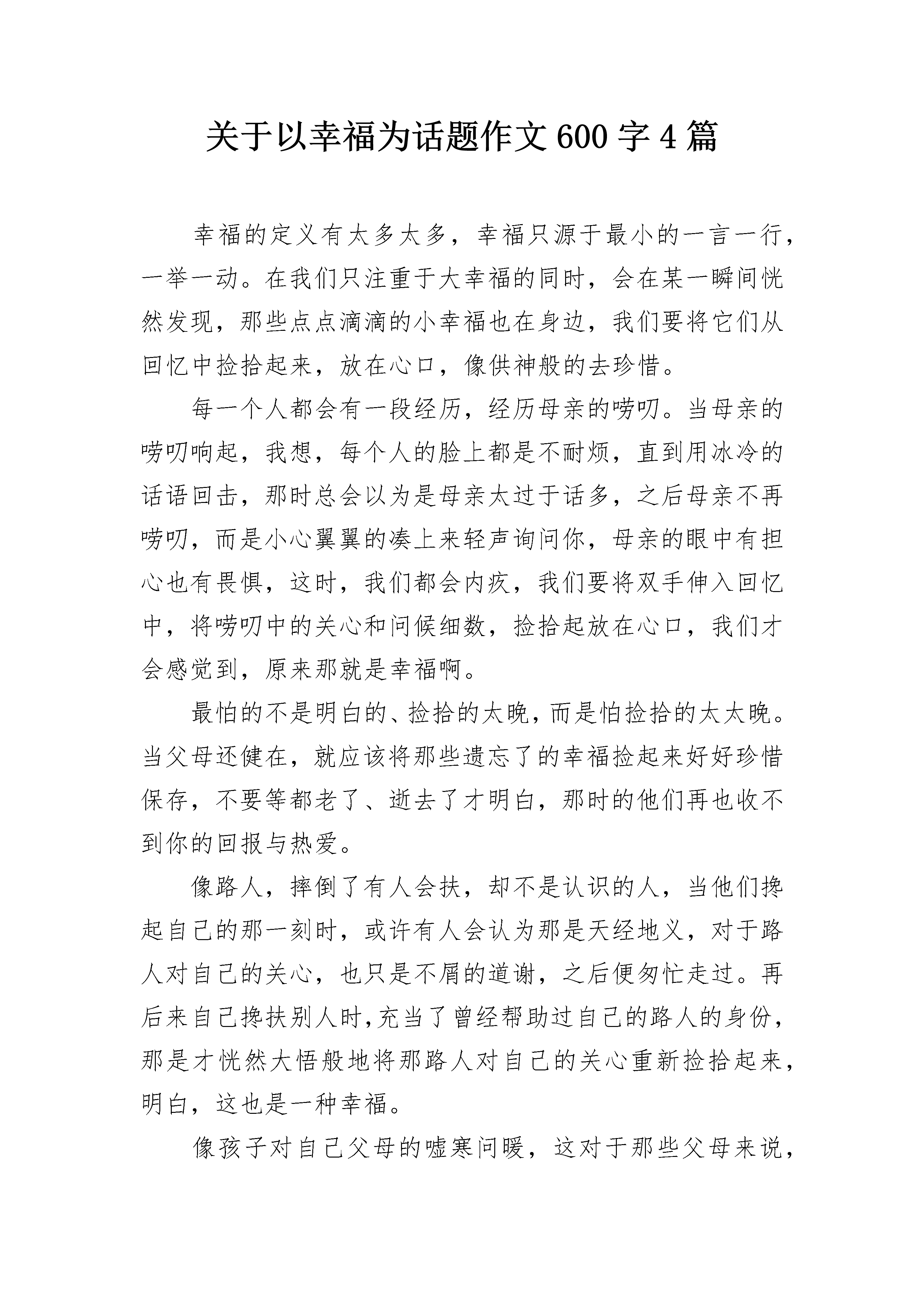 关于以幸福为话题作文600字4篇幸福的定义有太多太多,幸福只源于最小的一言一行,一举一动。在我们只注重于大幸福的同时,会在某一瞬间恍然发现,那些点点滴滴的小幸福也在身边,我们要将它们从回忆中捡拾起来,放在心口,像供神般的去珍惜。每一个人都会有一段经历,经历母亲的唠叨。当母亲的唠叨响起,我想,每个人的脸上都是不耐烦,直到用冰冷的话语回击,那时总会以为是母亲太过于话多,之后母亲不再唠叨,而是小心翼翼的凑上来轻声询问你,母亲的眼中有担心也有畏惧,这时,我们都会内疚,我们要将双手伸入回忆中,将唠叨中的关心和问候细数,捡拾起放在心口,我们才会感觉到,原来那就是幸福啊。最怕的不是明白的、捡拾的太晚,而是怕捡拾的太太晚。当父母还健在,就应该将那些遗忘了的幸福捡起来好好珍惜保存,不要等都老了、逝去了才明白,那时的他们再也收不到你的回报与热爱。像路人,摔倒了有人会扶,却不是认识的人,当他们搀起自己的那一刻时,或许有人会认为那是天经地义,对于路人对自己的关心,也只是不屑的道谢,之后便匆忙走过。再后来自己搀扶别人时,充当了曾经帮助过自己的路人的身份,那是才恍然大悟般地将那路人对自己的关心重新捡拾起来,明白,这也是一种幸福。像孩子对自己父母的嘘寒问暖,这对于那些父母来说,就算是这样的点滴小事,也是他们人生中最大的幸福。幸福有许多,重要的是有没有人发现幸福,幸福有大有小,小的让人遗忘甚至丢掉。最后当我们捡起它的时候,才突然发现,这也是幸福啊,这些幸福与表面上的幸福同等,甚至大过于它。我们要珍惜那些不引人注意的幸福,要记得,这也是幸福。初中描写幸福的话题作文二“幸福隔着玻璃,看似很美丽,却无法触及……”每每听到这一句淡雅却蕴含着无限的忧郁与无奈的歌词,总能颤动我内心深处的那根弦。幸福到底是什么,让人们亘古不变地追求……记得刚开始上学,我就老是怀念小时候无忧无虑的生活,所以上课老是似听非听,导致成绩一落千丈。不时受到老师的批评和家长的指责。那时的我很无助,我开始讨厌学校,讨厌学习。上课时的我总是望着窗外,看天上云卷云舒,心根本无法集中。爷爷看出了我心中的那份落魄,那份无奈。他用手摸着我的小脑袋,安慰着我,鼓励着我。在我失落时给我肯定;在我成功时,给我赞许;在我彷徨时,给我信心……慢慢地我的成绩上去了,我也走出了那片黑暗的天空,迎来了耀眼的阳光,空气中充斥的花香。忆及此处,耳边仿佛又响起了爷爷温柔的话语。哦,幸福原来就是亲人与亲人之间的关爱。“海内存知己,天涯若比邻”“桃花潭水深千尺,不及汪伦送我情”许许多多的诗句无一不在歌颂友情的可贵。六年时光,我们携手同行。难忘我们为了一道数学题争得面红耳赤;难忘我们在操场上嬉戏追逐;难忘在我伤心时,你一旁的安慰;难忘在我形单影只时,你一旁的陪伴……一句句话语让我倍感温暖,一个个微笑让我不再孤单,一次次帮助让我在人生的道路上更加顺利……哦,幸福原来就是朋友与朋友之间的真诚相待。你们是平凡的,如大街上走着的每一个人一样平凡,但是你们又不平凡,三尺讲台,用那只有力的手和涛涛不绝的口,开垦着一个个荒芜原始的心田,将知识的种子播种,你们执著无悔,启蒙着一群群幼稚的学子。你们不单授于了知识,更教育着我怎样做人。哦,幸福原来就是老师的谆谆教诲。其实幸福就是一种经历,一种心境,一种感觉,一段偶然……不同人对幸福有不同的定义:陶潜是“采菊东篱下,悠然见南山”的闲适,曹操是“日月之行,若出其中;星汉灿烂,若出其里。”的慷慨激昂……幸福,不在乎天长地久,只在乎曾经拥有。或许只有一瞬,但在生命的长河里,这点闪光,足以照亮整个人生。如果只是放眼千里之外而束手于半米之内,那么幸福逝去难在。何不放开手脚,抱紧身边的幸福,细细品味,珍藏一生!初中描写幸福的话题作文三我是一名学生,日出而学,日落而归,这样已有八年之久了。然而还不知道何为幸福。于是,读懂幸福的念头便由然而生了。我查找了文学名著,上面说:“幸福,无处不在,无时不有。”于是我开始心的斟酌,渐渐地有所感悟。生命如此短暂,漂泊不定。有名人就说:“家就是很好的港湾,可以避风,可以躲浪。”但我却不这么认为。我认为:母亲不爱我,父亲不疼我。这样一想,便有了不幸福的感觉。但我想到书中之言,便冷静下来,开始了最为深刻的探究。一天,我正埋头欣赏《理智与情感》忽闻一缕清香,抬头一看,是一杯好茶,而端茶人竟是母亲。母亲说:“儿子读书已经很久了,可以饮茶休息休息。”“谢谢母亲。”我捧着茶怀着点点激动说。一阵凉意泌上心头,才明白家中确有幸福存在。教室鸦雀无声,老师不没来,学生们盼望而不敢请之,原来,他们正为试题而烦恼。我离开座位,看了看,思考片刻,接着告诉他们题目的解法。行言流水一般,说完,同学们都赞叹不已。老师到后,也对我频频赞许。因此,我心甜如蜜,感觉幸福到极点。还有一次,我赶着上学碰到一位迷路的儿童,于是