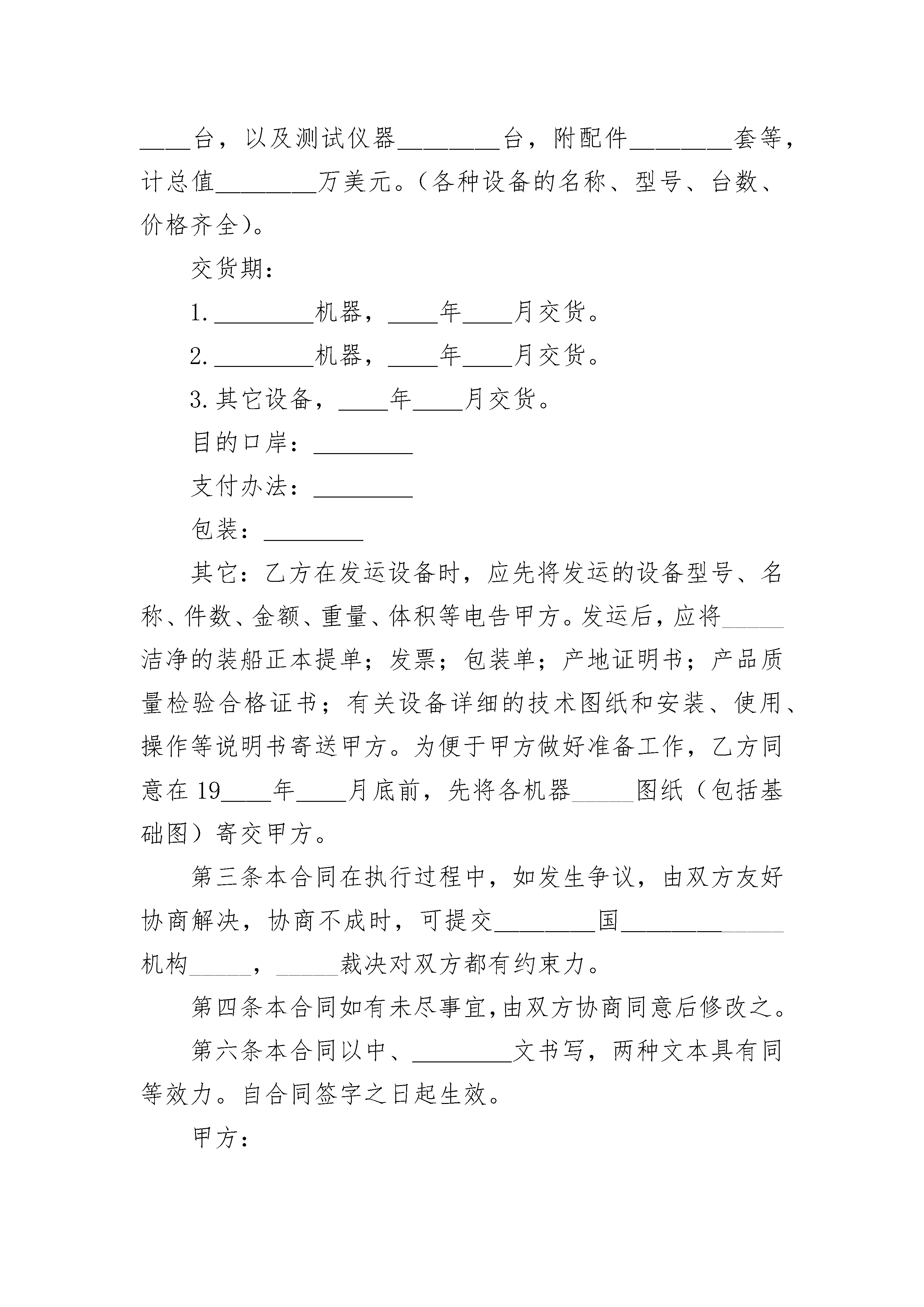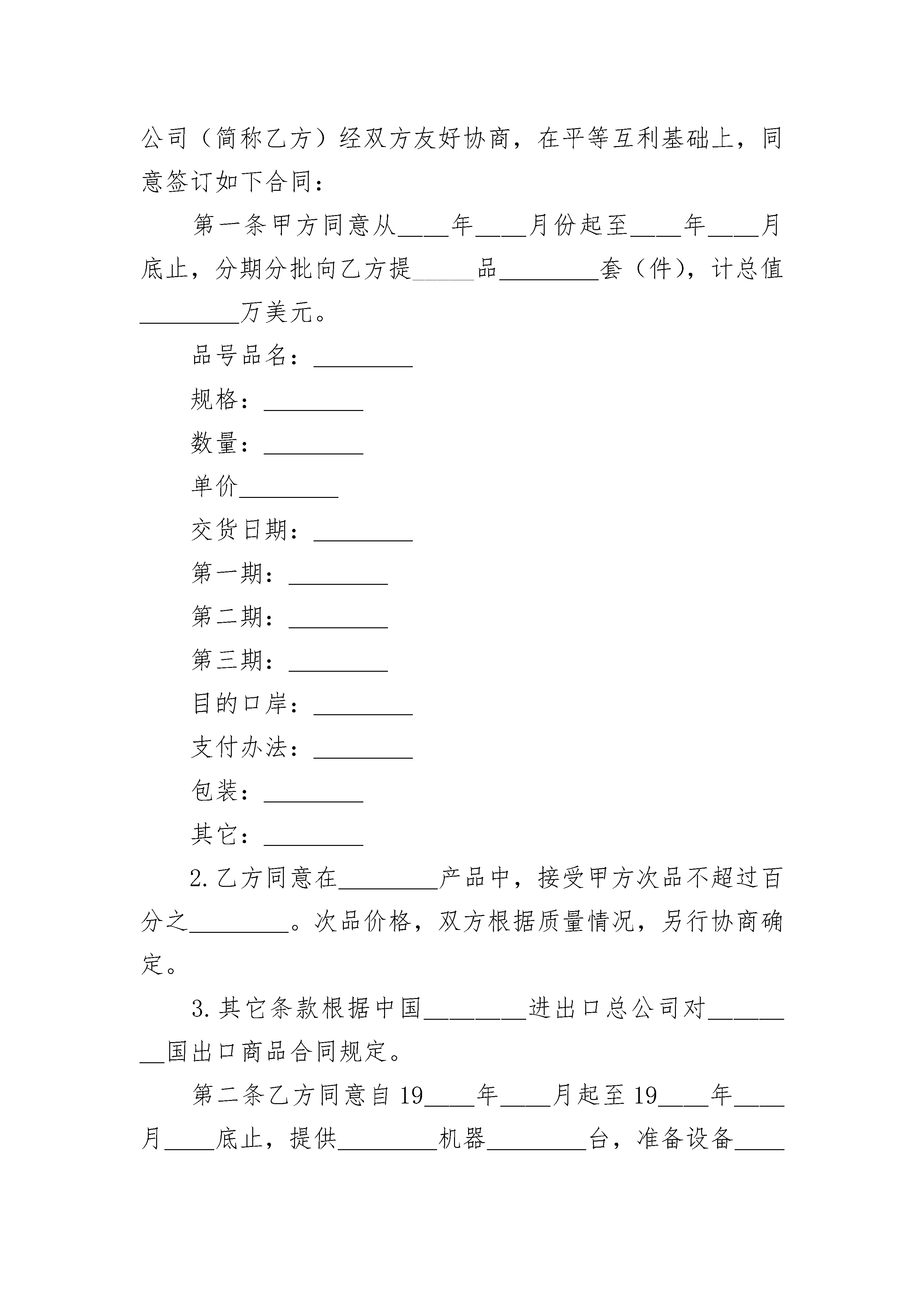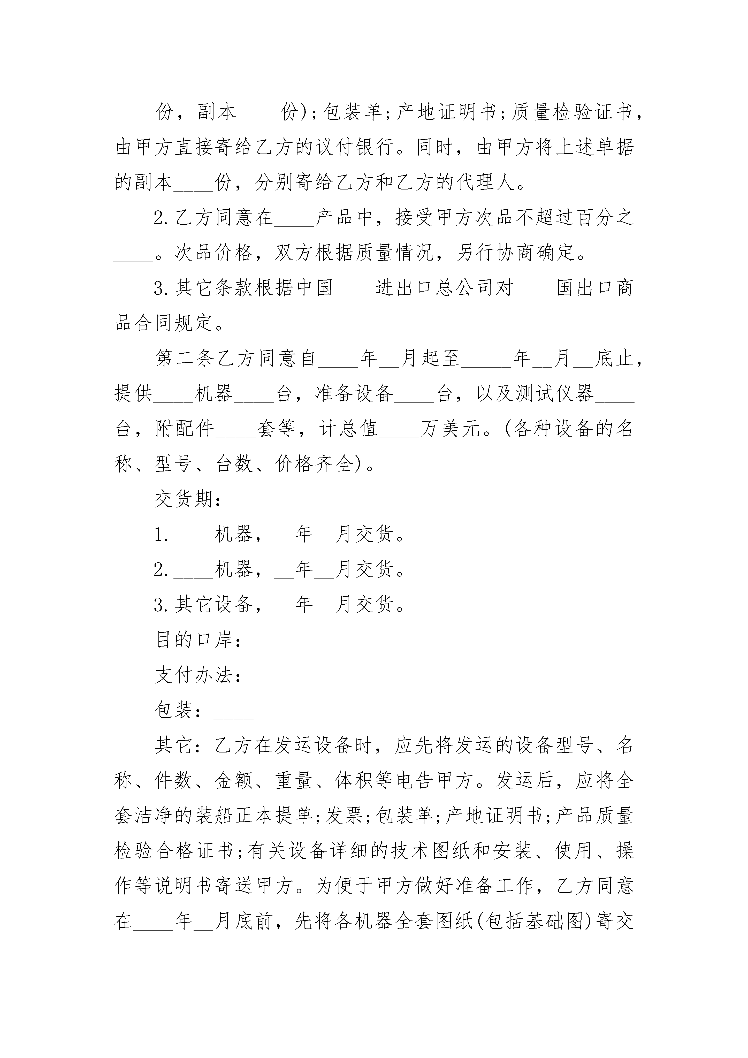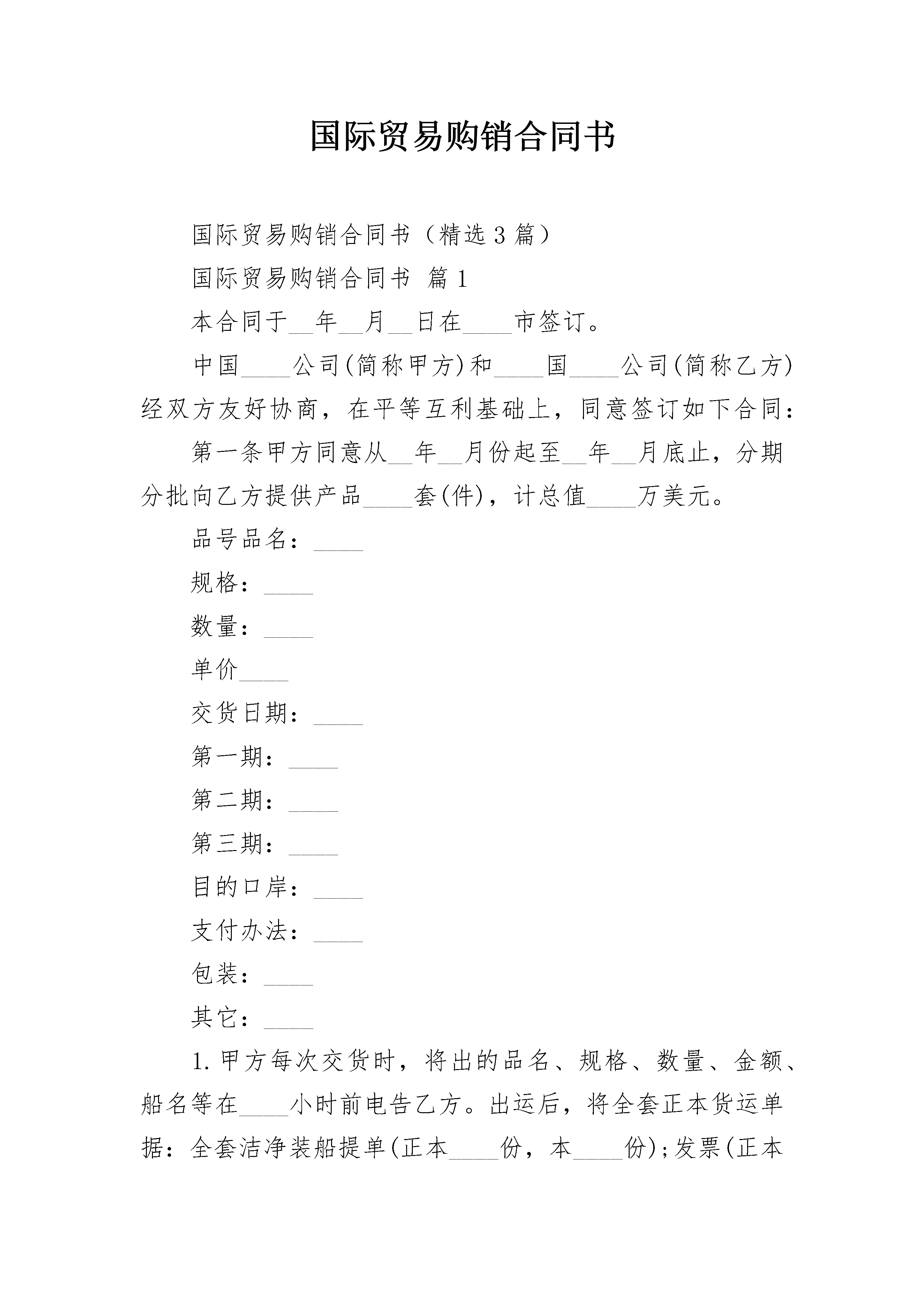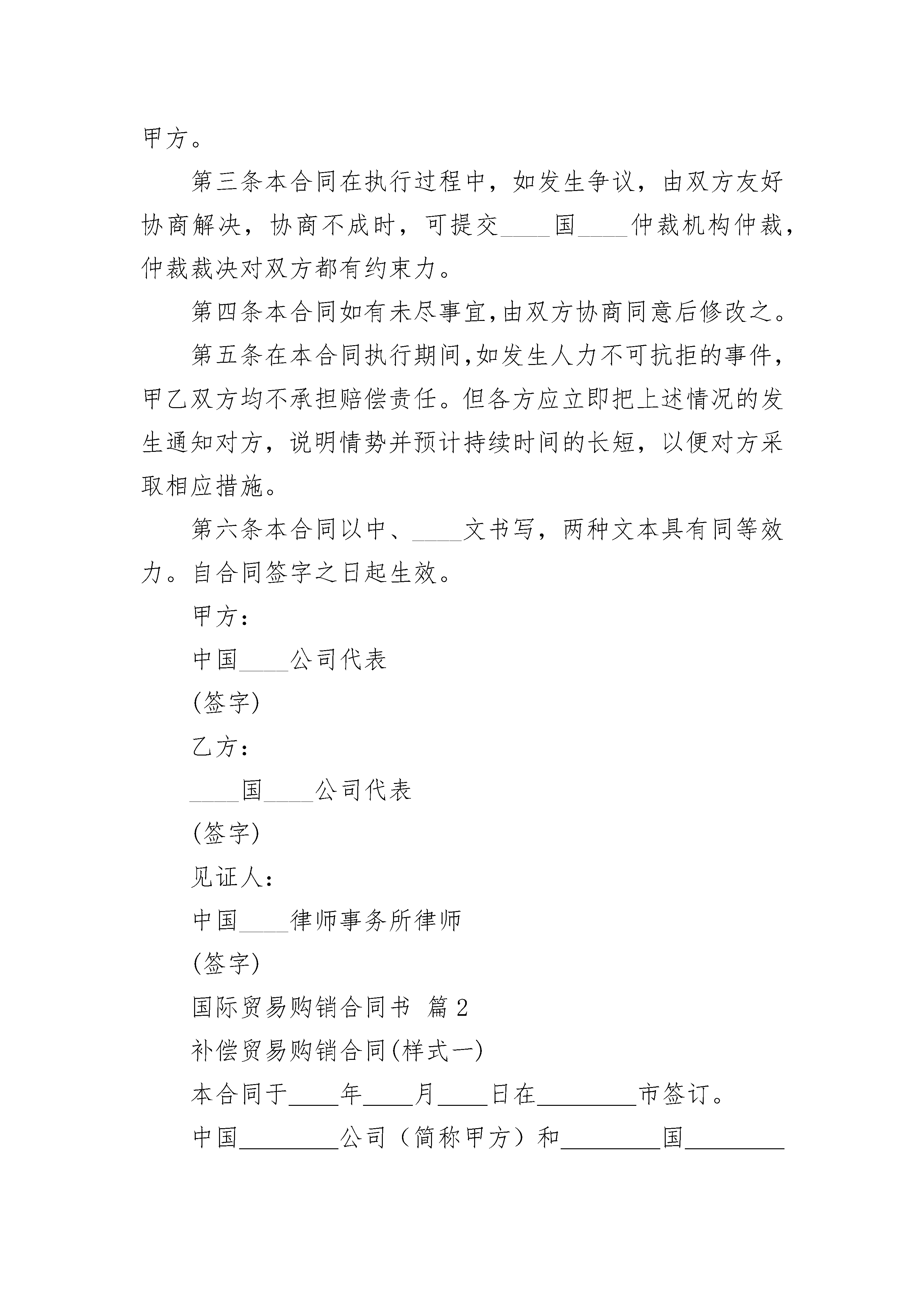 国际贸易购销合同书国际贸易购销合同书(精选3篇)国际贸易购销合同书篇1本合同于__年__月__日在____市签订。中国____公司(简称甲方)和____国____公司(简称乙方)经双方友好协商,在平等互利基础上,同意签订如下合同:第一条甲方同意从__年__月份起至__年__月底止,分期分批向乙方提供产品____套(件),计总值____万美元。品号品名:____规格:____数量:____单价____交货日期:____第一期:____第二期:____第三期:____目的口岸:____支付办法:____包装:____其它:____1.甲方每次交货时,将出的品名、规格、数量、金额、船名等在____小时前电告乙方。出运后,将全套正本货运单据:全套洁净装船提单(正本____份,本____份);发票(正本____份,副本____份);包装单;产地证明书;质量检验证书,由甲方直接寄给乙方的议付银行。同时,由甲方将上述单据的副本____份,分别寄给乙方和乙方的代理人。2.乙方同意在____产品中,接受甲方次品不超过百分之____。次品价格,双方根据质量情况,另行协商确定。3.其它条款根据中国____进出口总公司对____国出口商品合同规定。第二条乙方同意自____年__月起至_____年__月__底止,提供____机器____台,准备设备____台,以及测试仪器____台,附配件____套等,计总值____万美元。(各种设备的名称、型号、台数、价格齐全)。交货期:1.____机器,__年__月交货。2.____机器,__年__月交货。3.其它设备,__年__月交货。目的口岸:____支付办法:____包装:____其它:乙方在发运设备时,应先将发运的设备型号、名称、件数、金额、重量、体积等电告甲方。发运后,应将全套洁净的装船正本提单;发票;包装单;产地证明书;产品质量检验合格证书;有关设备详细的技术图纸和安装、使用、操作等说明书寄送甲方。为便于甲方做好准备工作,乙方同意在____年__月底前,先将各机器全套图纸(包括基础图)寄交甲方。第三条本合同在执行过程中,如发生争议,由双方友好协商解决,协商不成时,可提交____国____仲裁机构仲裁,仲裁裁决对双方都有约束力。第四条本合同如有未尽事宜,由双方协商同意后修改之。第五条在本合同执行期间,如发生人力不可抗拒的事件,甲乙双方均不承担赔偿责任。但各方应立即把上述情况的发生通知对方,说明情势并预计持续时间的长短,以便对方采取相应措施。第六条本合同以中、____文书写,两种文本具有同等效力。自合同签字之日起生效。甲方:中国____公司代表(签字)乙方:____国____公司代表(签字)见证人:中国____律师事务所律师(签字)国际贸易购销合同书篇2补偿贸易购销合同(样式一)本合同于__年__月__日在____市签订。中国____公司(简称甲方)和____国____公司(简称乙方)经双方友好协商,在平等互利基础上,同意签订如下合同:第一条甲方同意从__年__月份起至__年__月底止,分期分批向乙方提_____品____套(件),计总值____万美元。品号品名:____规格:____数量:____单价____交货日期:____第一期:____第二期:____第三期:____目的口岸:____支付办法:____包装:____其它:____2.乙方同意在____产品中,接受甲方次品不超过百分之____。次品价格,双方根据质量情况,另行协商确定。3.其它条款根据中国____进出口总公司对____国出口商品合同规定。第二条乙方同意自19__年__月起至19__年__月__底止,提供____机器____台,准备设备____台,以及测试仪器____台,附配件____套等,计总值____万美元。(各种设备的名称、型号、台数、价格齐全)。交货期:1.____机器,__年__月交货。2.____机器,__年__月交货。3.其它设备,__年__月交货。目的口岸:____支付办法:____包装:____其它:乙方在发运设备时,应先将发运的设备型号、名称、件数、金额、重量、体积等电告甲方。发运后,应将_____洁净的装船正本提单;发票;包装单;产地证明书;产品质量检验合格证书;有关设备详细的技术图纸和安装、使用、操作等说明书寄送甲方。为便于甲方做好准备工作,乙方同意在19__年__月底前,先将各机器_____图纸(包括基础图)寄交甲方。第三条本合同在执行过程中,如发生争议,由双方友好协商解决,协商不成时,可提交____国_________机构_____,_____裁决对双方都有约束力。第四条本合同如有未尽事宜,由双方协商同意后修改之。第六条本合同以中、____文书写,两种文本具有同等效力。自合同签字之日起生效。甲方:中国__
