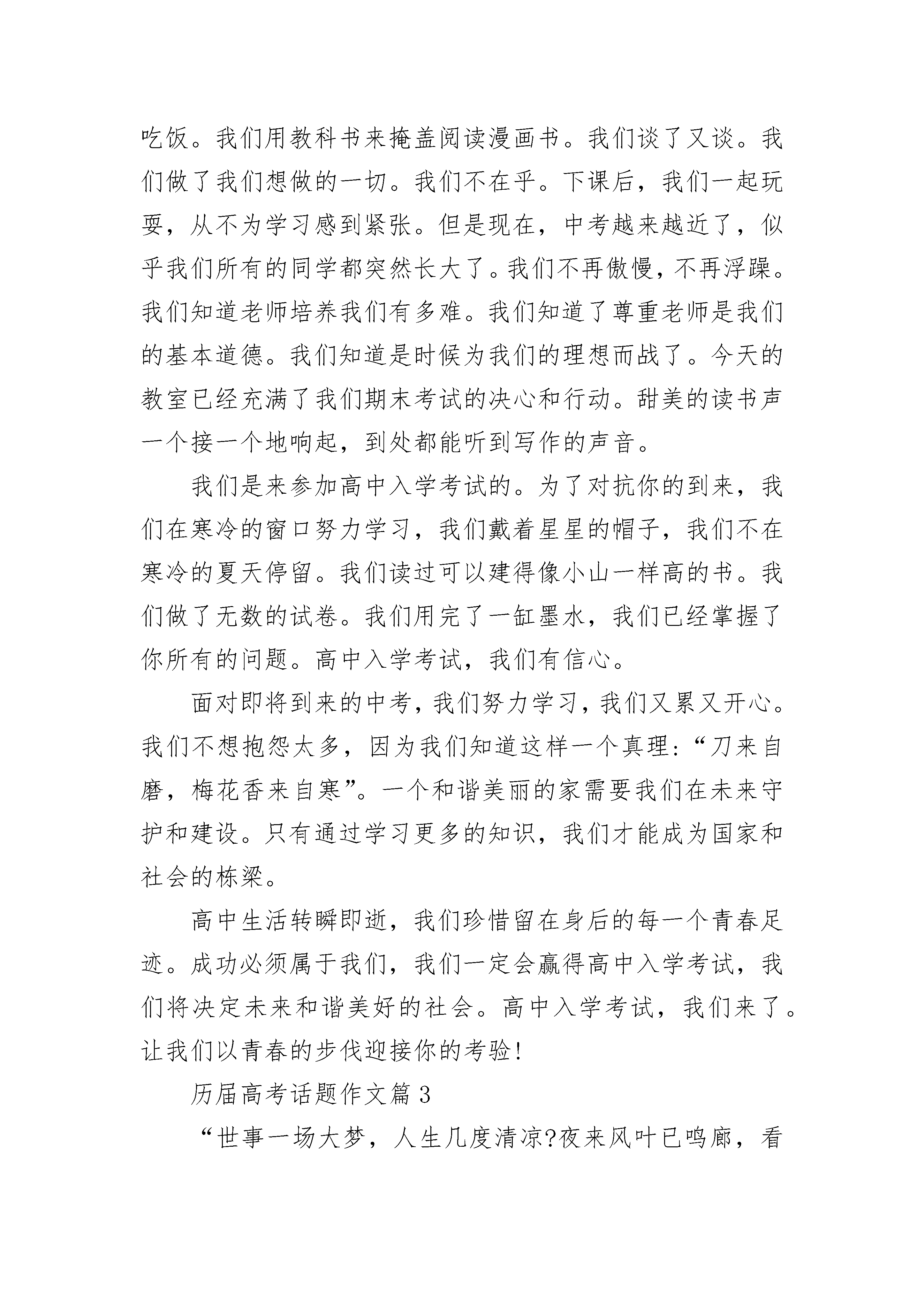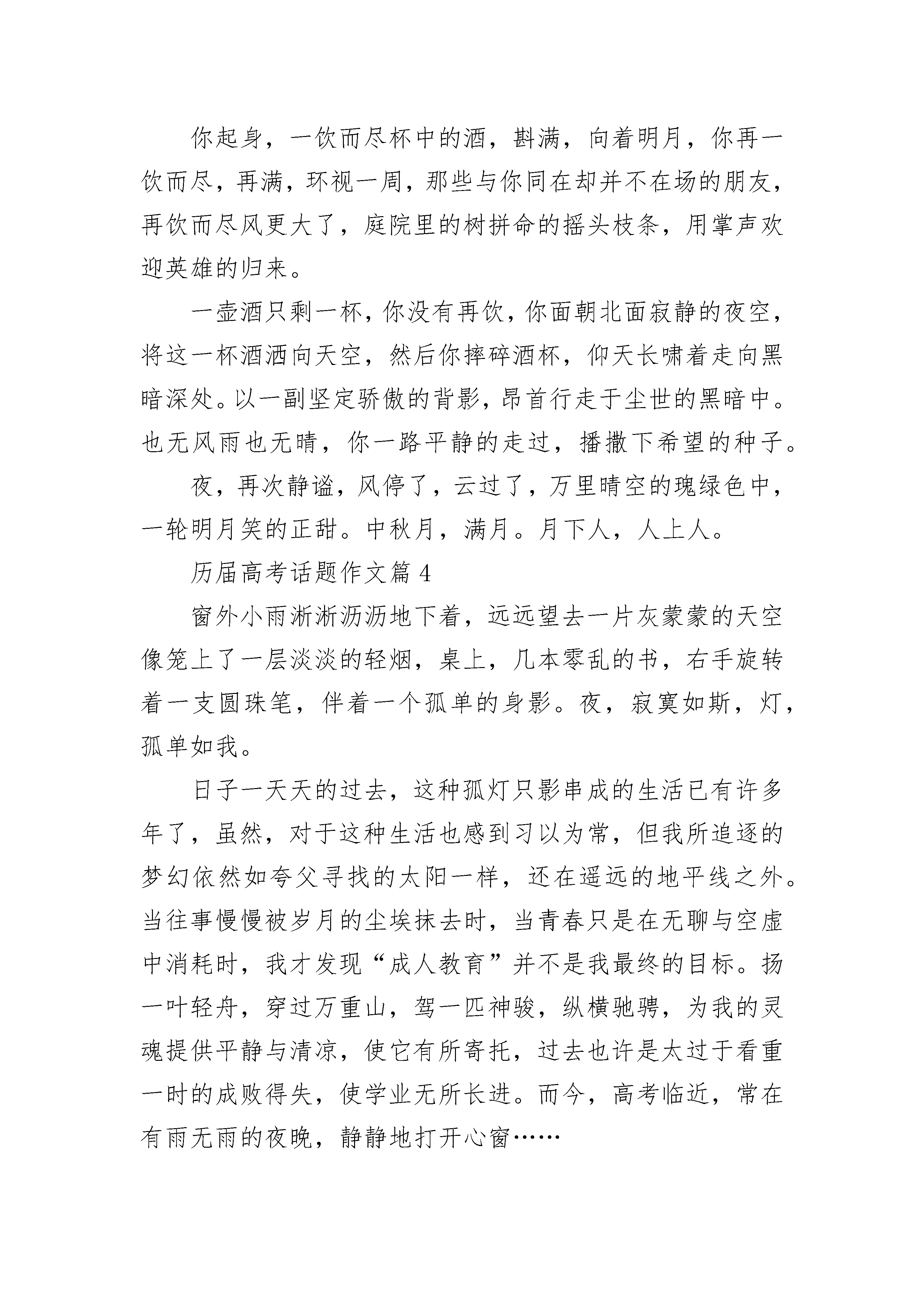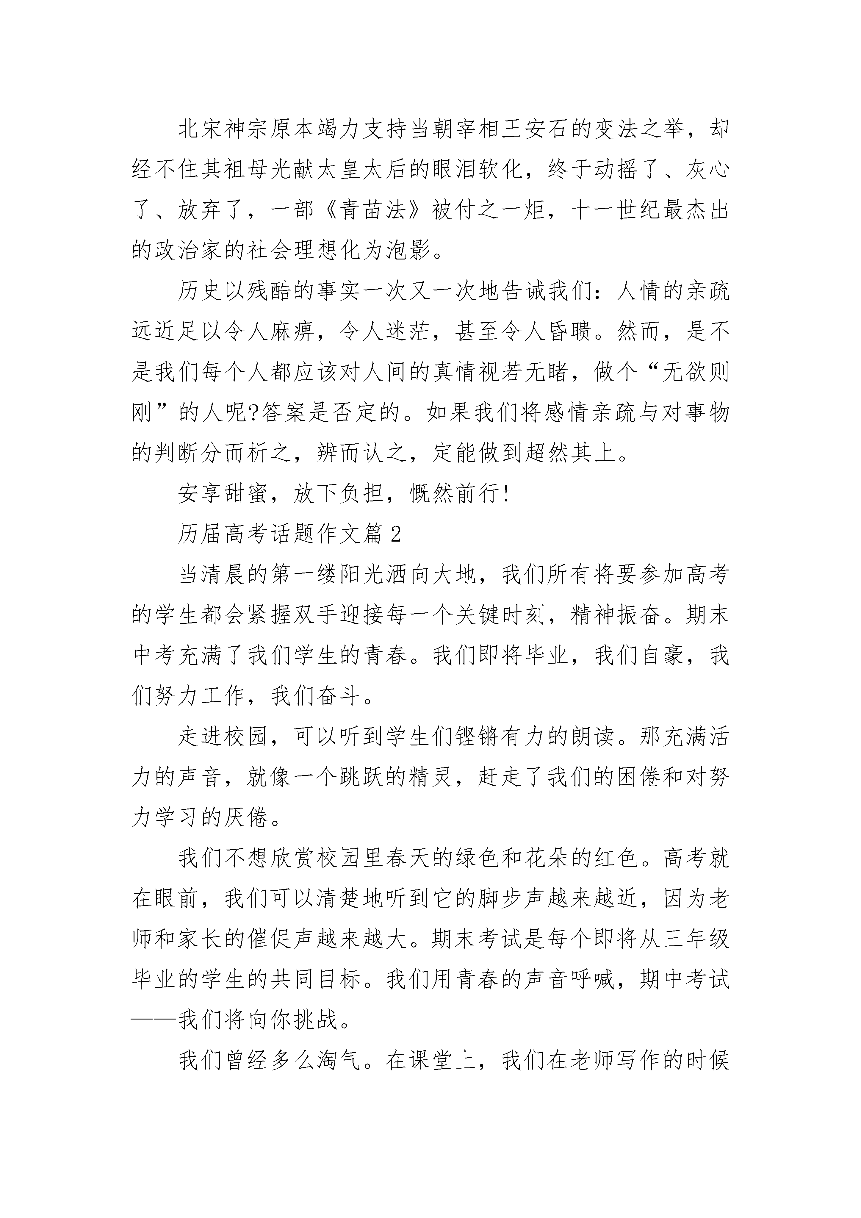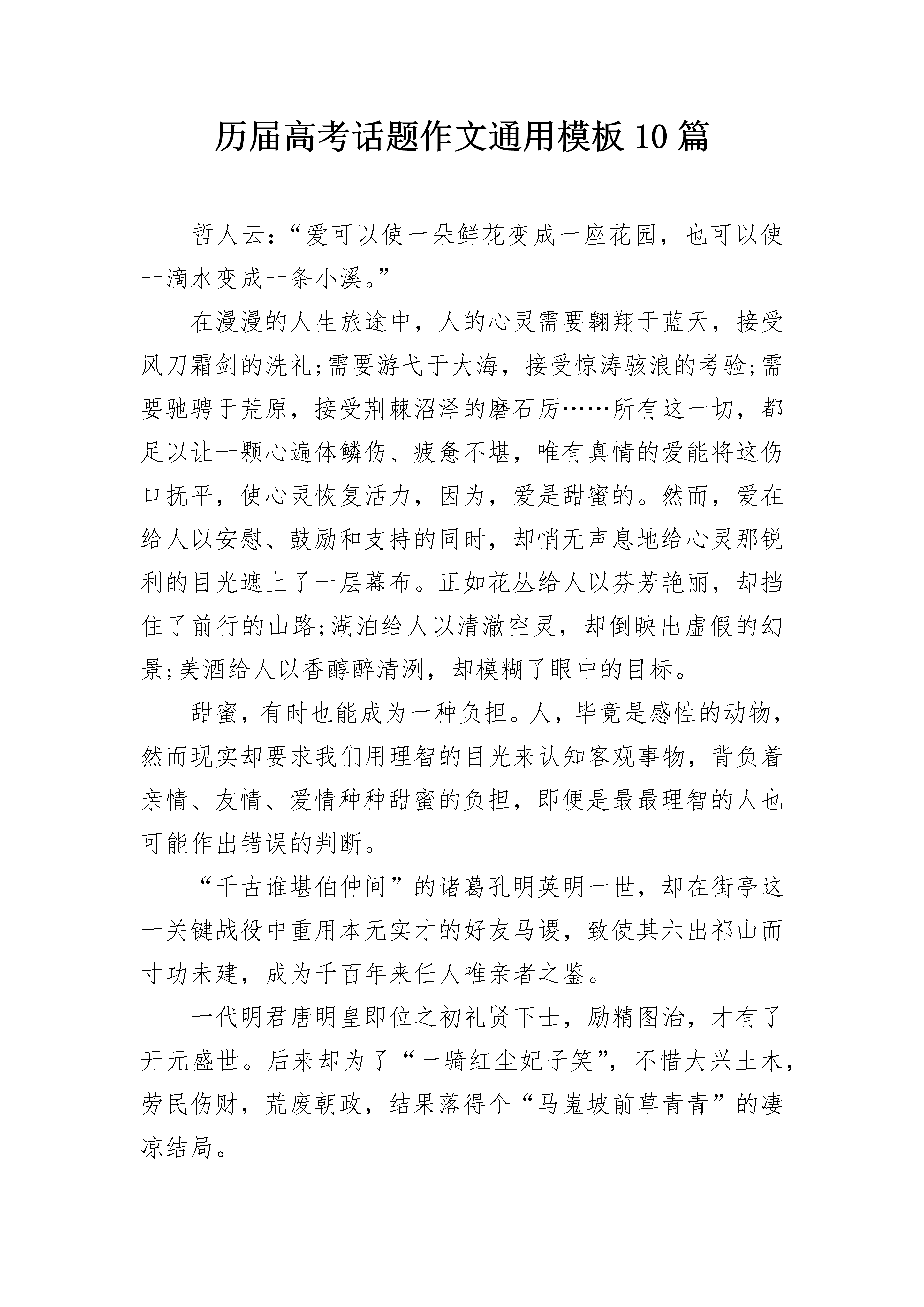 历届高考话题作文通用模板10篇哲人云:“爱可以使一朵鲜花变成一座花园,也可以使一滴水变成一条小溪。”在漫漫的人生旅途中,人的心灵需要翱翔于蓝天,接受风刀霜剑的洗礼;需要游弋于大海,接受惊涛骇浪的考验;需要驰骋于荒原,接受荆棘沼泽的磨石厉……所有这一切,都足以让一颗心遍体鳞伤、疲惫不堪,唯有真情的爱能将这伤口抚平,使心灵恢复活力,因为,爱是甜蜜的。然而,爱在给人以安慰、鼓励和支持的同时,却悄无声息地给心灵那锐利的目光遮上了一层幕布。正如花丛给人以芬芳艳丽,却挡住了前行的山路;湖泊给人以清澈空灵,却倒映出虚假的幻景;美酒给人以香醇醉清洌,却模糊了眼中的目标。甜蜜,有时也能成为一种负担。人,毕竟是感性的动物,然而现实却要求我们用理智的目光来认知客观事物,背负着亲情、友情、爱情种种甜蜜的负担,即便是最最理智的人也可能作出错误的判断。“千古谁堪伯仲间”的诸葛孔明英明一世,却在街亭这一关键战役中重用本无实才的好友马谡,致使其六出祁山而寸功未建,成为千百年来任人唯亲者之鉴。一代明君唐明皇即位之初礼贤下士,励精图治,才有了开元盛世。后来却为了“一骑红尘妃子笑”,不惜大兴土木,劳民伤财,荒废朝政,结果落得个“马嵬坡前草青青”的凄凉结局。北宋神宗原本竭力支持当朝宰相王安石的变法之举,却经不住其祖母光献太皇太后的眼泪软化,终于动摇了、灰心了、放弃了,一部《青苗法》被付之一炬,十一世纪最杰出的政治家的社会理想化为泡影。历史以残酷的事实一次又一次地告诫我们:人情的亲疏远近足以令人麻痹,令人迷茫,甚至令人昏聩。然而,是不是我们每个人都应该对人间的真情视若无睹,做个“无欲则刚”的人呢?答案是否定的。如果我们将感情亲疏与对事物的判断分而析之,辨而认之,定能做到超然其上。安享甜蜜,放下负担,慨然前行!历届高考话题作文篇2当清晨的第一缕阳光洒向大地,我们所有将要参加高考的学生都会紧握双手迎接每一个关键时刻,精神振奋。期末中考充满了我们学生的青春。我们即将毕业,我们自豪,我们努力工作,我们奋斗。走进校园,可以听到学生们铿锵有力的朗读。那充满活力的声音,就像一个跳跃的精灵,赶走了我们的困倦和对努力学习的厌倦。我们不想欣赏校园里春天的绿色和花朵的红色。高考就在眼前,我们可以清楚地听到它的脚步声越来越近,因为老师和家长的催促声越来越大。期末考试是每个即将从三年级毕业的学生的共同目标。我们用青春的声音呼喊,期中考试——我们将向你挑战。我们曾经多么淘气。在课堂上,我们在老师写作的时候吃饭。我们用教科书来掩盖阅读漫画书。我们谈了又谈。我们做了我们想做的一切。我们不在乎。下课后,我们一起玩耍,从不为学习感到紧张。但是现在,中考越来越近了,似乎我们所有的同学都突然长大了。我们不再傲慢,不再浮躁。我们知道老师培养我们有多难。我们知道了尊重老师是我们的基本道德。我们知道是时候为我们的理想而战了。今天的教室已经充满了我们期末考试的决心和行动。甜美的读书声一个接一个地响起,到处都能听到写作的声音。我们是来参加高中入学考试的。为了对抗你的到来,我们在寒冷的窗口努力学习,我们戴着星星的帽子,我们不在寒冷的夏天停留。我们读过可以建得像小山一样高的书。我们做了无数的试卷。我们用完了一缸墨水,我们已经掌握了你所有的问题。高中入学考试,我们有信心。面对即将到来的中考,我们努力学习,我们又累又开心。我们不想抱怨太多,因为我们知道这样一个真理:“刀来自磨,梅花香来自寒”。一个和谐美丽的家需要我们在未来守护和建设。只有通过学习更多的知识,我们才能成为国家和社会的栋梁。高中生活转瞬即逝,我们珍惜留在身后的每一个青春足迹。成功必须属于我们,我们一定会赢得高中入学考试,我们将决定未来和谐美好的社会。高中入学考试,我们来了。让我们以青春的步伐迎接你的考验!历届高考话题作文篇3“世事一场大梦,人生几度清凉?夜来风叶已鸣廊,看取眉间鬓上。酒贱常愁客少,月明多被云妨。中秋谁与共孤光?把盏凄然北望。”斟一杯清酒,独酌出两行浊泪。中秋月,满月。月下人,孤人。亭下孤灯摇晃,人影幢幢。无人相与把盏对饮,只有月对你敞开了心。你的婵娟美梦,还能否唤起千里外的回音?凝望的太久,月影也若隐若现,是泪水感动了月,还是浮云遮住了你的心?狱外生活固然自由,却使你的一片忠心远离圣都。团圆的时候,你却只能团圆你一生的感伤。世事难料,如梦幻般缥缈。这双描绘宋朝宏伟蓝图的手,此刻竟连端起酒杯都要颤抖。风吹乱了浮云,也吹干了你的泪水,落叶是深秋的雨,洗不掉你尘世的俗,带不走你失意的伤。桌上放凉的饭菜你不曾动过,酒杯里,倒映的是你鬓间的白发和那忧郁的眼神。你害怕望见他,一个年老颓废的雕塑,怎能容下你那颗热血沸腾立志报国的心?无情的叶在落,失意的你却在爬起,一蓑烟雨任平生,世俗的疾风骤雨打不散你坚固的爱国之心,受尽委屈你扔能笑看人生!一个伟大的抱负决