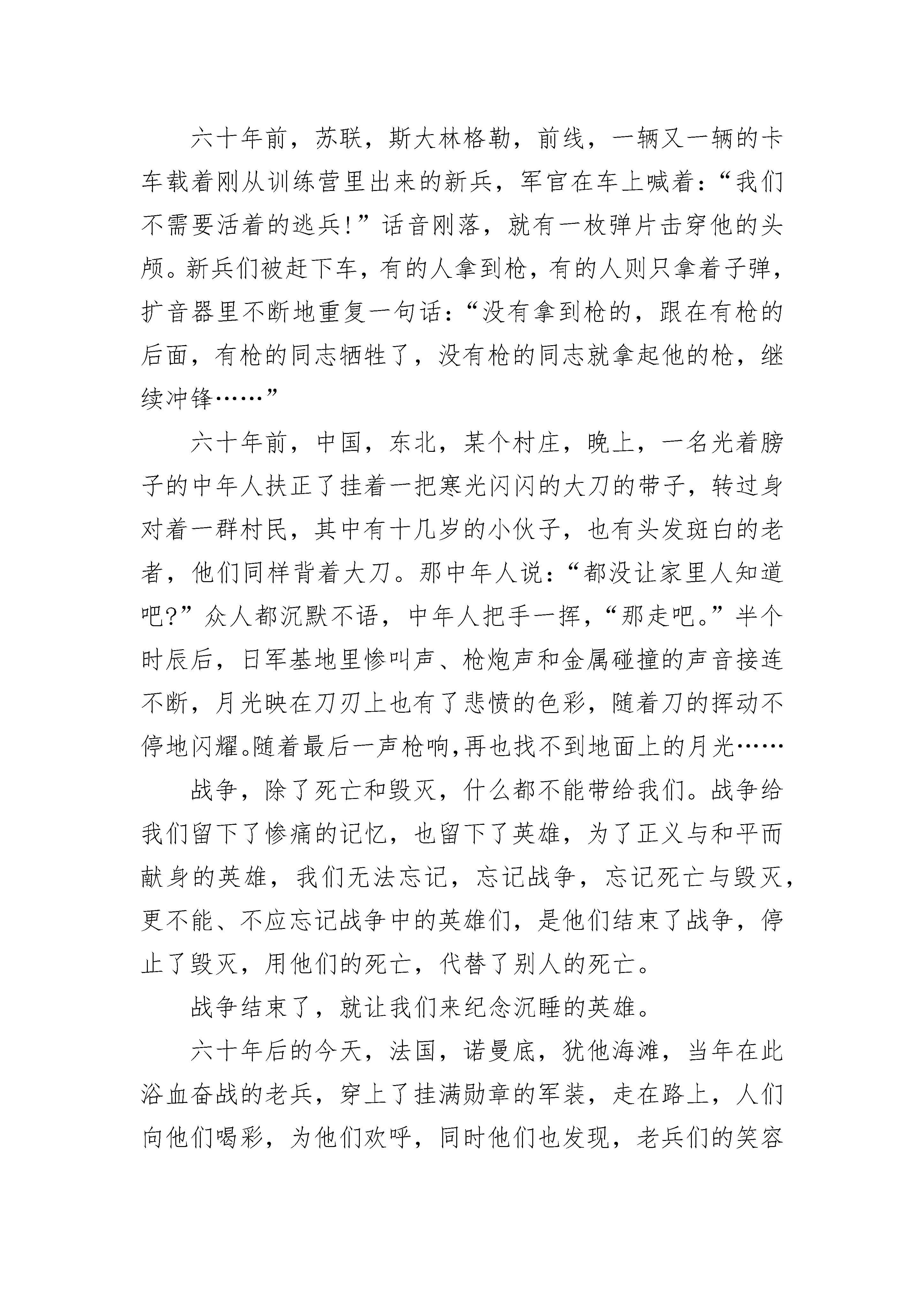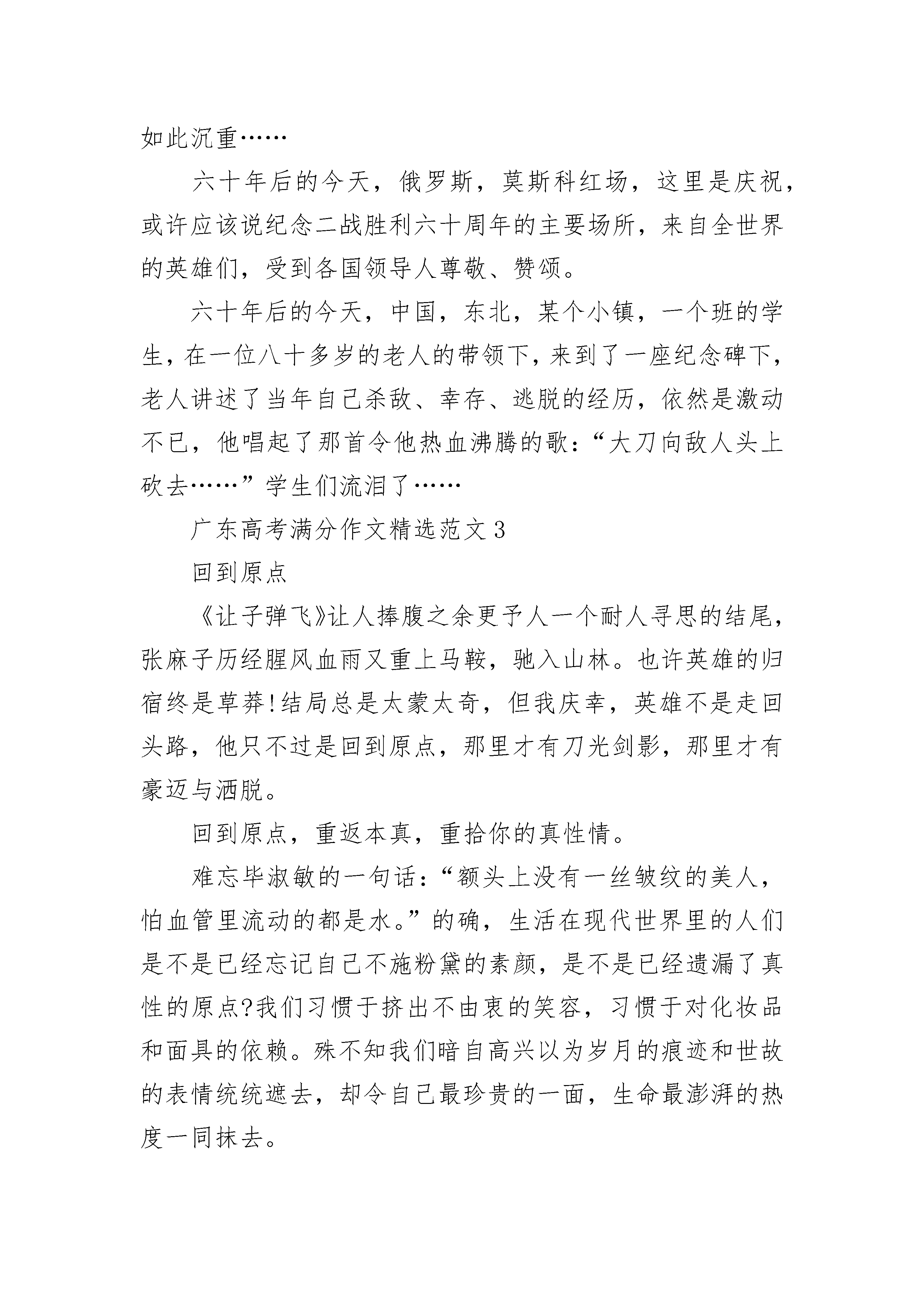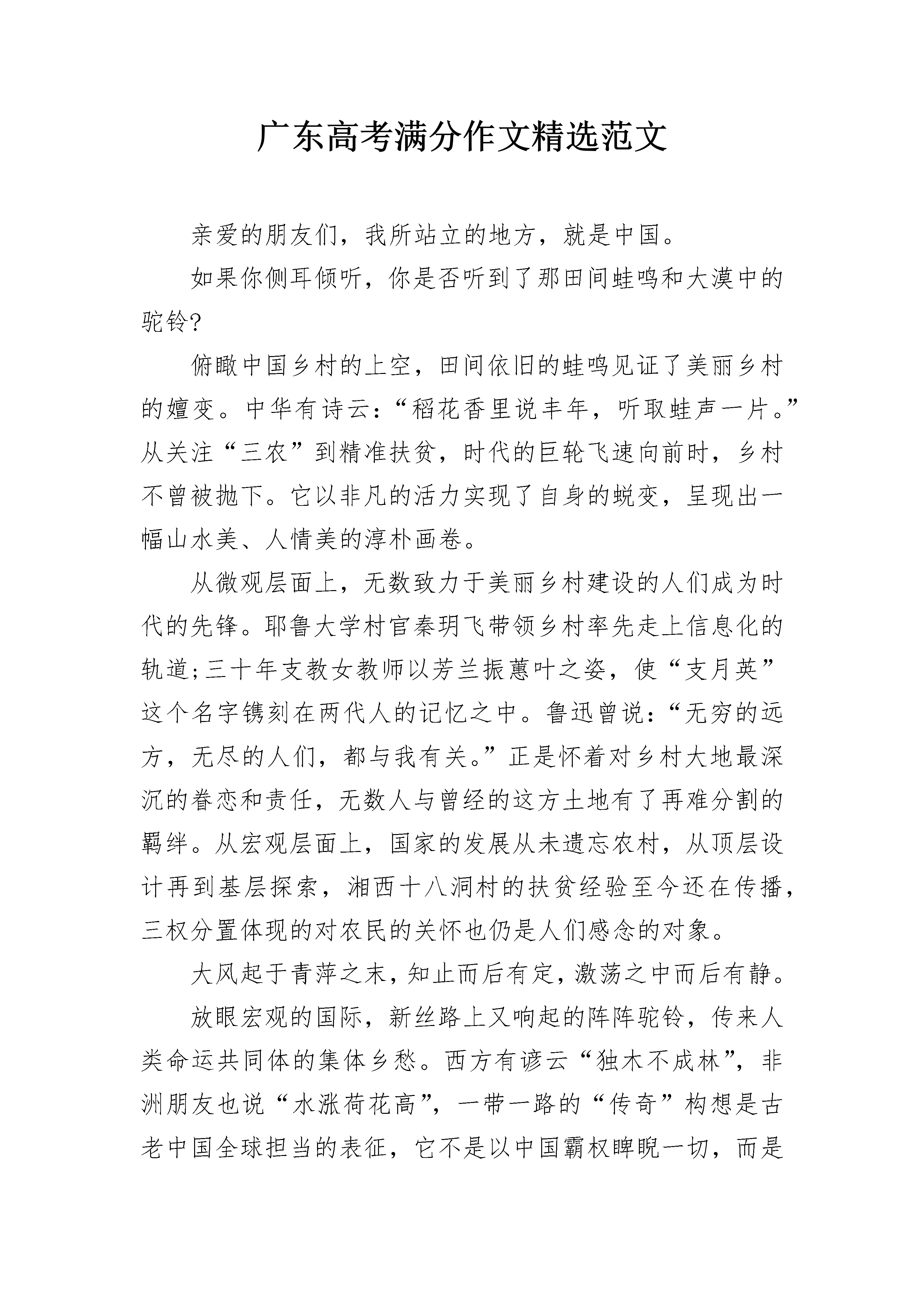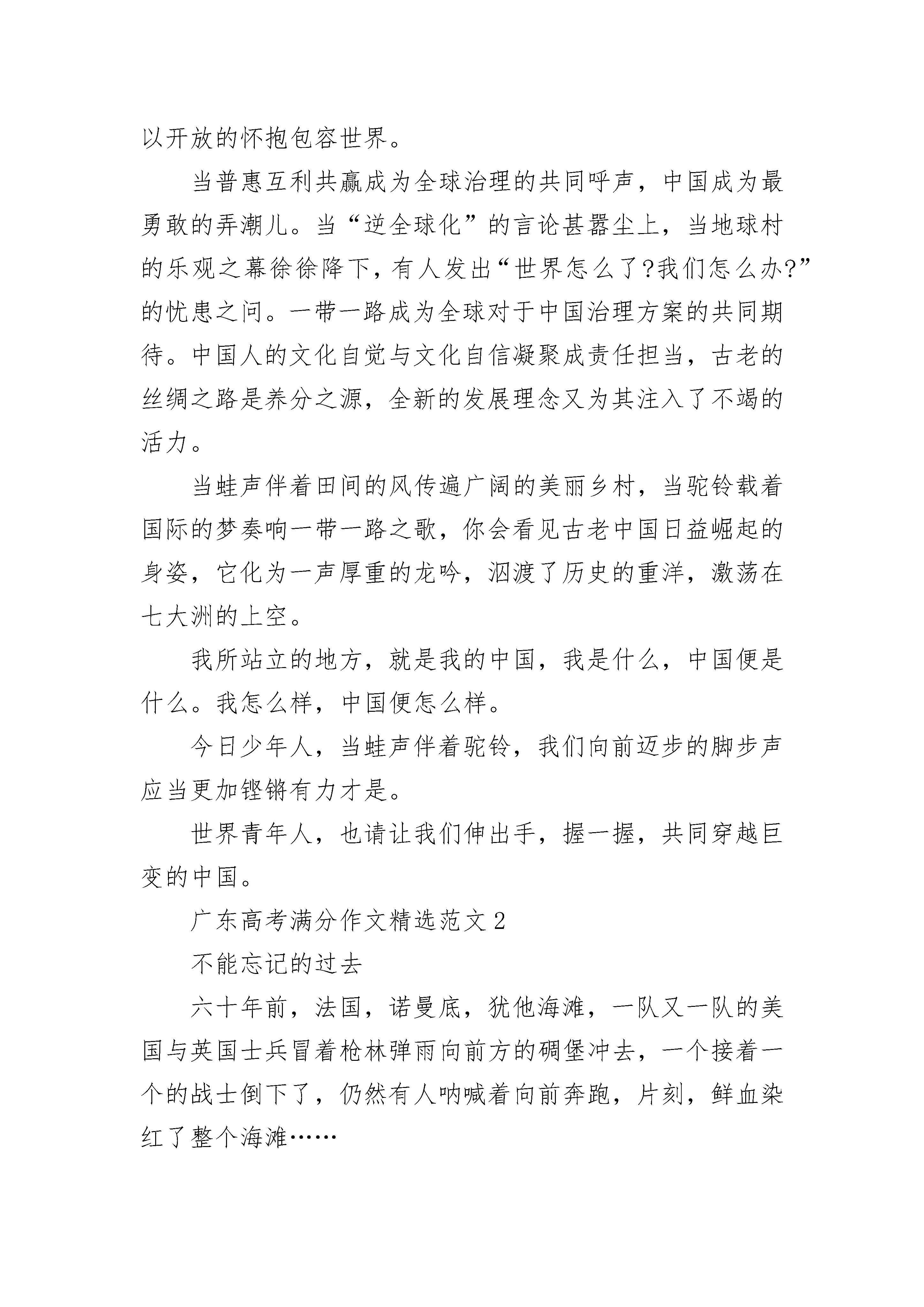 广东高考满分作文精选范文亲爱的朋友们,我所站立的地方,就是中国。如果你侧耳倾听,你是否听到了那田间蛙鸣和大漠中的驼铃?俯瞰中国乡村的上空,田间依旧的蛙鸣见证了美丽乡村的嬗变。中华有诗云:“稻花香里说丰年,听取蛙声一片。”从关注“三农”到精准扶贫,时代的巨轮飞速向前时,乡村不曾被抛下。它以非凡的活力实现了自身的蜕变,呈现出一幅山水美、人情美的淳朴画卷。从微观层面上,无数致力于美丽乡村建设的人们成为时代的先锋。耶鲁大学村官秦玥飞带领乡村率先走上信息化的轨道;三十年支教女教师以芳兰振蕙叶之姿,使“支月英”这个名字镌刻在两代人的记忆之中。鲁迅曾说:“无穷的远方,无尽的人们,都与我有关。”正是怀着对乡村大地最深沉的眷恋和责任,无数人与曾经的这方土地有了再难分割的羁绊。从宏观层面上,国家的发展从未遗忘农村,从顶层设计再到基层探索,湘西十八洞村的扶贫经验至今还在传播,三权分置体现的对农民的关怀也仍是人们感念的对象。大风起于青萍之末,知止而后有定,激荡之中而后有静。放眼宏观的国际,新丝路上又响起的阵阵驼铃,传来人类命运共同体的集体乡愁。西方有谚云“独木不成林”,非洲朋友也说“水涨荷花高”,一带一路的“传奇”构想是古老中国全球担当的表征,它不是以中国霸权睥睨一切,而是以开放的怀抱包容世界。当普惠互利共赢成为全球治理的共同呼声,中国成为最勇敢的弄潮儿。当“逆全球化”的言论甚嚣尘上,当地球村的乐观之幕徐徐降下,有人发出“世界怎么了?我们怎么办?”的忧患之问。一带一路成为全球对于中国治理方案的共同期待。中国人的文化自觉与文化自信凝聚成责任担当,古老的丝绸之路是养分之源,全新的发展理念又为其注入了不竭的活力。当蛙声伴着田间的风传遍广阔的美丽乡村,当驼铃载着国际的梦奏响一带一路之歌,你会看见古老中国日益崛起的身姿,它化为一声厚重的龙吟,泅渡了历史的重洋,激荡在七大洲的上空。我所站立的地方,就是我的中国,我是什么,中国便是什么。我怎么样,中国便怎么样。今日少年人,当蛙声伴着驼铃,我们向前迈步的脚步声应当更加铿锵有力才是。世界青年人,也请让我们伸出手,握一握,共同穿越巨变的中国。广东高考满分作文精选范文2不能忘记的过去六十年前,法国,诺曼底,犹他海滩,一队又一队的美国与英国士兵冒着枪林弹雨向前方的碉堡冲去,一个接着一个的战士倒下了,仍然有人呐喊着向前奔跑,片刻,鲜血染红了整个海滩……六十年前,苏联,斯大林格勒,前线,一辆又一辆的卡车载着刚从训练营里出来的新兵,军官在车上喊着:“我们不需要活着的逃兵!”话音刚落,就有一枚弹片击穿他的头颅。新兵们被赶下车,有的人拿到枪,有的人则只拿着子弹,扩音器里不断地重复一句话:“没有拿到枪的,跟在有枪的后面,有枪的同志牺牲了,没有枪的同志就拿起他的枪,继续冲锋……”六十年前,中国,东北,某个村庄,晚上,一名光着膀子的中年人扶正了挂着一把寒光闪闪的大刀的带子,转过身对着一群村民,其中有十几岁的小伙子,也有头发斑白的老者,他们同样背着大刀。那中年人说:“都没让家里人知道吧?”众人都沉默不语,中年人把手一挥,“那走吧。”半个时辰后,日军基地里惨叫声、枪炮声和金属碰撞的声音接连不断,月光映在刀刃上也有了悲愤的色彩,随着刀的挥动不停地闪耀。随着最后一声枪响,再也找不到地面上的月光……战争,除了死亡和毁灭,什么都不能带给我们。战争给我们留下了惨痛的记忆,也留下了英雄,为了正义与和平而献身的英雄,我们无法忘记,忘记战争,忘记死亡与毁灭,更不能、不应忘记战争中的英雄们,是他们结束了战争,停止了毁灭,用他们的死亡,代替了别人的死亡。战争结束了,就让我们来纪念沉睡的英雄。六十年后的今天,法国,诺曼底,犹他海滩,当年在此浴血奋战的老兵,穿上了挂满勋章的军装,走在路上,人们向他们喝彩,为他们欢呼,同时他们也发现,老兵们的笑容如此沉重……六十年后的今天,俄罗斯,莫斯科红场,这里是庆祝,或许应该说纪念二战胜利六十周年的主要场所,来自全世界的英雄们,受到各国领导人尊敬、赞颂。六十年后的今天,中国,东北,某个小镇,一个班的学生,在一位八十多岁的老人的带领下,来到了一座纪念碑下,老人讲述了当年自己杀敌、幸存、逃脱的经历,依然是激动不已,他唱起了那首令他热血沸腾的歌:“大刀向敌人头上砍去……”学生们流泪了……广东高考满分作文精选范文3回到原点《让子弹飞》让人捧腹之余更予人一个耐人寻思的结尾,张麻子历经腥风血雨又重上马鞍,驰入山林。也许英雄的归宿终是草莽!结局总是太蒙太奇,但我庆幸,英雄不是走回头路,他只不过是回到原点,那里才有刀光剑影,那里才有豪迈与洒脱。回到原点,重返本真,重拾你的真性情。难忘毕淑敏的一句话:“额头上没有一丝皱纹的美人,怕血管里流动的都是水。”的确,生活在现代世界里的人们是不是已经忘记自己不施粉黛的素颜,是不是已经遗漏了真性的原点?我们习