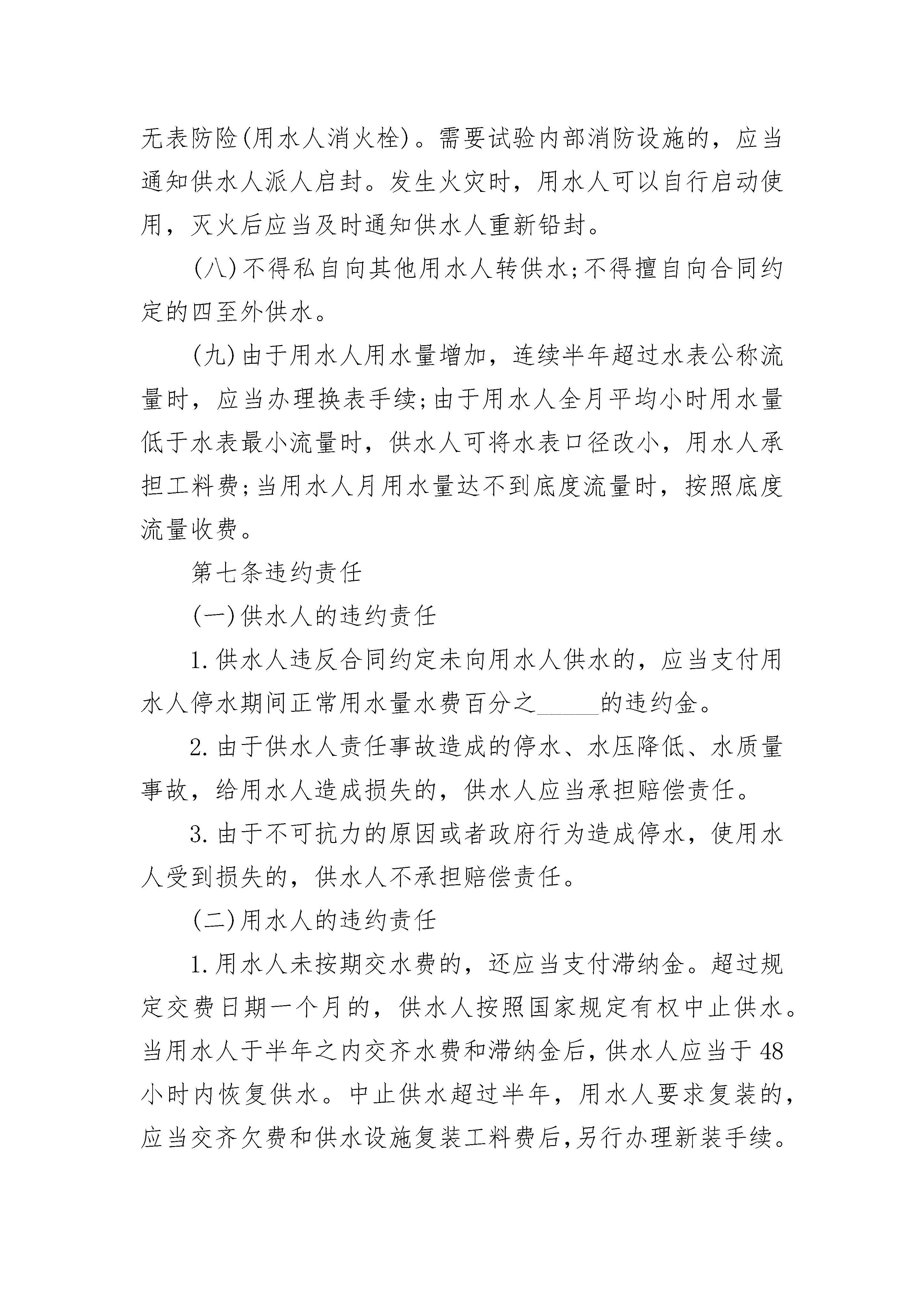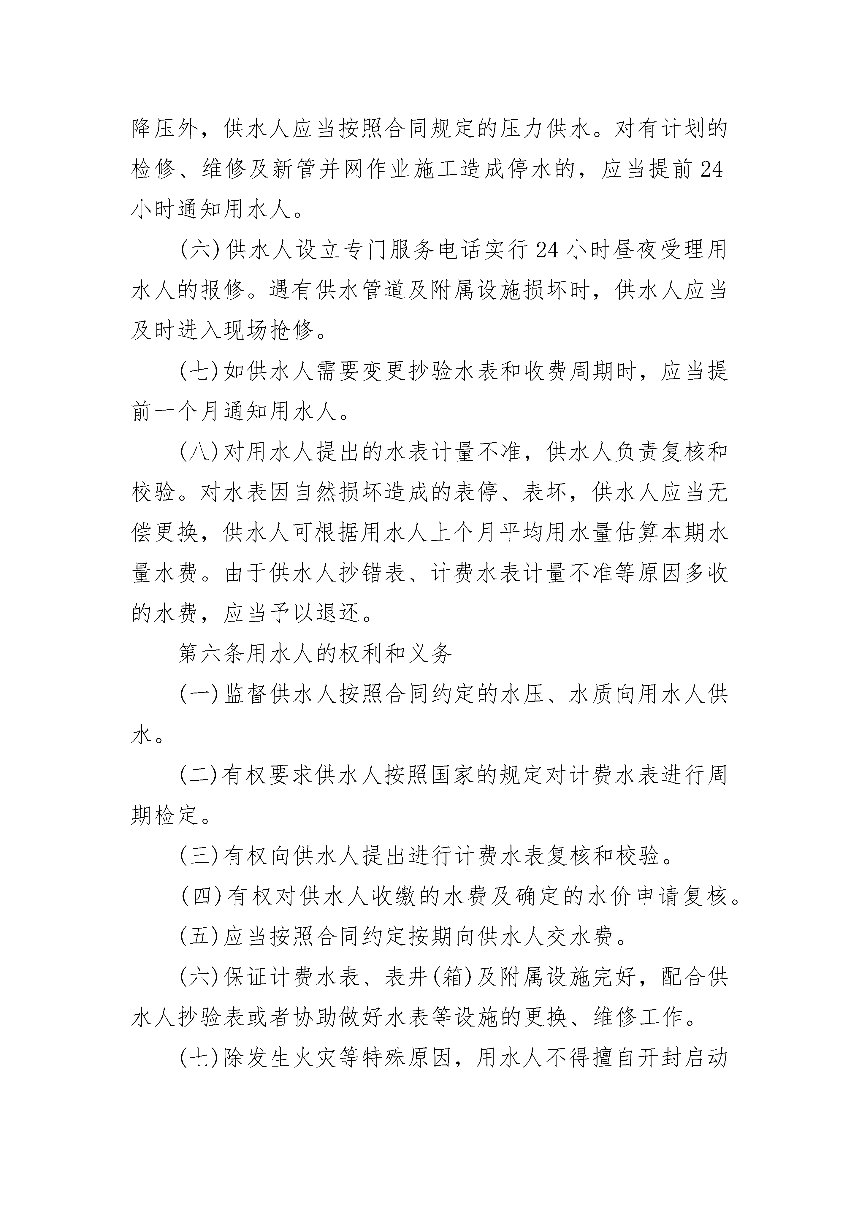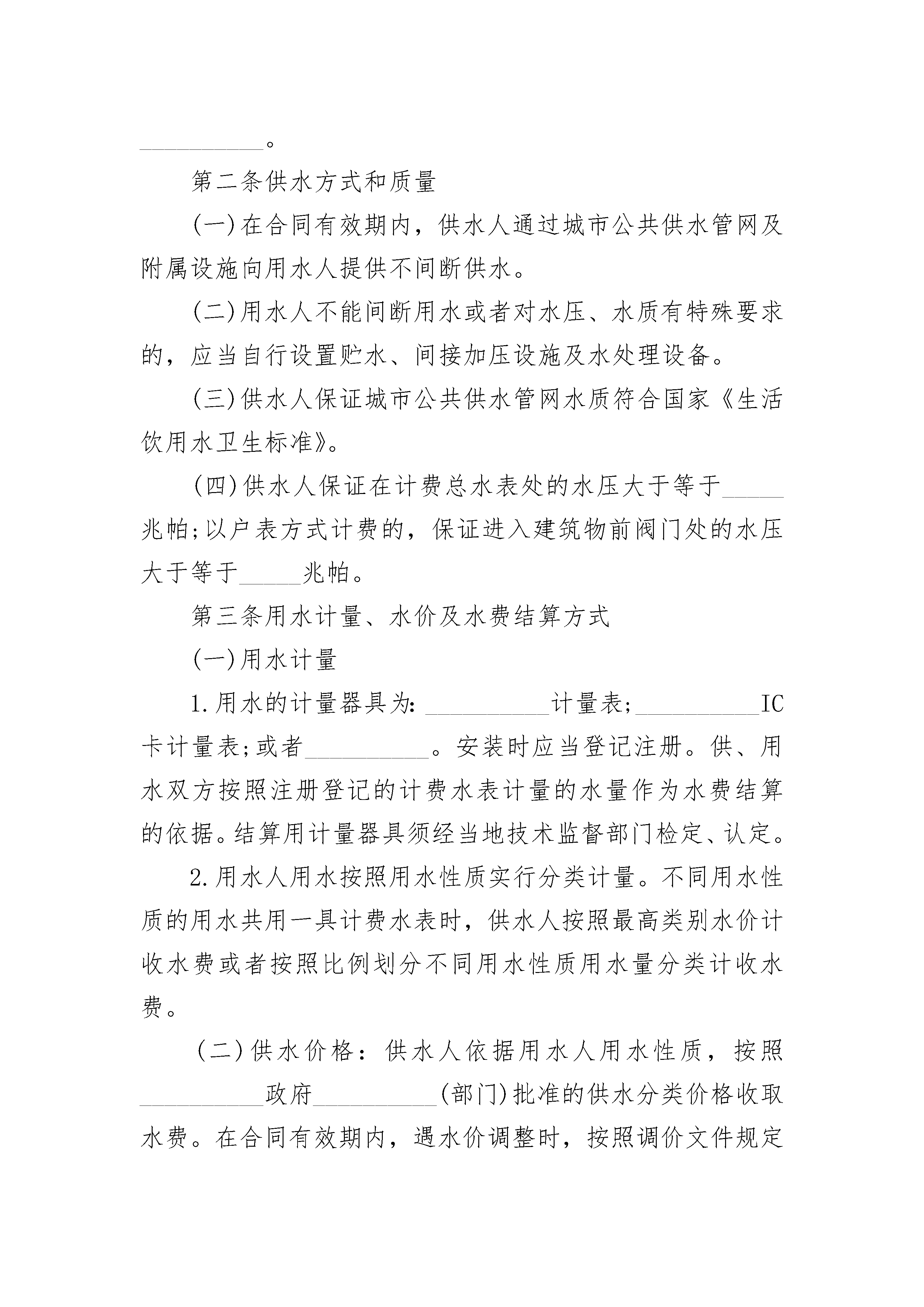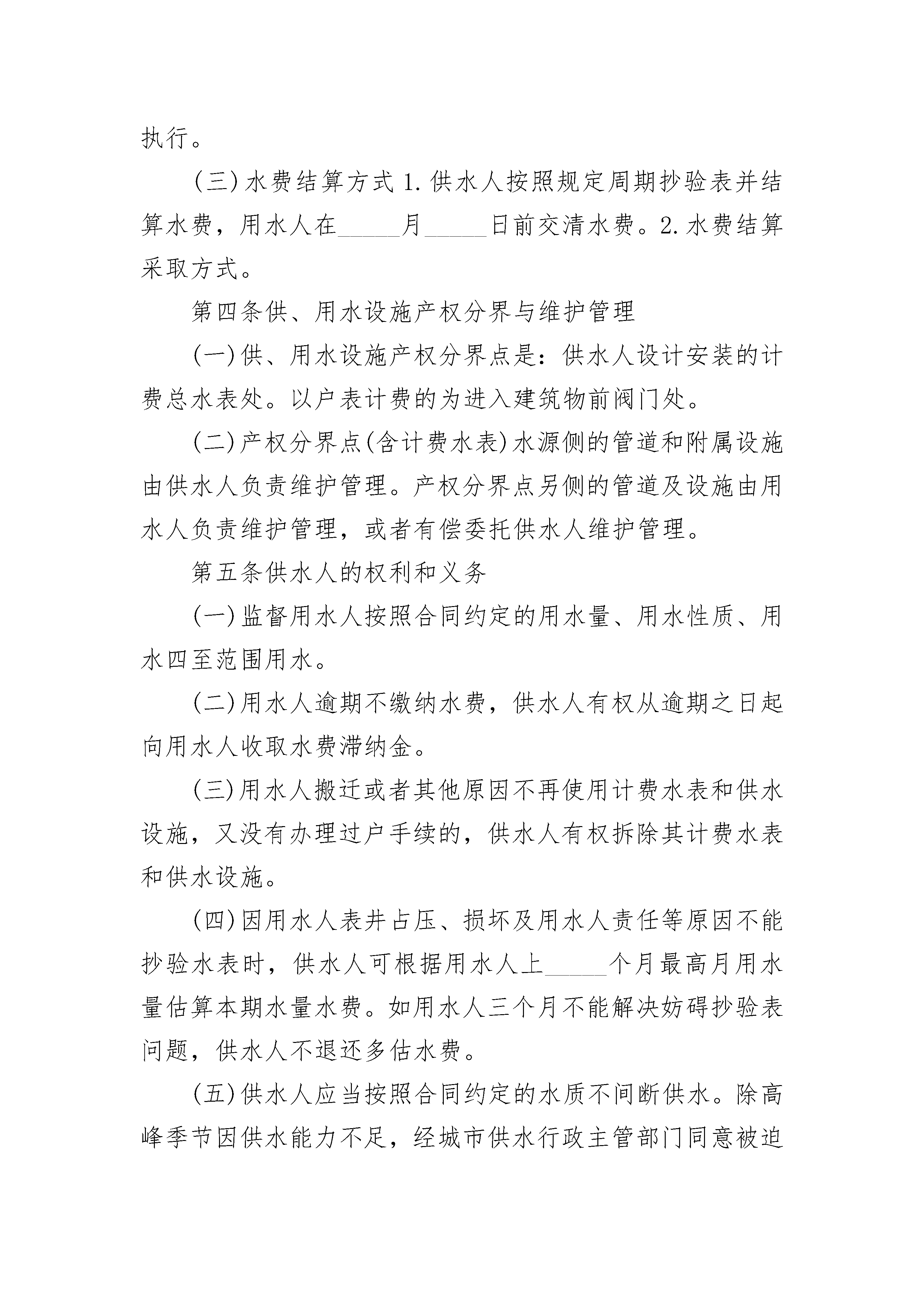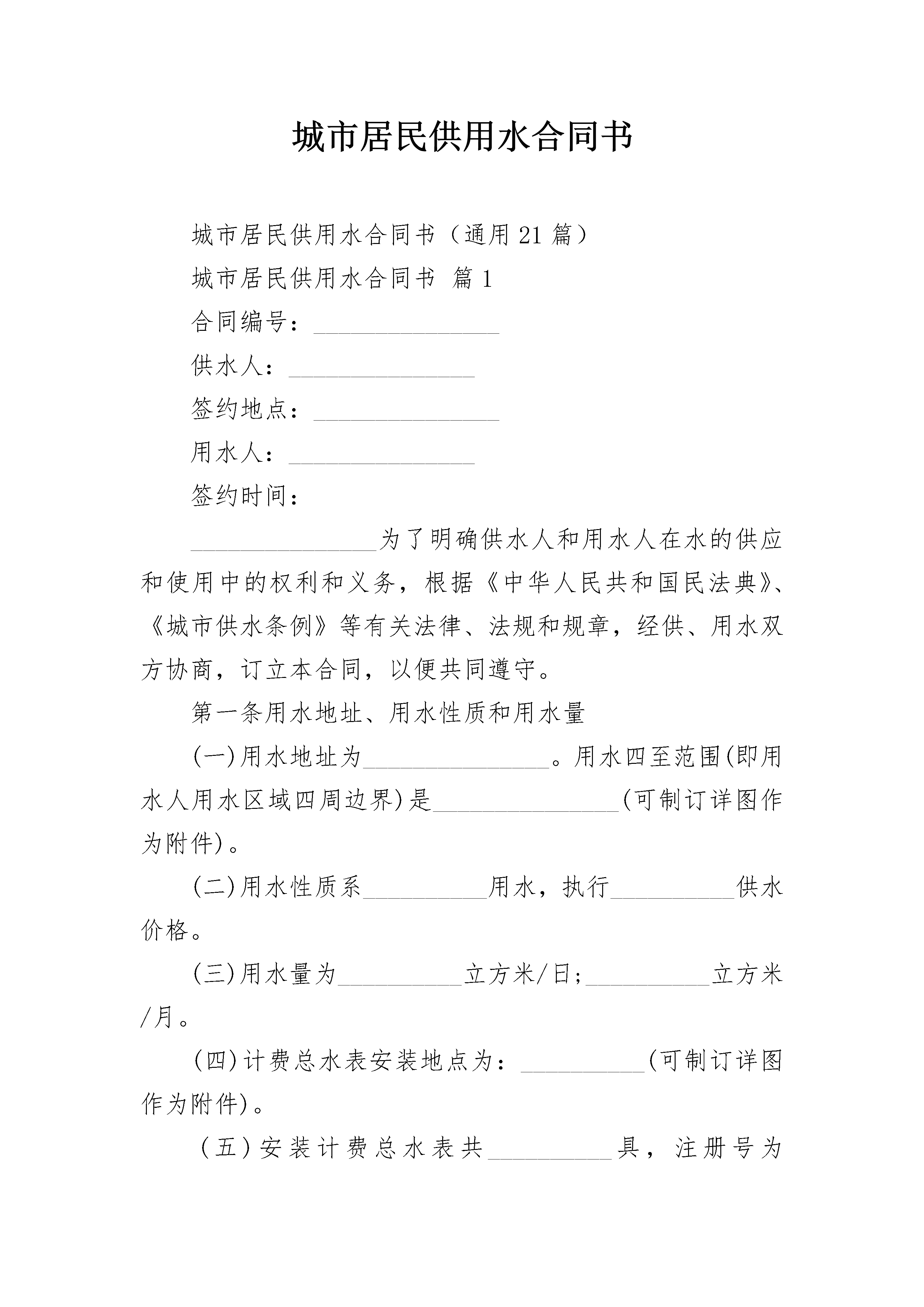 城市居民供用水合同书城市居民供用水合同书(通用21篇)城市居民供用水合同书篇1合同编号:_______________供水人:_______________签约地点:_______________用水人:_______________签约时间:_______________为了明确供水人和用水人在水的供应和使用中的权利和义务,根据《中华人民共和国民法典》、《城市供水条例》等有关法律、法规和规章,经供、用水双方协商,订立本合同,以便共同遵守。第一条用水地址、用水性质和用水量(一)用水地址为_______________。用水四至范围(即用水人用水区域四周边界)是_______________(可制订详图作为附件)。(二)用水性质系__________用水,执行__________供水价格。(三)用水量为__________立方米/日;__________立方米/月。(四)计费总水表安装地点为:__________(可制订详图作为附件)。(五)安装计费总水表共__________具,注册号为__________。第二条供水方式和质量(一)在合同有效期内,供水人通过城市公共供水管网及附属设施向用水人提供不间断供水。(二)用水人不能间断用水或者对水压、水质有特殊要求的,应当自行设置贮水、间接加压设施及水处理设备。(三)供水人保证城市公共供水管网水质符合国家《生活饮用水卫生标准》。(四)供水人保证在计费总水表处的水压大于等于_____兆帕;以户表方式计费的,保证进入建筑物前阀门处的水压大于等于_____兆帕。第三条用水计量、水价及水费结算方式(一)用水计量1.用水的计量器具为:__________计量表;__________IC卡计量表;或者__________。安装时应当登记注册。供、用水双方按照注册登记的计费水表计量的水量作为水费结算的依据。结算用计量器具须经当地技术监督部门检定、认定。2.用水人用水按照用水性质实行分类计量。不同用水性质的用水共用一具计费水表时,供水人按照最高类别水价计收水费或者按照比例划分不同用水性质用水量分类计收水费。(二)供水价格:供水人依据用水人用水性质,按照__________政府__________(部门)批准的供水分类价格收取水费。在合同有效期内,遇水价调整时,按照调价文件规定执行。(三)水费结算方式1.供水人按照规定周期抄验表并结算水费,用水人在_____月_____日前交清水费。2.水费结算采取方式。第四条供、用水设施产权分界与维护管理(一)供、用水设施产权分界点是:供水人设计安装的计费总水表处。以户表计费的为进入建筑物前阀门处。(二)产权分界点(含计费水表)水源侧的管道和附属设施由供水人负责维护管理。产权分界点另侧的管道及设施由用水人负责维护管理,或者有偿委托供水人维护管理。第五条供水人的权利和义务(一)监督用水人按照合同约定的用水量、用水性质、用水四至范围用水。(二)用水人逾期不缴纳水费,供水人有权从逾期之日起向用水人收取水费滞纳金。(三)用水人搬迁或者其他原因不再使用计费水表和供水设施,又没有办理过户手续的,供水人有权拆除其计费水表和供水设施。(四)因用水人表井占压、损坏及用水人责任等原因不能抄验水表时,供水人可根据用水人上_____个月最高月用水量估算本期水量水费。如用水人三个月不能解决妨碍抄验表问题,供水人不退还多估水费。(五)供水人应当按照合同约定的水质不间断供水。除高峰季节因供水能力不足,经城市供水行政主管部门同意被迫降压外,供水人应当按照合同规定的压力供水。对有计划的检修、维修及新管并网作业施工造成停水的,应当提前24小时通知用水人。(六)供水人设立专门服务电话实行24小时昼夜受理用水人的报修。遇有供水管道及附属设施损坏时,供水人应当及时进入现场抢修。(七)如供水人需要变更抄验水表和收费周期时,应当提前一个月通知用水人。(八)对用水人提出的水表计量不准,供水人负责复核和校验。对水表因自然损坏造成的表停、表坏,供水人应当无偿更换,供水人可根据用水人上个月平均用水量估算本期水量水费。由于供水人抄错表、计费水表计量不准等原因多收的水费,应当予以退还。第六条用水人的权利和义务(一)监督供水人按照合同约定的水压、水质向用水人供水。(二)有权要求供水人按照国家的规定对计费水表进行周期检定。(三)有权向供水人提出进行计费水表复核和校验。(四)有权对供水人收缴的水费及确定的水价申请复核。(五)应当按照合同约定按期向供水人交水费。(六)保证计费水表、表井(箱)及附属设施完好,配合供水人抄验表或者协助做好水表等设施的更换、维修工作。(七)除发生火灾等特殊原因,用水人不得擅自开封启动无表防险(用水人消火栓)。需要试验内部消防设施的,应当通知供水人派人启封。发生火灾时,用水人可以自行启动使用,灭火后应