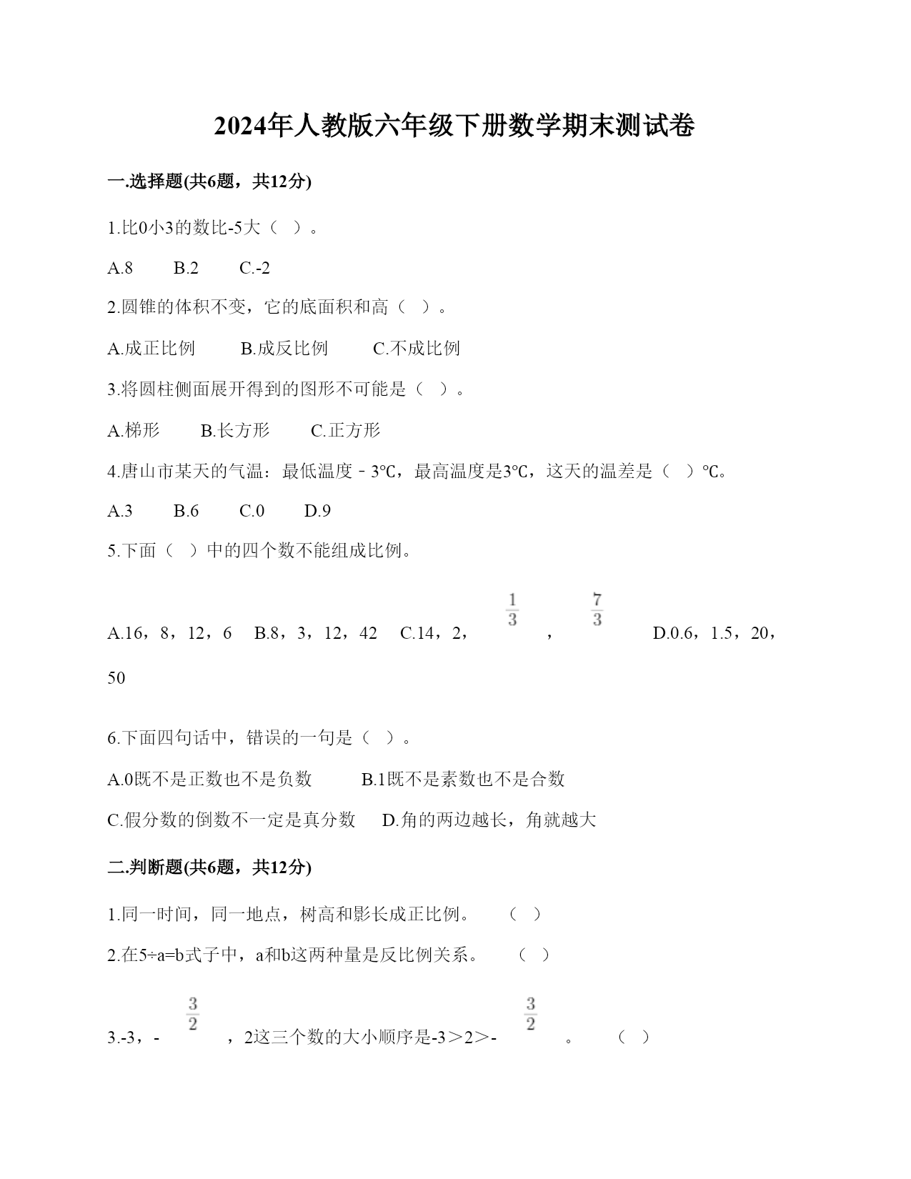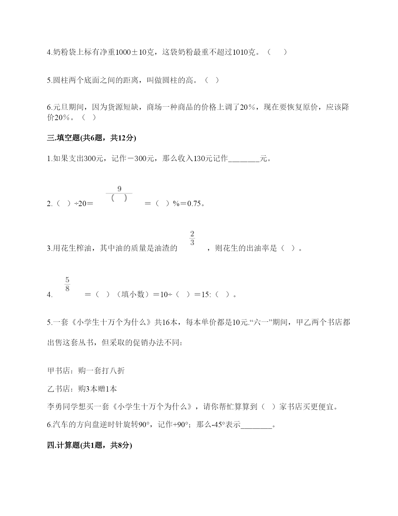2024年人教版六年级下册数学期末测试卷 一.选择题(共6题,共12分) 1.比0小3的数比-5大()。 A.8B.2C.-2 2.圆锥的体积不变,它的底面积和高()。 A.成正比例B.成反比例C.不成比例 3.将圆柱侧面展开得到的图形不可能是()。 A.梯形B.长方形C.正方形 4.唐山市某天的气温:最低温度﹣3℃,最高温度是3℃,这天的温差是()℃。 A.3B.6C.0D.9 5.下面()中的四个数不能组成比例。 A.16,8,12,6B.8,3,12,42C.14,2,,D.0.6,1.5,20,50 6.下面四句话中,错误的一句是()。 A.0既不是正数也不是负数B.1既不是素数也不是合数 C.假分数的倒数不一定是真分数D.角的两边越长,角就越大 二.判断题(共6题,共12分) 1.同一时间,同一地点,树高和影长成正比例。() 2.在5÷a=b式子中,a和b这两种量是反比例关系。() 3.-3,-,2这三个数的大小顺序是-3>2>-。() 4.奶粉袋上标有净重1000±10克,这袋奶粉最重不超过1010克。() 5.圆柱两个底面之间的距离,叫做圆柱的高。() 6.元旦期间,因为货源短缺,商场一种商品的价格上调了20%,现在要恢复原价,应该降价20%。() 三.填空题(共6题,共12分) 1.如果支出300元,记作-300元,那么收入130元记作________元。 2.()÷20==()%=0.75。 3.用花生榨油,其中油的质量是油渣的,则花生的出油率是()。 4.=()(填小数)=10÷()=15:()。 5.一套《小学生十万个为什么》共16本,每本单价都是10元.“六一”期间,甲乙两个书店都出售这套丛书,但采取的促销办法不同: 甲书店:购一套打八折 乙书店:购3本赠1本 李勇同学想买一套《小学生十万个为什么》,请你帮忙算算到()家书店买更便宜。 6.汽车的方向盘逆时针旋转90°,记作+90°;那么-45°表示________。 四.计算题(共1题,共8分) 1.求未知数x。 五.作图题(共1题,共3分) 1.有A、B、C、D、E、F六个小孩比身高,比的结果是:B比A高11厘米,C比D矮1厘米,E比B高2厘米,F比B矮7厘米,比D矮2厘米,在一条数轴上,A、B、E已标出,请你将C、D、F也标在图上。 六.解答题(共6题,共32分) 1.某品牌的文具打折,在A商场打七五折销售,在B商场按“满100元减30元,可累加”的方式销售。爸爸要买一支该品牌标价340元的钢笔,选择哪个商场更省钱? 2.修路队把一条6米宽的道路改造成了8米宽,这条道路拓宽了百分之几? 3.一堆圆锥形黄沙,底面周长是25.12米,高1.5米,每立方米的黄沙重2吨,这堆沙重多少吨? 4.做一个圆柱形的笔筒,底面半径是4厘米,高是10厘米,做这个笔筒至少需要多少平方厘米的铁皮?(保留整数) 5.少年服饰专卖店换季促销,每件半袖原价50元,现在八折销售。小林买了三件,一共花了多少钱? 6.养殖场要建一个圆柱形蓄水池,底面周长是25.12米,高是4米,沿着这个蓄水池的周围及底面抹水泥。如果每平方米用水泥2千克,买400千克水泥够吗? 参考答案 一.选择题 1.B 2.B 3.A 4.B 5. 6.D 二.判断题 1.√ 2.√ 3.× 4.√ 5.√ 6.× 三.填空题 1.130 2.15;12;75 3.40% 4.0.625;16;24 5.乙 6.顺时针旋转45° 四.计算题 1.(1)x=4.1(2)x=64.9(3)x=50(4)x=264 五.作图题 1.解: 六.解答题 1.解:在A商场买的实际花费:340×75%=255(元) 在B商场买的实际花费:340-30×3=250(元) 255元>250元 答:在B商场买更省钱。 2.(8-6)÷6≈33.3%答:这条道路拓宽了33.3%。 3.底面半径:25.12÷3.14÷2=8÷2=4(米) ×3.14×42×1.5 =×3.14×16×1.5 =3.14×16×0.5 =50.24×0.5 =25.12(立方米) 25.12×2=50.24(吨) 答:这堆沙重50.24吨。 4.2×3.14×4×10+3.14×4 =251.2+50.24 =301.44 ≈302(平方厘米) 答:做这个笔筒至少需要302平方厘米的铁皮。 5.解:50×80%×3=120(元)答:一共花了120元。 6.25.12÷3.14÷2=4(米) 3.14×4×4+25.12×4=150.72(平方米) 150.72×2=301.44(千克) 301.44<400 答:买400千克水泥够了。