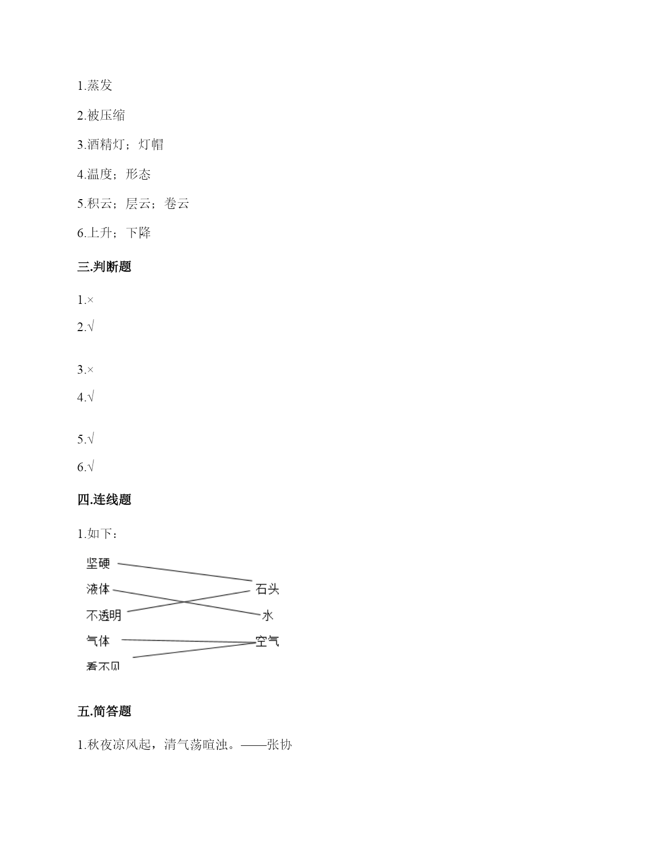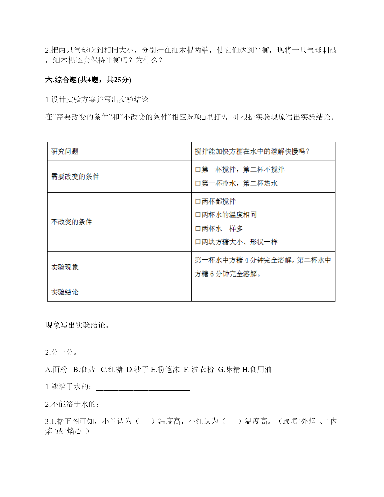 教科版三年级上册科学期末测试卷 一.选择题(共6题,共12分) 1.中国古代利用热空气上升的原理制造了()。 A.火箭B.风筝C.孔明灯 2.温度的高低()食盐在水里溶解的快慢。 A.没有影响B.不一定影响C.无法确定D.影响 3.民间有这样一句谚语:下雪不冷化雪冷。其中包含的科学原理是()。 A.雪融化时会吸收周围的热量,空气的温度就会下降 B.雪融化时会释放冷气 C.雪在融化时温度是不变的,只是人的感觉出了问题 4.代表()。 A.晴朗B.暴雨C.多云 5.我们使用气温计时,下列操作错误的是()。 A.放在阳光照射不到且空气通畅的地方B.等气温计里的液柱停止上升或下降后才读数C.用测得的某一时刻的温度代表这一天的气温 6.给水加热后,水的体积会()。 A.变大B.没有变化C.变小 二.填空题(共6题,共22分) 1.我们常用()的方法分离食盐和水。 2.用力推充满空气的注射器活塞,用手堵住出气口,活塞能够下移,说明空气可以()。 3.使用()不能用燃着的酒精灯点燃其他酒精灯,熄灭酒精灯时要用()盖灭,不能用嘴吹。加热后的烧杯、三脚架在想当长一段时间内仍然很烫,不能用手触摸。 4.水在加热的过程中,()、()等方面会发生变化。 5.根据云的形状可以分为()、()和()。 6.当温度计受热时,液柱会();当温度计受冷时,液柱会()。 三.判断题(共6题,共12分) 1.用酒精灯加热水时,应该用内焰加热,因为内焰的温度最高。() 2.要想分离水中的不溶物可以采用过滤的方法。() 3.在水中不能溶解的物体,也不能溶解在其他液体中。() 4.同一地点不同时间的天气也可能不一样。() 5.空气和水、石头一样,都能占据空间。() 6.空气总是在循环运动的,空气的流动形成风。() 四.连线题(共1题,共5分) 1.填图题 将以下形容物体特征的词汇与对应的物体相连。 坚硬 液体石头 不透明水 气体空气 看不见 五.简答题(共2题,共13分) 1.试用诗歌描述空气的特点? 2.把两只气球吹到相同大小,分别挂在细木棍两端,使它们达到平衡,现将一只气球剌破,细木棍还会保持平衡吗?为什么? 六.综合题(共4题,共25分) 1.设计实验方案并写出实验结论。 在“需要改变的条件”和“不改变的条件”相应选项□里打√,并根据实验现象写出实验结论。 现象写出实验结论。 2.分一分。 A.面粉B.食盐C.红糖D.沙子E.粉笔沫F.洗衣粉G.味精H.食用油 1.能溶于水的:_________________________ 2.不能溶于水的:________________________ 3.1.据下图可知,小兰认为()温度高,小红认为()温度高。(选填“外焰”、“内焰”或“焰心”) 2.该学习小组准备了一根细细的小木棒,用钳子夹住放在火焰上。过了一会儿,拿出木棒,现象如图所示。这个现象说明()温度最高。 A.外焰B.内焰C.焰心 4.某同学为了研究白糖在水中的溶解情况,他把一大包白糖同时倒入100毫升水中充分搅拌后沉淀,杯底沉淀了很多白糖,他认为白糖不能溶解在水中。 (1)要把沉在杯底的白糖从水中分离出来,可以用()的方法从水中分离出来。 (2)你认为他的结论对吗?()。杯底沉淀了很多白糖是因为() 参考答案 一.选择题 1.C 2.D 3.A 4.A 5.C 6.A 二.填空题 1.蒸发 2.被压缩 3.酒精灯;灯帽 4.温度;形态 5.积云;层云;卷云 6.上升;下降 三.判断题 1.× 2.√ 3.× 4.√ 5.√ 6.√ 四.连线题 1.如下: 五.简答题 1.秋夜凉风起,清气荡暄浊。——张协 石宫秋气清,清气宜山谷。——元结 地高形出没,山静气清优。——张籍 高天风雨散,清气在园林。——储光羲 2.不会,因为空气具有质量,所以其中一个气球被刺破后干瘪的气球的质量就会比充了气的气球的质量小,从而导致细木棍不再平移。 六.综合题 1.需要改变的条件:第一杯搅拌,第二杯不搅拌; 不改变的条件:两杯水的温度相同;两杯水一样多;两块方糖大小、形状一样; 实验结论:搅拌可以加快方糖在水中的溶解。 2.BCFG;ADEH 3.外焰;焰心;A 4.过滤;错;一定量的水中能溶解的白糖是有限的