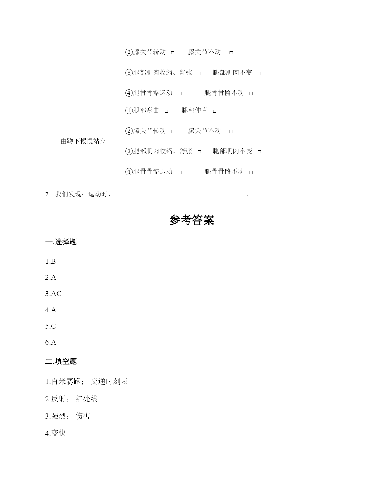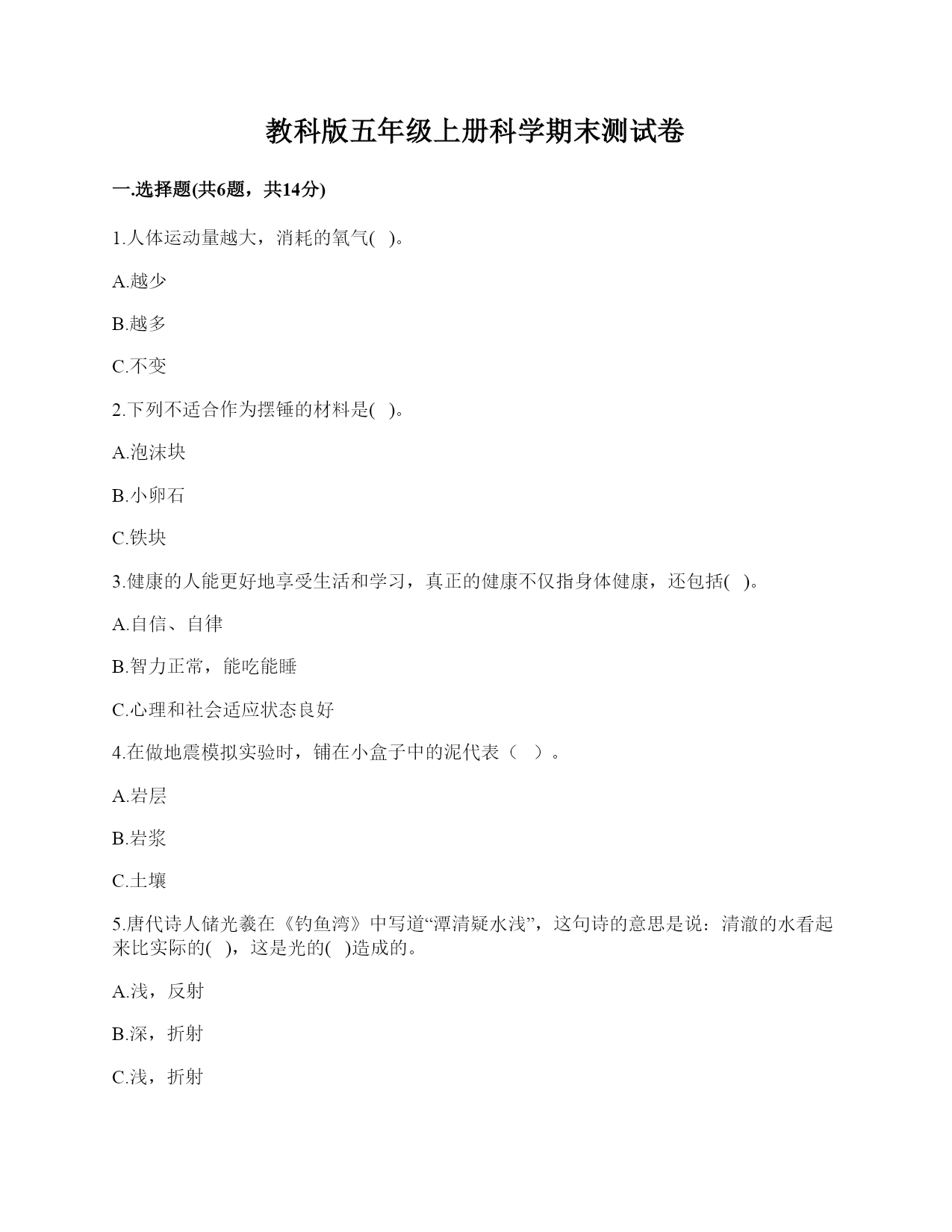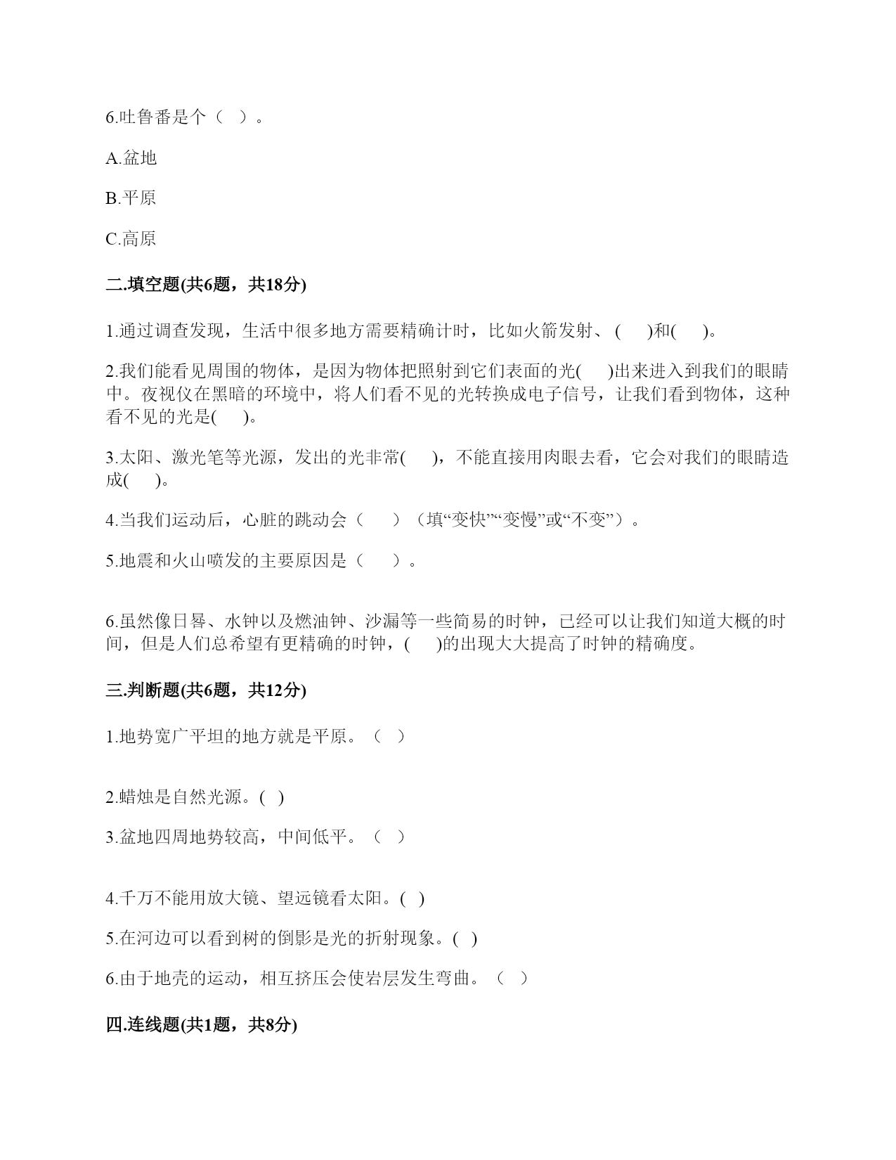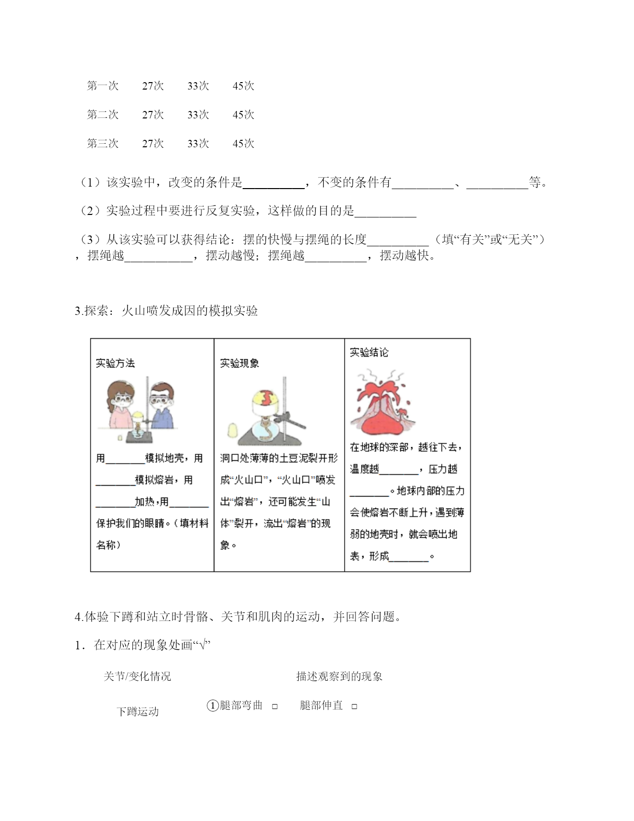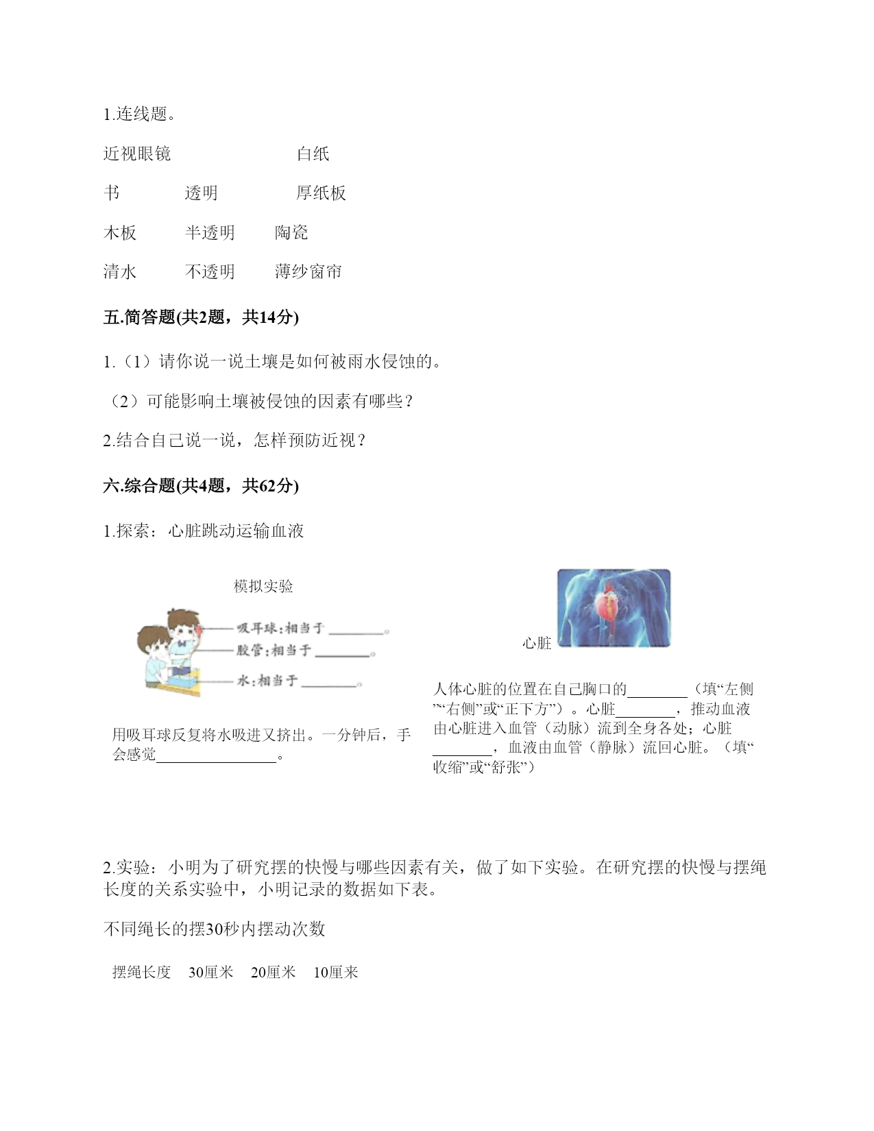 教科版五年级上册科学期末测试卷 一.选择题(共6题,共14分) 1.人体运动量越大,消耗的氧气()。 A.越少 B.越多 C.不变 2.下列不适合作为摆锤的材料是()。 A.泡沫块 B.小卵石 C.铁块 3.健康的人能更好地享受生活和学习,真正的健康不仅指身体健康,还包括()。 A.自信、自律 B.智力正常,能吃能睡 C.心理和社会适应状态良好 4.在做地震模拟实验时,铺在小盒子中的泥代表()。 A.岩层 B.岩浆 C.土壤 5.唐代诗人储光羲在《钓鱼湾》中写道“潭清疑水浅”,这句诗的意思是说:清澈的水看起来比实际的(),这是光的()造成的。 A.浅,反射 B.深,折射 C.浅,折射 6.吐鲁番是个()。 A.盆地 B.平原 C.高原 二.填空题(共6题,共18分) 1.通过调查发现,生活中很多地方需要精确计时,比如火箭发射、()和()。 2.我们能看见周围的物体,是因为物体把照射到它们表面的光()出来进入到我们的眼睛中。夜视仪在黑暗的环境中,将人们看不见的光转换成电子信号,让我们看到物体,这种看不见的光是()。 3.太阳、激光笔等光源,发出的光非常(),不能直接用肉眼去看,它会对我们的眼睛造成()。 4.当我们运动后,心脏的跳动会()(填“变快”“变慢”或“不变”)。 5.地震和火山喷发的主要原因是()。 6.虽然像日晷、水钟以及燃油钟、沙漏等一些简易的时钟,已经可以让我们知道大概的时间,但是人们总希望有更精确的时钟,()的出现大大提高了时钟的精确度。 三.判断题(共6题,共12分) 1.地势宽广平坦的地方就是平原。() 2.蜡烛是自然光源。() 3.盆地四周地势较高,中间低平。() 4.千万不能用放大镜、望远镜看太阳。() 5.在河边可以看到树的倒影是光的折射现象。() 6.由于地壳的运动,相互挤压会使岩层发生弯曲。() 四.连线题(共1题,共8分) 1.连线题。 近视眼镜 白纸 书 透明 厚纸板 木板 半透明 陶瓷 清水 不透明 薄纱窗帘 五.简答题(共2题,共14分) 1.(1)请你说一说土壤是如何被雨水侵蚀的。 (2)可能影响土壤被侵蚀的因素有哪些? 2.结合自己说一说,怎样预防近视? 六.综合题(共4题,共62分) 1.探索:心脏跳动运输血液 模拟实验 用吸耳球反复将水吸进又挤出。一分钟后,手会感觉________________。心脏 人体心脏的位置在自己胸口的________(填“左侧”“右侧”或“正下方”)。心脏________,推动血液由心脏进入血管(动脉)流到全身各处;心脏________,血液由血管(静脉)流回心脏。(填“收缩”或“舒张”) 2.实验:小明为了研究摆的快慢与哪些因素有关,做了如下实验。在研究摆的快慢与摆绳长度的关系实验中,小明记录的数据如下表。 不同绳长的摆30秒内摆动次数 摆绳长度30厘米20厘米10厘来第一次27次33次45次第二次27次33次45次第三次27次33次45次(1)该实验中,改变的条件是__________,不变的条件有__________、__________等。 (2)实验过程中要进行反复实验,这样做的目的是__________ (3)从该实验可以获得结论:摆的快慢与摆绳的长度__________(填“有关”或“无关”),摆绳越___________,摆动越慢;摆绳越__________,摆动越快。 3.探索:火山喷发成因的模拟实验 4.体验下蹲和站立时骨骼、关节和肌肉的运动,并回答问题。 1.在对应的现象处画“√” 关节/变化情况描述观察到的现象下蹲运动①腿部弯曲□腿部伸直□ ②膝关节转动□膝关节不动□ ③腿部肌肉收缩、舒张□腿部肌肉不变□ ④腿骨骨骼运动□腿骨骨骼不动□由蹲下慢慢站立①腿部弯曲□腿部伸直□ ②膝关节转动□膝关节不动□ ③腿部肌肉收缩、舒张□腿部肌肉不变□ ④腿骨骨骼运动□腿骨骨骼不动□2.我们发现:运动时,________________________________________。 参考答案 一.选择题 1.B 2.A 3.AC 4.A 5.C 6.A 二.填空题 1.百米赛跑;交通时刻表 2.反射;红处线 3.强烈;伤害 4.变快 5.地壳运动 6.摆钟 三.判断题 1.× 2.× 3.√ 4.√ 5.× 6.√ 四.连线题 1. 五.简答题 1.(1)雨点降落时的力可以打散并溅起土壤的微粒,雨水在地面流动时,携走了这些微粒,一部分土壤便被带走了。 (2)有无植被覆盖、坡度大小、降雨量大小等。 2.答:①乘车时不要看书。 ②不要在强光下看书。 ③读书写字时离书本不能太近,要保持一市尺左右的距离。 ④经常做眼保健操。 六.综合题 1.心脏血管血液很累 左侧收缩舒张 2.摆绳长度摆锤质量摆动幅度 避免实验的偶然性,减小误差,使实验更准