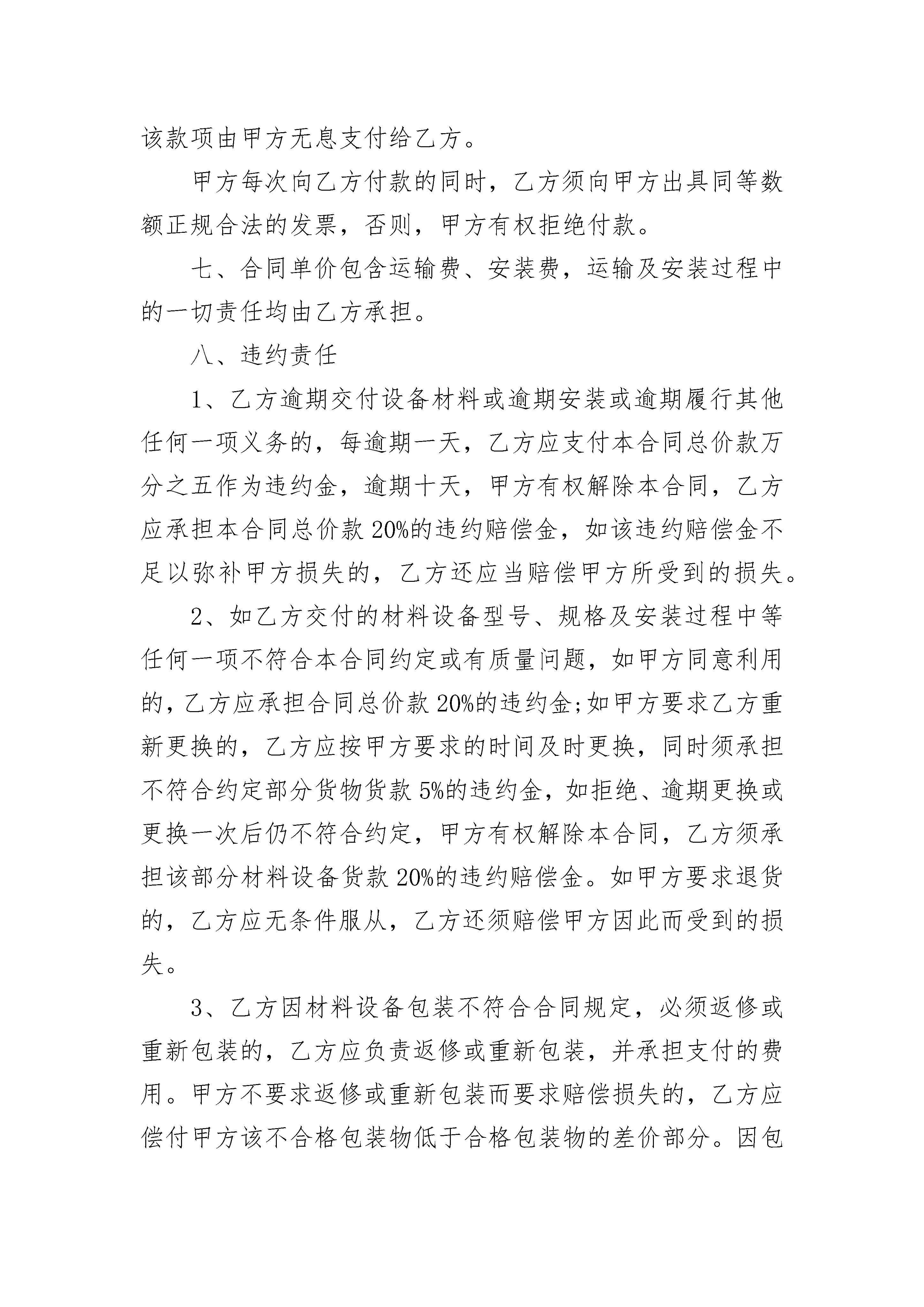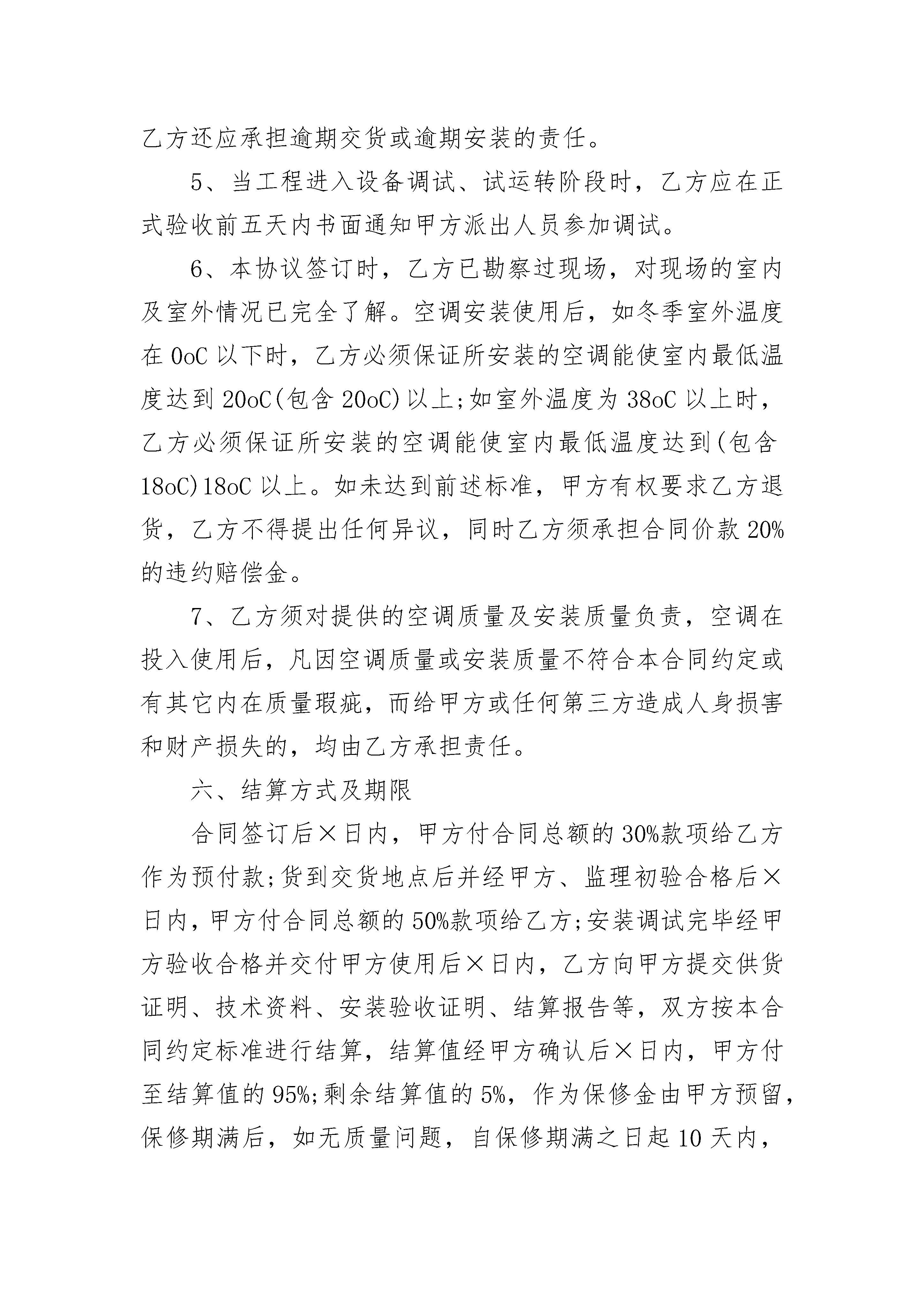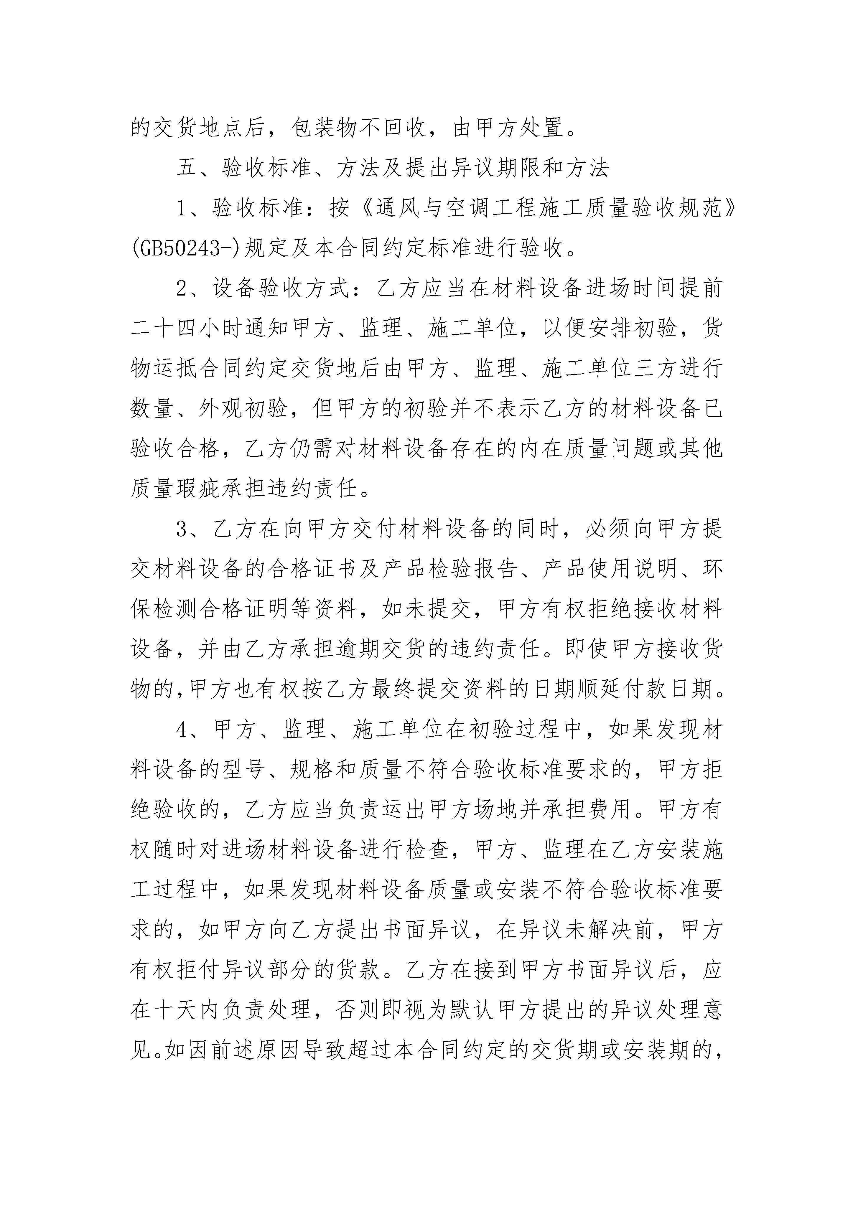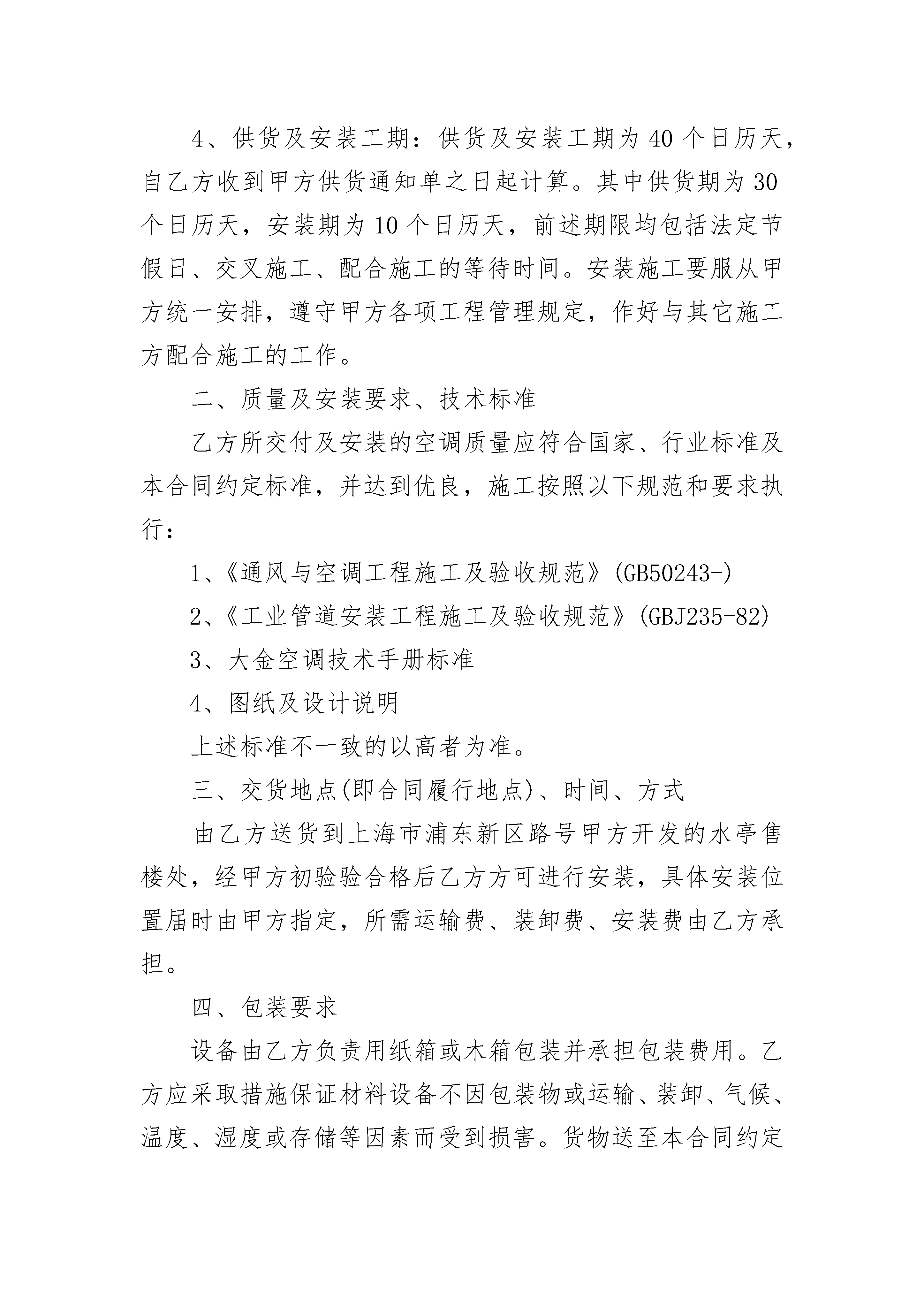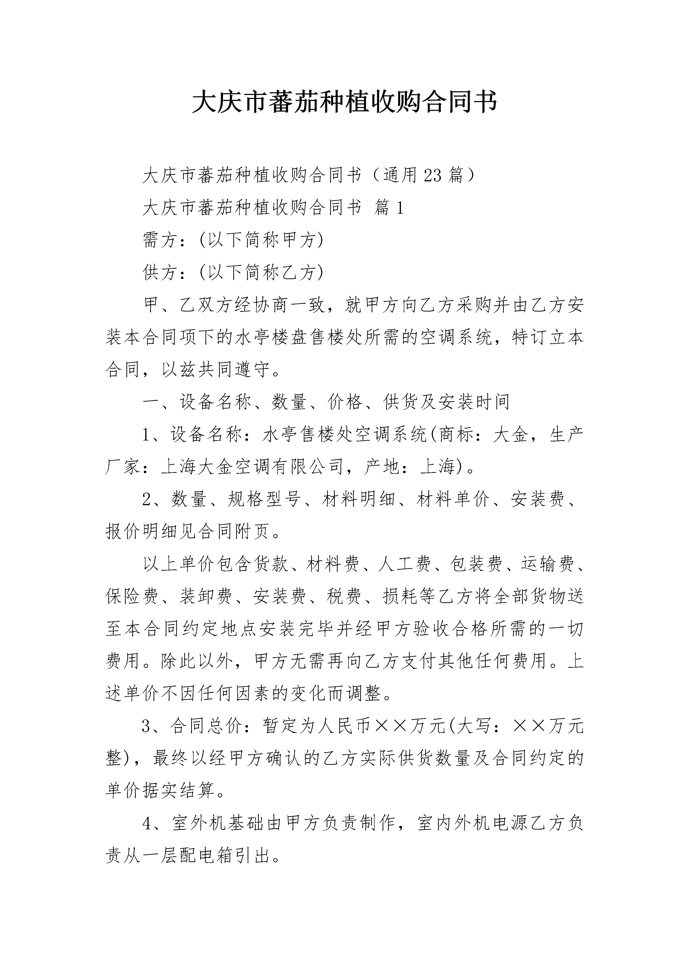 大庆市蕃茄种植收购合同书大庆市蕃茄种植收购合同书(通用23篇)大庆市蕃茄种植收购合同书篇1需方:(以下简称甲方)供方:(以下简称乙方)甲、乙双方经协商一致,就甲方向乙方采购并由乙方安装本合同项下的水亭楼盘售楼处所需的空调系统,特订立本合同,以兹共同遵守。一、设备名称、数量、价格、供货及安装时间1、设备名称:水亭售楼处空调系统(商标:大金,生产厂家:上海大金空调有限公司,产地:上海)。2、数量、规格型号、材料明细、材料单价、安装费、报价明细见合同附页。以上单价包含货款、材料费、人工费、包装费、运输费、保险费、装卸费、安装费、税费、损耗等乙方将全部货物送至本合同约定地点安装完毕并经甲方验收合格所需的一切费用。除此以外,甲方无需再向乙方支付其他任何费用。上述单价不因任何因素的变化而调整。3、合同总价:暂定为人民币××万元(大写:××万元整),最终以经甲方确认的乙方实际供货数量及合同约定的单价据实结算。4、室外机基础由甲方负责制作,室内外机电源乙方负责从一层配电箱引出。4、供货及安装工期:供货及安装工期为40个日历天,自乙方收到甲方供货通知单之日起计算。其中供货期为30个日历天,安装期为10个日历天,前述期限均包括法定节假日、交叉施工、配合施工的等待时间。安装施工要服从甲方统一安排,遵守甲方各项工程管理规定,作好与其它施工方配合施工的工作。二、质量及安装要求、技术标准乙方所交付及安装的空调质量应符合国家、行业标准及本合同约定标准,并达到优良,施工按照以下规范和要求执行:1、《通风与空调工程施工及验收规范》(GB50243-)2、《工业管道安装工程施工及验收规范》(GBJ235-82)3、大金空调技术手册标准4、图纸及设计说明上述标准不一致的以高者为准。三、交货地点(即合同履行地点)、时间、方式由乙方送货到上海市浦东新区路号甲方开发的水亭售楼处,经甲方初验验合格后乙方方可进行安装,具体安装位置届时由甲方指定,所需运输费、装卸费、安装费由乙方承担。四、包装要求设备由乙方负责用纸箱或木箱包装并承担包装费用。乙方应采取措施保证材料设备不因包装物或运输、装卸、气候、温度、湿度或存储等因素而受到损害。货物送至本合同约定的交货地点后,包装物不回收,由甲方处置。五、验收标准、方法及提出异议期限和方法1、验收标准:按《通风与空调工程施工质量验收规范》(GB50243-)规定及本合同约定标准进行验收。2、设备验收方式:乙方应当在材料设备进场时间提前二十四小时通知甲方、监理、施工单位,以便安排初验,货物运抵合同约定交货地后由甲方、监理、施工单位三方进行数量、外观初验,但甲方的初验并不表示乙方的材料设备已验收合格,乙方仍需对材料设备存在的内在质量问题或其他质量瑕疵承担违约责任。3、乙方在向甲方交付材料设备的同时,必须向甲方提交材料设备的合格证书及产品检验报告、产品使用说明、环保检测合格证明等资料,如未提交,甲方有权拒绝接收材料设备,并由乙方承担逾期交货的违约责任。即使甲方接收货物的,甲方也有权按乙方最终提交资料的日期顺延付款日期。4、甲方、监理、施工单位在初验过程中,如果发现材料设备的型号、规格和质量不符合验收标准要求的,甲方拒绝验收的,乙方应当负责运出甲方场地并承担费用。甲方有权随时对进场材料设备进行检查,甲方、监理在乙方安装施工过程中,如果发现材料设备质量或安装不符合验收标准要求的,如甲方向乙方提出书面异议,在异议未解决前,甲方有权拒付异议部分的货款。乙方在接到甲方书面异议后,应在十天内负责处理,否则即视为默认甲方提出的异议处理意见。如因前述原因导致超过本合同约定的交货期或安装期的,乙方还应承担逾期交货或逾期安装的责任。5、当工程进入设备调试、试运转阶段时,乙方应在正式验收前五天内书面通知甲方派出人员参加调试。6、本协议签订时,乙方已勘察过现场,对现场的室内及室外情况已完全了解。空调安装使用后,如冬季室外温度在0oC以下时,乙方必须保证所安装的空调能使室内最低温度达到20oC(包含20oC)以上;如室外温度为38oC以上时,乙方必须保证所安装的空调能使室内最低温度达到(包含18oC)18oC以上。如未达到前述标准,甲方有权要求乙方退货,乙方不得提出任何异议,同时乙方须承担合同价款20%的违约赔偿金。7、乙方须对提供的空调质量及安装质量负责,空调在投入使用后,凡因空调质量或安装质量不符合本合同约定或有其它内在质量瑕疵,而给甲方或任何第三方造成人身损害和财产损失的,均由乙方承担责任。六、结算方式及期限合同签订后×日内,甲方付合同总额的30%款项给乙方作为预付款;货到交货地点后并经甲方、监理初验合格后×日内,甲方付合同总额的50%款项给乙方;安装调试完毕经甲方验收合格并交付甲方使用后×日内,乙方向甲方提交供货证明、技术资料、安装验收证明、结算报告等,双方按