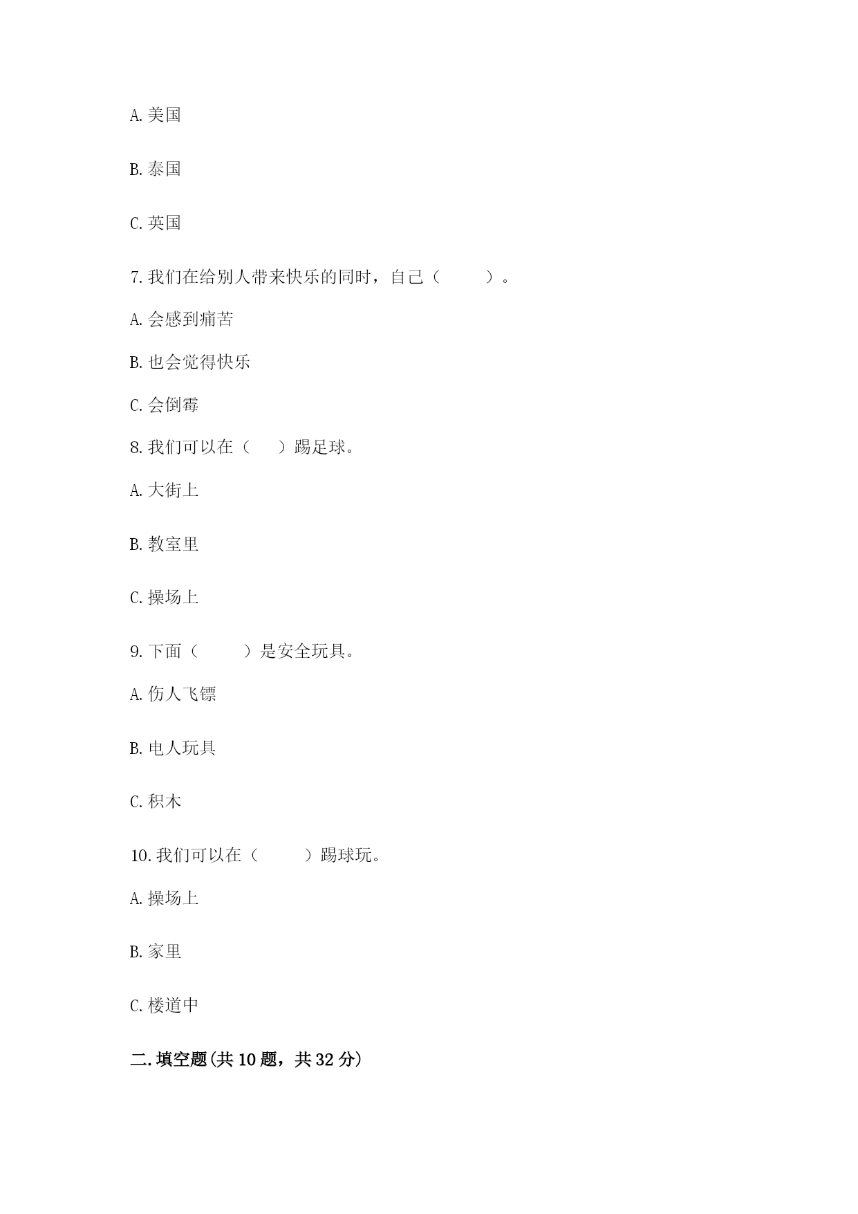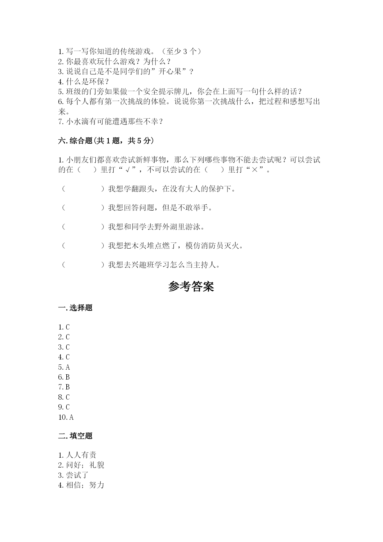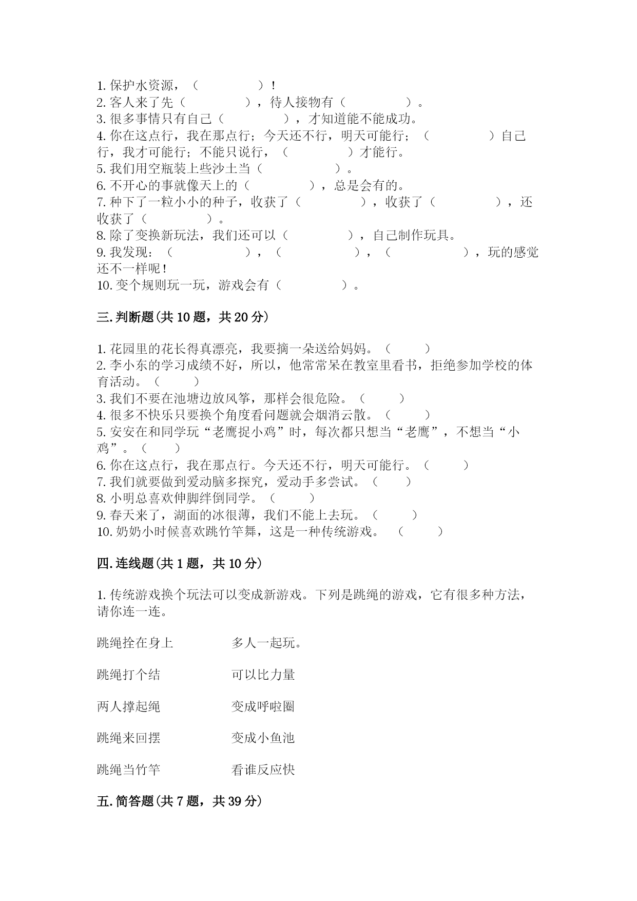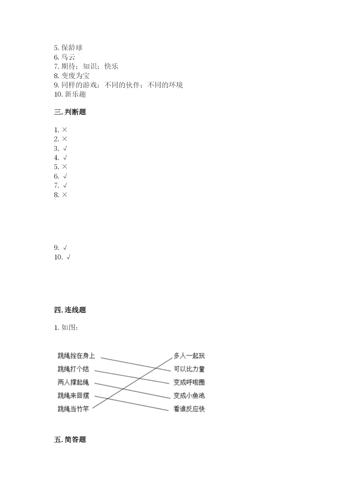 部编版道德与法治二年级下册期末测试卷 一.选择题(共10题,共20分) 1.让自己开心的小窍门有()。 A.让妈妈给自己买一个昂贵的玩具 B.找到那个让自己不开心的人打一架 C.和好朋友说一说,出去玩玩 2.我第一次学洗衣服,心情有点儿()。 A.忧伤 B.悲伤 C.紧张 3.这位同学说:“我假期学会了骑(),非常高兴!” A.轮滑 B.滑雪 C.自行车 4.同桌美美哭了,我不应该()。 A.让她说出不开心的事 B.讲笑话逗她开心 C.装作没听见 5.每天坚持打扫卫生就会()。 A.有一个干净的屋子 B.提高学习效率 C.非常劳累,对身体不好 6.椰壳鞋游戏是()国家的游戏。 A.美国 B.泰国 C.英国 7.我们在给别人带来快乐的同时,自己()。 A.会感到痛苦 B.也会觉得快乐 C.会倒霉 8.我们可以在()踢足球。 A.大街上 B.教室里 C.操场上 9.下面()是安全玩具。 A.伤人飞镖 B.电人玩具 C.积木 10.我们可以在()踢球玩。 A.操场上 B.家里 C.楼道中 二.填空题(共10题,共32分) 1.保护水资源,()! 2.客人来了先(),待人接物有()。 3.很多事情只有自己(),才知道能不能成功。 4.你在这点行,我在那点行;今天还不行,明天可能行;()自己行,我才可能行;不能只说行,()才能行。 5.我们用空瓶装上些沙土当()。 6.不开心的事就像天上的(),总是会有的。 7.种下了一粒小小的种子,收获了(),收获了(),还收获了()。 8.除了变换新玩法,我们还可以(),自己制作玩具。 9.我发现:(),(),(),玩的感觉还不一样呢! 10.变个规则玩一玩,游戏会有()。 三.判断题(共10题,共20分) 1.花园里的花长得真漂亮,我要摘一朵送给妈妈。() 2.李小东的学习成绩不好,所以,他常常呆在教室里看书,拒绝参加学校的体育活动。() 3.我们不要在池塘边放风筝,那样会很危险。() 4.很多不快乐只要换个角度看问题就会烟消云散。() 5.安安在和同学玩“老鹰捉小鸡”时,每次都只想当“老鹰”,不想当“小鸡”。() 6.你在这点行,我在那点行。今天还不行,明天可能行。() 7.我们就要做到爱动脑多探究,爱动手多尝试。() 8.小明总喜欢伸脚绊倒同学。() 9.春天来了,湖面的冰很薄,我们不能上去玩。() 10.奶奶小时候喜欢跳竹竿舞,这是一种传统游戏。() 四.连线题(共1题,共10分) 1.传统游戏换个玩法可以变成新游戏。下列是跳绳的游戏,它有很多种方法,请你连一连。 跳绳拴在身上多人一起玩。 跳绳打个结可以比力量 两人撑起绳变成呼啦圈 跳绳来回摆变成小鱼池 跳绳当竹竿看谁反应快 五.简答题(共7题,共39分) 1.写一写你知道的传统游戏。(至少3个) 2.你最喜欢玩什么游戏?为什么? 3.说说自己是不是同学们的”开心果”? 4.什么是环保? 5.班级的门旁如果做一个安全提示牌儿,你会在上面写一句什么样的话? 6.每个人都有第一次挑战的体验。说说你第一次挑战什么,把过程和感想写出来。 7.小水滴有可能遭遇那些不幸? 六.综合题(共1题,共5分) 1.小朋友们都喜欢尝试新鲜事物,那么下列哪些事物不能去尝试呢?可以尝试的在()里打“√”,不可以尝试的在()里打“×”。 ()我想学翻跟头,在没有大人的保护下。 ()我想回答问题,但是不敢举手。 ()我想和同学去野外湖里游泳。 ()我想把木头堆点燃了,模仿消防员灭火。 ()我想去兴趣班学习怎么当主持人。 参考答案 一.选择题 1.C 2.C 3.C 4.C 5.A 6.B 7.B 8.C 9.C 10.A 二.填空题 1.人人有责 2.问好;礼貌 3.尝试了 4.相信;努力 5.保龄球 6.乌云 7.期待;知识;快乐 8.变废为宝 9.同样的游戏;不同的伙伴;不同的环境 10.新乐趣 三.判断题 1.× 2.× 3.√ 4.√ 5.× 6.√ 7.√ 8.× 9.√ 10.√ 四.连线题 1.如图: 五.简答题 1.捉迷藏:小时侯每天晚上和小伙伴们一起玩捉迷藏,我们也叫它“藏猫猫”;跳皮筋:女孩子们喜欢玩的游戏;踢毽子:小时候踢的鸡毛毽子都是自己做;扔沙包:小时侯经常玩,课间十分钟也要跑到教室外边玩一会。传统游戏还包括放风筝、打角螺、弹弓、跳房子、看西湖景、跳绳子、拈石子、老婆拳、老鹰担鸡、斗蟋蟀、滚铁环、解绷绷、捉迷藏、骑马马、拔纸牌、折纸、七巧板、变虎猫、剪纸、跳皮筋、老鹰捉小鸡等。 2.我最喜欢玩老鹰捉小鸡的游戏,这样可以增进我和同学们之间的默契和感情。 3.我觉得我是。因为我会主动帮助有困难的同学,还经常讲笑话逗大家开心。 4.(1)环保就是爱护环境。(2)环保就是节约不浪费。 5.答:(答案不唯一) ①轻声关门。 ②请不要在门口打闹。