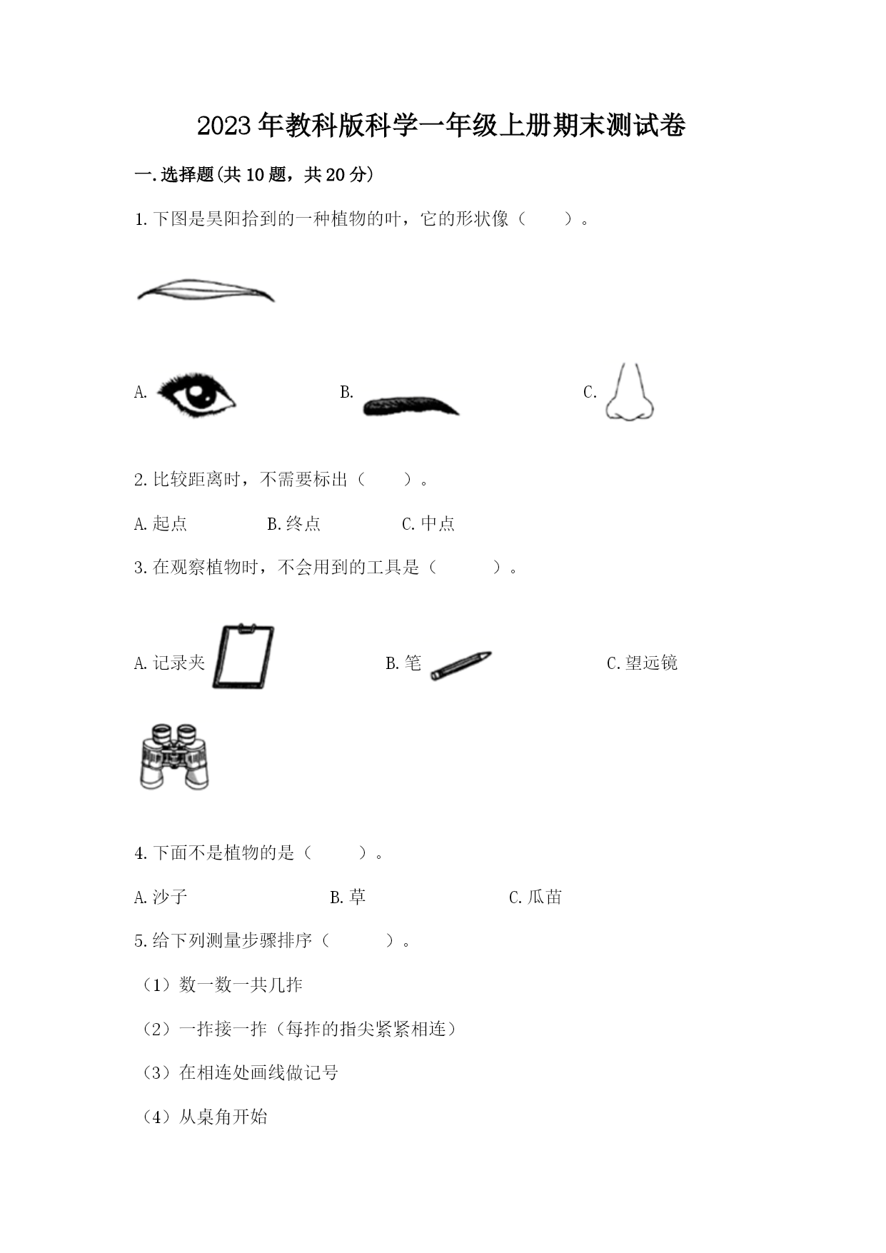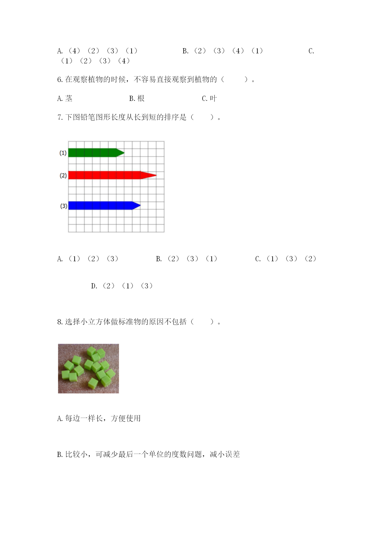 2023年教科版科学一年级上册期末测试卷 一.选择题(共10题,共20分) 1.下图是昊阳拾到的一种植物的叶,它的形状像()。 A.B.C. 2.比较距离时,不需要标出()。 A.起点B.终点C.中点 3.在观察植物时,不会用到的工具是()。 A.记录夹B.笔C.望远镜 4.下面不是植物的是()。 A.沙子B.草C.瓜苗 5.给下列测量步骤排序()。 (1)数一数一共几拃 (2)一拃接一拃(每拃的指尖紧紧相连) (3)在相连处画线做记号 (4)从桌角开始 A.(4)(2)(3)(1)B.(2)(3)(4)(1)C.(1)(2)(3)(4) 6.在观察植物的时候,不容易直接观察到植物的()。 A.茎B.根C.叶 7.下图铅笔图形长度从长到短的排序是()。 A.(1)(2)(3)B.(2)(3)(1)C.(1)(3)(2)D.(2)(1)(3) 8.选择小立方体做标准物的原因不包括()。 A.每边一样长,方便使用 B.比较小,可减少最后一个单位的度数问题,减小误差 C.方便粘在一起 D.只用一个小立方体,会降低测量的速度 9.为了比赛公平,在纸青蛙跳远比赛时,我们需要给他们一个()起点。 A.相同B.不同 10.我们观察到校园里松树的叶是()。 A.针形的B.扇形的C.椭圆形的 二.填空题(共10题,共50分) 1.西瓜里的水分主要是由生长在()的根吸收来的。 2.长度的国际单位是(),测量物体长度的基本工具是()。 3.食盐和沙混合在一起,我们利用(),通过()和()的方法能将食盐与沙分离。 4.共同的()是公平比较的基础。 5.能够溶解于水中的物质有很多,如()、()、()、()、()、()等,在相同条件下,不同物质在水中的溶解能力(),通过()实验,我们知道在同样多的水中,食盐比小苏打溶解的要()。同样多的水中,食盐和小苏打溶解的量是()。 6.植物的生长需要()、()、()等。 7.想要直观的比较测量结果的长短,需要用()的标准物来测量。 8.用尺子测量物体时,要把尺子的()刻度线与物体的一端对齐。 9.想要直观地比较测量结果的长短,需要用()(填“相同”或“不同”)的标准物来测量。 10.一拃是指()和()之间的距离。 三.判断题(共10题,共20分) 1.在跳远比赛中,只有用尺才能比较距离。() 2.大人和小孩的“一拃”长度是一样的。() 3.小明同学说“跳远比赛的时候,我们可以不在同一条起点线跳。”() 4.纸蛙跳多次太麻烦,跳一次的距离就能代表比赛的结果。() 5.到校园里去观察和认识植物,不拔起、不采摘、不伤害植物。() 6.我可以爬上树摘叶子观察。() 7.预测是测量之后要做的一步。() 8.黑板上画的花是活的植物。() 9.纸带上的小格可以不相同。() 10.在做比较时要按照一个标准进行比较。() 四.连线题(共1题,共6分) 1.请你将下面的植物与相应名称用线连接起来。 五.填表题(共1题,共6分) 1.比较一下,油菜和柳树这两种植物有什么不同?画掉表中不正确的词语。 六.简答题(共2题,共11分) 1.在测量时怎样保证单位长度一样呢?请同学们课后进行思考,并填写活动手册。 2.想一想,你在种养植物时,都为植物做了那些事情?写一写。 七.综合题(共4题,共23分) 1.下面三位同学在用自己的方法测量绳子的长度。 (1)他们测出的结果(),因为他们的长度单位()。(填“相同”或“不同”) (2)要测量一本书的长度,应用图()中的方法。 (3)要测量一棵大树的粗细,不能用图()中的方法。 2.同学们在用纸带测量桌子的高度,正确的测量顺序是()。 ①剪下纸带;②用纸带测高度;③得出测量结果;④合作用拃测量 3.丽丽和天天进行纸蛙跳远比赛,下面是他们比赛的情况。 (1)第一次比赛,谁的纸蛙跳得远?() (2)第二次比赛,谁的纸蛙跳得远?() (3)第三次比赛,谁的纸蛙跳得远?() (4)通过三次比赛,谁的纸蛙赢了比赛?() 4.请你帮下面的这棵树找到它的树叶。 这是一棵()。 A.杨树B.松树C.梧桐树 通过观察,我发现这棵树的叶子是()的。 A.针形B.扇形C.椭圆形 由此我推断()是这棵树的叶子。 A.B.C. 参考答案 一.选择题 1.B 2.C 3.C 4.A 5.A 6.B 7.B 8.D 9.A 10.A 二.填空题 1.地下 2.米;刻度尺 3.水;过滤;蒸发 4.起始线 5.食盐;小苏打;白糖;味精;碱面;红糖;不同;对比;多;不同的 6.阳光;空气;水 7.相同 8.零 9.相同 10.拇指;中指 三.判断题 1.× 2.× 3.× 4.× 5.√ 6.× 7.× 8.× 9.× 10.√ 四.连线题 1.如图: 五.填表题 1.划去:粗细、粗细、小大 六.简答题 1.使用标准