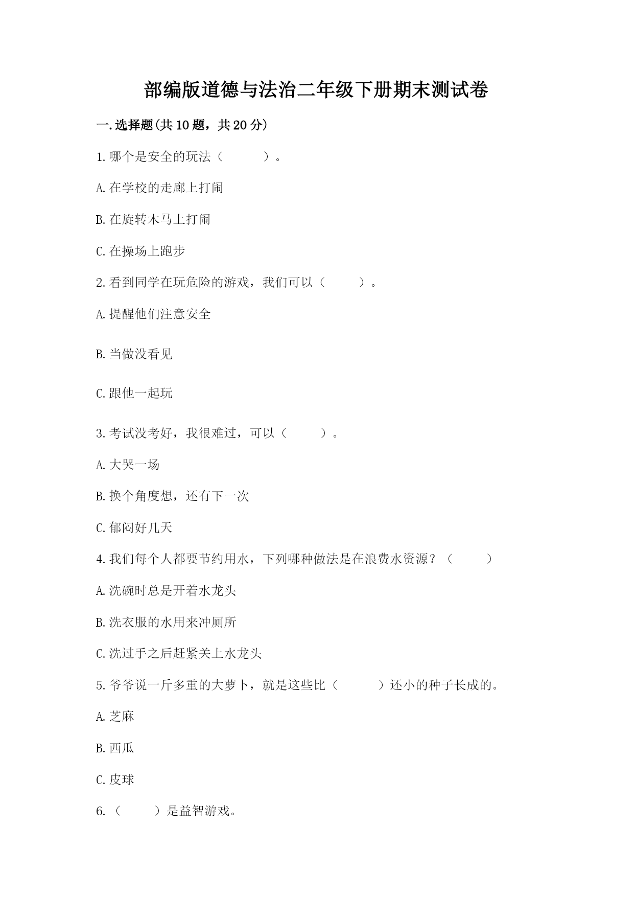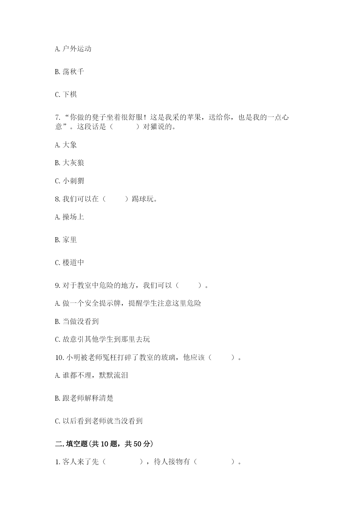 部编版道德与法治二年级下册期末测试卷 一.选择题(共10题,共20分) 1.哪个是安全的玩法()。 A.在学校的走廊上打闹 B.在旋转木马上打闹 C.在操场上跑步 2.看到同学在玩危险的游戏,我们可以()。 A.提醒他们注意安全 B.当做没看见 C.跟他一起玩 3.考试没考好,我很难过,可以()。 A.大哭一场 B.换个角度想,还有下一次 C.郁闷好几天 4.我们每个人都要节约用水,下列哪种做法是在浪费水资源?() A.洗碗时总是开着水龙头 B.洗衣服的水用来冲厕所 C.洗过手之后赶紧关上水龙头 5.爷爷说一斤多重的大萝卜,就是这些比()还小的种子长成的。 A.芝麻 B.西瓜 C.皮球 6.()是益智游戏。 A.户外运动 B.荡秋千 C.下棋 7.“你做的凳子坐着很舒服!这是我采的苹果,送给你,也是我的一点心意”。这段话是()对獾说的。 A.大象 B.大灰狼 C.小刺猬 8.我们可以在()踢球玩。 A.操场上 B.家里 C.楼道中 9.对于教室中危险的地方,我们可以()。 A.做一个安全提示牌,提醒学生注意这里危险 B.当做没看到 C.故意引其他学生到那里去玩 10.小明被老师冤枉打碎了教室的玻璃,他应该()。 A.谁都不理,默默流泪 B.跟老师解释清楚 C.以后看到老师就当没看到 二.填空题(共10题,共50分) 1.客人来了先(),待人接物有()。 2.即使是安全健康的游戏,玩时也要考虑一些()情况。 3.坚持能让我们克服(),让我们有更多的收获。 4.我不仅要让自己成为(),还希望带给身边的人(),成为大家的()。 5.我们在玩游戏时,制订的游戏规则要()。 6.多尝试,多(),大家一起来挑战。挑战后才发现,其实没有那么()。 7.()只是第一步,还要细心呵护,()、()、()才会有收获。 8.我们用()做()。我们用()来画棋盘,给大家用。 9.我了解到的传统游戏有()、()、()、()、()、()、()等。 10.我们可以试试别的国家小朋友的玩法,但是要注意()。 三.判断题(共10题,共20分) 1.李东今天很快乐,因为他在别人的衣服上画了一幅漫画。() 2.电脑游戏新鲜刺激真好玩。() 3.小明洗完手,没关水龙头就走了。() 4.坚持好习惯,努力改掉坏习惯。() 5.小水壶可以反复用,它是我的环保搭档。() 6.其他国家的传统游戏,我们也可以试一试。() 7.只要我自己快乐就行了,周围的人快乐不快乐都不重要。() 8.户外运动绿色健康,我们要在大人的带领下多多参加。() 9.我常和小朋友们玩捉迷藏。() 10.每个国家都有自己的传统游戏,椰壳鞋是印度的传统游戏。() 四.连线题(共1题,共10分) 1.传统游戏换个玩法可以变成新游戏。下列是跳绳的游戏,它有很多种方法,请你连一连。 跳绳拴在身上多人一起玩。 跳绳打个结可以比力量 两人撑起绳变成呼啦圈 跳绳来回摆变成小鱼池 跳绳当竹竿看谁反应快 五.简答题(共7题,共40分) 1.生活中我们应该怎样节约用水? 2.这一单元你都学习了哪几个绘本故事,名称是什么? 3.在你种植的过程中一定有很多小收获,请你说一说同学们都有那些收获? 4.珍惜水的好主意有哪些? 5.写写自己的种植日记? 6.当你不开心的时候,你会用哪些方式来化解不良情绪?(至少写两样) 7.我们能为保护空气做些什么? 六.综合题(共1题,共5分) 1.纸说:如果人们把我当朋友,爱惜我,我就会很高兴;如果大家不珍惜我,我就会很痛苦。请你在正确的做法的()里打上“√”。 ()才写了几个字就扔掉,真浪费! ()几个小朋友在公园儿里面折纸飞机,把一本书的书都撕没了。 ()爸爸去完洗手间用纸巾擦纸扔了一地。 ()收集还可以用的纸,把他们码好、装订、剪齐,写上名字就可以用了。 参考答案 一.选择题 1.C 2.A 3.B 4.A 5.A 6.C 7.C 8.A 9.A 10.B 二.填空题 1.问好;礼貌 2.实际情况 3.困难 4.“快乐鸟”;快乐;“开心果” 5.遵守 6.练习;难 7.播种;除草;施肥;浇水 8.纸片;棋子;硬纸壳 9.编花篮;挤油油;抓石子;竹蜻蜓;翻花绳;兰蛐蛐;跳大绳 10.安全 三.判断题 1.× 2.× 3.× 4.√ 5.√ 6.√ 7.× 8.√ 9.√ 10.× 四.连线题 1.如图: 五.简答题 1.洗脸水用后可以洗脚,然后冲厕所;家中应预备一个收集废水的大桶,它完全可以保证冲厕所需要的水量;淘米水、煮过面条的水,用来洗碗筷,去油又节水;养鱼的水浇花,能促进花木生长。 2.答:①《咪咪学本领 ②《“神童”才可以吗?》 ③《青蛙看海》 ④《小刺猬和獾》 3.答案不唯一①这是我种的土豆的照片,瞧,土豆苗多可爱呀!②爷爷说不能天天浇水也不能心急。③花生苗的力量真大呀,能把好