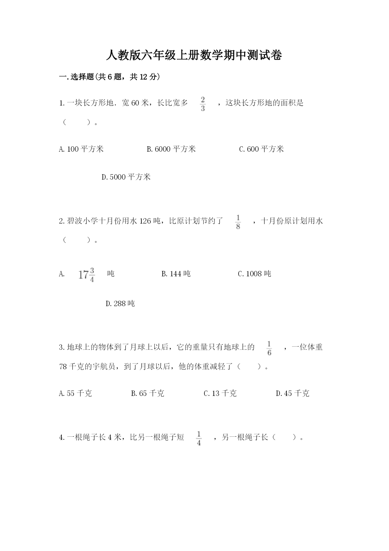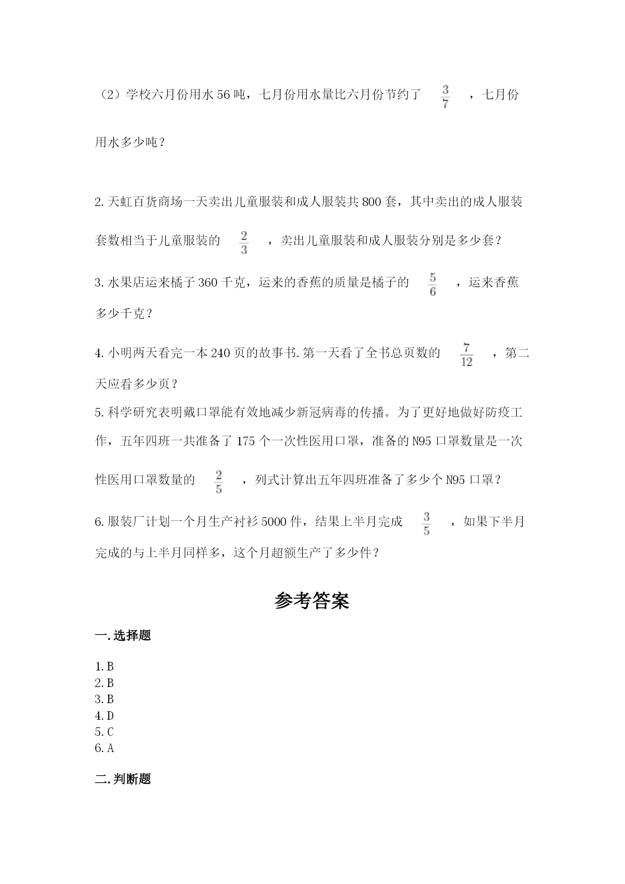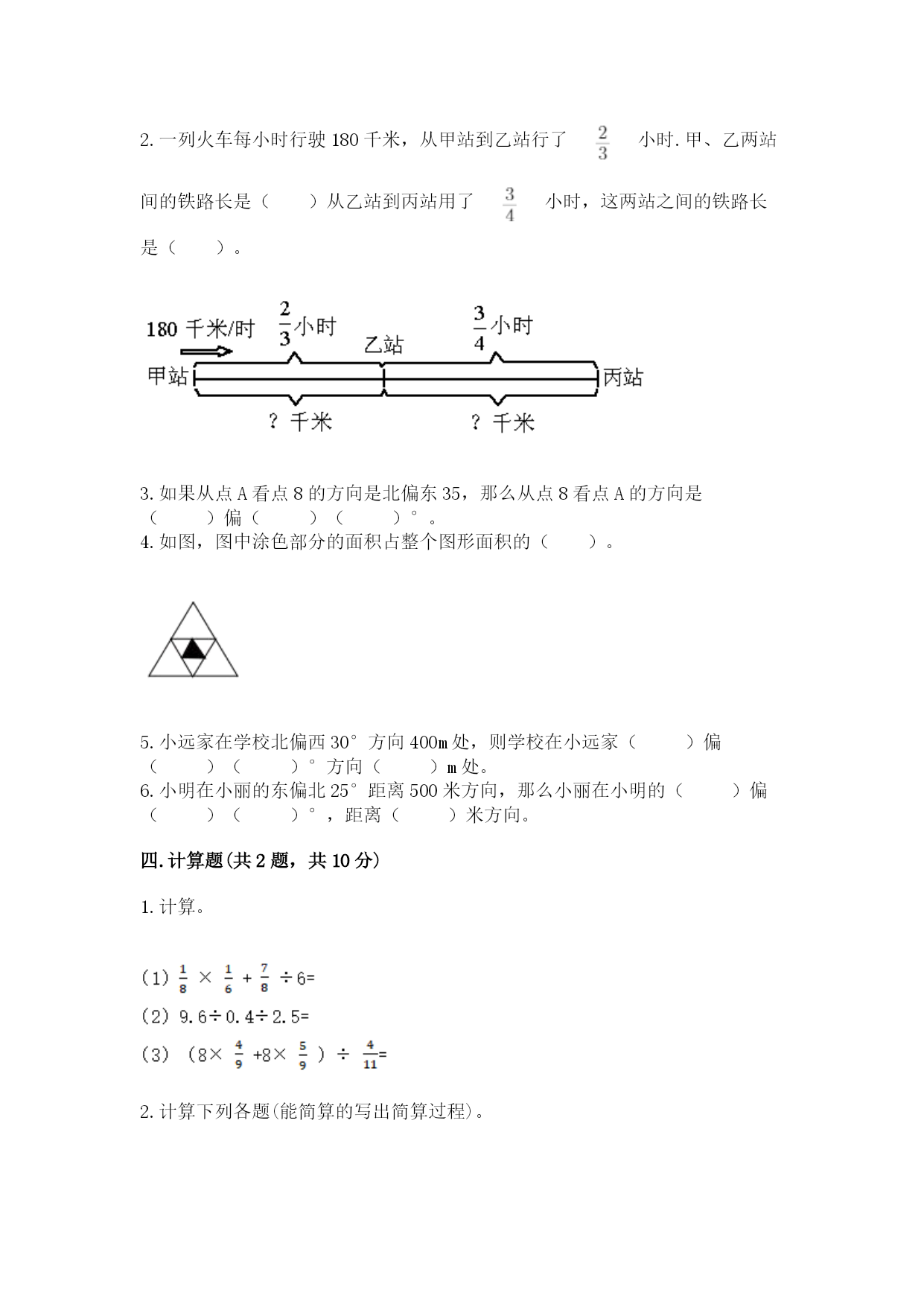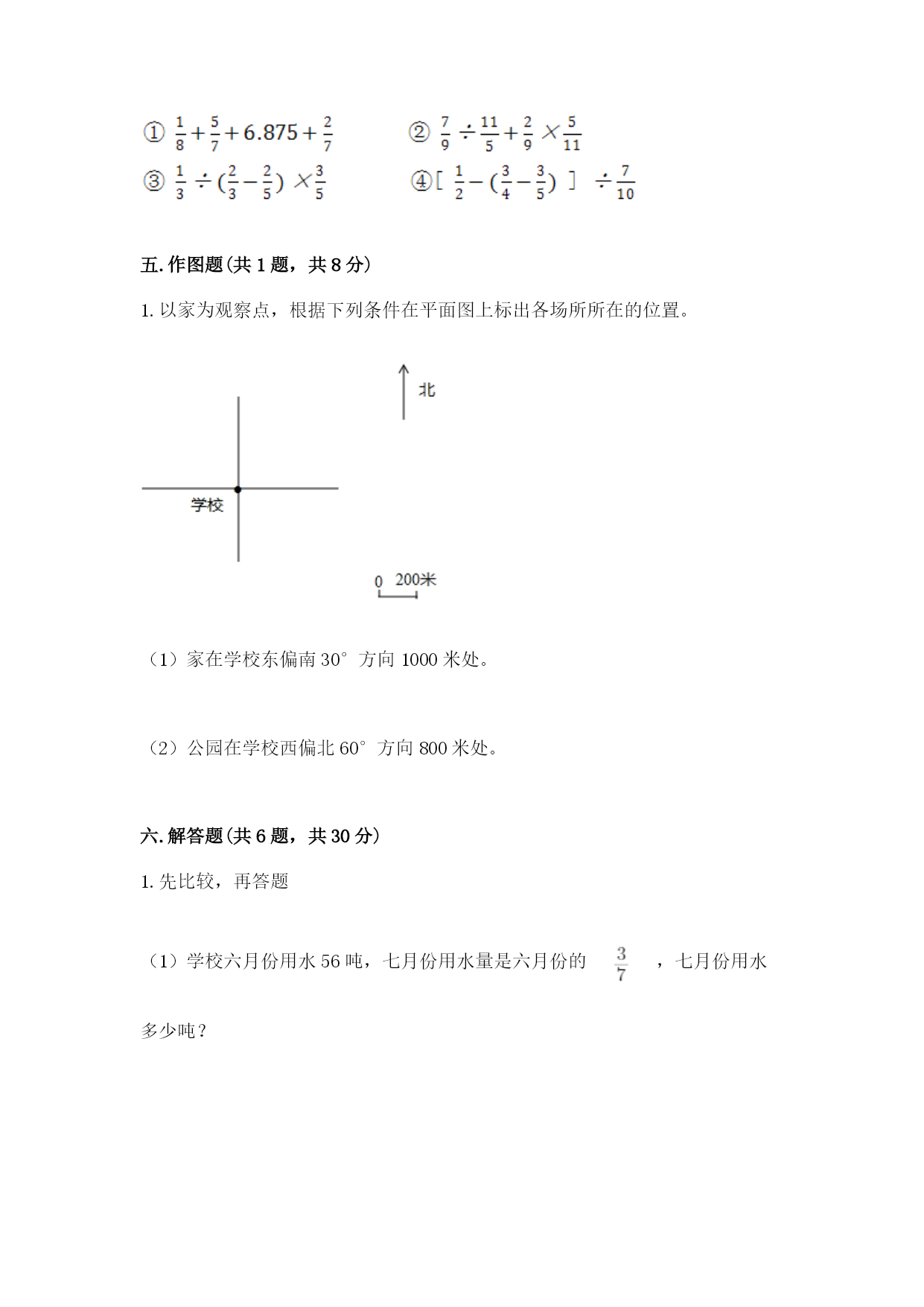 人教版六年级上册数学期中测试卷 一.选择题(共6题,共12分) 1.一块长方形地.宽60米,长比宽多,这块长方形地的面积是()。 A.100平方米B.6000平方米C.600平方米D.5000平方米 2.碧波小学十月份用水126吨,比原计划节约了,十月份原计划用水()。 A.吨B.144吨C.1008吨D.288吨 3.地球上的物体到了月球上以后,它的重量只有地球上的,一位体重78千克的宇航员,到了月球以后,他的体重减轻了()。 A.55千克B.65千克C.13千克D.45千克 4.一根绳子长4米,比另一根绳子短,另一根绳子长()。 A.米B.米C.3米D.米 5.两根同样2米长的铁丝,从第一根上截去它的,从第二根上截去米.余下部分()。 A.无法比较B.第一根长C.第二根长D.长度相等 6.甲数的是18,乙数的是20,甲数与乙数比较()。 A.甲数大B.乙数大C.一样大D.不能确定 二.判断题(共6题,共12分) 1.如果你去商店时,向北走了400米,回来时你应该向东走400米。() 2.甲班人数的和乙班人数的相等,乙班人数一定比甲班人数多。() 3.几个假分数的积一定比1大。() 4.如果甲在乙的南偏西30°方向上,那么乙就在甲的北偏东30°方向上。() 5.比例中,两内项互为倒数,则两外项之积一定是1。() 6.若a×b=1,那么a的倒数是b,b的倒数是a。() 三.填空题(共6题,共17分) 1.小刚家在学校西偏北50度方向上,则学校在小刚家东()偏()()°方向上。 2.一列火车每小时行驶180千米,从甲站到乙站行了小时.甲、乙两站间的铁路长是()从乙站到丙站用了小时,这两站之间的铁路长是()。 3.如果从点A看点8的方向是北偏东35,那么从点8看点A的方向是()偏()()°。 4.如图,图中涂色部分的面积占整个图形面积的()。 5.小远家在学校北偏西30°方向400m处,则学校在小远家()偏()()°方向()m处。 6.小明在小丽的东偏北25°距离500米方向,那么小丽在小明的()偏()()°,距离()米方向。 四.计算题(共2题,共10分) 1.计算。 2.计算下列各题(能简算的写出简算过程)。 五.作图题(共1题,共8分) 1.以家为观察点,根据下列条件在平面图上标出各场所所在的位置。 (1)家在学校东偏南30°方向1000米处。 (2)公园在学校西偏北60°方向800米处。 六.解答题(共6题,共30分) 1.先比较,再答题 (1)学校六月份用水56吨,七月份用水量是六月份的,七月份用水多少吨? (2)学校六月份用水56吨,七月份用水量比六月份节约了,七月份用水多少吨? 2.天虹百货商场一天卖出儿童服装和成人服装共800套,其中卖出的成人服装套数相当于儿童服装的,卖出儿童服装和成人服装分别是多少套? 3.水果店运来橘子360千克,运来的香蕉的质量是橘子的,运来香蕉多少千克? 4.小明两天看完一本240页的故事书.第一天看了全书总页数的,第二天应看多少页? 5.科学研究表明戴口罩能有效地减少新冠病毒的传播。为了更好地做好防疫工作,五年四班一共准备了175个一次性医用口罩,准备的N95口罩数量是一次性医用口罩数量的,列式计算出五年四班准备了多少个N95口罩? 6.服装厂计划一个月生产衬衫5000件,结果上半月完成,如果下半月完成的与上半月同样多,这个月超额生产了多少件? 参考答案 一.选择题 1.B 2.B 3.B 4.D 5.C 6.A 二.判断题 1.× 2.√ 3.× 4.√ 5.√ 6.√ 三.填空题 1.东;南;50(或南偏东40度) 2.120千米;135千米 3.南;西;35或西;南;55 4. 5.南;东;30;400 6.西;南;25;500 四.计算题 1.(1)(2)9.6(3)22 2.如下: 五.作图题 1.1000÷200=5(厘米),800÷200=4(厘米),又因家在学校东偏南30°方向,公园在学校西偏北60°方向,所以家、公园的位置如下图所示: 六.解答题 1.(1)56×=24(吨)答:七月份用水24吨; (2)56×(1-)(吨)答:七月份用水32吨。 2.800÷(1+) =800× =480(套) 480×=320(套) 答:卖出儿童服装480套,卖出成人服装320套。 3.360×=300(千克)答:运来香蕉300千克。 4.240﹣240× =240﹣140 =100(页) 答:第二天应看100页。 5.175×=70(个) 答:五年四班准备了70个N95口罩。 6.解: