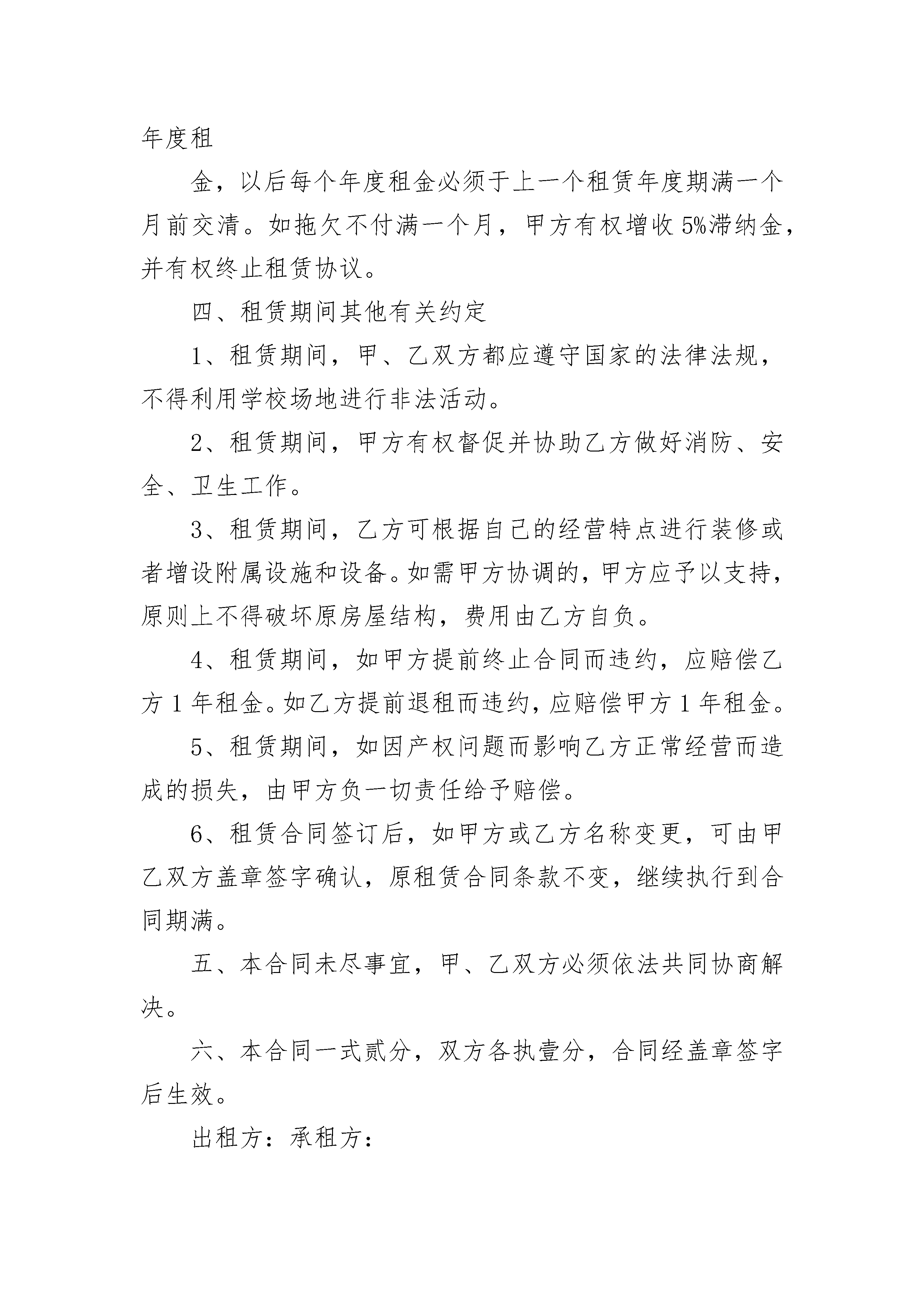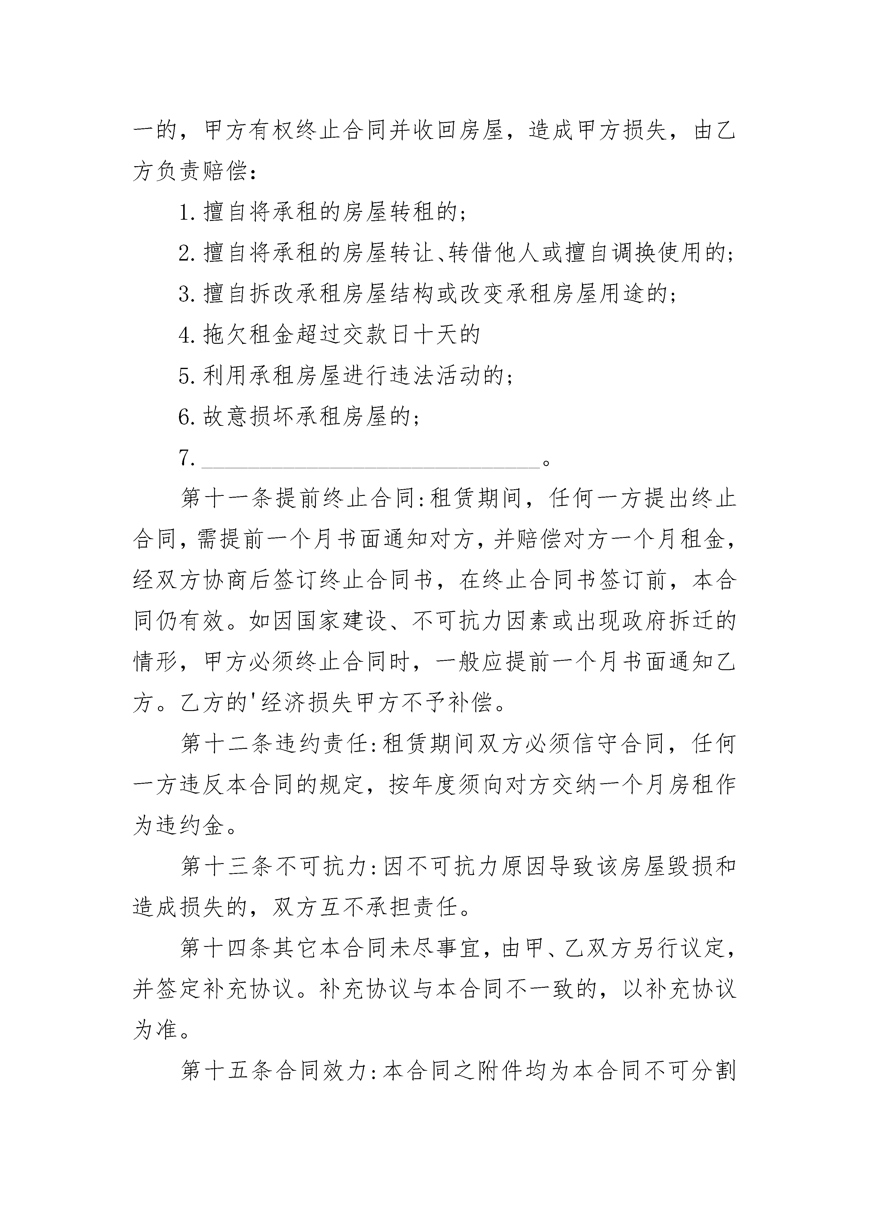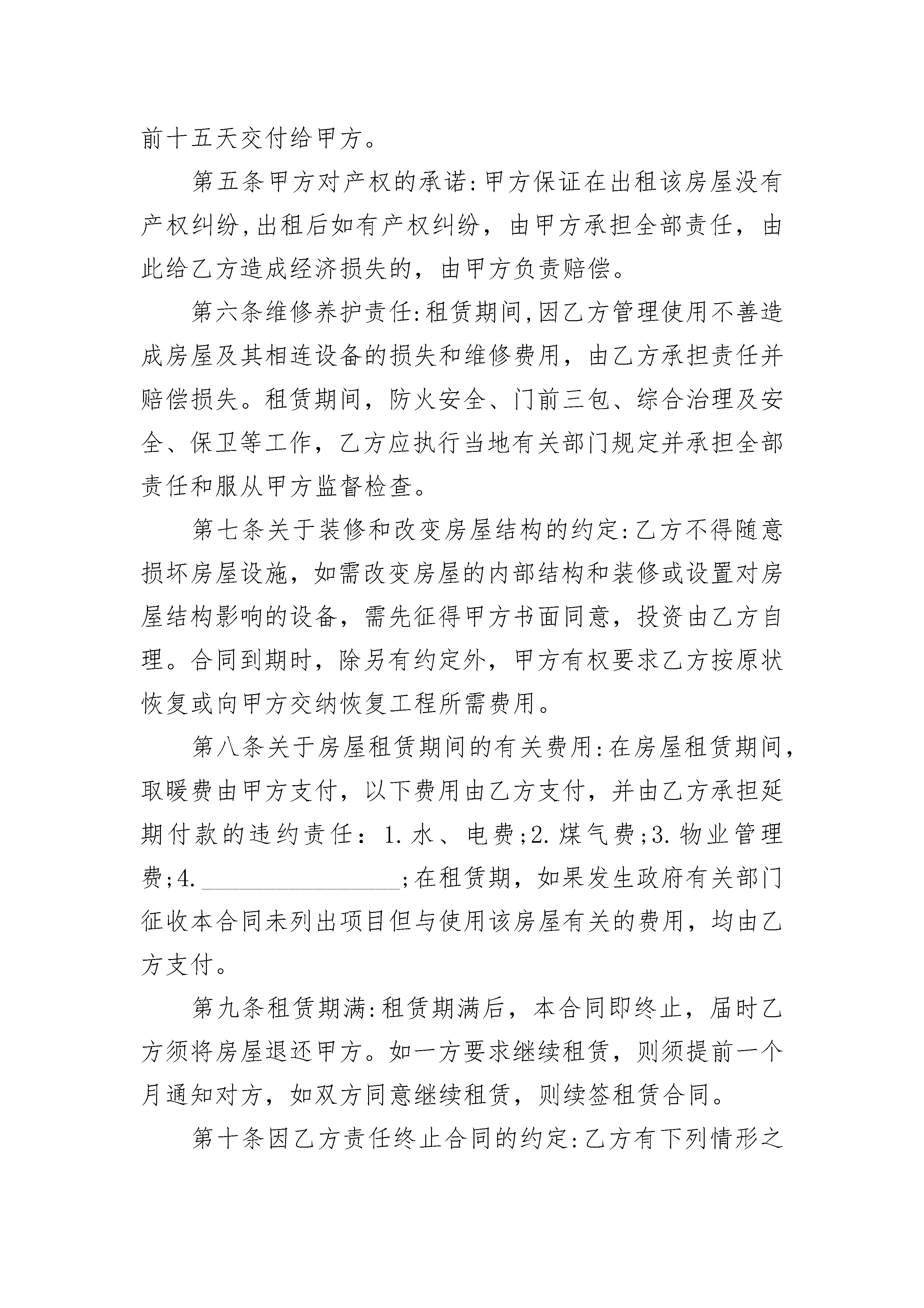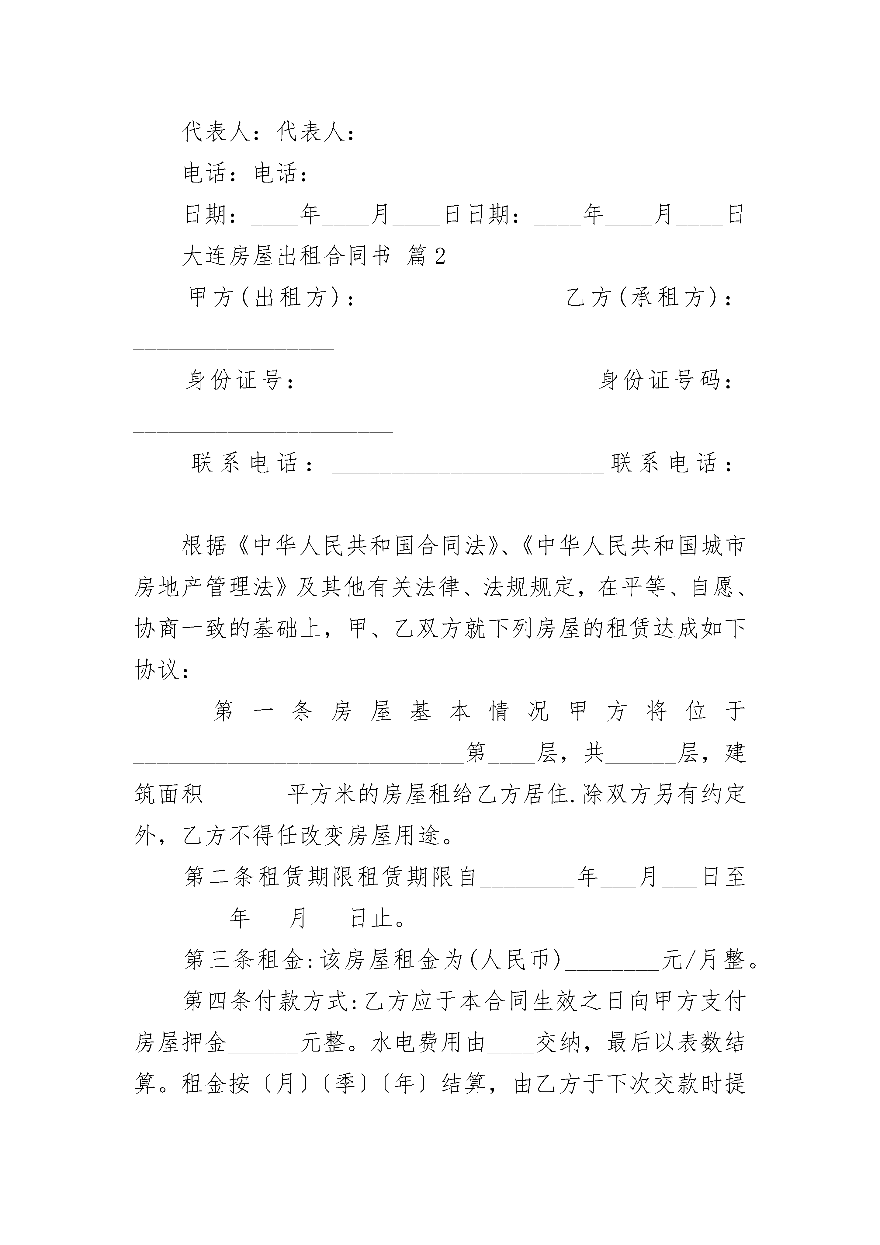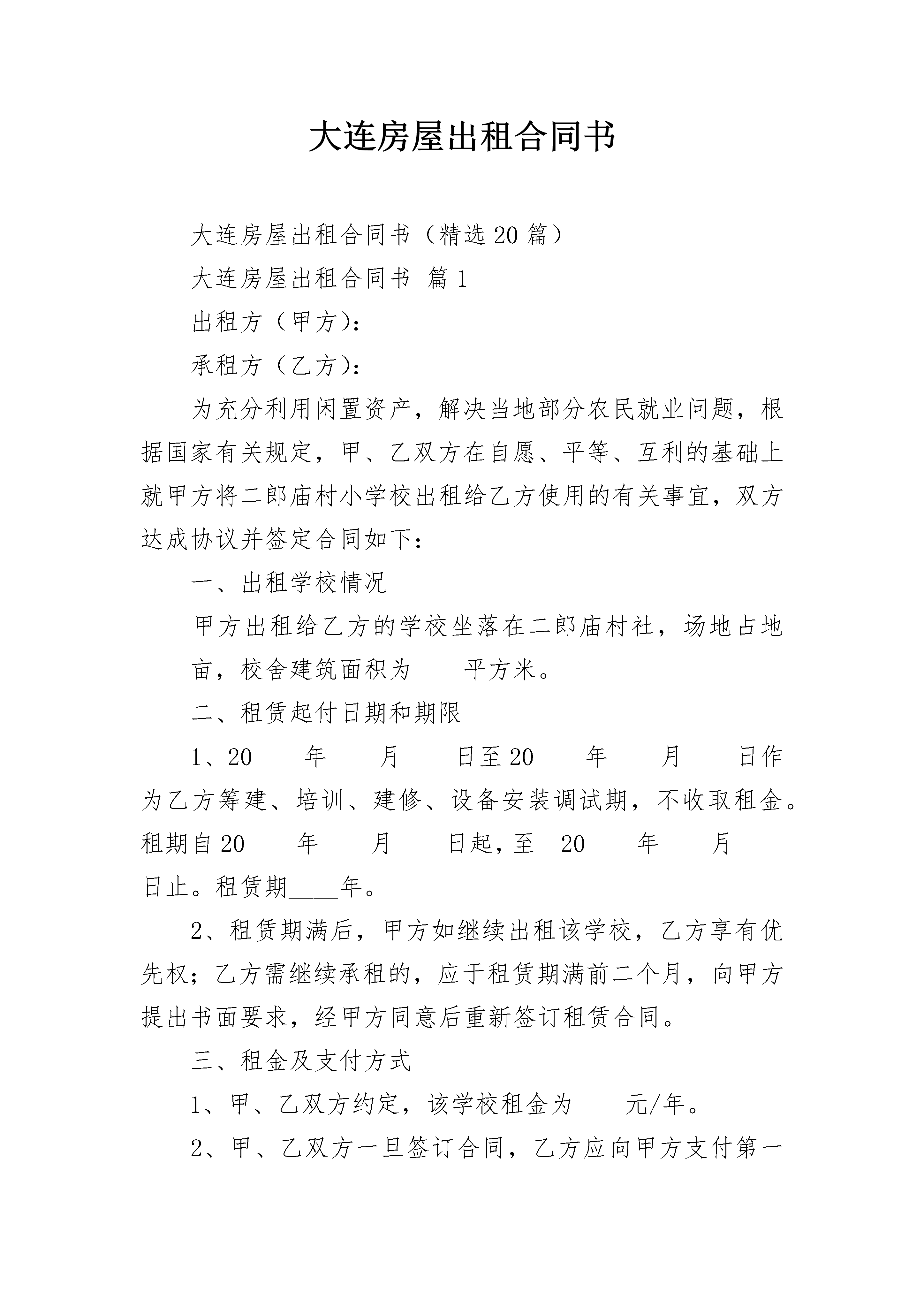 大连房屋出租合同书大连房屋出租合同书(精选20篇)大连房屋出租合同书篇1出租方(甲方):承租方(乙方):为充分利用闲置资产,解决当地部分农民就业问题,根据国家有关规定,甲、乙双方在自愿、平等、互利的基础上就甲方将二郎庙村小学校出租给乙方使用的有关事宜,双方达成协议并签定合同如下:一、出租学校情况甲方出租给乙方的学校坐落在二郎庙村社,场地占地____亩,校舍建筑面积为____平方米。二、租赁起付日期和期限1、20____年____月____日至20____年____月____日作为乙方筹建、培训、建修、设备安装调试期,不收取租金。租期自20____年____月____日起,至__20____年____月____日止。租赁期____年。2、租赁期满后,甲方如继续出租该学校,乙方享有优先权;乙方需继续承租的,应于租赁期满前二个月,向甲方提出书面要求,经甲方同意后重新签订租赁合同。三、租金及支付方式1、甲、乙双方约定,该学校租金为____元/年。2、甲、乙双方一旦签订合同,乙方应向甲方支付第一年度租金,以后每个年度租金必须于上一个租赁年度期满一个月前交清。如拖欠不付满一个月,甲方有权增收5%滞纳金,并有权终止租赁协议。四、租赁期间其他有关约定1、租赁期间,甲、乙双方都应遵守国家的法律法规,不得利用学校场地进行非法活动。2、租赁期间,甲方有权督促并协助乙方做好消防、安全、卫生工作。3、租赁期间,乙方可根据自己的经营特点进行装修或者增设附属设施和设备。如需甲方协调的,甲方应予以支持,原则上不得破坏原房屋结构,费用由乙方自负。4、租赁期间,如甲方提前终止合同而违约,应赔偿乙方1年租金。如乙方提前退租而违约,应赔偿甲方1年租金。5、租赁期间,如因产权问题而影响乙方正常经营而造成的损失,由甲方负一切责任给予赔偿。6、租赁合同签订后,如甲方或乙方名称变更,可由甲乙双方盖章签字确认,原租赁合同条款不变,继续执行到合同期满。五、本合同未尽事宜,甲、乙双方必须依法共同协商解决。六、本合同一式贰分,双方各执壹分,合同经盖章签字后生效。出租方:承租方:代表人:代表人:电话:电话:日期:____年____月____日日期:____年____月____日大连房屋出租合同书篇2甲方(出租方):________________乙方(承租方):_________________身份证号:________________________身份证号码:______________________联系电话:_______________________联系电话:_______________________根据《中华人民共和国合同法》、《中华人民共和国城市房地产管理法》及其他有关法律、法规规定,在平等、自愿、协商一致的基础上,甲、乙双方就下列房屋的租赁达成如下协议:第一条房屋基本情况甲方将位于____________________________第____层,共______层,建筑面积_______平方米的房屋租给乙方居住.除双方另有约定外,乙方不得任改变房屋用途。第二条租赁期限租赁期限自________年___月___日至________年___月___日止。第三条租金:该房屋租金为(人民币)________元/月整。第四条付款方式:乙方应于本合同生效之日向甲方支付房屋押金______元整。水电费用由____交纳,最后以表数结算。租金按〔月〕〔季〕〔年〕结算,由乙方于下次交款时提前十五天交付给甲方。第五条甲方对产权的承诺:甲方保证在出租该房屋没有产权纠纷,出租后如有产权纠纷,由甲方承担全部责任,由此给乙方造成经济损失的,由甲方负责赔偿。第六条维修养护责任:租赁期间,因乙方管理使用不善造成房屋及其相连设备的损失和维修费用,由乙方承担责任并赔偿损失。租赁期间,防火安全、门前三包、综合治理及安全、保卫等工作,乙方应执行当地有关部门规定并承担全部责任和服从甲方监督检查。第七条关于装修和改变房屋结构的约定:乙方不得随意损坏房屋设施,如需改变房屋的内部结构和装修或设置对房屋结构影响的设备,需先征得甲方书面同意,投资由乙方自理。合同到期时,除另有约定外,甲方有权要求乙方按原状恢复或向甲方交纳恢复工程所需费用。第八条关于房屋租赁期间的有关费用:在房屋租赁期间,取暖费由甲方支付,以下费用由乙方支付,并由乙方承担延期付款的违约责任:1.水、电费;2.煤气费;3.物业管理费;4.________________;在租赁期,如果发生政府有关部门征收本合同未列出项目但与使用该房屋有关的费用,均由乙方支付。第九条租赁期满:租赁期满后,本合同即终止,届时乙方须将房屋退还甲方。如一方要求继续租赁,则须提前一个月通知对方,如双方同意继续租赁,则续签租赁合同。第十条因乙方责任终止合同的约定:乙方有下列