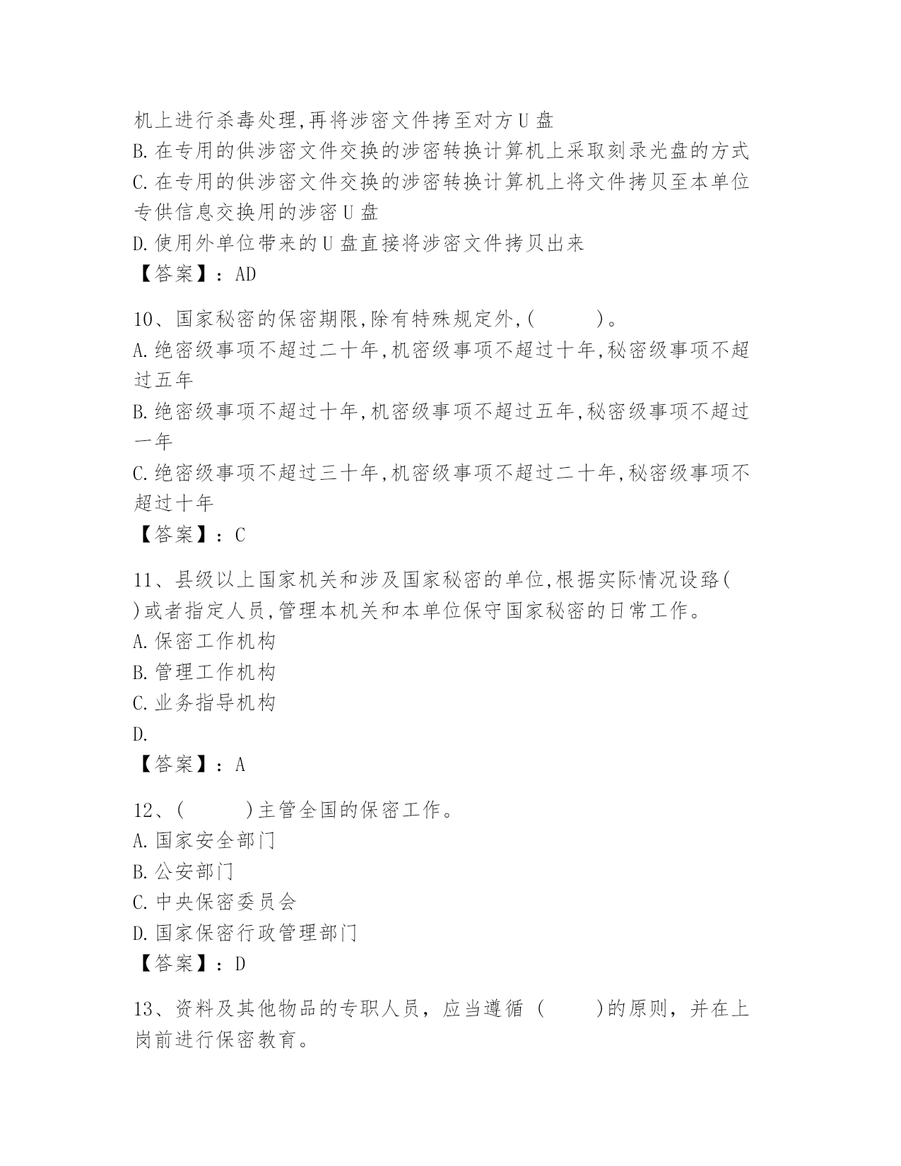 2024年度保密知识考试教育考题 第一部分单选题(150题) 1、单位确定密级、变更密级或者决定解密,应当由()提出具体意见交本机关、单位的主管领导审核批准。A、承办人员B.负责人C.保密工作部门【答案】:A 2、下列做法符合规定的是()。 A.航天爱好者小刘使用无人机对某军事机场进行拍摄,并在互联网上与好友分享 B.某机关单位工作人员用普通快递将一份秘密级文件邮寄给上级单位 C.某废品收购站工作人员宋某在一批废品中发现两份机密级文件,立刻采取保护措施,并及时报告保密行政主管部门 D.某事业单位工作人员李某,将一份秘密级文件用手机拍摄保存,但没有外传【答案】:C 3、业务工作接受上级业务部门垂直管理的单位,保密工作()。A.以上级业务部门管理为主,同时接受地方保密行政管理部门的指导B.以地方保密行政管理部门为主,同时接受上级业务部门的指导C.接受上级业务部门和地方保密行政管理部门的双重管理D.自主管理,同时接受上级业务部门的指导【答案】:A 4、保密法第四十八条是对十二项严重违规行为法律责任的规定,这一规定表明(),应依法追究责任。A.不论是否产生泄密实际后果,只要发生所列举的严重违规行为之一的B.发生所列举的严重违规行为任何一项,且产生泄密实际后果的C.不论是否产生泄密实际后果,发生两项以上严重违规行为的D.产生泄密实际后果的违规行为【答案】:A 5、政各有一把手的情况。这些单位在确定法定定密责任人时,()。A.只能确定党委一把手作为法定定密责任人B.从两人中选举产生一位法定定密责任人C.可以确定两人同为法定定密责任人D.应报请上级主管部门确定法定定密责任人【答案】:C 6、根据《中华人民共和国保守国家秘密法》的有关规定,关于政党的秘密事项的正确表述是()。 A.政党的秘密事项经保密工作部门确认后,属于国家秘密事项 B.政党的秘密事项与国家秘密性质不同,不属于国家秘密事项 C.政党的秘密事项符合保密法有关规定的,属于国家秘密 D.【答案】:C 7、保密法治的核心价值是()。 A.维护国家安全和利益 B.保障公民正当权益 C.制裁泄露国家秘密行为 D.规范保密管理行为【答案】:A 8、自治区、()的保密工作部门确定。A、地市B.县(区)C.直辖市【答案】:C 9、当本单位需要将涉密文件与其他单位进行交换时,下列交换方式中不符合保密要求的是()。 A.如果外单位带涉密U盘来,在专用的供涉密文件交换的涉密转换计算机上进行杀毒处理,再将涉密文件拷至对方U盘 B.在专用的供涉密文件交换的涉密转换计算机上采取刻录光盘的方式 C.在专用的供涉密文件交换的涉密转换计算机上将文件拷贝至本单位专供信息交换用的涉密U盘 D.使用外单位带来的U盘直接将涉密文件拷贝出来【答案】:AD 10、国家秘密的保密期限,除有特殊规定外,()。 A.绝密级事项不超过二十年,机密级事项不超过十年,秘密级事项不超过五年 B.绝密级事项不超过十年,机密级事项不超过五年,秘密级事项不超过一年 C.绝密级事项不超过三十年,机密级事项不超过二十年,秘密级事项不超过十年 【答案】:C 11、县级以上国家机关和涉及国家秘密的单位,根据实际情况设臵()或者指定人员,管理本机关和本单位保守国家秘密的日常工作。 A.保密工作机构 B.管理工作机构 C.业务指导机构 D.【答案】:A 12、()主管全国的保密工作。 A.国家安全部门 B.公安部门 C.中央保密委员会 D.国家保密行政管理部门【答案】:D 13、资料及其他物品的专职人员,应当遵循()的原则,并在上岗前进行保密教育。A.先审查后使用B.先使用后审查C.边使用边审查【答案】:A 14、重要涉密部门的人员选配,应当坚持()的原则,并定期进行考核,不适合的应及时调整。 A.谁选配谁负责 B.先审后训 C.先选后训 【答案】:B 15、处理国家秘密信息的单台计算机,应当根据所处理信息的(),按照相应级别信息系统的有关要求进行保护和管理。A.最低密级B.平均密级C.最高密级D.知悉范围【答案】:C 16、保密委员会或保密工作领导小组的职责是()。 A.对保密工作负领导责任 B.为保密工作机构履行职责提供人力.财力.物力等条件保障 C.对保密工作进行研究.部署和总结 D.及时解决保密工作中的重大问题【答案】:ABCD 17、单位对所产生的国家秘密事项,应当按照()确定密级。A.保密法律法规的规定B.国家秘密及其密级具体范围的规定C.本机关单位的保密规定【答案】:B 18、任用.聘用的境外人员因工作需要知悉我国家秘密的,应按照()的原则,报有关机关批准。 A.“谁主管,谁负责” B.“一事一批” C.“谁主管,谁负责”和“一事一批” 【答案】:C 19、()不属于违反保密法律应承担的责任。 A.行政责任 B.刑事责任 C.民事责任