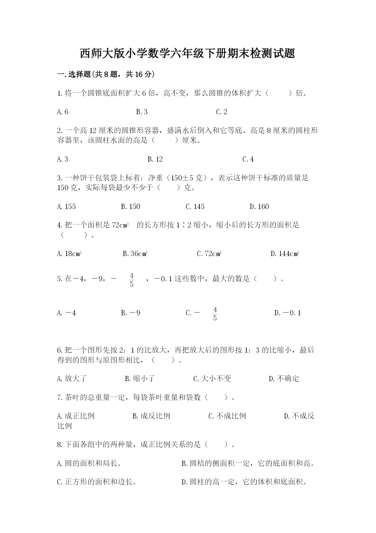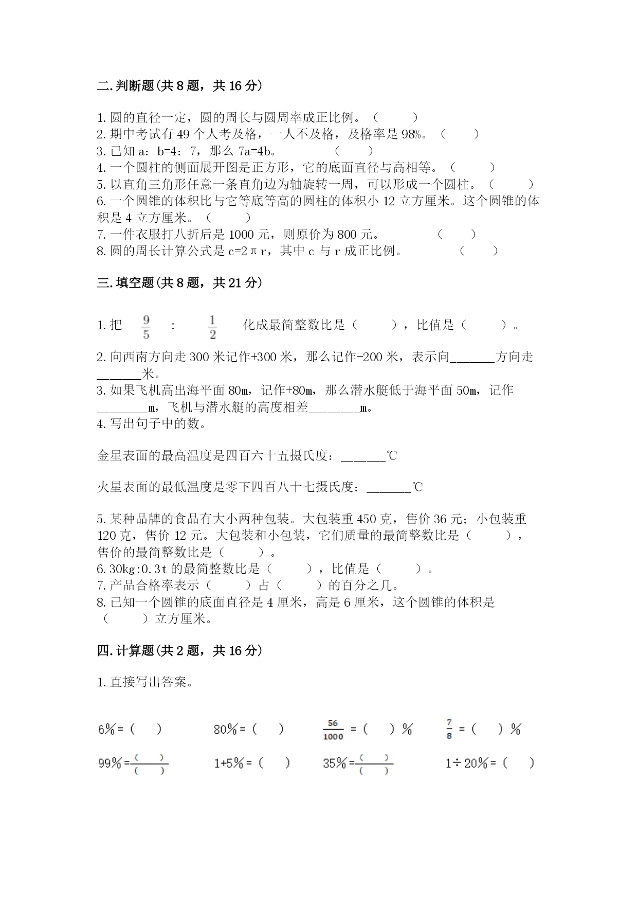 西师大版小学数学六年级下册期末检测试题 一.选择题(共8题,共16分) 1.将一个圆锥底面积扩大6倍,高不变,那么圆锥的体积扩大()倍。 A.6B.3C.2 2.一个高12厘米的圆锥形容器,盛满水后倒入和它等底、高是8厘米的圆柱形容器里,该圆柱水面的高是()厘米。 A.3B.12C.4 3.一种饼干包装袋上标着:净重(150±5克),表示这种饼干标准的质量是150克,实际每袋最少不少于()克。 A.155B.150C.145D.160 4.把一个面积是72cm2的长方形按1∶2缩小,缩小后的长方形的面积是()。 A.18cm2B.36cm2C.72cm2D.144cm2 5.在-4,-9,-,-0.1这些数中,最大的数是()。 A.-4B.-9C.-D.-0.1 6.把一个图形先按2:1的比放大,再把放大后的图形按1:3的比缩小,最后得到的图形与原图形相比,()。 A.放大了B.缩小了C.大小不变D.不确定 7.茶叶的总重量一定,每袋茶叶重量和袋数()。 A.成正比例B.成反比例C.不成比例D.不成反比例 8.下面各组中的两种量,成正比例关系的是()。 A.圆的面积和局长。B.圆桔的侧面积一定,它的底面积和高。 C.正方形的面积和边长。D.圆柱的高一定,它的体积和底面积。 二.判断题(共8题,共16分) 1.圆的直径一定,圆的周长与圆周率成正比例。() 2.期中考试有49个人考及格,一人不及格,及格率是98%。() 3.已知a:b=4:7,那么7a=4b。() 4.一个圆柱的侧面展开图是正方形,它的底面直径与高相等。() 5.以直角三角形任意一条直角边为轴旋转一周,可以形成一个圆柱。() 6.一个圆锥的体积比与它等底等高的圆柱的体积小12立方厘米。这个圆锥的体积是4立方厘米。() 7.一件衣服打八折后是1000元,则原价为800元。() 8.圆的周长计算公式是c=2πr,其中c与r成正比例。() 三.填空题(共8题,共21分) 1.把:化成最简整数比是(),比值是()。 2.向西南方向走300米记作+300米,那么记作-200米,表示向_______方向走_______米。 3.如果飞机高出海平面80m,记作+80m,那么潜水艇低于海平面50m,记作________m,飞机与潜水艇的高度相差________m。 4.写出句子中的数。 金星表面的最高温度是四百六十五摄氏度:_______℃ 火星表面的最低温度是零下四百八十七摄氏度:_______℃ 5.某种品牌的食品有大小两种包装。大包装重450克,售价36元;小包装重120克,售价12元。大包装和小包装,它们质量的最简整数比是(),售价的最简整数比是()。 6.30kg:0.3t的最简整数比是(),比值是()。 7.产品合格率表示()占()的百分之几。 8.已知一个圆锥的底面直径是4厘米,高是6厘米,这个圆锥的体积是()立方厘米。 四.计算题(共2题,共16分) 1.直接写出答案。 2.解方程。 五.作图题(共1题,共6分) 1.根据下面的描述,在平面图上标出各场所的位置。 ①乐乐家在电视塔的北偏东30°方向1km处。 ②商场在电视塔的南偏西45°方向1500m处。 六.解答题(共6题,共37分) 1.一种圆柱形状的铁皮油桶,量得底面直径8dm,高5dm.做一个这样的铁皮油桶至少需多少平方米铁皮?(铁皮厚度不计,结果保留整数) 2.小红在书店买了两本打八折出售的书,共花了42元,小红买这两本书便宜了多少钱? 3.某建筑物内有6根圆柱形大柱,高10米,大柱周长25.12分米,要全部涂上油漆,如果按每平方米的油漆费为80元计算,需用多少钱? 4.如果把甲书架上20%的书搬到乙书架上,那么两个书架上书的本数相等。原来甲书架上书的本数比乙书架上书的本数多百分之几? 5.一个圆柱形的粮仓,从里面量得底面直径是3米,装有2.5米高的小麦.如果每立方米小麦重0.7吨,这个粮仓装有多少吨的小麦? 6.下表记录的是某天我国8个城市的最低气温。 (1)哪个城市的气温最高,哪个城市的气温最低,分别是多少? (2)把各个城市的最低气温按从高到低的顺序排列出来。 参考答案 一.选择题 1.A 2.C 3.C 4.A 5.D 6.B 7.B 8.D 二.判断题 1.× 2.√ 3.√ 4.× 5.× 6.× 7.× 8.√ 三.填空题 1.18:5;3.6 2.东北;200 3.-50;130 4.+465;-487 5.15:4;3:1 6.1:10;0.1 7.合格产品数量;生产的产品总量 8.25.12 四.计算题 1.0.06;0.8;0.056;87.5;;1.05;;5 2.(1)3(2)50(3)(4)2.5 五.作图题 1.如图: 六.解答题 1.8dm=0.8m 5dm=0.