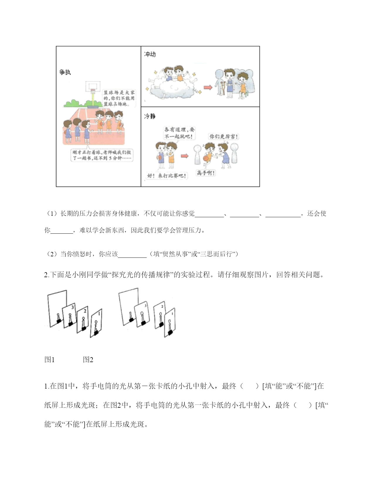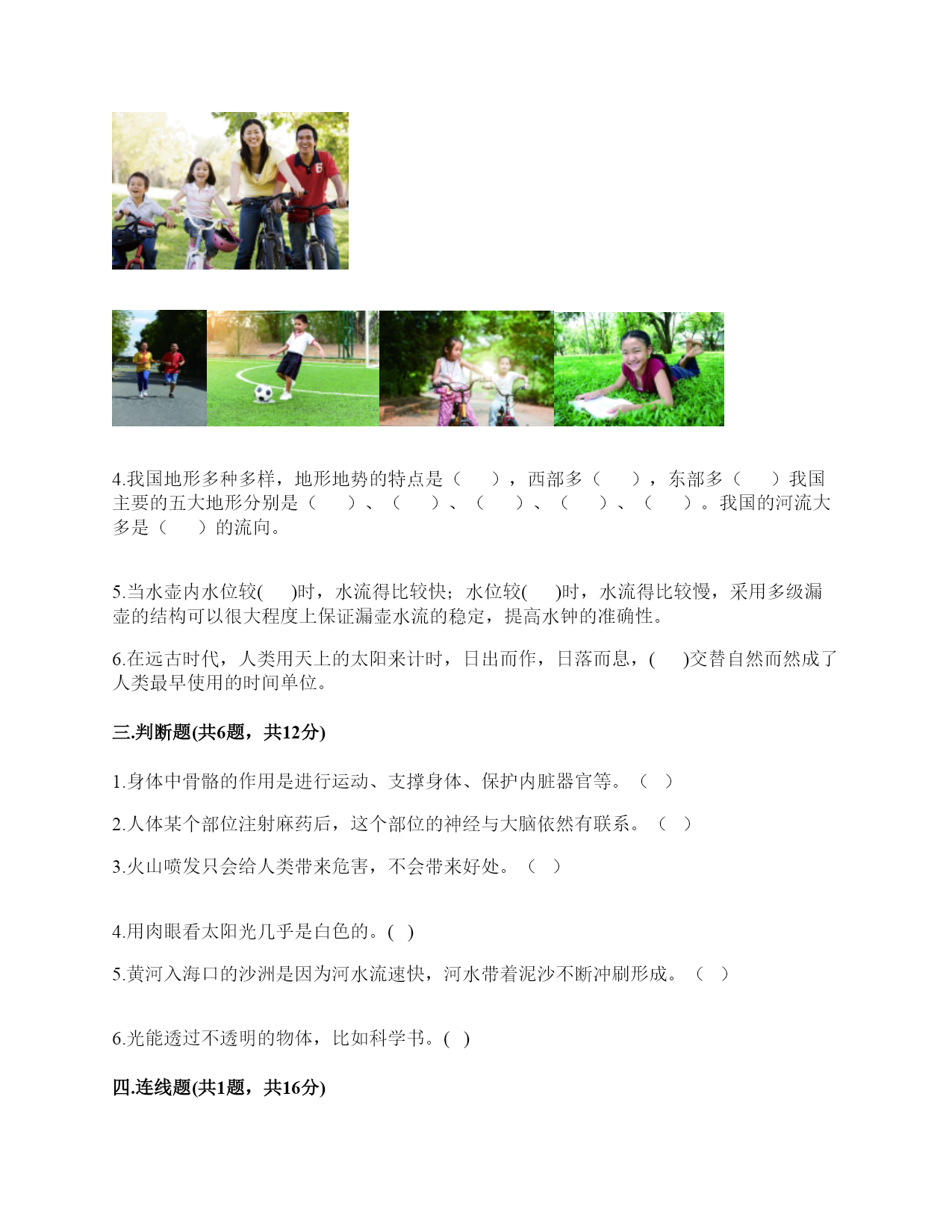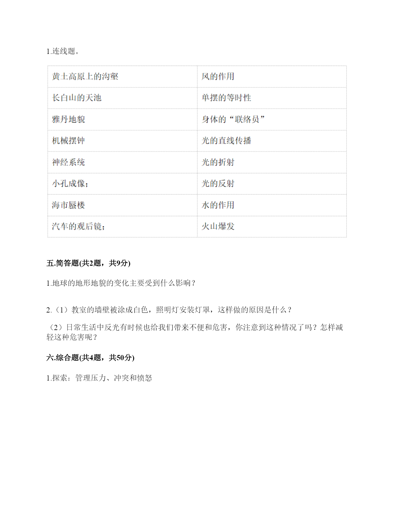 教科版五年级上册科学期末测试卷 一.选择题(共6题,共12分) 1.影响水钟计时准确性的因素有很多,其中最关键的是()。 A.保证水滴滴速均匀 B.滴水孔尽量小 C.容器越大越好 2.在《世界地图》上,你看到的白色通常表示()。 A.平原 B.冰川 C.山地 D.沙漠 E.海洋 3.当光斜着照射在镜面上时,光会()。 A.进入了镜子 B.沿原路返回 C.向另一个方向射出 D.一部分透过镜子,一部分向另一个方向射出 4.如果把地球比作一个鸡蛋,那么地壳相当于鸡蛋的()。 A.蛋壳 B.蛋清 C.蛋黄 5.古代人们用来照明以及计时的工具是()。 A.蜡烛 B.滴漏 C.焚香 6.下列四种仪器中,利用光影计时的是()。 A. B. C. D. 二.填空题(共6题,共34分) 1.光在空气中是沿()传播的,当光遇到不透明的障碍物时,在障碍物后面就会形成()。 2.骨、()和()组成人体的运动系统,他们相互配合,共同完成身体的各种运动。 3.有的运动是()都可以进行的,如散步、游泳、慢跑、骑车等。 4.我国地形多种多样,地形地势的特点是(),西部多(),东部多()我国主要的五大地形分别是()、()、()、()、()。我国的河流大多是()的流向。 5.当水壶内水位较()时,水流得比较快;水位较()时,水流得比较慢,采用多级漏壶的结构可以很大程度上保证漏壶水流的稳定,提高水钟的准确性。 6.在远古时代,人类用天上的太阳来计时,日出而作,日落而息,()交替自然而然成了人类最早使用的时间单位。 三.判断题(共6题,共12分) 1.身体中骨骼的作用是进行运动、支撑身体、保护内脏器官等。() 2.人体某个部位注射麻药后,这个部位的神经与大脑依然有联系。() 3.火山喷发只会给人类带来危害,不会带来好处。() 4.用肉眼看太阳光几乎是白色的。() 5.黄河入海口的沙洲是因为河水流速快,河水带着泥沙不断冲刷形成。() 6.光能透过不透明的物体,比如科学书。() 四.连线题(共1题,共16分) 1.连线题。 五.简答题(共2题,共9分) 1.地球的地形地貌的变化主要受到什么影响? 2.(1)教室的墙壁被涂成白色,照明灯安装灯罩,这样做的原因是什么? (2)日常生活中反光有时候也给我们带来不便和危害,你注意到这种情况了吗?怎样减轻这种危害呢? 六.综合题(共4题,共50分) 1.探索:管理压力、冲突和愤怒 (1)长期的压力会损害身体健康,不仅可能让你感觉_________、_________、___________,还会使你_______,难以学会新东西,因此我们要学会管理压力。 (2)当你愤怒时,你应该_________(填“贸然从事”或“三思而后行”) 2.下面是小刚同学做“探究光的传播规律”的实验过程。请仔细观察图片,回答相关问题。 图1图2 1.在图1中,将手电筒的光从第-张卡纸的小孔中射入,最终()[填“能”或“不能”]在纸屏上形成光斑;在图2中,将手电筒的光从第一张卡纸的小孔中射入,最终()[填“能”或“不能”]在纸屏上形成光斑。 2.根据两次实验现象,可以得出结论:()。 3.在图2中,移动第()张卡纸可以得到与图1相同的实验效果。 3.体验下蹲和站立时骨骼、关节和肌肉的运动,并回答问题。 1.在对应的现象处画“√” 关节/变化情况描述观察到的现象下蹲运动①腿部弯曲□腿部伸直□ ②膝关节转动□膝关节不动□ ③腿部肌肉收缩、舒张□腿部肌肉不变□ ④腿骨骨骼运动□腿骨骨骼不动□由蹲下慢慢站立①腿部弯曲□腿部伸直□ ②膝关节转动□膝关节不动□ ③腿部肌肉收缩、舒张□腿部肌肉不变□ ④腿骨骨骼运动□腿骨骨骼不动□2.我们发现:运动时,________________________________________。 4.实验内容:研究心脏的跳动 实验器材:水槽、洗耳球、塑料管、红色水 实验过程: (1)在水槽中倒入适量的红色水,把洗耳球与管子连接好; (2)把管子插入水中,挤压、松开洗耳球,同时观察管子中水的流动情况; (3)持续挤压1分钟,数出挤压的次数,并说出手的感觉。 实验分析与交流: ①在这实验中,洗耳球相当于(),管子相当于(),水相当于血液; ②挤压洗耳球时相当于心脏是()的,并且看到水被()心脏;松开洗耳球时相当于心脏是()的,同时看到水被()心脏; 参考答案 一.选择题 1.A 2.B 3.C 4.A 5.A 6.D 二.填空题 1.直线;影子 2.关节;肌肉 3.终生 4.西高东低;高山;平原;平原;山地;高原;丘陵;盆地;自西向东 5.高;低 6.昼夜 三.判断题 1.√ 2.√ 3.× 4.√ 5.√ 6.× 四.连线题 1. 五.简答题 1.导致地表形态发生变化的力量主要来自两个方面,一是内力作用,二是外力作用。 2