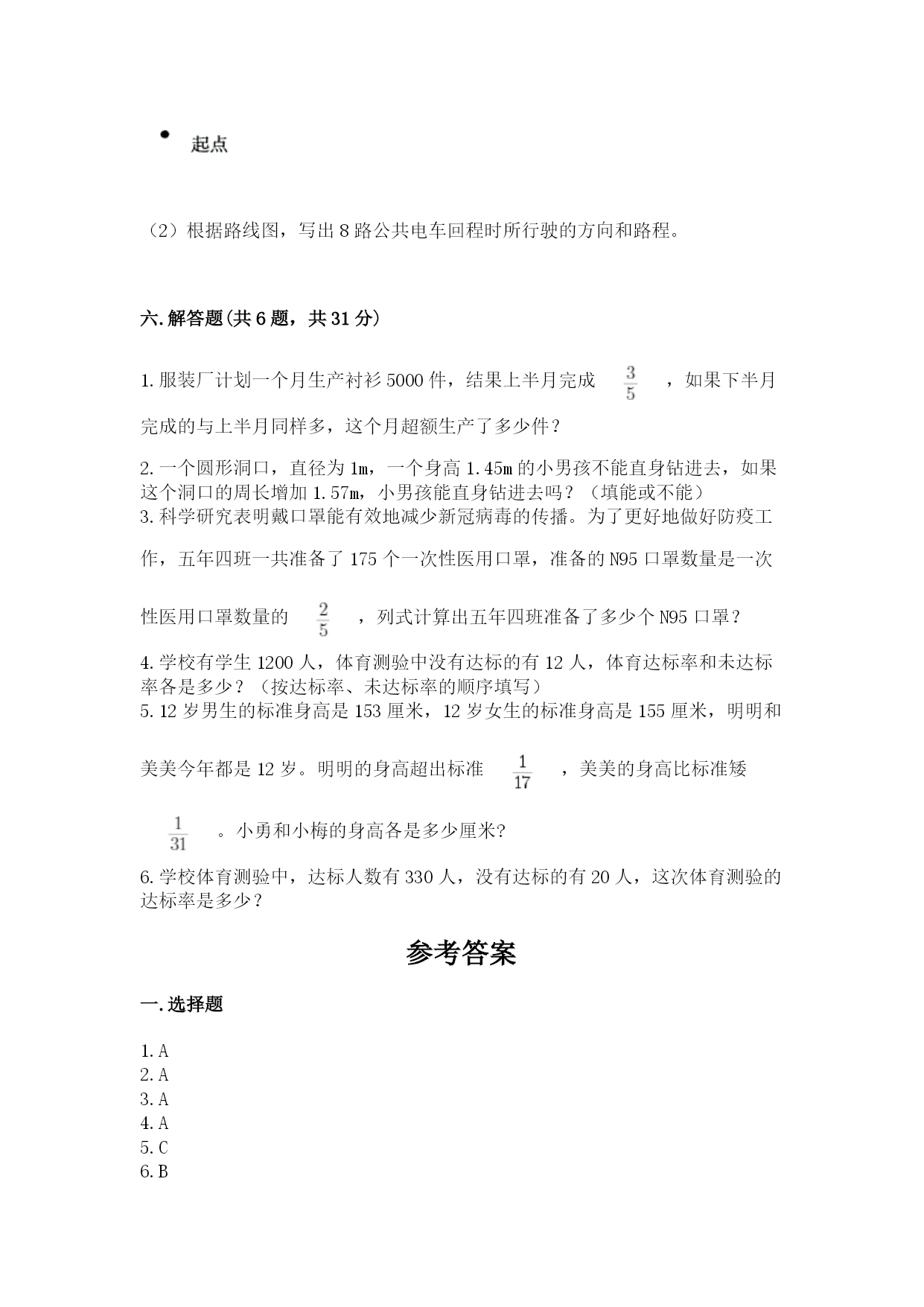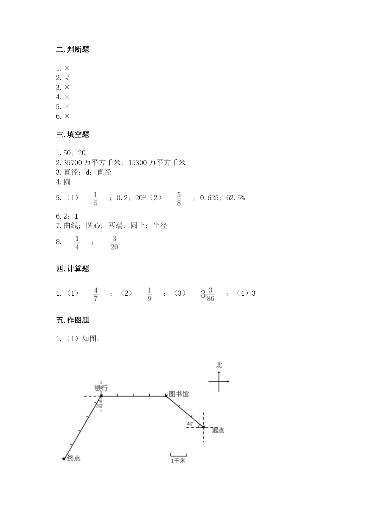小学数学试卷六年级上册数学期末测试卷 一.选择题(共6题,共12分) 1.下列哪个说法是对的()。 A.三角形的三条高必有一条在三角形内部B.所有的质数都只有1个因数 C.一个半圆的周长肯定是一个圆周长的一半D.两条不相交的直线一定是平行的 2.4扩大10倍后减去4,再缩小到它的加上4,结果是()。 A.7.6B.9.6C.5.6 3.一根绳子长24米,它的是()。 A.4米B.米C.20米D.米 4.一个圆的半径乘以π等于这个圆()。 A.周长的一半B.面积的C.半圆的周长 5.有一块公顷的菜地,用它的种白菜,公顷种萝卜,其余的种菠菜,种菠菜的有()。 A.公顷B.公顷C.公顷D.公顷 6.大圆的半径等于小圆直径,大圆面积是小圆面积的()。 A.2倍B.4倍C.8倍 二.判断题(共6题,共12分) 1.一种商品先提价10%,后再打九折出售,现价和原价相同。() 2.圆的半径增加1厘米,它的直径就增加2厘米。() 3.如果m:n=4:3,那么m=4,n=3。() 4.农场植树110棵,成活了100棵,成活率是100%。() 5.东偏南30°方向与南偏东30°方向相同。() 6.比的前项加上8,要使比值不变,后项也应加上8。() 三.填空题(共8题,共23分) 1.全世界大约有200个国家,其中缺水的国家约有100多个,严重缺水的国家约有40多个,缺水的国家约占全世界国家总数的()%;严重缺水的国家约占全世界国家总数的()%。 2.地球的表面积大约是51000万平方千米,其中约是海洋,其余的是陆地.地球上海洋的面积大约是(),陆地的面积大约是()。 3.通过圆心并且两端都在圆上的线段叫做()。一般用字母()表示。()是一个圆内最长的线段。 4.时钟的分针转动一周形成的图形是()。 5.用不同的数表示图中阴影部分占整幅图的多少。 用分数表示(),用小数表示(),用百分数表示()。 用分数表示(),用小数表示(),用百分数表示()。 6.圆的周长是6.28米,则圆的直径是()米,半径是()米。 7.三角形、四边形是直线图形,圆是()图形;圆中心的一点叫做(),通过圆心,并且()都在()的线段叫做圆的直径;战国时期《墨经》一书中记载“圜(圆),一中同长也。”表示圆心到圆上各点的距离都相等,即()都相等。 8.把千克糖平均分给4个小朋友,每人分到这些糖的(),每个小朋友分到()千克。 四.计算题(共1题,共8分) 1.计算。(能简算的要简算) 五.作图题(共1题,共8分) 1.8路公共电车从起点向西偏北40°行驶3千米到达图书馆后,向西行驶4千米到银行,最后向南偏西30°行驶4.5千米到达终点。 (1)根据上面的描述,画出8路公共电车的行驶路线图; (2)根据路线图,写出8路公共电车回程时所行驶的方向和路程。 六.解答题(共6题,共31分) 1.服装厂计划一个月生产衬衫5000件,结果上半月完成,如果下半月完成的与上半月同样多,这个月超额生产了多少件? 2.一个圆形洞口,直径为1m,一个身高1.45m的小男孩不能直身钻进去,如果这个洞口的周长增加1.57m,小男孩能直身钻进去吗?(填能或不能) 3.科学研究表明戴口罩能有效地减少新冠病毒的传播。为了更好地做好防疫工作,五年四班一共准备了175个一次性医用口罩,准备的N95口罩数量是一次性医用口罩数量的,列式计算出五年四班准备了多少个N95口罩? 4.学校有学生1200人,体育测验中没有达标的有12人,体育达标率和未达标率各是多少?(按达标率、未达标率的顺序填写) 5.12岁男生的标准身高是153厘米,12岁女生的标准身高是155厘米,明明和美美今年都是12岁。明明的身高超出标准,美美的身高比标准矮。小勇和小梅的身高各是多少厘米? 6.学校体育测验中,达标人数有330人,没有达标的有20人,这次体育测验的达标率是多少? 参考答案 一.选择题 1.A 2.A 3.A 4.A 5.C 6.B 二.判断题 1.× 2.√ 3.× 4.× 5.× 6.× 三.填空题 1.50;20 2.35700万平方千米;15300万平方千米 3.直径;d;直径 4.圆 5.(1);0.2;20%(2);0.625;62.5% 6.2;1 7.曲线;圆心;两端;圆上;半径 8.; 四.计算题 1.(1);(2);(3);(4)3 五.作图题 1.(1)如图: (2)8路公共电车从终点向北偏东30°行驶4.5千米到达银行后,向东行驶4千米到达图书馆,最后向东偏南40°行驶3千米回到起点。 六.解答题 1.解: 2.1.57÷3.14=0.5(m),1+0.5=1.5(m), 因为1.5m>1.45m,所以洞口周长增加1.57m后小男孩能直身钻进去。 答:能直身钻进去。 3.175×=70(个) 答:五