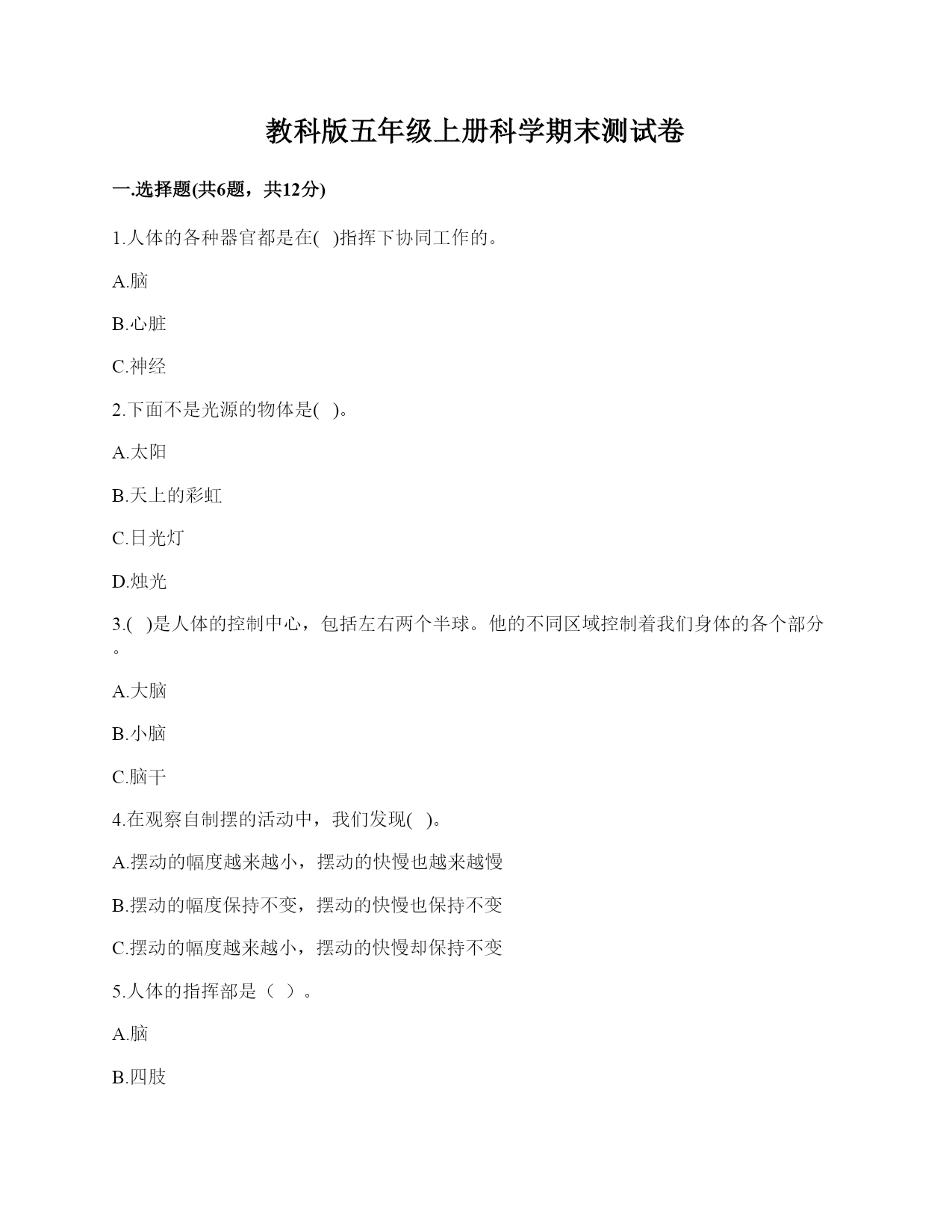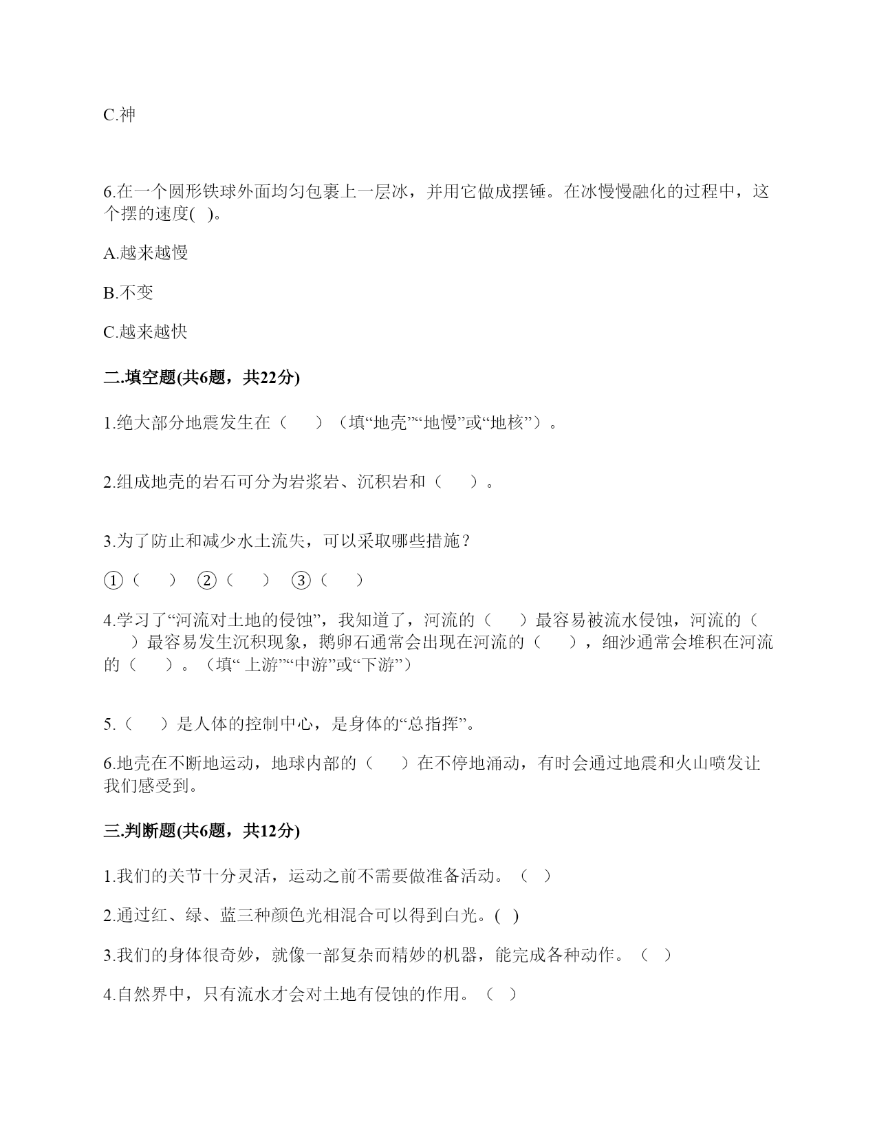教科版五年级上册科学期末测试卷 一.选择题(共6题,共12分) 1.人体的各种器官都是在()指挥下协同工作的。 A.脑 B.心脏 C.神经 2.下面不是光源的物体是()。 A.太阳 B.天上的彩虹 C.日光灯 D.烛光 3.()是人体的控制中心,包括左右两个半球。他的不同区域控制着我们身体的各个部分。 A.大脑 B.小脑 C.脑干 4.在观察自制摆的活动中,我们发现()。 A.摆动的幅度越来越小,摆动的快慢也越来越慢 B.摆动的幅度保持不变,摆动的快慢也保持不变 C.摆动的幅度越来越小,摆动的快慢却保持不变 5.人体的指挥部是()。 A.脑 B.四肢 C.神 6.在一个圆形铁球外面均匀包裹上一层冰,并用它做成摆锤。在冰慢慢融化的过程中,这个摆的速度()。 A.越来越慢 B.不变 C.越来越快 二.填空题(共6题,共22分) 1.绝大部分地震发生在()(填“地壳”“地慢”或“地核”)。 2.组成地壳的岩石可分为岩浆岩、沉积岩和()。 3.为了防止和减少水土流失,可以采取哪些措施? ①()②()③() 4.学习了“河流对土地的侵蚀”,我知道了,河流的()最容易被流水侵蚀,河流的()最容易发生沉积现象,鹅卵石通常会出现在河流的(),细沙通常会堆积在河流的()。(填“上游”“中游”或“下游”) 5.()是人体的控制中心,是身体的“总指挥”。 6.地壳在不断地运动,地球内部的()在不停地涌动,有时会通过地震和火山喷发让我们感受到。 三.判断题(共6题,共12分) 1.我们的关节十分灵活,运动之前不需要做准备活动。() 2.通过红、绿、蓝三种颜色光相混合可以得到白光。() 3.我们的身体很奇妙,就像一部复杂而精妙的机器,能完成各种动作。() 4.自然界中,只有流水才会对土地有侵蚀的作用。() 5.精准计时在生活中很重要。() 6.我们每天都要通过钟表来掌握时间,安排工作、学习和生活。() 四.连线题(共1题,共7分) 1.连线。 太阳光 灯光 激光自然光 极光 闪电的光 萤火虫的光人造光 蜡烛的光 五.简答题(共2题,共8分) 1.请解释台灯灯罩的作用? 2.两束平行的光线照到凹面镜上,经过弯曲的镜面反射后,会聚到一点。请画出凹面镜简图以及光线的行进路线及其变化过程的示意图(用直线、箭头表示光线及行进方向)。 六.综合题(共4题,共34分) 1.心脏的研究。 如图所示,某科学小组为了探究心脏是怎样工作的,用洗耳球、胶管和水等材料来进行模拟实验。 1.将模拟心脏工作实验中的材料与血液循环中的相应功能用线连起来。 吸耳球心跳 手挤压的力量心脏 塑料管血管 吸进、挤出的水血液 2.按心脏每分钟跳动75次计算,心脏一天要跳动()次。 A.1800B.4500C.108000 3.下列活动不利于保护心脏的是()。 A.每天玩游戏到深夜 B.锻炼身体 C.合理的休息和良好的睡眠 2.小明利用土壤做了模拟河流对土地的侵蚀实验。如右图,在水槽的一端用土堆一个斜坡,在中间挖一条宽、深都约为1厘米的“河道”,用装满水的塑料瓶沿“河道”上端慢慢倒入“河道”,水向下流,形成河流。 1.河道被水侵蚀后,形成的现象最可能的是()。 A.a区域明显变深,c区域无颗粒沉积 B.b区域明显变深,c区域有颗粒沉积 C.a区域明显变深,c区域有颗粒沉积 2.经过长期变化,在c区域通常会形成平原地形。c区域沉积的成分主要是()。 A.鹅卵石B.细沙C.大石头 3.当河流流速较快时容易产生________作用,当河流流速较慢时容易产生________作用。 3.我们做了如下图所示的实验,步骤如下: ①在罐头盒内放入一些土豆泥,堆成小山的形状。 ②在山的顶部向下挖一个小洞。 ③向小洞内倒入一定量的番茄酱(适度稀释)。 ④用一层薄薄的土豆泥封住洞口。 ⑤将罐头盒放在铁架台上,用酒精灯加热,观察现象。 回答下列问题: (1)这是模拟________的实验,番茄酱模拟________。 (2)用酒精灯的________去加热(选填“外焰”或“内焰”)。 (3)用同样的实验方法,把四块条状橡皮泥叠起来进行挤压和拉伸来研究地震的形成成因,这两个实验说明了地震和火山喷发都是由于____________________引起的。 (4)科学家在喜马拉雅山上发现了大量海洋生物化石,可以推测在远古时代喜马拉雅山的地形可能是_________。 4.小丹将橡皮泥做成片状,平放在桌面上,然后分别进行下图中的操作。 用手在两端向中间挤压,橡皮泥隆起用手在两端向外拉伸,橡皮泥断裂 1.小丹做这个实验的目的是研究()。 A.地球结构B.地震的成因C.火山的成因 2.小丹的实验是一个()。 A.对比实验B.模拟实验C.测量实验 3.实验中的橡皮泥代表的是()。 A.土壤B.地幔C.岩层 4.地震给地表
