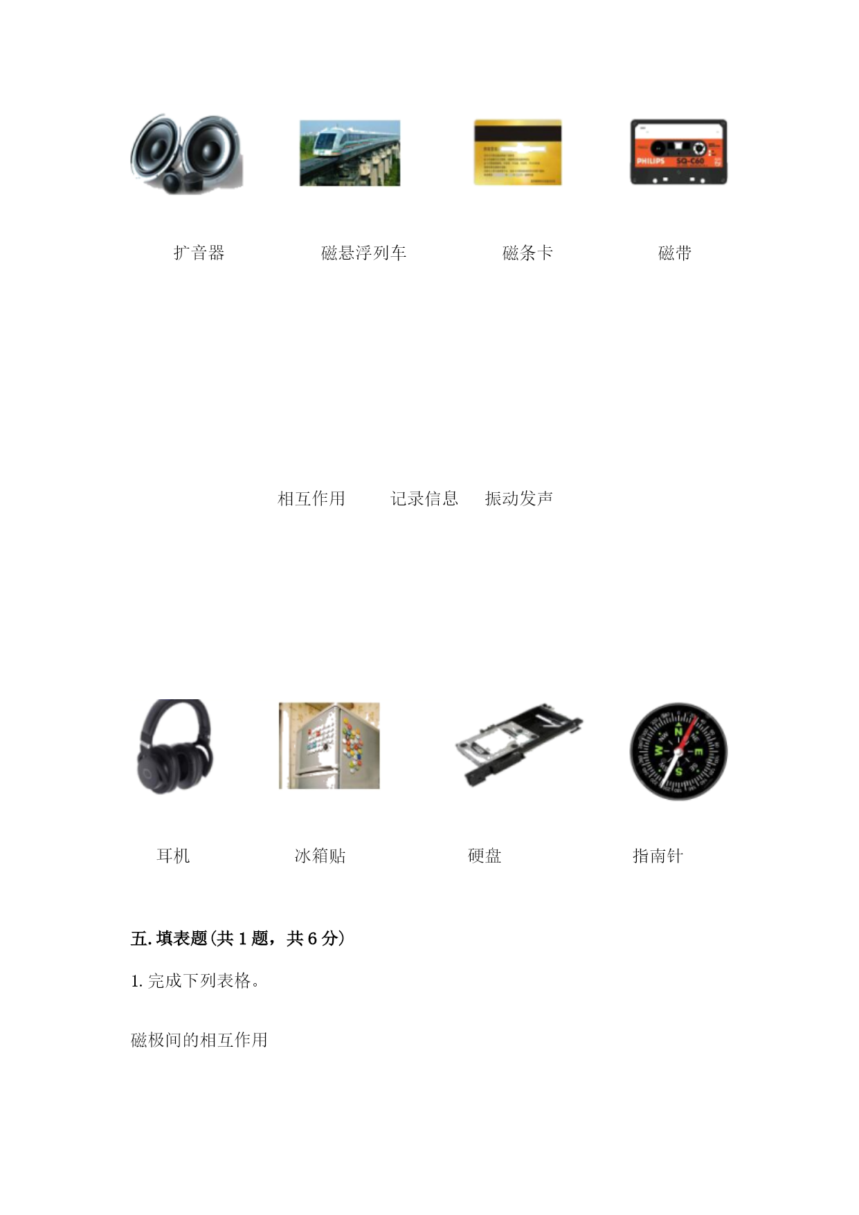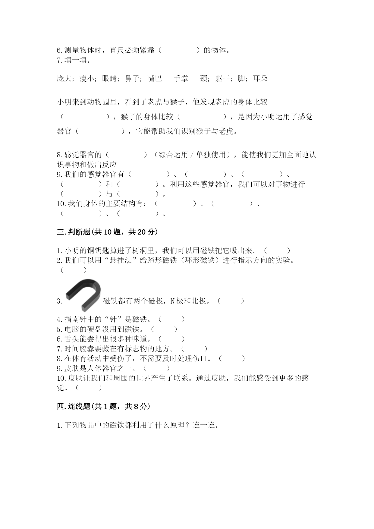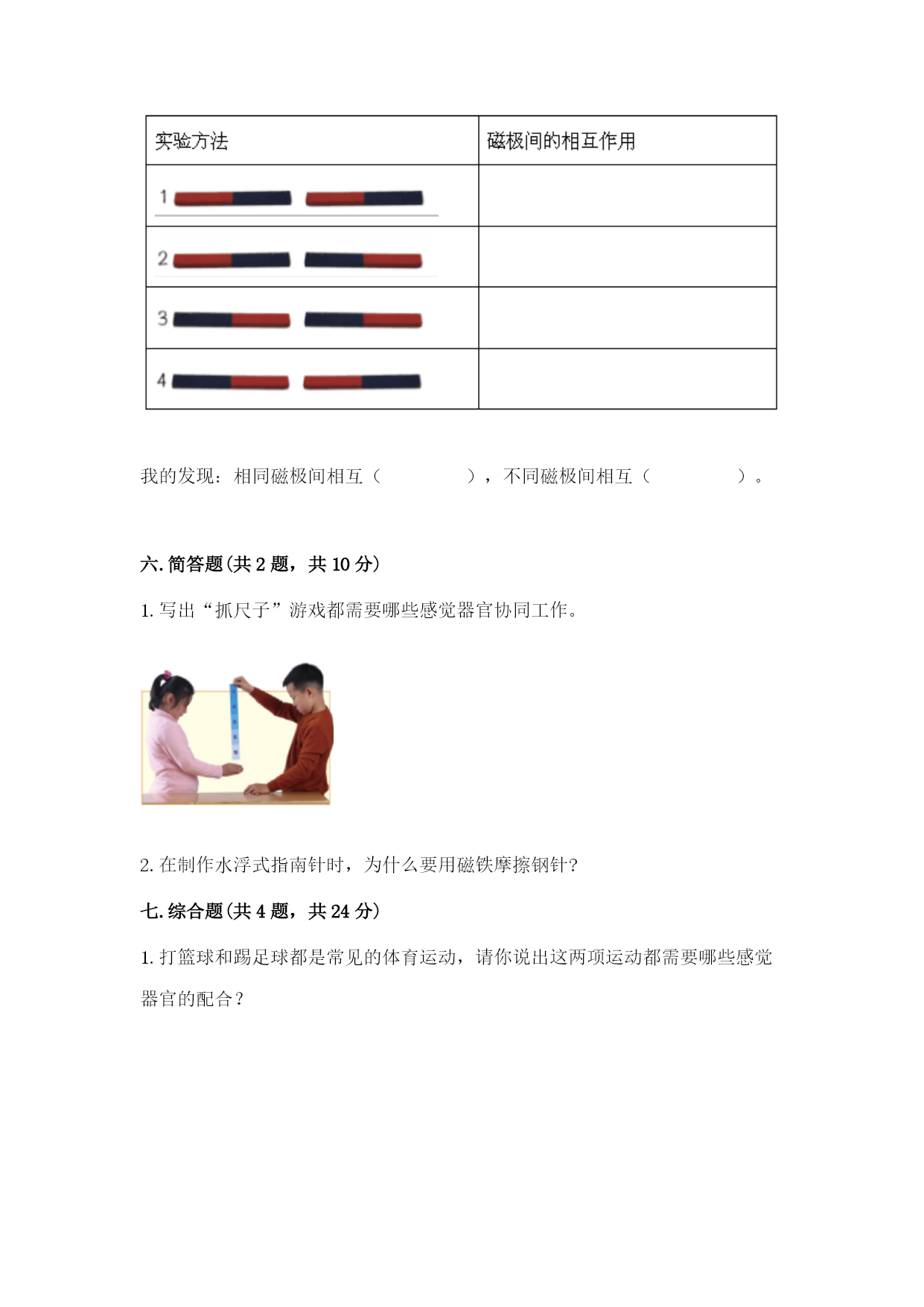 教科版二年级下册科学知识点期末测试卷 一.选择题(共10题,共22分) 1.磁铁上磁力最强的部分叫()。 A.磁极B.磁力C.磁性 2.将下列物体与指南针放在一起,不会影响指南针正确指示方向的是()。 A.铁钉B.蹄形磁铁C.塑料尺 3.如图所示,一个指南针的外壳材质不可能是()。 A.铜B.铁C.塑料 4.为什么我们在实验过程中要重复同一组实验很多次?为什么我们要检测几种不同形状的磁铁?() A.老师的要求。B.得到更可靠的规律C.增加实验的趣味性 5.使用指南针辨别方向时,附近有()对指南针没有影响。 A.橡皮B.铁柜C.磁铁 6.下面的生活方式中,健康的是()。 A.早睡早起B.经常看电视C.多吃零食 7.磁铁能指南北方向。指南的磁极叫南极,用“()”表示;指北的磁极叫北极,用“()”表示。 A.NB.MC.SD.W 8.请你选出不正确的测量方式()。 A.测量身高时挺直后背B.测量体重时用力踏上体重秤C.测量身高时不能戴帽子 9.在“翻拍手”游戏中,我们用到的感觉器官是()。 A.眼睛、手、鼻子B.眼睛、手、耳朵 10.皮肤是人体的(),可以凭借出汗等来调节体温。 A.“空调器”B.“保护罩” 二.填空题(共10题,共50分) 1.磁铁的同极相互(),异极相互()。 2.下面的()能被磁铁吸引。 ①纸;②铜钥匙;③回形针;④钻;⑤一元硬币;⑥塑料袋;⑦铅笔;⑧木块 3.指南针是利用()指示方向的仪器。 4.磁铁能够吸引()的性质叫磁性。 5.指南针的四种放置方法分别是()、()、()和()。 6.测量物体时,直尺必须紧靠()的物体。 7.填一填。 庞大;瘦小;眼睛;鼻子;嘴巴手掌颈;躯干;脚;耳朵 小明来到动物园里,看到了老虎与猴子,他发现老虎的身体比较(),猴子的身体比较(),是因为小明运用了感觉器官(),它能帮助我们识别猴子与老虎。 8.感觉器官的()(综合运用/单独使用),能使我们更加全面地认识事物和做出反应。 9.我们的感觉器官有()、()、()、()和()。利用这些感觉器官,我们可以对事物进行()与()。 10.我们身体的主要结构有:()、()、()、()。 三.判断题(共10题,共20分) 1.小明的铜钥匙掉进了树洞里,我们可以用磁铁把它吸出来。() 2.我们可以用“悬挂法”给蹄形磁铁(环形磁铁)进行指示方向的实验。() 3.磁铁都有两个磁极,N极和北极。() 4.指南针中的“针”是磁铁。() 5.电脑的硬盘没用到磁铁。() 6.舌头能尝得出很多种味道。() 7.时间胶囊要藏在有标志物的地方。() 8.在体育活动中受伤了,不需要及时处理伤口。() 9.皮肤是人体器官之一。() 10.皮肤让我们和周围的世界产生了联系。通过皮肤,我们能感受到更多的感觉。() 四.连线题(共1题,共8分) 1.下列物品中的磁铁都利用了什么原理?连一连。 扩音器磁悬浮列车磁条卡磁带 相互作用记录信息振动发声 耳机冰箱贴硬盘指南针 五.填表题(共1题,共6分) 1.完成下列表格。 磁极间的相互作用 我的发现:相同磁极间相互(),不同磁极间相互()。 六.简答题(共2题,共10分) 1.写出“抓尺子”游戏都需要哪些感觉器官协同工作。 2.在制作水浮式指南针时,为什么要用磁铁摩擦钢针? 七.综合题(共4题,共24分) 1.打篮球和踢足球都是常见的体育运动,请你说出这两项运动都需要哪些感觉器官的配合? 2.快速从16个字和25个字里面分别找出与鸟和胄不同的字。 3.下列哪些物体含有磁铁?把含有磁铁的物体圈出来。 4.下图是莉莉在“抓尺子”游戏中记录的成绩,看图完成后面的问题。(尺子上端是1,下端是10,图中的点就是莉莉抓住尺子的位置) 莉莉一共测试了几次?() 莉莉第7次抓到的成绩是几分?() ③你从图中发现了莉莉在“抓尺子”游戏中的反应速度有什么变化?() 参考答案 一.选择题 1.A 2.C 3.B 4.B 5.A 6.A 7.C;A 8.B 9.B 10.A 二.填空题 1.排斥;吸引 2.③④⑤ 3.磁铁 4.铁 5.碗唇旋定法;指甲旋定法;悬挂法;水浮法 6.被测量 7.庞大;瘦小;眼睛 8.综合运用 9.眼;耳;鼻;舌;皮肤;观察;比较 10.头;颈;躯干;四肢 三.判断题 1.× 2.√ 3.× 4.√ 5.× 6.√ 7.√ 8.× 9.√ 10.√ 四.连线题 1.如下: 五.填表题 1.吸引;排斥;吸引;排斥;排斥;吸引 六.简答题 1.抓尺子游戏需要视觉和触觉器官协同工作。我们利用视觉器官观察尺子什么时侯被放开,通过视觉器官和触觉器官协同工作抓抓住尺子。 2.为了让本来没有磁性的钢针变得有磁性。 七.综合题 1.打篮球:视觉器官、听觉器官、触觉器官。 踢足球:视觉器官、听觉器官、触觉器