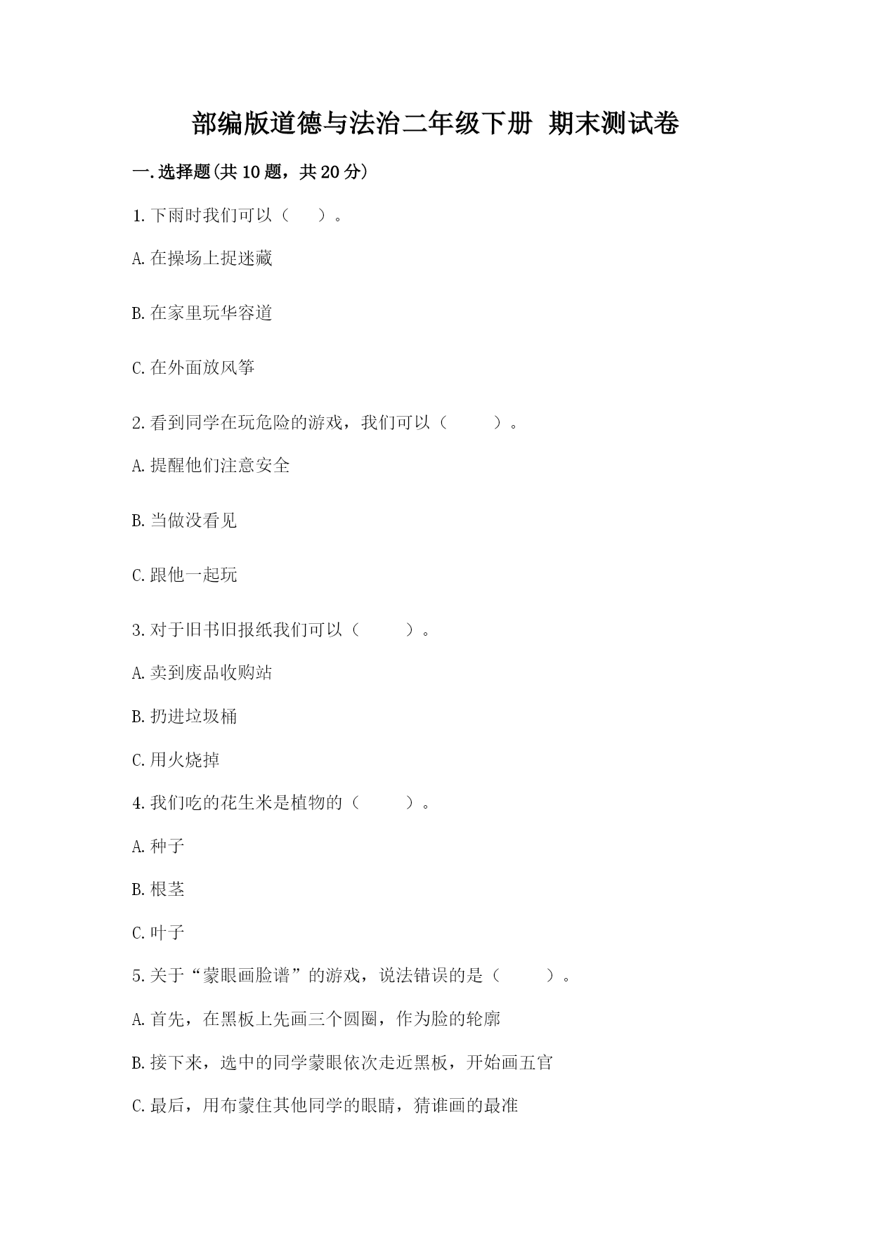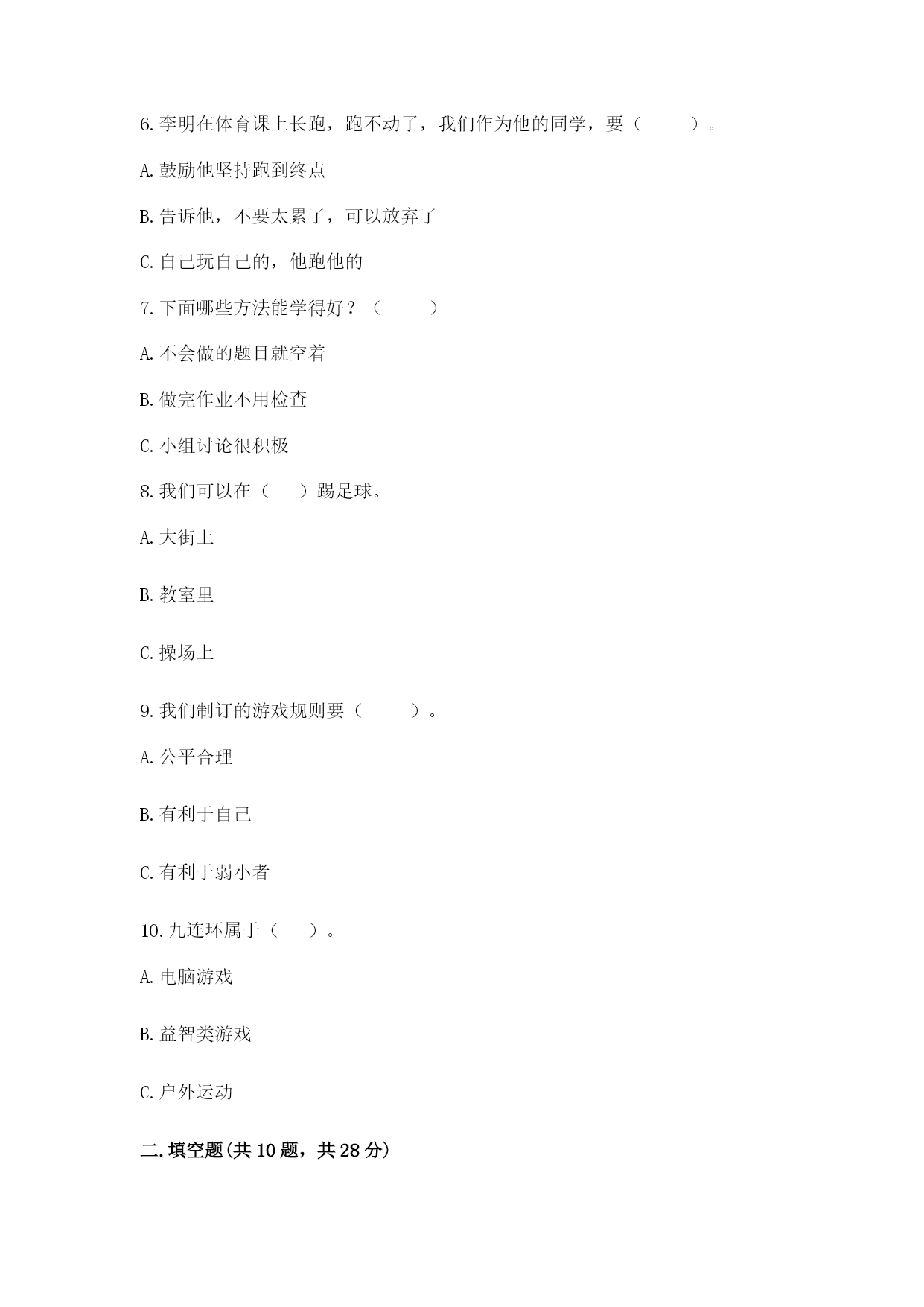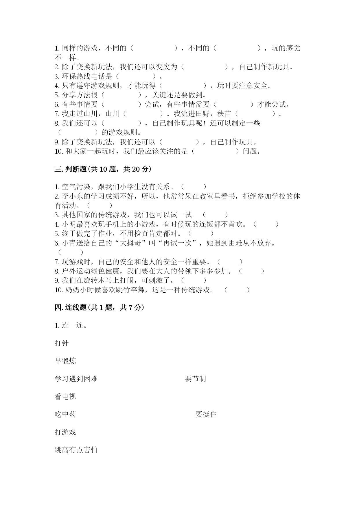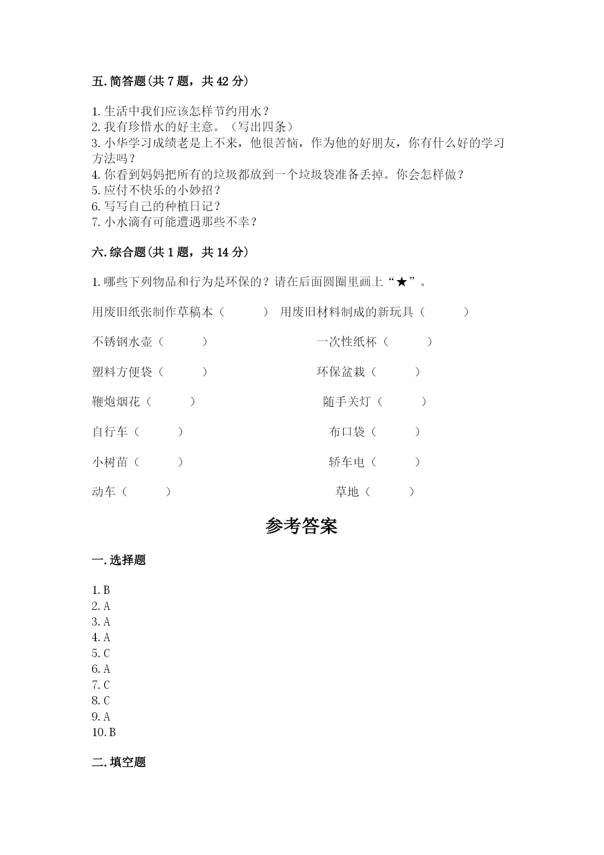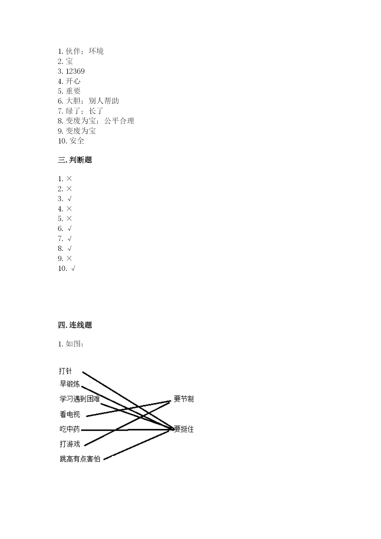 部编版道德与法治二年级下册期末测试卷 一.选择题(共10题,共20分) 1.下雨时我们可以()。 A.在操场上捉迷藏 B.在家里玩华容道 C.在外面放风筝 2.看到同学在玩危险的游戏,我们可以()。 A.提醒他们注意安全 B.当做没看见 C.跟他一起玩 3.对于旧书旧报纸我们可以()。 A.卖到废品收购站 B.扔进垃圾桶 C.用火烧掉 4.我们吃的花生米是植物的()。 A.种子 B.根茎 C.叶子 5.关于“蒙眼画脸谱”的游戏,说法错误的是()。 A.首先,在黑板上先画三个圆圈,作为脸的轮廓 B.接下来,选中的同学蒙眼依次走近黑板,开始画五官 C.最后,用布蒙住其他同学的眼睛,猜谁画的最准 6.李明在体育课上长跑,跑不动了,我们作为他的同学,要()。 A.鼓励他坚持跑到终点 B.告诉他,不要太累了,可以放弃了 C.自己玩自己的,他跑他的 7.下面哪些方法能学得好?() A.不会做的题目就空着 B.做完作业不用检查 C.小组讨论很积极 8.我们可以在()踢足球。 A.大街上 B.教室里 C.操场上 9.我们制订的游戏规则要()。 A.公平合理 B.有利于自己 C.有利于弱小者 10.九连环属于()。 A.电脑游戏 B.益智类游戏 C.户外运动 二.填空题(共10题,共28分) 1.同样的游戏,不同的(),不同的(),玩的感觉不一样。 2.除了变换新玩法,我们还可以变废为(),自己制作新玩具。 3.环保热线电话是()。 4.只有遵守游戏规则,才能玩得(),玩时要注意安全。 5.分享方法很(),关键还是要做到。 6.有些事情要()尝试,有些事情需要()才能尝试。 7.我走过山川,山川()。我流进田野,秧苗()。 8.我们还可以(),自己制作玩具呢!还可以制定一些()的游戏规则。 9.除了变换新玩法,我们还可以(),自己制作玩具。 10.和大家一起玩时,我们最应该关注的是()问题。 三.判断题(共10题,共20分) 1.空气污染,跟我们小学生没有关系。() 2.李小东的学习成绩不好,所以,他常常呆在教室里看书,拒绝参加学校的体育活动。() 3.其他国家的传统游戏,我们也可以试一试。() 4.小明最喜欢玩手机上的小游戏,有时候玩的连饭都不肯吃。() 5.终于做完了作业,不用检查肯定都对。() 6.小青送给自己的“大拇哥”叫“再试一次”,她遇到困难从不放弃。() 7.玩游戏时,自己的安全和他人的安全一样重要。() 8.户外运动绿色健康,我们要在大人的带领下多多参加。() 9.我们在旋转木马上打闹,可刺激了。() 10.奶奶小时候喜欢跳竹竿舞,这是一种传统游戏。() 四.连线题(共1题,共7分) 1.连一连。 打针 早锻炼 学习遇到困难要节制 看电视 吃中药要挺住 打游戏 跳高有点害怕 五.简答题(共7题,共42分) 1.生活中我们应该怎样节约用水? 2.我有珍惜水的好主意。(写出四条) 3.小华学习成绩老是上不来,他很苦恼,作为他的好朋友,你有什么好的学习方法吗? 4.你看到妈妈把所有的垃圾都放到一个垃圾袋准备丢掉。你会怎样做? 5.应付不快乐的小妙招? 6.写写自己的种植日记? 7.小水滴有可能遭遇那些不幸? 六.综合题(共1题,共14分) 1.哪些下列物品和行为是环保的?请在后面圆圈里画上“★”。 用废旧纸张制作草稿本()用废旧材料制成的新玩具() 不锈钢水壶()一次性纸杯() 塑料方便袋()环保盆栽() 鞭炮烟花()随手关灯() 自行车()布口袋() 小树苗()轿车电() 动车()草地() 参考答案 一.选择题 1.B 2.A 3.A 4.A 5.C 6.A 7.C 8.C 9.A 10.B 二.填空题 1.伙伴;环境 2.宝 3.12369 4.开心 5.重要 6.大胆;别人帮助 7.绿了;长了 8.变废为宝;公平合理 9.变废为宝 10.安全 三.判断题 1.× 2.× 3.√ 4.× 5.× 6.√ 7.√ 8.√ 9.× 10.√ 四.连线题 1.如图: 五.简答题 1.洗脸水用后可以洗脚,然后冲厕所;家中应预备一个收集废水的大桶,它完全可以保证冲厕所需要的水量;淘米水、煮过面条的水,用来洗碗筷,去油又节水;养鱼的水浇花,能促进花木生长。 2.(1)洗澡时不要总开着水龙头。(2)洗水果的水可用盆子接住,以便再次使用。(3)用过的水还可以冲厕所。(4)用完水及时关水龙头。 3.上课要认真听讲,认真思考,积极发言,不做小动作,不开小差。要勤奋学习,遇到不懂的问题要多向别人请教。积极参与课堂讨论。作业要认真书写。读题目要认真。做完作业之后要认真检查。多看课外书,回家尽量少看电视,不要老是玩游戏。每天早睡早起,确保第二天有充沛的精力来学习。 4.我会提醒妈妈对垃圾进行分类,分类后再将垃圾进行处理。 5.(1)把不高兴的事说给好