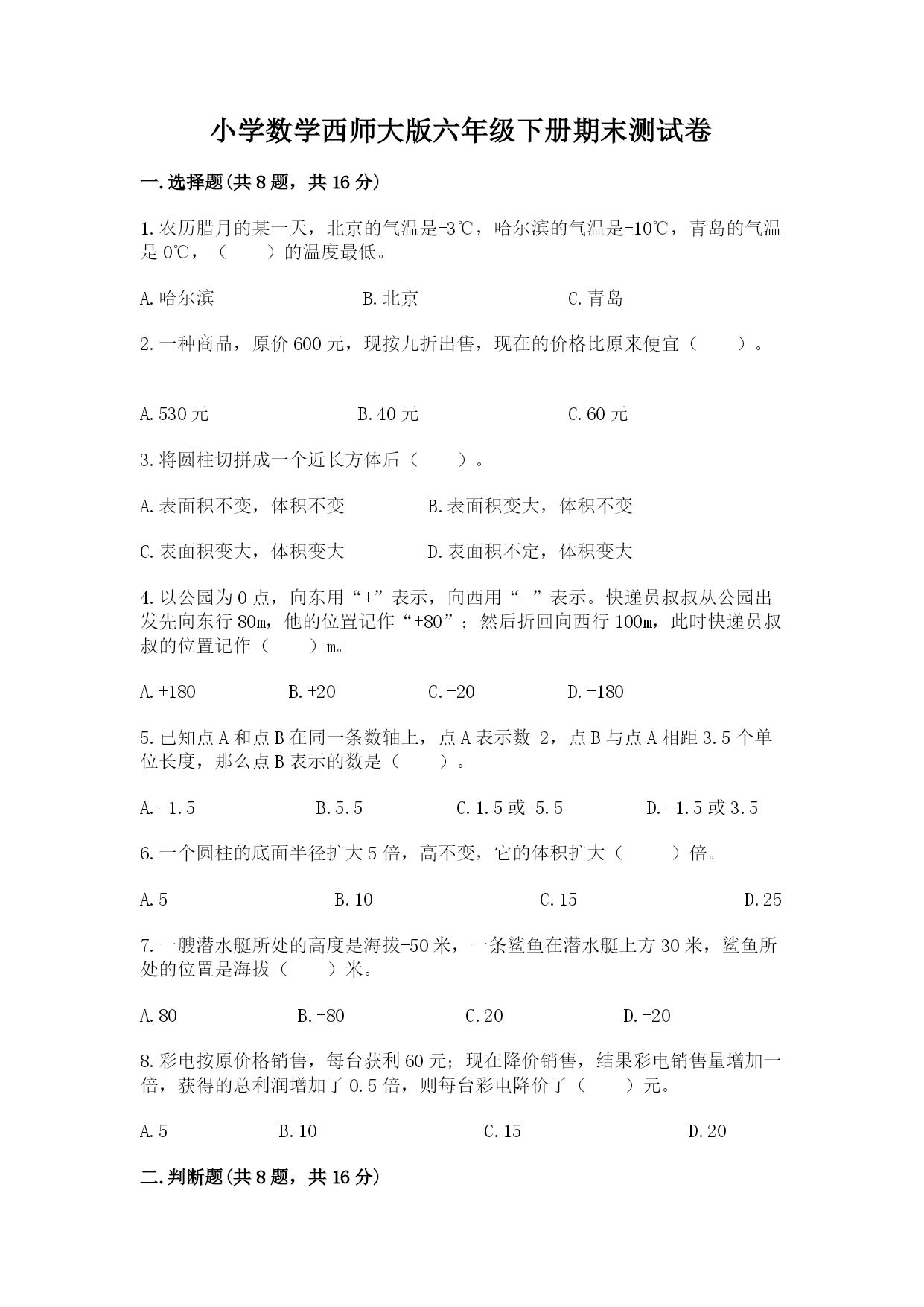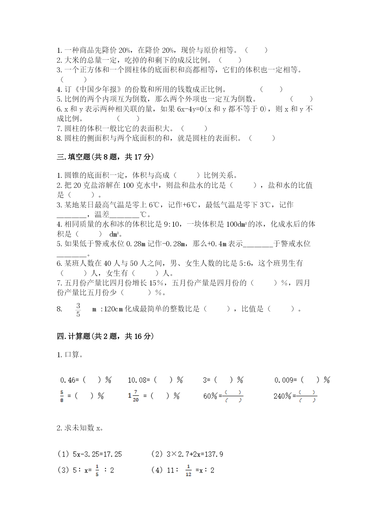 小学数学西师大版六年级下册期末测试卷 一.选择题(共8题,共16分) 1.农历腊月的某一天,北京的气温是-3℃,哈尔滨的气温是-10℃,青岛的气温是0℃,()的温度最低。 A.哈尔滨B.北京C.青岛 2.一种商品,原价600元,现按九折出售,现在的价格比原来便宜()。 A.530元B.40元C.60元 3.将圆柱切拼成一个近长方体后()。 A.表面积不变,体积不变B.表面积变大,体积不变 C.表面积变大,体积变大D.表面积不定,体积变大 4.以公园为0点,向东用“+”表示,向西用“-”表示。快递员叔叔从公园出发先向东行80m,他的位置记作“+80”;然后折回向西行100m,此时快递员叔叔的位置记作()m。 A.+180B.+20C.-20D.-180 5.已知点A和点B在同一条数轴上,点A表示数-2,点B与点A相距3.5个单位长度,那么点B表示的数是()。 A.-1.5B.5.5C.1.5或-5.5D.-1.5或3.5 6.一个圆柱的底面半径扩大5倍,高不变,它的体积扩大()倍。 A.5B.10C.15D.25 7.一艘潜水艇所处的高度是海拔-50米,一条鲨鱼在潜水艇上方30米,鲨鱼所处的位置是海拔()米。 A.80B.-80C.20D.-20 8.彩电按原价格销售,每台获利60元;现在降价销售,结果彩电销售量增加一倍,获得的总利润增加了0.5倍,则每台彩电降价了()元。 A.5B.10C.15D.20 二.判断题(共8题,共16分) 1.一种商品先降价20%,在降价20%,现价与原价相等。() 2.大米的总量一定,吃掉的和剩下的成反比例。() 3.一个正方体和一个圆柱体的底面积和高都相等,它们的体积也一定相等。() 4.订《中国少年报》的份数和所用的钱数成正比例。() 5.比例的两个内项互为倒数,那么两个外项也一定互为倒数。() 6.x和y表示两种相关联的量,如果6x-4y=0(x和y都不等于0),则x和y不成比例。() 7.圆柱的体积一般比它的表面积大。() 8.圆柱的侧面积与两个底面积的和,就是圆柱的表面积。() 三.填空题(共8题,共17分) 1.圆锥的底面积一定,体积与高成()比例关系。 2.把20克盐溶解在100克水中,则盐和盐水的比是(),盐和水的比值是()。 3.某地某日最高气温是零上6℃,记作+6℃,最低气温是零下3℃,记作________,温差________℃。 4.相同质量的水和冰的体积比是9:10,一块体积是100dm3的冰,化成水后的体积是()dm3。 5.如果低于警戒水位0.28m记作-0.28m,那么+0.4m表示________于警戒水位________。 6.某班人数在40人与50人之间,男、女生人数的比是5:6,这个班男生有()人,女生有()人。 7.五月份产量比四月份增长15%,五月份产量是四月份的()%,四月份产量比五月份少()%。 8.m:120cm化成最简单的整数比是(),比值是()。 四.计算题(共2题,共16分) 1.口算。 2.求未知数x。 五.作图题(共1题,共5分) 1.在下面的方格纸中画一个面积是8cm2的长方形,再把这个长方形的各边长扩大到原来的2倍,画出图形。(每个方格代表边长为1cm的正方形) 六.解答题(共6题,共31分) 1.修路队修一条路,八月份修了4800米,九月份修了全长的,这两个月一共修了全长的60%,这条路全长多少米? 2.一件西服原价180元,现在的价格比原来增加了10%,现在的价格是多少元? 3.一堆圆锥形黄沙,底面周长是25.12米,高1.5米,每立方米的黄沙重2吨,这堆沙重多少吨? 4.把下面几个城市的最高气温按从高到低排列起来;把最低气温按从低到高排列起来。 北京:-7°C~7°C 上海:5°C~10°C 成都:8°C~11°C 唐山:-5°C~6°C 5.甲、乙两店都经营同样的某种商品,甲店先涨价10%后,又降价10%;乙店先涨价15%后,又降价15%。此时,哪个店的售价高些? 6.一块长方形土地的周长是162米,长与宽的比是5∶4,这块土地的面积是多少平方米? 参考答案 一.选择题 1.A 2.C 3.B 4.C 5.C 6.D 7.D 8.C 二.判断题 1.× 2.× 3.√ 4.√ 5.√ 6.× 7.× 8.√ 三.填空题 1.正 2.1:6; 3.-3℃;9 4.90 5.高;0.4m 6.20;24 7.115;13.04 8.1:2; 四.计算题 1.46;1008;300;0.9;62.5;1.35;; 2.(1)x=4.1(2)x=64.9(3)x=50(4)x=264 五.作图题 1.如下: 六.解答题 1.4800÷(60%-)=12000(米) 答:这条路全长12000米。 2.解:180×(1+10%)