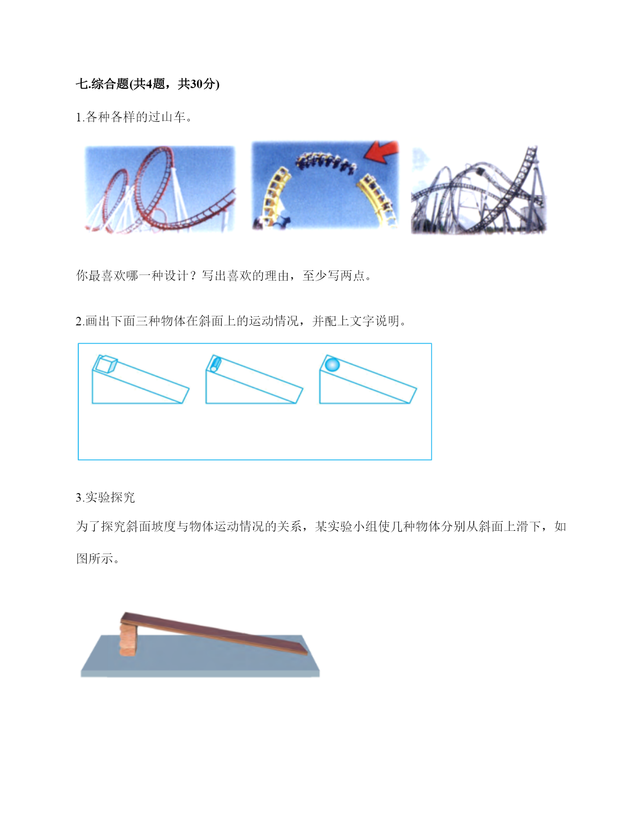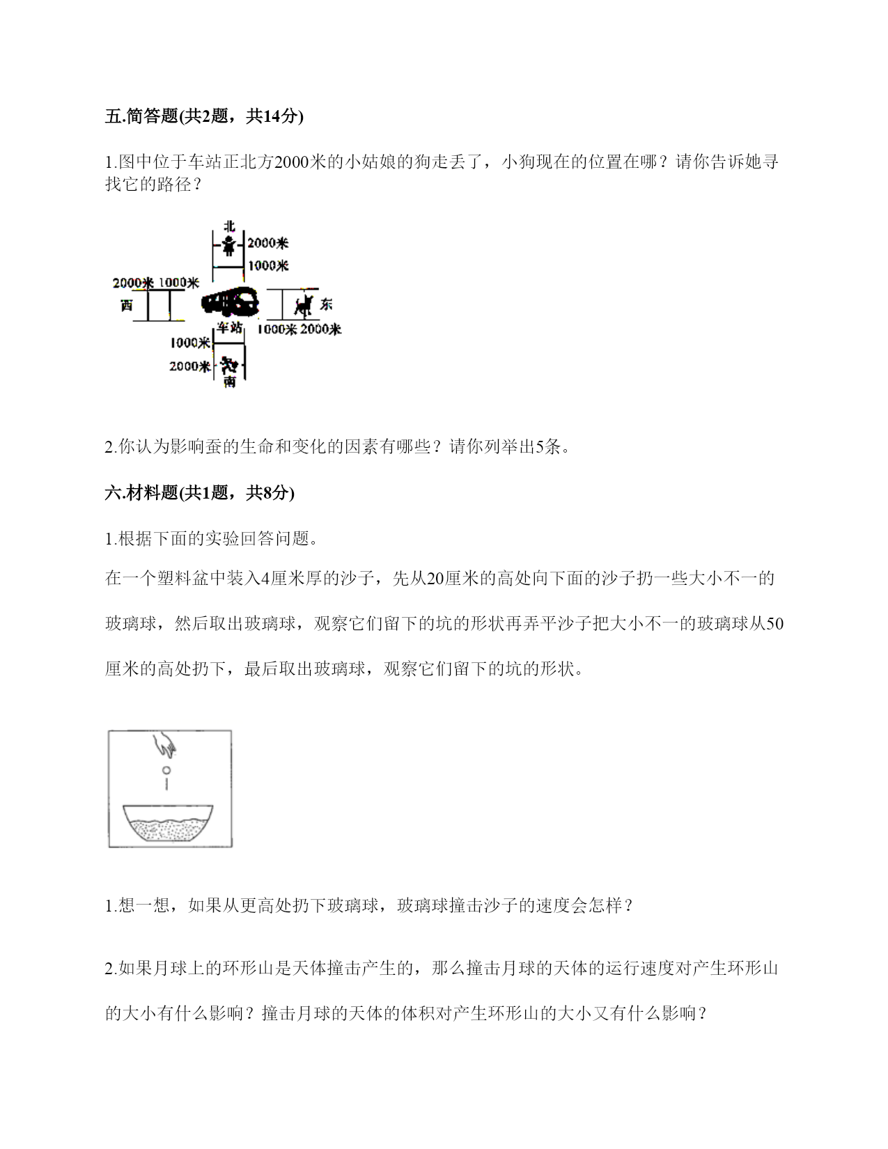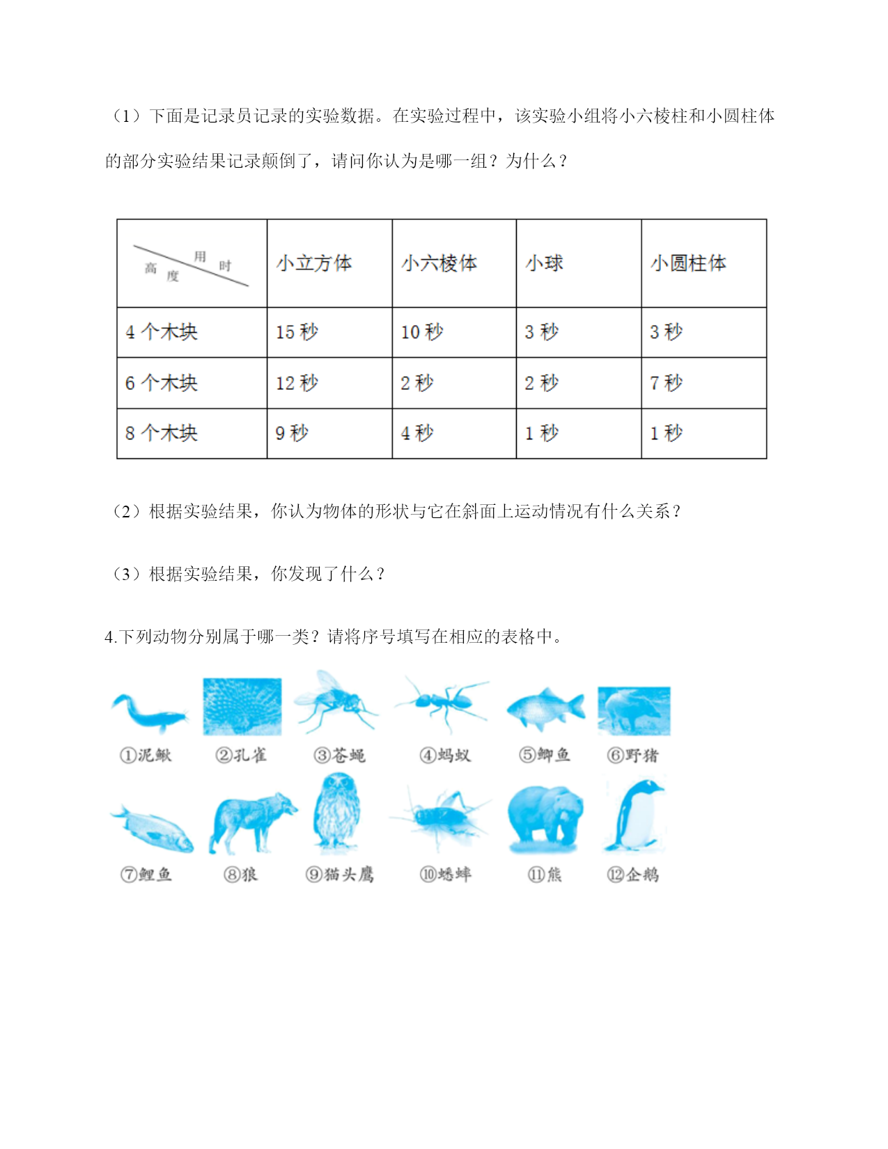 教科版三年级下册科学期末测试卷 一.选择题(共6题,共12分) 1.在太阳的光球层上,有一些旋涡状的气流,像是一个浅盘,中间下凹,我们称之为太阳黑子的原因是()。 A.它本身是黑色的 B.黑子本身并不黑,它的温度比周围要低一、二千摄氏度 C.黑子本身并不黑,它的温度比周围要高一、二千摄氏度 2.卵的内部有气室,其作用是为卵提供()。 A.水分B.氧气C.营养 3.六棱柱像图甲那样放,是滑动的;像图乙那样放,是滚动的。这说明()会影响物体在斜面上的运动情况。 A.斜面的光滑程度B.斜面的高度C.物体在斜面上的放置方法 4.月相最圆的时间大约是农历每个月的()。 A.初八B.十五C.三十 5.蚕在它结的茧里会变成蛹,蛹和蚕宝宝的样子()。 A.完全不同B.完全相同C.有相似之处 6.下列小明描述自己所处的位置正确的是()。 A.我在学校正门西北方向50米处B.我在学校正门前面50米C.我在西北方向50米处 二.填空题(共6题,共20分) 1.在生活中,我们利用()和()来描述两个物体之间的位置关系。 2.旋转的指尖陀螺的运动形式是(),上下往复运动的钢尺的运动形式是(),荡着的秋千的运动形式是()。 3.我们设计和搭建的“过山车”上的小球要能滚完(),不能脱轨。 4.物体运动的快慢我们用()来描述,相同时间内,物体运动的距离越大,速度越()。 5.古代人们利用阳光下物体影子的变化规律制作的计时工具叫做()。 6.测量时间可以使用()计时。 三.判断题(共6题,共12分) 1.蜗牛的爬行速度大于小蝌蚪向前游动的速度。() 2.无风时,下落的雨滴是做直线运动。()。 3.以行驶的汽车为参照物,路边的长椅是静止的。() 4.动物的生命都是从卵开始的。() 5.一个正方体,无论从哪个方向照射,得到的影子都是正方形。() 6.雌雄蚕蛾交尾是在为产生新后代做准备。() 四.连线题(共1题,共10分) 1.将下列动物与其相应的出生方式用线连起来。 鹅狗羊蚕猫 从卵孵化而来由母亲直接生下来 蚊子猪蜻蜓马蝴蝶 五.简答题(共2题,共14分) 1.图中位于车站正北方2000米的小姑娘的狗走丢了,小狗现在的位置在哪?请你告诉她寻找它的路径? 2.你认为影响蚕的生命和变化的因素有哪些?请你列举出5条。 六.材料题(共1题,共8分) 1.根据下面的实验回答问题。 在一个塑料盆中装入4厘米厚的沙子,先从20厘米的高处向下面的沙子扔一些大小不一的玻璃球,然后取出玻璃球,观察它们留下的坑的形状再弄平沙子把大小不一的玻璃球从50厘米的高处扔下,最后取出玻璃球,观察它们留下的坑的形状。 1.想一想,如果从更高处扔下玻璃球,玻璃球撞击沙子的速度会怎样? 2.如果月球上的环形山是天体撞击产生的,那么撞击月球的天体的运行速度对产生环形山的大小有什么影响?撞击月球的天体的体积对产生环形山的大小又有什么影响? 七.综合题(共4题,共30分) 1.各种各样的过山车。 你最喜欢哪一种设计?写出喜欢的理由,至少写两点。 2.画出下面三种物体在斜面上的运动情况,并配上文字说明。 3.实验探究 为了探究斜面坡度与物体运动情况的关系,某实验小组使几种物体分别从斜面上滑下,如图所示。 (1)下面是记录员记录的实验数据。在实验过程中,该实验小组将小六棱柱和小圆柱体的部分实验结果记录颠倒了,请问你认为是哪一组?为什么? (2)根据实验结果,你认为物体的形状与它在斜面上运动情况有什么关系? (3)根据实验结果,你发现了什么? 4.下列动物分别属于哪一类?请将序号填写在相应的表格中。 参考答案 一.选择题 1.B 2.B 3.B 4.B 5.C 6.A 二.填空题 1.方向;距离 2.转动;振动;摆动 3.全部轨道 4.速度;大 5.日晷 6.秒表 三.判断题 1.× 2.√ 3.× 4.× 5.× 6.√ 四.连线题 1.如下: 五.简答题 1.小狗在车站东边2000米处,她应该先往南走2000米到达车站,再往东走2000米。 2.(1)适宜的温度和湿度;(2)食物(桑叶)的清洁;(3)生活环境的清洁;(4)疾病;(5)光照的强度不能太大。 六.材料题 1.1.从更高处扔下玻璃球,玻璃球撞击沙子的速度会更快一些。2.天体运行的速度越快,产生的环形山就越深;天体的体积越大,产生的环形山就越大。 七.综合题 1.第三种。理由:1.轨道比较长;2.既有直线轨道又有曲线轨道;3.轨道的坡度变化特别大。(答案不唯一) 2.如下: 3.(1)斜面高度为6个木块那一组,应该把小六棱柱的2秒和小圆柱体的7秒对调。因坡度较小时小六棱柱在斜面上是滑动的,小圆柱在斜面上滚动的,斜面相同,滚动比滑动到达底端所用的时间短。 (2)物体在斜面上运动,当物体与斜面的接触面不断改变地移动时运动情况是滚