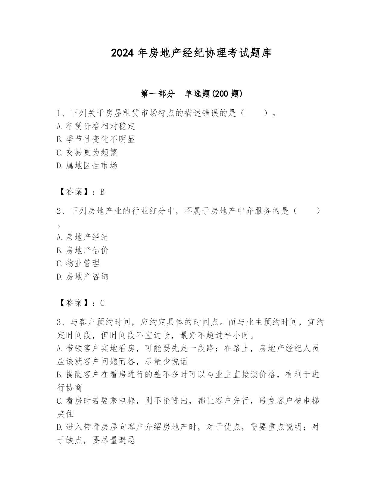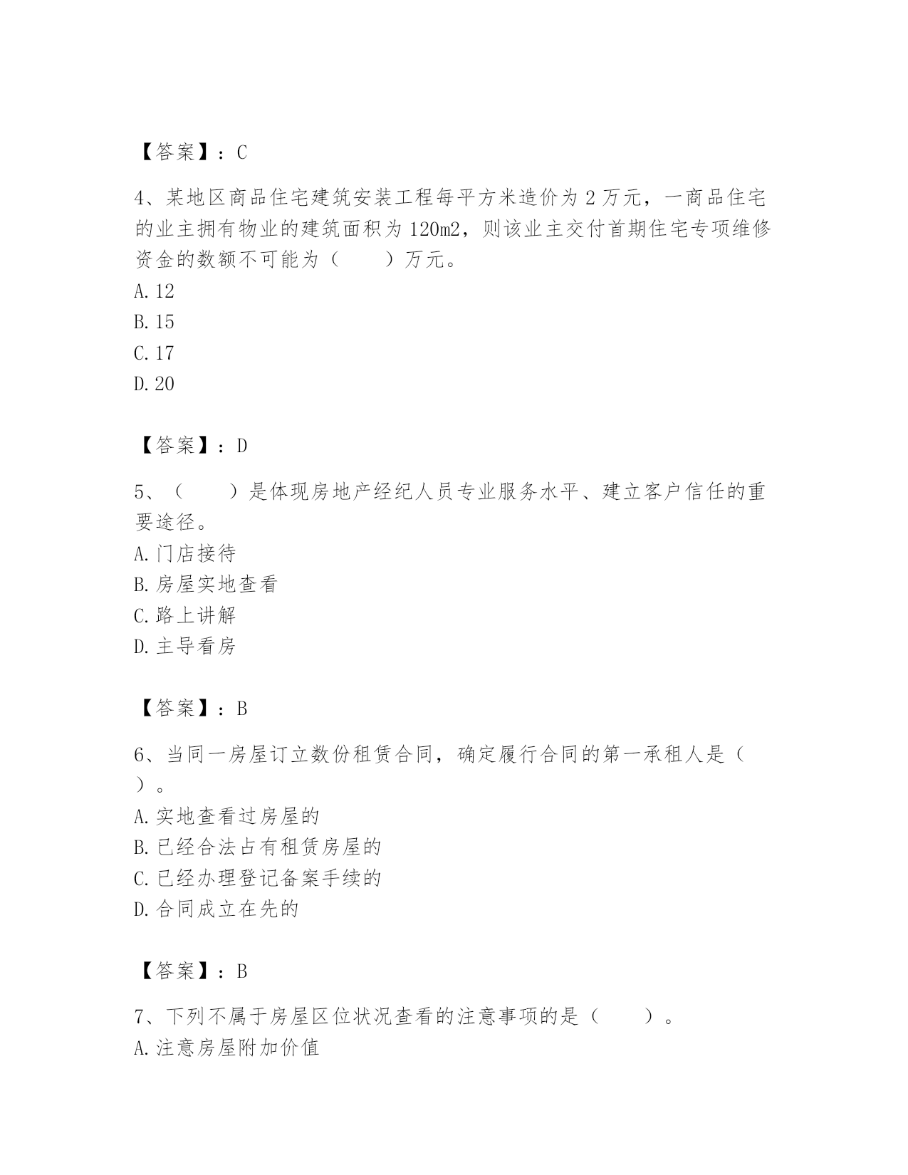 2024年房地产经纪协理考试题库 第一部分单选题(200题) 1、下列关于房屋租赁市场特点的描述错误的是()。A.租赁价格相对稳定B.季节性变化不明显C.交易更为频繁D.属地区性市场【答案】:B 2、下列房地产业的行业细分中,不属于房地产中介服务的是()。A.房地产经纪B.房地产估价C.物业管理D.房地产咨询【答案】:C 3、与客户预约时间,应约定具体的时间点。而与业主预约时间,宜约定时间段,但时间段不宜过长,最好不超过半小时。A.带领客户实地看房,可能要先走一段路;在路上,房地产经纪人员应该就客户问题而答,尽量少说话B.提醒客户在看房进行的差不多时可以与业主直接谈价格,有利于进行协商C.看房时若要乘电梯,则不论进出,都让客户先行,避免客户被电梯夹住D.进入带看房屋向客户介绍房地产时,对于优点,需要重点说明;对于缺点,要尽量避忌【答案】:C 4、某地区商品住宅建筑安装工程每平方米造价为2万元,一商品住宅的业主拥有物业的建筑面积为120m2,则该业主交付首期住宅专项维修资金的数额不可能为()万元。A.12B.15C.17D.20【答案】:D 5、()是体现房地产经纪人员专业服务水平、建立客户信任的重要途径。A.门店接待B.房屋实地查看C.路上讲解D.主导看房【答案】:B 6、当同一房屋订立数份租赁合同,确定履行合同的第一承租人是()。A.实地查看过房屋的B.已经合法占有租赁房屋的C.已经办理登记备案手续的D.合同成立在先的【答案】:B 7、下列不属于房屋区位状况查看的注意事项的是()。A.注意房屋附加价值B.观察环境C.注意空间布局D.注意景观【答案】:C 8、下列关于房地产居间与房地产代理的表述中,错误的是()。A.房地产居间与房地产代理是两种不同的经纪服务方式B.房地产居间是房地产经纪人与委托人签订房地产交易合同的行为C.房地产居间向委托人收取佣金D.房地产代理以委托人的名义与第三人进行房地产交易【答案】:B 9、房屋买卖的房屋状况说明书的内容不包括()。A.房屋基本状况B.房屋产权状况C.房屋实物状况D.房屋购买价格【答案】:D 10、存量房房源和新建商品房房源共有的信息发布渠道是()。A.互联网B.经纪门店C.户外广告D.宣传单【答案】:A 11、存量房交易中的“产品说明书”指的是()。A.房地产经纪服务合同B.房屋状况说明书C.存量房买卖合同D.房屋使用说明书【答案】:B 12、下列窗户中,密封性相对较差的是()。A.外平开窗B.平开上悬窗C.内平开窗D.推拉窗【答案】:D 13、在新建商品房销售代理业务中,房地产经纪机构服务内容不涉及()。A.竞争产品分析B.项目本体分析C.客户定位D.土地的研究【答案】:D 14、在新建商品房交易中,定金合同或定金条款生效的前提是()。A.实际交付订金B.实际交付定金C.交付了首付款D.进行了交易资金监管【答案】:B 15、个人住房贷款中的贴息贷款性质属于()。A.住房公积金贷款B.商业性个人住房贷款C.组合贷款D.个人消费贷款【答案】:B 16、房地产经纪人员从事经纪活动的最终成果体现在()。A.与委托方签订房地产经纪服务合同B.带领客户查看房源C.给业主介绍客源D.促成交易双方签订房地产交易合同【答案】:D 17、在房源推荐中,如果选择合作推荐,卖方代理人获得()佣金。A.15%B.20%C.25%D.50%【答案】:D 18、房地产交易资金的交割方式分为()。A.交易当事人自行交割与通过政府交割B.交易当事人自行交割与通过第三方专用账户划转C.通过房地产经纪机构代收代付与通过第三方专用账户划转D.交易当事人自行交割与通过第三人交割【答案】:B 19、因房屋或土地灭失而应进行的登记为()。A.变更登记B.转移登记C.注销登记D.撤销登记【答案】:C 20、经纪门店作为发布房源信息的重要渠道,其劣势为()。A.发布速度慢B.发布成本高C.信息量小D.受到时间限制【答案】:C 21、下列行为不能办理不动产转移登记的是()。A.房屋买卖B.房屋赠与C.房屋继承D.房屋面积发生变化【答案】:D 22、()是保障买卖合同顺利签订的基础。A.做好买卖合同签订前的准备工作B.签约材料准备C.买卖合同的拟定D.买卖合同风险防范【答案】:A 23、房地产出租代理是指房地产经纪机构及经纪人员按照房地产经纪服务合同的约定,以()的名义出租房屋。A.房地产经纪人员B.房地产经纪机构C.出租人D.承租人【答案】:C 24、关于发布新建商品房房源广告要求的表述中,错误的是()。A.房地产广告不得含有风水、占卜等封建迷信内容B.房地产广告可以利用其他项目的形象、环境C.房地产广告中涉及面积的,应当表明是建筑面积或者使用面积D.房地产广告中不得出现融资或者变相融资的内容【答案】:B 25、存量房交易资金监管