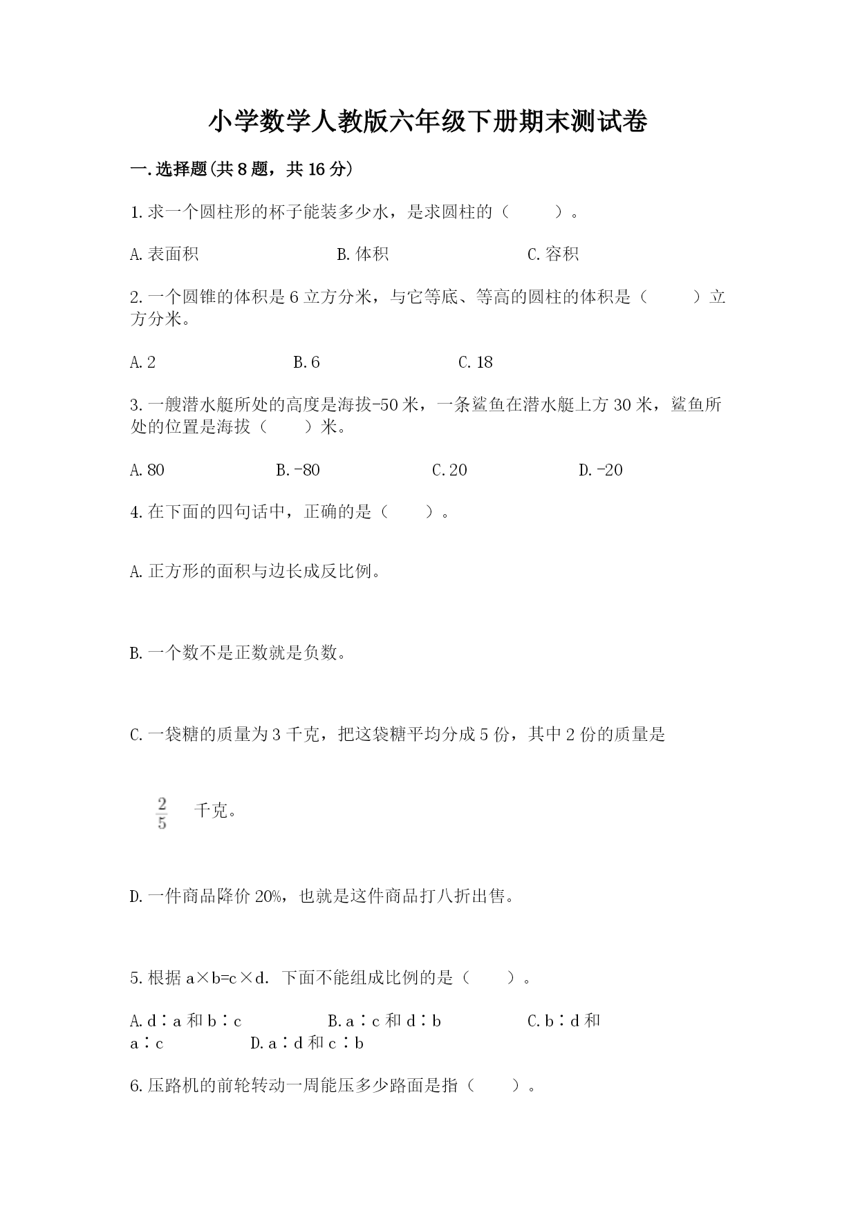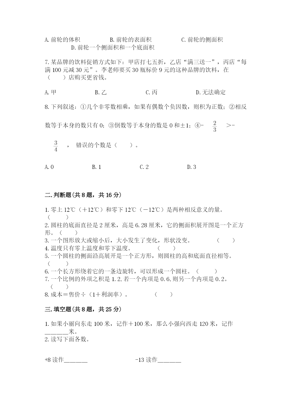 小学数学人教版六年级下册期末测试卷 一.选择题(共8题,共16分) 1.求一个圆柱形的杯子能装多少水,是求圆柱的()。 A.表面积B.体积C.容积 2.一个圆锥的体积是6立方分米,与它等底、等高的圆柱的体积是()立方分米。 A.2B.6C.18 3.一艘潜水艇所处的高度是海拔-50米,一条鲨鱼在潜水艇上方30米,鲨鱼所处的位置是海拔()米。 A.80B.-80C.20D.-20 4.在下面的四句话中,正确的是()。 A.正方形的面积与边长成反比例。 B.一个数不是正数就是负数。 C.一袋糖的质量为3千克,把这袋糖平均分成5份,其中2份的质量是千克。 D.一件商品降价20%,也就是这件商品打八折出售。 5.根据a×b=c×d.下面不能组成比例的是()。 A.d∶a和b∶cB.a∶c和d∶bC.b∶d和a∶cD.a∶d和c∶b 6.压路机的前轮转动一周能压多少路面是指()。 A.前轮的体积B.前轮的表面积C.前轮的侧面积D.前轮一个侧面积和一个底面积 7.某品牌的饮料促销方式如下:甲店打七五折,乙店“满三送一”,丙店“每满100元减30元”。李老师要买30瓶标价9元的这种品牌的饮料,在()店购买更省钱。 A.甲B.乙C.丙D.无法确定 8.下列叙述:①几个非零数相乘,如果有偶数个负因数,则积为正数;②相反数等于本身的数只有0;③倒数等于本身的数是0和±1;④->-,错误的个数是()。 A.0B.1C.2D.3 二.判断题(共8题,共16分) 1.零上12℃(+12℃)和零下12℃(-12℃)是两种相反意义的量。() 2.圆柱的底面直径是2厘米,高是6.28厘米,它的侧面积展开图是一个正方形。() 3.一个图形放大或缩小后,大小发生了变化,形状没变。() 4.温度只有零上温度和零下温度。() 5.一个圆柱的侧面沿高展开是一个正方形,则圆柱的高和底面直径相等。() 6.一个长方形绕着它的一条边旋转,可以形成一个圆柱。() 7.一个比例的外项之积是1.2,若一个内项是0.6,则另一个内项是0.2。() 8.成本=售价÷(1+利润率)。() 三.填空题(共8题,共25分) 1.如果小丽向东走100米,记作+100米,那么小强向西走120米,记作________米。 2.读写下面各数。 +8读作________-13读作________ +68.8读作________读作________ 正四十六写作________负十三点六写作________ 3.校园里种杨树和柳树的比是4:3,有杨树36棵,种柳树()棵。 4.=0.75=():36=6÷()。 5.=()∶()=()∶14=() 6.在0、1.2、5、-78、32%和3/100这些数中,自然数有________;负数有________。(按题目给的数的顺序填写) 7.20:()=()÷8=1.25==()%。 8.某商店八月份销售情况为:平均每天销售的金额为180元,那么9月2日的销售客为+53元表示(),这天实际销售额为(),9月16日销售额为196元,比平均每天的销售额多()这天销售额记作()元。 四.计算题(共2题,共12分) 1.直接写出答案。 2.解比例。 五.作图题(共1题,共5分) 1.在下面的方格纸中画一个面积是8cm2的长方形,再把这个长方形的各边长扩大到原来的2倍,画出图形。(每个方格代表边长为1cm的正方形) 六.解答题(共6题,共32分) 1.用96厘米长的铁丝围成一个直角三角形,这个直角三角形三条边的长度比是3∶4∶5,这个三角形的面积是多少? 2.一个圆柱形水杯,底面直径10厘米,高40厘米,现在有10升的水倒入这个水杯中,可以倒满几杯? 3.一个圆锥体钢制零件,底面半径是3cm,高是2m,这个零件的体积是多少立方厘米? 4.学校阅览室共有图书800本,其中科普书占图书总数的35%,文艺书占图书总数的30%。这两种书一共有多少本? 5.一个圆柱体容器的底面直径是16厘米,容器中盛有10厘米深的水,现在把一个圆锥形铁块浸没到水中,水面上升了3厘米,圆锥形铁块的体积是多少立方厘米? 6.如图,用彩带捆扎一个圆柱形礼盒,打结处用了35厘米长的彩带,礼盒的底面周长是94.2厘米,高是10厘米,求一共用了多长的彩带? 参考答案 一.选择题 1.C 2.C 3.D 4.D 5.C 6.C 7.A 8.B 二.判断题 1.√ 2.√ 3.× 4.× 5.× 6.√ 7.× 8.√ 三.填空题 1.-120 2.正八;负十三;正六十八点八;十二分之七;+46;-13.6 3.27 4.12;27;8 5.3;7;6; 6.0,5;-78 7.16;10;40;125 8.比平均销售额多53元;233元;16元;+16元 四.计算题 1.0.06;0.8;0.0